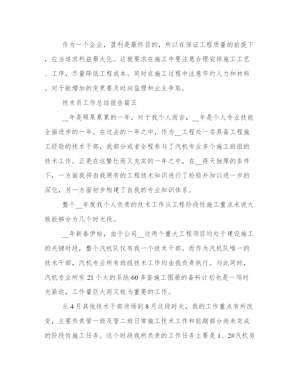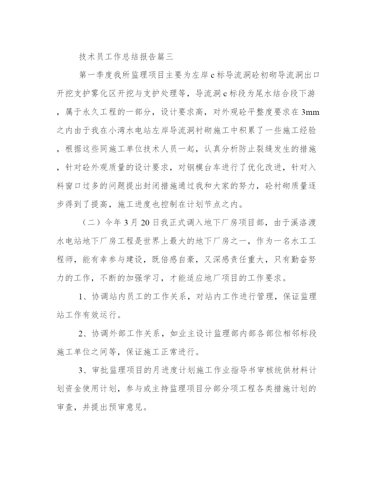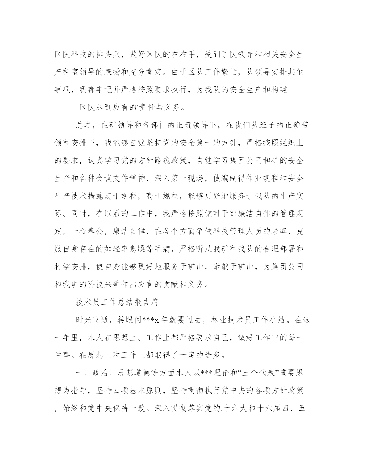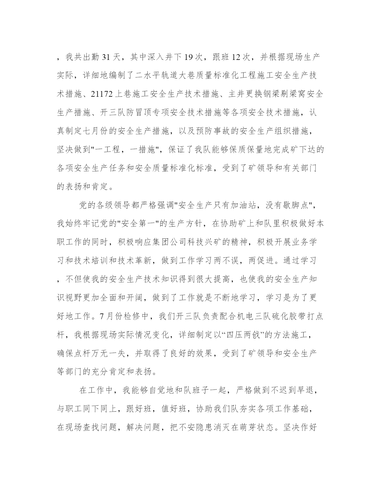 技术员工作总结报告(模板8篇)关于这次项目的报告,我整理了一些关键数据和结果。写报告时要注重事实和证据的支持,避免空洞的陈述和主观臆断。看一下这些报告范文,可以帮助我们找到一些灵感和写作的思路。技术员工作总结报告篇一我叫,现年35岁,男,汉族,于1997年6月毕业于焦作煤炭工业学校采矿专业,现任开三队技术员,助理工程师。现将本人在20__年7月份的安全生产工作述职如下:。20__年7月份,矿安排我们开三队负责二水平轨道大巷420米标准化工程及21172上巷840米标准化工程。接到生产任务后,我立即深入第一现场,根据国有煤矿安全质量标准化标准和集团公司、矿安全质量标准化要求,迎接煤层注水现场会胜利召开,我能够自觉履行职责,制定严密、切实可行的安全生产措施,严格执行“五优”矿井建设施工标准。在矿总工程师和队党政班子和安全生产等各部门的正确指示和领导下,严格履行职责,组织全队职工积极开展安全技术培训和安全知识培训,将集团公司和矿有关安全生产的文件,会议指示精神及时贯彻到每一名职工心中,使得人人心中有标准,每天取得新进步。7月份,在队党政班子的正确领导下,我作为一名工程技术人员,积极配合我矿和我们队,严格做到服务于生产,服务好生产。3月份,我共出勤31天,其中深入井下19次,跟班12次,并根据现场生产实际,详细地编制了二水平轨道大巷质量标准化工程施工安全生产技术措施、21172上巷施工安全生产技术措施、主井更换钢梁剔梁窝安全生产措施、开三队防冒顶专项安全技术措施等各项安全技术措施,认真制定七月份的安全生产措施,以及预防事故的安全生产组织措施,坚决做到"一工程,一措施",保证了我队能够保质保量地完成矿下达的各项安全生产任务和安全质量标准化标准,受到了矿领导和有关部门的表扬和肯定。党的各级领导都严格强调"安全生产只有加油站,没有歇脚点",我始终牢记党的"安全第一"的生产方针,在协助矿上和队里积极做好本职工作的同时,积极响应集团公司科技兴矿的精神,积极开展业务学习和技术培训和技术革新,做到工作学习两不误,两促进。通过学习,不但使我的安全生产技术知识得到很大提高,也使我的安全生产知识视野更加全面和开阔,做到了工作就是不断地学习,学习是为了更好地工作。7月份检修中,我们开三队负责配合机电三队硫化胶带打点杆,我根据现场实际情况变化,详细制定以“四压两戗”的方法施工,确保点杆万无一失,并取得了良好的效果,受到了矿领导和安全生产等部门的充分肯定和表扬。在工作中,我能够自觉地和队班子一起,严格做到不迟到早退,与职工同下同上,跟好班,值好班,协助我们队夯实各项工作基础,在现场查找问题,解决问题,把不安隐患消灭在萌芽状态。坚决作好区队科技的排头兵,做好区队的左右手,受到了队领导和相关安全生产科室领导的表扬和充分肯定。由于区队工作繁忙,队领导安排其他事项,我都牢记并严格按照要求执行,为我队的安全生产和构建______区队尽到应有的'责任与义务。总之,在矿领导和各部门的正确领导下,在我们队班子的正确带领和安排下,我能够自觉坚持党的安全第一的方针,严格按照组织上的要求,认真学习党的方针路线政策,自觉学习集团公司和矿的安全生产和各种会议文件精神,深入第一现场,使编制得作业规程和安全生产技术措施忠于规程,高于规程,能够更好地服务于我队的生产实际。同时,在以后的工作中,我严格按照党对干部廉洁自律的管理规定,一心奉公,廉洁自律,在各个方面争做科技管理人员的表率,克服自身存在的如轻率急躁等毛病,严格听从我矿和我队的合理部署和科学安排,使自身能够更好地服务于矿山,奉献于矿山,为集团公司和我矿的科技兴矿作出应有的贡献和义务。技术员工作总结报告篇二时光飞逝,转眼间***x年就要过去,林业技术员工作小结。在这一年里,本人在思想上、工作上都严格要求自己,做好工作中的每一件事。在思想上和工作上都取得了一定的进步。一、政治、思想道德等方面本人以***理论和“三个代表”重要思想为指导,坚持四项基本原则,坚持贯彻执行党中央的各项方针政策,始终和党中央保持一致。深入贯彻落实党的.十六大和十六届四、五中全会精神,热爱祖国,热爱人民,拥护中国***,维护国家统一、反对民族***、反对各种非法宗教,坚决与搞民族***、破坏民族团结分子作斗争。坚决打击各种形式的恐怖主义,保持社会稳定。遵守国家的宪法、法律及各项规章制度,从各方面严格要求自己,以身作则、严于律己,积极向党组织靠拢。二、科研开发工作方面1、参加周所长主持的nsi-415保水剂区试课题,参与了部分外业工作。2、参加周所长主持的大沙枣采穗圃建设项目的南疆地区大果沙枣资源调查工作,负责写了“大沙枣资源调查报告”。3、参加吉小敏负责的“***x军区三荒造林工程”项目的全施工过程。4、本年度完成咨询项目3项,“奇台林场森