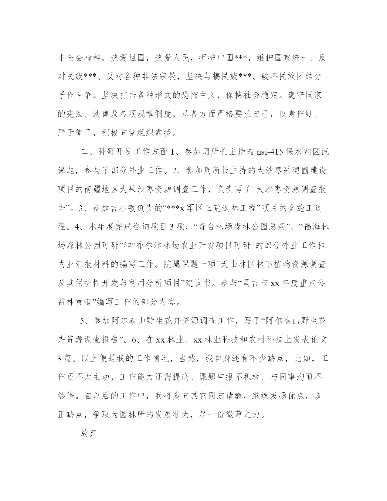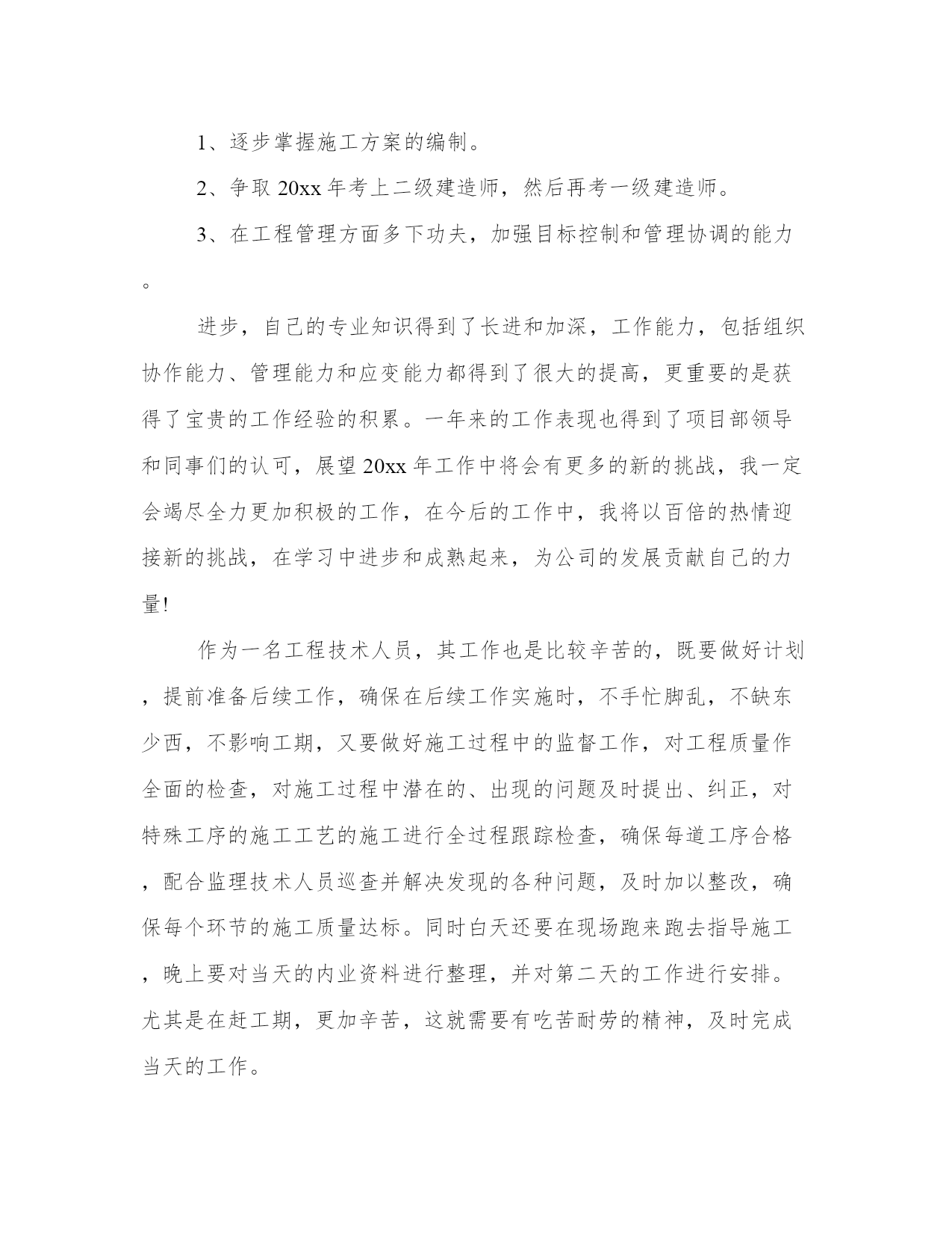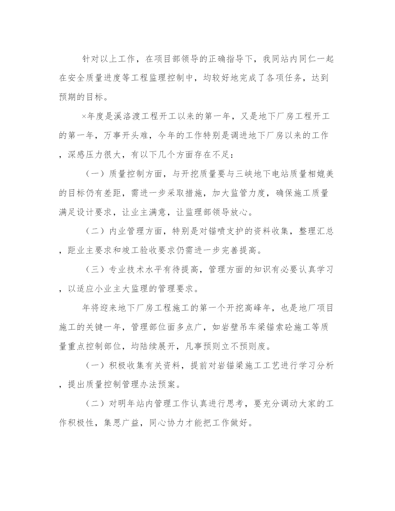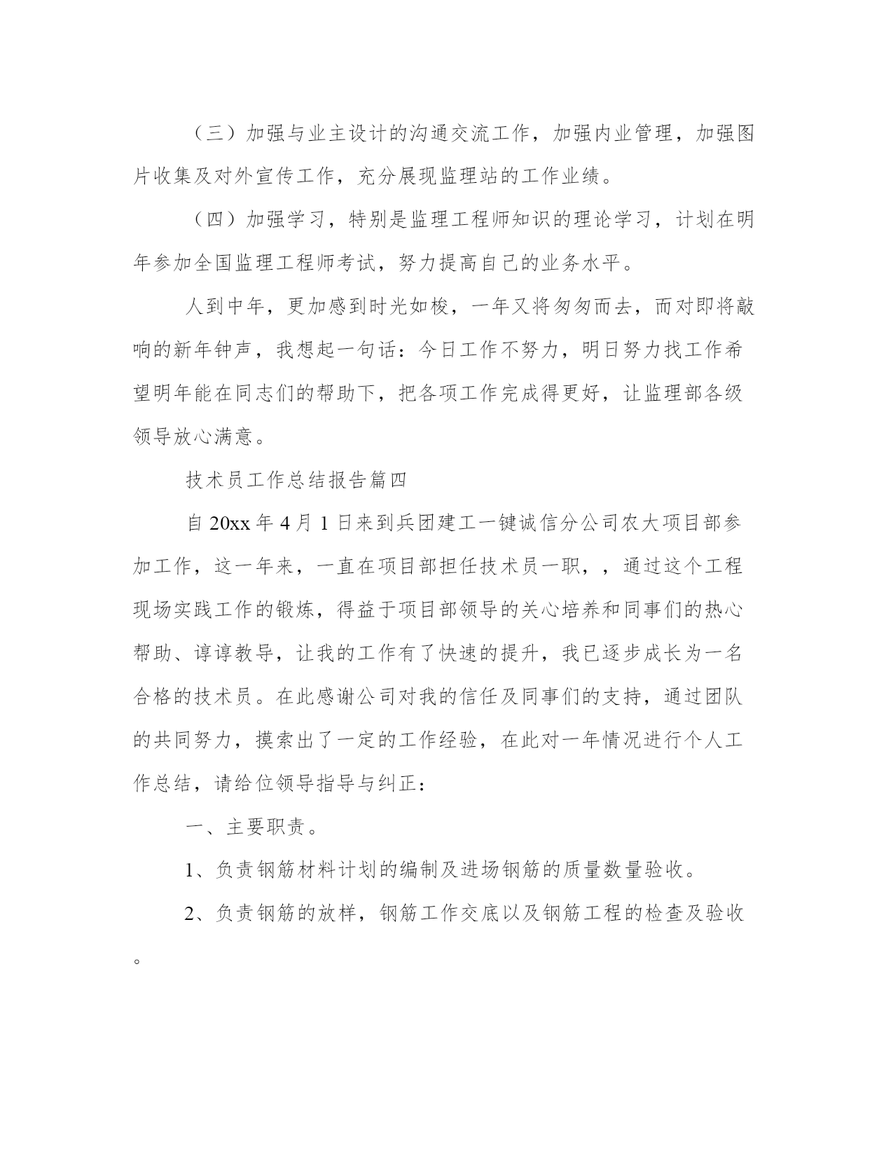技术员工作总结报告(模板8篇)关于这次项目的报告,我整理了一些关键数据和结果。写报告时要注重事实和证据的支持,避免空洞的陈述和主观臆断。看一下这些报告范文,可以帮助我们找到一些灵感和写作的思路。技术员工作总结报告篇一我叫,现年35岁,男,汉族,于1997年6月毕业于焦作煤炭工业学校采矿专业,现任开三队技术员,助理工程师。现将本人在20__年7月份的安全生产工作述职如下:。20__年7月份,矿安排我们开三队负责二水平轨道大巷420米标准化工程及21172上巷840米标准化工程。接到生产任务后,我立即深入第一现场,根据国有煤矿安全质量标准化标准和集团公司、矿安全质量标准化要求,迎接煤层注水现场会胜利召开,我能够自觉履行职责,制定严密、切实可行的安全生产措施,严格执行“五优”矿井建设施工标准。在矿总工程师和队党政班子和安全生产等各部门的正确指示和领导下,严格履行职责,组织全队职工积极开展安全技术培训和安全知识培训,将集团公司和矿有关安全生产的文件,会议指示精神及时贯彻到每一名职工心中,使得人人心中有标准,每天取得新进步。7月份,在队党政班子的正确领导下,我作为一名工程技术人员,积极配合我矿和我们队,严格做到服务于生产,服务好生产。3月份,我共出勤31天,其中深入井下19次,跟班12次,并根据现场生产实际,详细地编制了二水平轨道大巷质量标准化工程施工安全生产技术措施、21172上巷施工安全生产技术措施、主井更换钢梁剔梁窝安全生产措施、开三队防冒顶专项安全技术措施等各项安全技术措施,认真制定七月份的安全生产措施,以及预防事故的安全生产组织措施,坚决做到"一工程,一措施",保证了我队能够保质保量地完成矿下达的各项安全生产任务和安全质量标准化标准,受到了矿领导和有关部门的表扬和肯定。党的各级领导都严格强调"安全生产只有加油站,没有歇脚点",我始终牢记党的"安全第一"的生产方针,在协助矿上和队里积极做好本职工作的同时,积极响应集团公司科技兴矿的精神,积极开展业务学习和技术培训和技术革新,做到工作学习两不误,两促进。通过学习,不但使我的安全生产技术知识得到很大提高,也使我的安全生产知识视野更加全面和开阔,做到了工作就是不断地学习,学习是为了更好地工作。7月份检修中,我们开三队负责配合机电三队硫化胶带打点杆,我根据现场实际情况变化,详细制定以“四压两戗”的方法施工,确保点杆万无一失,并取得了良好的效果,受到了矿领导和安全生产等部门的充分肯定和表扬。在工作中,我能够自觉地和队班子一起,严格做到不迟到早退,与职工同下同上,跟好班,值好班,协助我们队夯实各项工作基础,在现场查找问题,解决问题,把不安隐患消灭在萌芽状态。坚决作好区队科技的排头兵,做好区队的左右手,受到了队领导和相关安全生产科室领导的表扬和充分肯定。由于区队工作繁忙,队领导安排其他事项,我都牢记并严格按照要求执行,为我队的安全生产和构建______区队尽到应有的'责任与义务。总之,在矿领导和各部门的正确领导下,在我们队班子的正确带领和安排下,我能够自觉坚持党的安全第一的方针,严格按照组织上的要求,认真学习党的方针路线政策,自觉学习集团公司和矿的安全生产和各种会议文件精神,深入第一现场,使编制得作业规程和安全生产技术措施忠于规程,高于规程,能够更好地服务于我队的生产实际。同时,在以后的工作中,我严格按照党对干部廉洁自律的管理规定,一心奉公,廉洁自律,在各个方面争做科技管理人员的表率,克服自身存在的如轻率急躁等毛病,严格听从我矿和我队的合理部署和科学安排,使自身能够更好地服务于矿山,奉献于矿山,为集团公司和我矿的科技兴矿作出应有的贡献和义务。技术员工作总结报告篇二时光飞逝,转眼间***x年就要过去,林业技术员工作小结。在这一年里,本人在思想上、工作上都严格要求自己,做好工作中的每一件事。在思想上和工作上都取得了一定的进步。一、政治、思想道德等方面本人以***理论和“三个代表”重要思想为指导,坚持四项基本原则,坚持贯彻执行党中央的各项方针政策,始终和党中央保持一致。深入贯彻落实党的.十六大和十六届四、五中全会精神,热爱祖国,热爱人民,拥护中国***,维护国家统一、反对民族***、反对各种非法宗教,坚决与搞民族***、破坏民族团结分子作斗争。坚决打击各种形式的恐怖主义,保持社会稳定。遵守国家的宪法、法律及各项规章制度,从各方面严格要求自己,以身作则、严于律己,积极向党组织靠拢。二、科研开发工作方面1、参加周所长主持的nsi-415保水剂区试课题,参与了部分外业工作。2、参加周所长主持的大沙枣采穗圃建设项目的南疆地区大果沙枣资源调查工作,负责写了“大沙枣资源调查报告”。3、参加吉小敏负责的“***x军区三荒造林工程”项目的全施工过程。4、本年度完成咨询项目3项,“奇台林场森