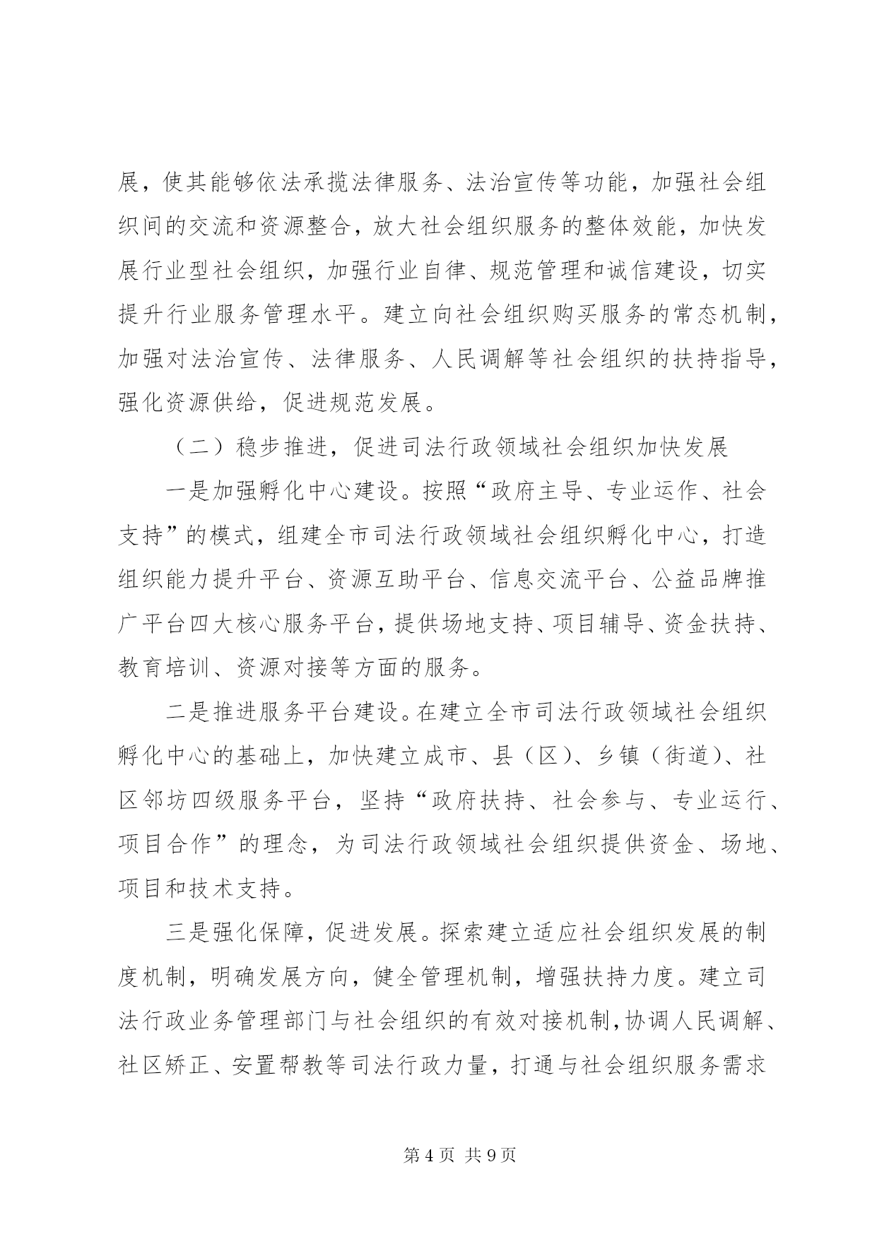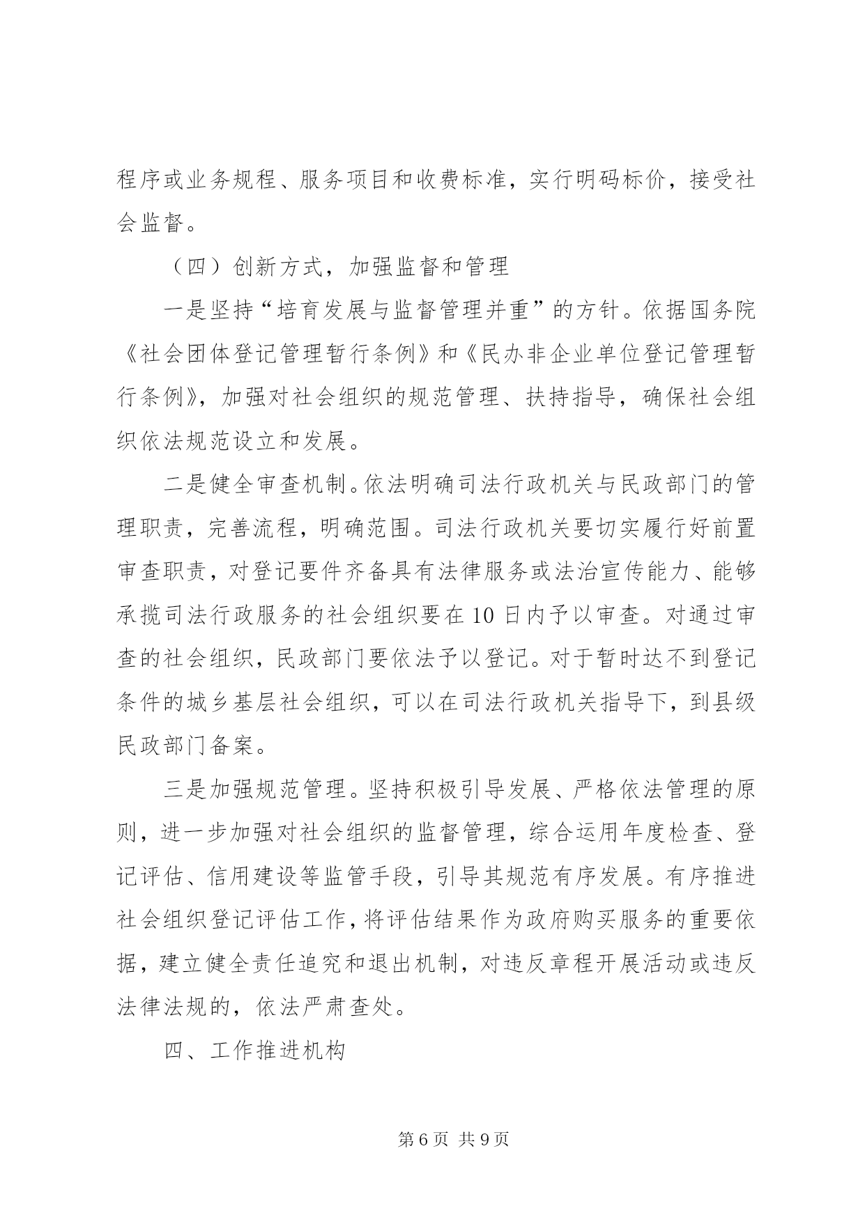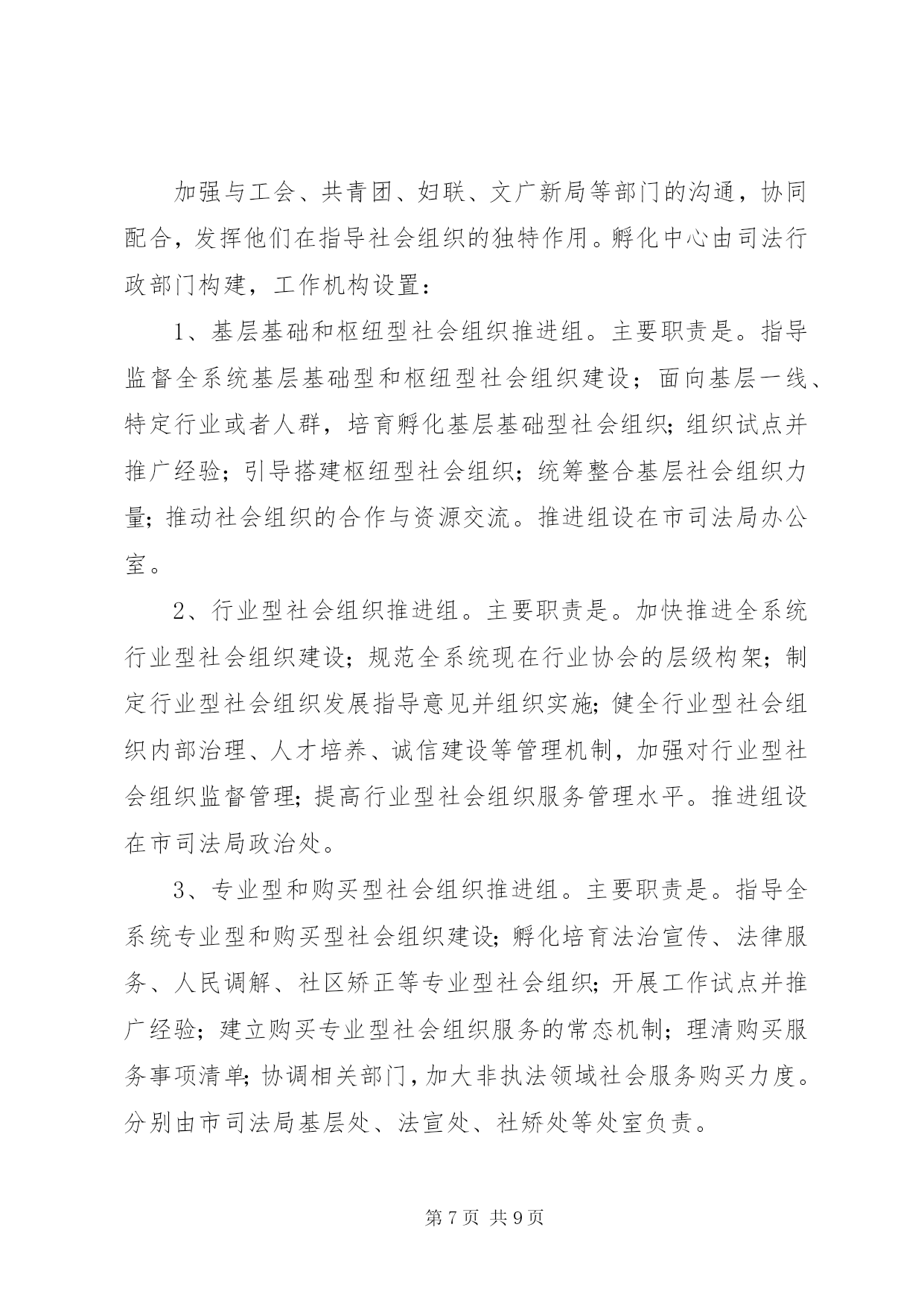 第PAGE\*Arabic\*MERGEFORMAT9页共NUMPAGES\*MERGEFORMAT9页司法领域社会组织培育发展实施方案小编寄语。下面是我们文秘114的小编为大家整理的司法领域社会组织培育发展实施方案,请大家参阅。为认真贯彻党的十八大、十八届四中五中全会精神,充分发挥社会组织在放大司法行政服务效应、推进多层次多领域依法治理中的积极作用,更好地满足广大群众对法治宣传、法律服务的需求,现就加快推进我市司法行政领域社会组织培育发展提出以下实施意见:一、指导思想司法行政领域社会组织是指经司法行政机关审查同意,在民政部门登记或备案,由广大群众自发组织建立的,以法治宣传、法律服务和特殊人群服务管理为主要服务内容的社会组织。司法行政领域社会组织培育发展要紧紧围绕法治**建设的目标任务,以满足人民群众日益增长的法治需求为出发点,以扩大社会组织覆盖面,提升司法行政服务质效为重点,按照“积极引导、加快培育、优化服务、促进规范、发挥作用”的要求,突出发展重点,优化发展环境,创新体制机制,强化指导服务,大力推进司法行政领域社会组织健康有序发展,促进社会组织在创新社会治理机制、推动司法行政事业发展中发挥积极作用。二、目标任务加快构建司法行政领域社会组织发展体系,力争在“十三五”期间,建成与经济社会和司法行政事业发展水平相匹配,与人民群众多样化法治宣传、法律服务需求相适应,覆盖广泛、功能完善、管理规范、作用明显的社会组织网络。按照“成体系、成规模”的要求,通过培育发展,到2016年底,基本建立统一登记、覆盖面广、专业度高、协调配合的社会组织管理体制,实现市、县(区)全覆盖,乡镇建成率50%以上;到2018年底,实现乡镇全覆盖,村(社区)建成率达到50%以上;到2020年底,实现市、县(区)、乡镇、村居四级司法行政社会组织全覆盖。(一)构建结构合理、覆盖广泛的社会组织体系。推动社会组织多样化发展,加强行业性社会组织建设,依法建立各级司法行政行业协会,重点引导推动服务城乡社区的基层型、枢纽型社会组织建设。(二)构建政府主导、富有活力的培育支持机制。坚持培育发展与规范引导并重,加强各级司法行政机关与社会组织之间的沟通与协作,构建经常性的沟通交流平台,形成积极互动、互相支持、密切配合的良性机制。完善政府引导、民办公助的机制,在注册登记、公共设施、人员培训、制度建设等多方面提供服务与扶持。(三)构建科学规范、依法治理的监督管理体制。注重依法管理引导,健全综合监管体系,建立登记管理机关、业务主管单位和相关职能部门各司其职、协调配合的社会组织管理体制。指导社会组织建立以章程为核心的各项规章制度,完善现代社会组织法人治理结构,推进法治化、规范化建设,实现自我规范、自我管理、自我服务、自我发展。(四)构建特色明显、作用充分的服务运行模式。引导社会组织发挥自身优势,提升服务能力,积极承接司法行政机关指导管理的法律服务、法治宣传等服务,打造各具特色的服务和活动品牌,为群众提供多样化、专业化的公共法律服务产品。三、推进措施坚持机制创新与实践创新相结合、扶持发展与自我管理相结合的原则,建立健全司法行政机关与民政部门“统一登记、各司其职、协调配合、分级负责、依法监管”的司法行政领域社会组织管理体制,不断提升培育、指导、服务和发展工作的能力和水平,促进社会组织规范有序发展。(一)明确重点,多样化培育发展社会组织根据不同社会组织的职能作用和基层群众的实际需求,有计划、有重点地做好社会组织的引导培育工作。健全完善雏形发掘、培育孵化、“出壳”登记等系列机制,大力培育发展基层型社会组织,引导群众自发建立面向村(社区)、特定行业或人群的综合服务类社会组织,延伸司法行政服务触角,将专业法律服务输送到每一个有需求的群众手中。注重发展枢纽型社会组织,整合各类基层社会组织力量,注入法律服务资源,统筹协调,融合发展,使其能够依法承揽法律服务、法治宣传等功能,加强社会组织间的交流和资源整合,放大社会组织服务的整体效能,加快发展行业型社会组织,加强行业自律、规范管理和诚信建设,切实提升行业服务管理水平。建立向社会组织购买服务的常态机制,加强对法治宣传、法律服务、人民调解等社会组织的扶持指导,强化资源供给,促进规范发展。(二)稳步推进,促进司法行政领域社会组织加快发展一是加强孵化中心建设。按照“政府主导、专业运作、社会支持”的模式,组建全市司法行政领域社会组织孵化中心,打造组织能力提升平台、资源互助平台、信息交流平台、公益品牌推广平台四大核心服务平台,提供场地支持、项目辅导、资金扶持、教育培训、资源对接等方面的服务。二是推进服务平台建设。在建立全市司法行政领域社会组织孵化中心的基础上,加快建立成市、县(区)、乡镇(街道)、社区邻坊四级服务平台,坚持“政府扶持、社会参与
