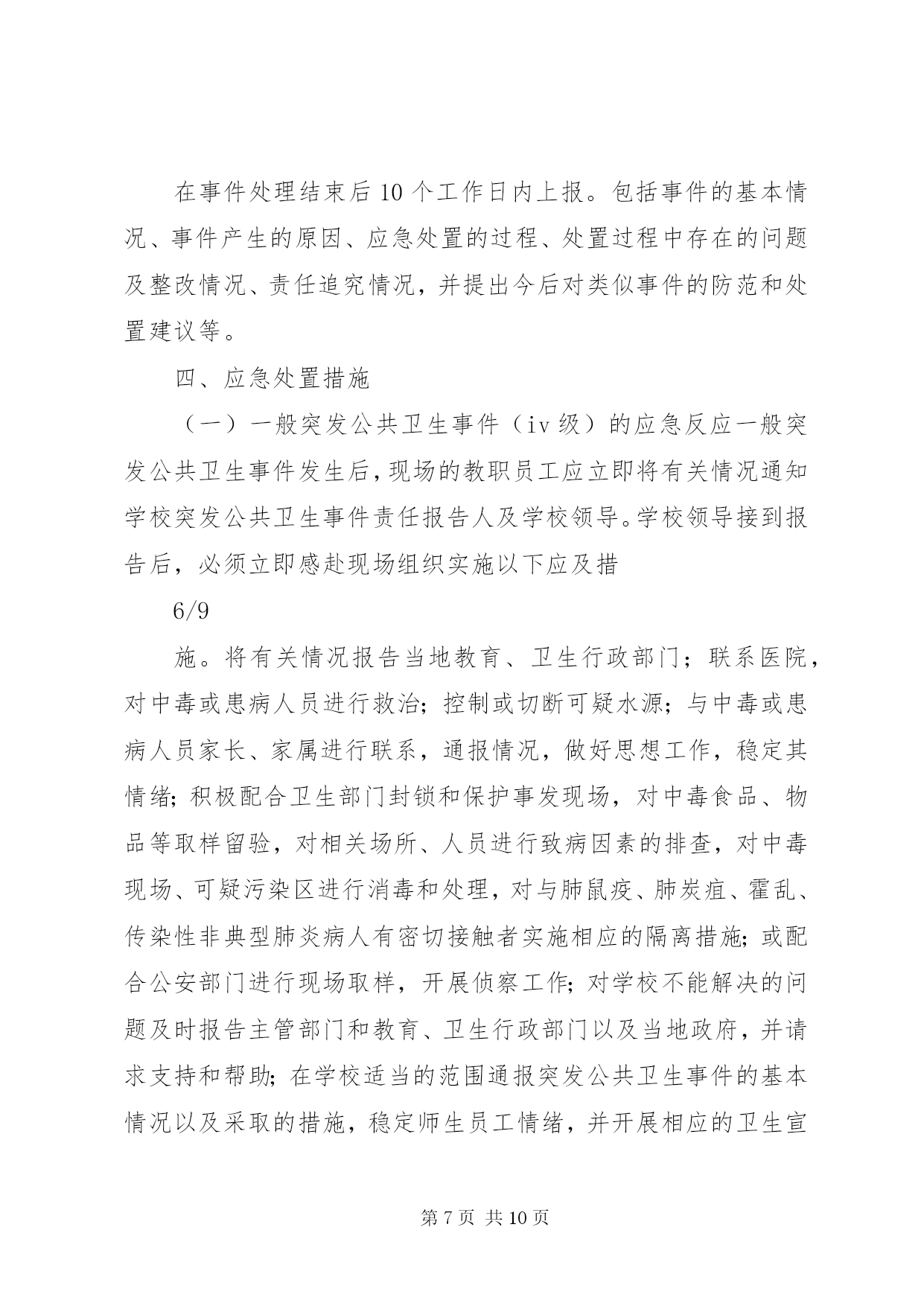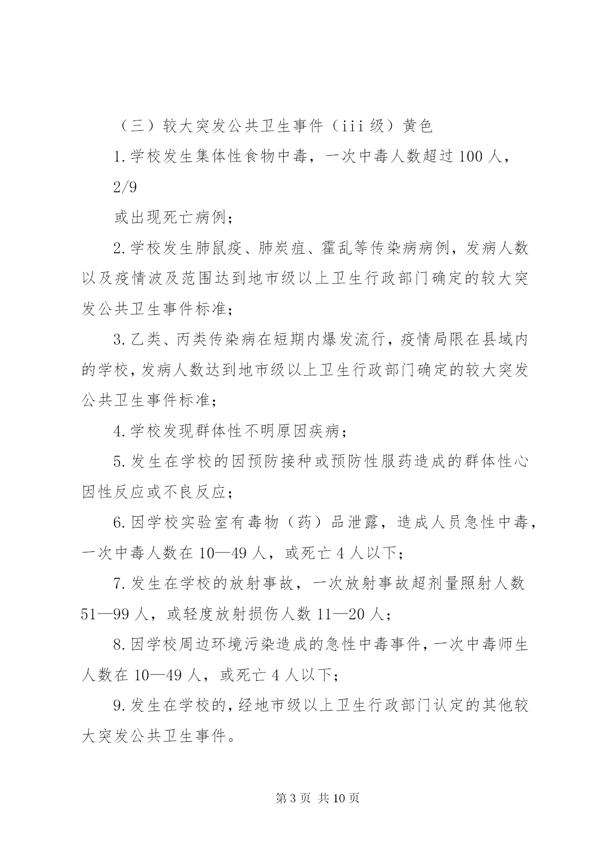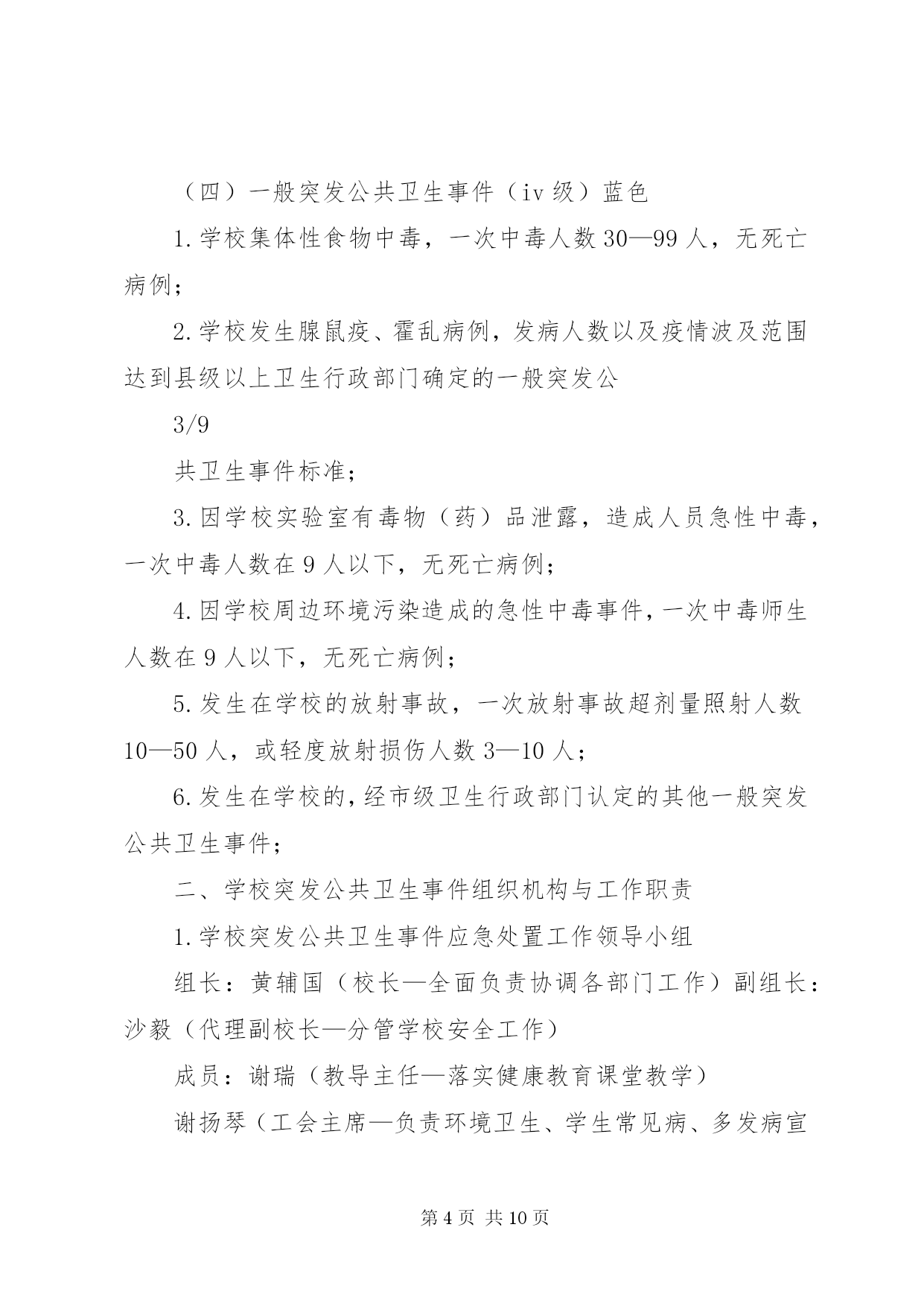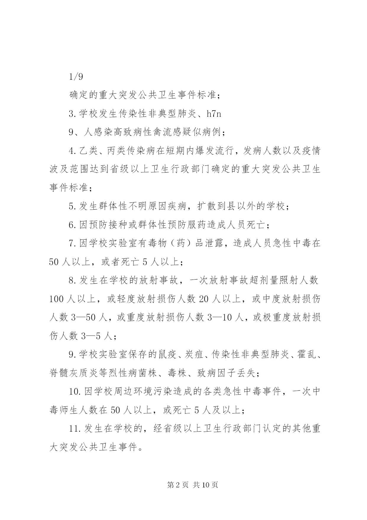 第PAGE\*Arabic\*MERGEFORMAT10页共NUMPAGES\*MERGEFORMAT10页公共卫生突发事件处置应急预案XX县区松林坡乡中心小学突发公共卫生事件应急预案学校突发公共卫生事件是指在学校内突然发生,造成或可能造成师生员工身体健康严重伤害的传染病疫情,群体性不明原因疾病、群体性异常反应、食物和职业中毒以及其他严重影响师生员工身体健康的公共卫生事件。学校突发公共卫生事件应急处置工作遵循预防为主的方针,贯彻统一领导、分级负责、分类指导、加强合作、群防群控的原则。建立突发公共卫生事件预警预报机制,尽早发现突发公共卫生事件的苗头,及时采取相应措施,迅速控制和消除突发公共卫生事件的危害。一、突发公共卫生事件的分级(一)特别重大突发公共卫生事件(I级)红色学校发生的肺鼠疫、肺炭疽、传染性非典型肺炎、人感染高致病性禽流感病例、群体性不明原因疾病、放射损伤、新传染病以及我国已消灭传染病等达到卫生部确定的特别重大突发公共卫生事件标准的。(二)重大突发公共卫生事件(ii级)橙色1.学校发生集体食物中毒,一次中毒人数超过100人并出现死亡病例,或出现10例及以上死亡病例;2.学校发生肺鼠疫、肺炭疽、腺鼠疫、霍乱等传染病病例,发病人数以及疫情波及范围达到省级以上卫生行政部门1/9确定的重大突发公共卫生事件标准;3.学校发生传染性非典型肺炎、h7n9、人感染高致病性禽流感疑似病例;4.乙类、丙类传染病在短期内爆发流行,发病人数以及疫情波及范围达到省级以上卫生行政部门确定的重大突发公共卫生事件标准;5.发生群体性不明原因疾病,扩散到县以外的学校;6.因预防接种或群体性预防服药造成人员死亡;7.因学校实验室有毒物(药)品泄露,造成人员急性中毒在50人以上,或者死亡5人以上;8.发生在学校的放射事故,一次放射事故超剂量照射人数100人以上,或轻度放射损伤人数20人以上,或中度放射损伤人数3—50人,或重度放射损伤人数3—10人,或极重度放射损伤人数3—5人;9.学校实验室保存的鼠疫、炭疽、传染性非典型肺炎、霍乱、脊髓灰质炎等烈性病菌株、毒株、致病因子丢失;10.因学校周边环境污染造成的各类急性中毒事件,一次中毒师生人数在50人以上,或死亡5人及以上;11.发生在学校的,经省级以上卫生行政部门认定的其他重大突发公共卫生事件。(三)较大突发公共卫生事件(iii级)黄色1.学校发生集体性食物中毒,一次中毒人数超过100人,2/9或出现死亡病例;2.学校发生肺鼠疫、肺炭疽、霍乱等传染病病例,发病人数以及疫情波及范围达到地市级以上卫生行政部门确定的较大突发公共卫生事件标准;3.乙类、丙类传染病在短期内爆发流行,疫情局限在县域内的学校,发病人数达到地市级以上卫生行政部门确定的较大突发公共卫生事件标准;4.学校发现群体性不明原因疾病;5.发生在学校的因预防接种或预防性服药造成的群体性心因性反应或不良反应;6.因学校实验室有毒物(药)品泄露,造成人员急性中毒,一次中毒人数在10—49人,或死亡4人以下;7.发生在学校的放射事故,一次放射事故超剂量照射人数51—99人,或轻度放射损伤人数11—20人;8.因学校周边环境污染造成的急性中毒事件,一次中毒师生人数在10—49人,或死亡4人以下;9.发生在学校的,经地市级以上卫生行政部门认定的其他较大突发公共卫生事件。(四)一般突发公共卫生事件(iv级)蓝色1.学校集体性食物中毒,一次中毒人数30—99人,无死亡病例;2.学校发生腺鼠疫、霍乱病例,发病人数以及疫情波及范围达到县级以上卫生行政部门确定的一般突发公3/9共卫生事件标准;3.因学校实验室有毒物(药)品泄露,造成人员急性中毒,一次中毒人数在9人以下,无死亡病例;4.因学校周边环境污染造成的急性中毒事件,一次中毒师生人数在9人以下,无死亡病例;5.发生在学校的放射事故,一次放射事故超剂量照射人数10—50人,或轻度放射损伤人数3—10人;6.发生在学校的,经市级卫生行政部门认定的其他一般突发公共卫生事件;二、学校突发公共卫生事件组织机构与工作职责1.学校突发公共卫生事件应急处置工作领导小组组长:黄辅国(校长—全面负责协调各部门工作)副组长:沙毅(代理副校长—分管学校安全工作)成员:谢瑞(教导主任—落实健康教育课堂教学)谢扬琴(工会主席—负责环境卫生、学生常见病、多发病宣传教育预防工作)沙柳(少先队总辅导员—组织开展各项活动)谢珊(办公室负责人—负责信息报告工作)2.领导小组主要职责:根据上级有关部门的突发公共卫生事件应急预案,制订本校的突发公共卫生事件应急预案;建立校长负总责与分管校长具体抓的责任制,并将责任分解到部门、落实到人;明确突发公共卫生事件的信息报告人;具体实施对突发公共卫4/9生事件的紧急应对与处置工作,配合卫生