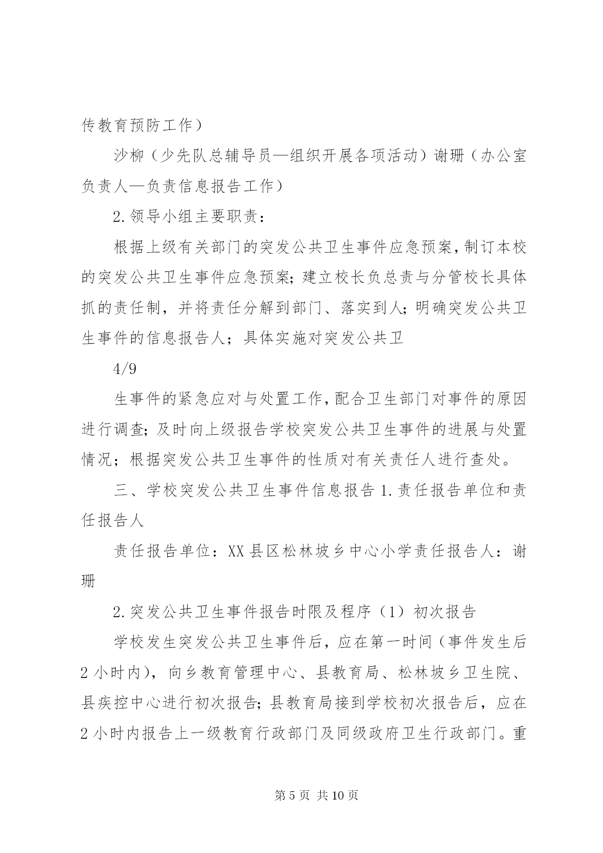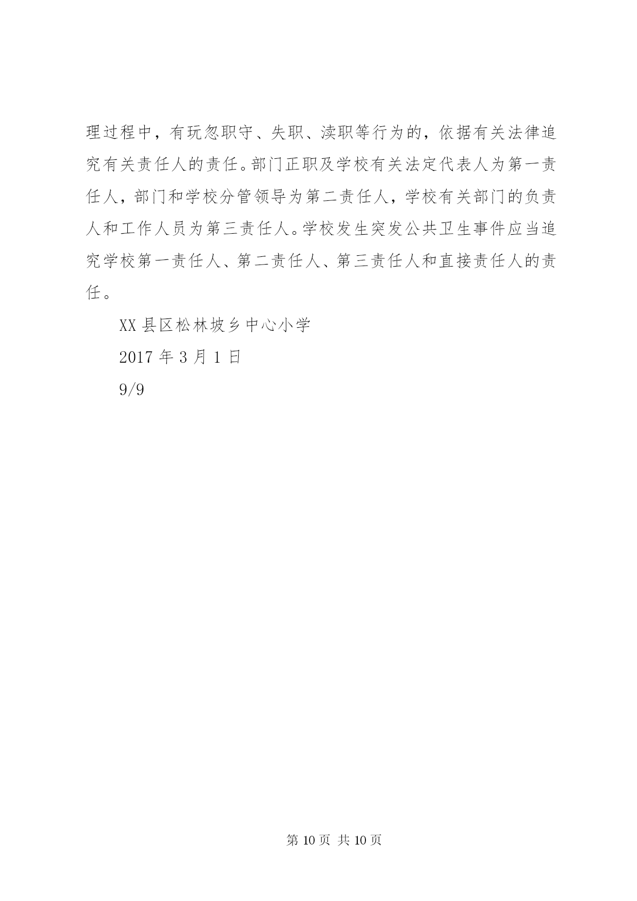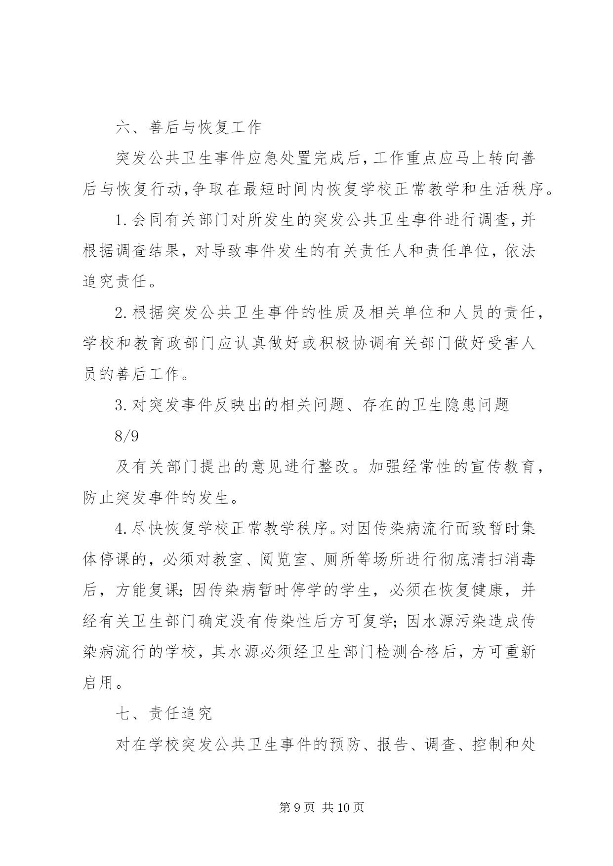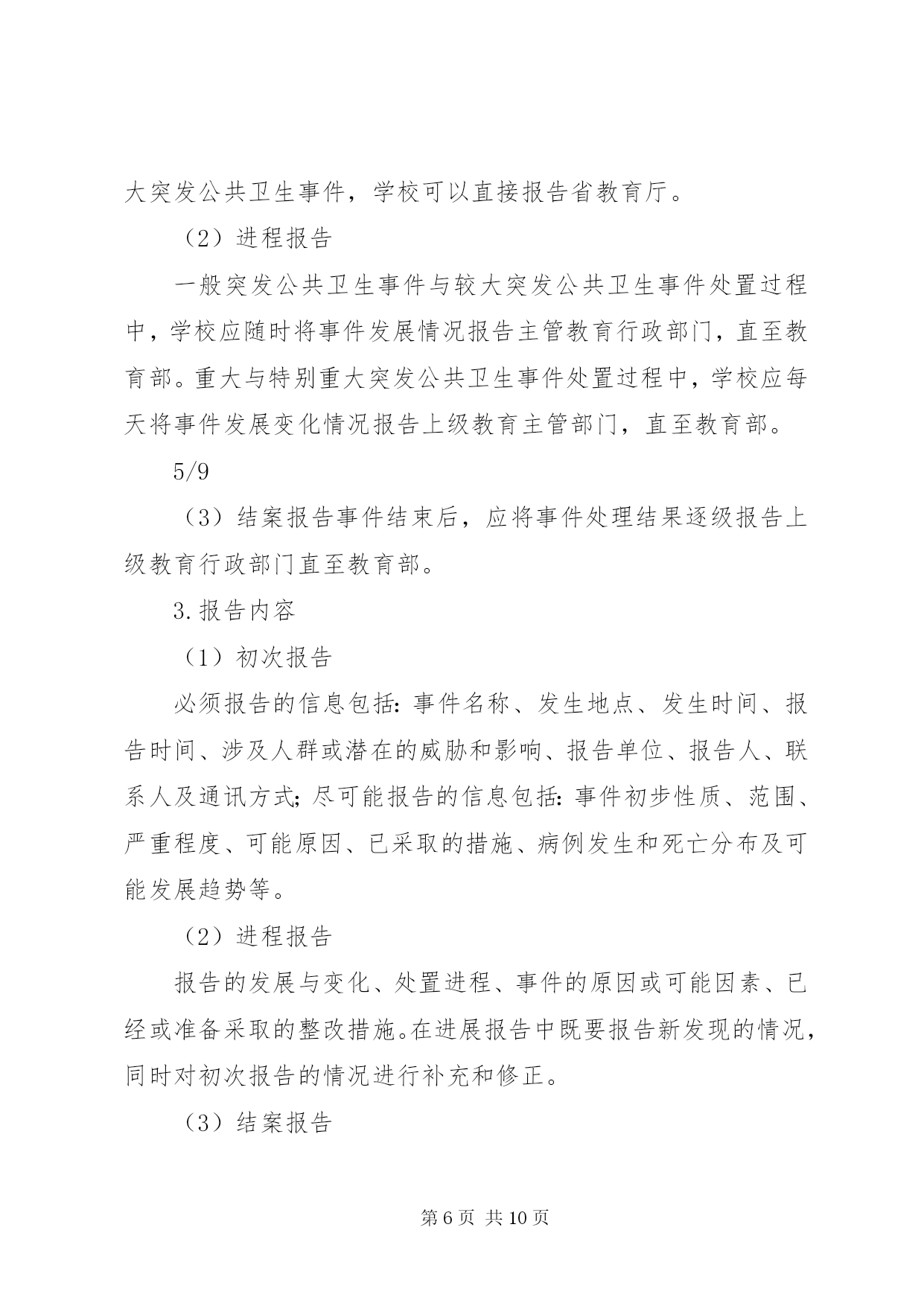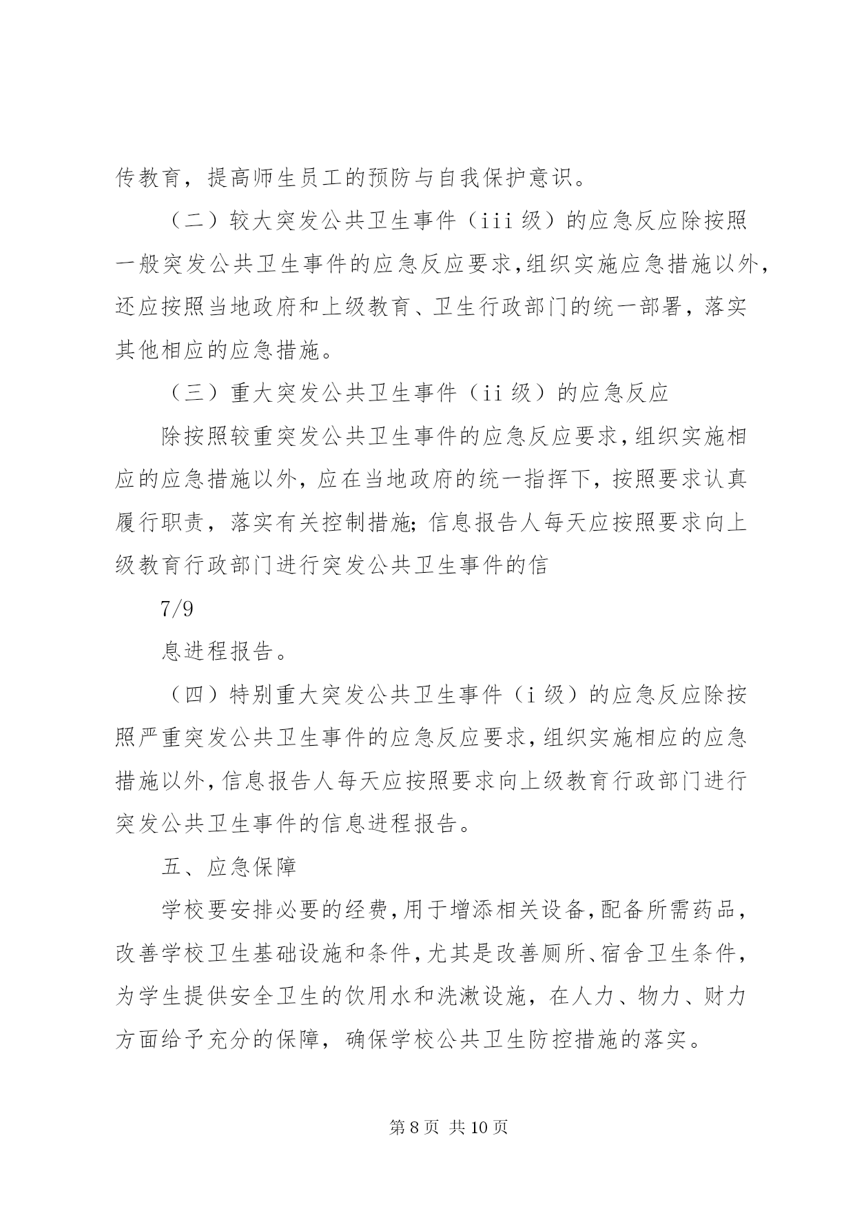 第PAGE\*Arabic\*MERGEFORMAT10页共NUMPAGES\*MERGEFORMAT10页公共卫生突发事件处置应急预案XX县区松林坡乡中心小学突发公共卫生事件应急预案学校突发公共卫生事件是指在学校内突然发生,造成或可能造成师生员工身体健康严重伤害的传染病疫情,群体性不明原因疾病、群体性异常反应、食物和职业中毒以及其他严重影响师生员工身体健康的公共卫生事件。学校突发公共卫生事件应急处置工作遵循预防为主的方针,贯彻统一领导、分级负责、分类指导、加强合作、群防群控的原则。建立突发公共卫生事件预警预报机制,尽早发现突发公共卫生事件的苗头,及时采取相应措施,迅速控制和消除突发公共卫生事件的危害。一、突发公共卫生事件的分级(一)特别重大突发公共卫生事件(I级)红色学校发生的肺鼠疫、肺炭疽、传染性非典型肺炎、人感染高致病性禽流感病例、群体性不明原因疾病、放射损伤、新传染病以及我国已消灭传染病等达到卫生部确定的特别重大突发公共卫生事件标准的。(二)重大突发公共卫生事件(ii级)橙色1.学校发生集体食物中毒,一次中毒人数超过100人并出现死亡病例,或出现10例及以上死亡病例;2.学校发生肺鼠疫、肺炭疽、腺鼠疫、霍乱等传染病病例,发病人数以及疫情波及范围达到省级以上卫生行政部门1/9确定的重大突发公共卫生事件标准;3.学校发生传染性非典型肺炎、h7n9、人感染高致病性禽流感疑似病例;4.乙类、丙类传染病在短期内爆发流行,发病人数以及疫情波及范围达到省级以上卫生行政部门确定的重大突发公共卫生事件标准;5.发生群体性不明原因疾病,扩散到县以外的学校;6.因预防接种或群体性预防服药造成人员死亡;7.因学校实验室有毒物(药)品泄露,造成人员急性中毒在50人以上,或者死亡5人以上;8.发生在学校的放射事故,一次放射事故超剂量照射人数100人以上,或轻度放射损伤人数20人以上,或中度放射损伤人数3—50人,或重度放射损伤人数3—10人,或极重度放射损伤人数3—5人;9.学校实验室保存的鼠疫、炭疽、传染性非典型肺炎、霍乱、脊髓灰质炎等烈性病菌株、毒株、致病因子丢失;10.因学校周边环境污染造成的各类急性中毒事件,一次中毒师生人数在50人以上,或死亡5人及以上;11.发生在学校的,经省级以上卫生行政部门认定的其他重大突发公共卫生事件。(三)较大突发公共卫生事件(iii级)黄色1.学校发生集体性食物中毒,一次中毒人数超过100人,2/9或出现死亡病例;2.学校发生肺鼠疫、肺炭疽、霍乱等传染病病例,发病人数以及疫情波及范围达到地市级以上卫生行政部门确定的较大突发公共卫生事件标准;3.乙类、丙类传染病在短期内爆发流行,疫情局限在县域内的学校,发病人数达到地市级以上卫生行政部门确定的较大突发公共卫生事件标准;4.学校发现群体性不明原因疾病;5.发生在学校的因预防接种或预防性服药造成的群体性心因性反应或不良反应;6.因学校实验室有毒物(药)品泄露,造成人员急性中毒,一次中毒人数在10—49人,或死亡4人以下;7.发生在学校的放射事故,一次放射事故超剂量照射人数51—99人,或轻度放射损伤人数11—20人;8.因学校周边环境污染造成的急性中毒事件,一次中毒师生人数在10—49人,或死亡4人以下;9.发生在学校的,经地市级以上卫生行政部门认定的其他较大突发公共卫生事件。(四)一般突发公共卫生事件(iv级)蓝色1.学校集体性食物中毒,一次中毒人数30—99人,无死亡病例;2.学校发生腺鼠疫、霍乱病例,发病人数以及疫情波及范围达到县级以上卫生行政部门确定的一般突发公3/9共卫生事件标准;3.因学校实验室有毒物(药)品泄露,造成人员急性中毒,一次中毒人数在9人以下,无死亡病例;4.因学校周边环境污染造成的急性中毒事件,一次中毒师生人数在9人以下,无死亡病例;5.发生在学校的放射事故,一次放射事故超剂量照射人数10—50人,或轻度放射损伤人数3—10人;6.发生在学校的,经市级卫生行政部门认定的其他一般突发公共卫生事件;二、学校突发公共卫生事件组织机构与工作职责1.学校突发公共卫生事件应急处置工作领导小组组长:黄辅国(校长—全面负责协调各部门工作)副组长:沙毅(代理副校长—分管学校安全工作)成员:谢瑞(教导主任—落实健康教育课堂教学)谢扬琴(工会主席—负责环境卫生、学生常见病、多发病宣传教育预防工作)沙柳(少先队总辅导员—组织开展各项活动)谢珊(办公室负责人—负责信息报告工作)2.领导小组主要职责:根据上级有关部门的突发公共卫生事件应急预案,制订本校的突发公共卫生事件应急预案;建立校长负总责与分管校长具体抓的责任制,并将责任分解到部门、落实到人;明确突发公共卫生事件的信息报告人;具体实施对突发公共卫4/9生事件的紧急应对与处置工作,配合卫生
