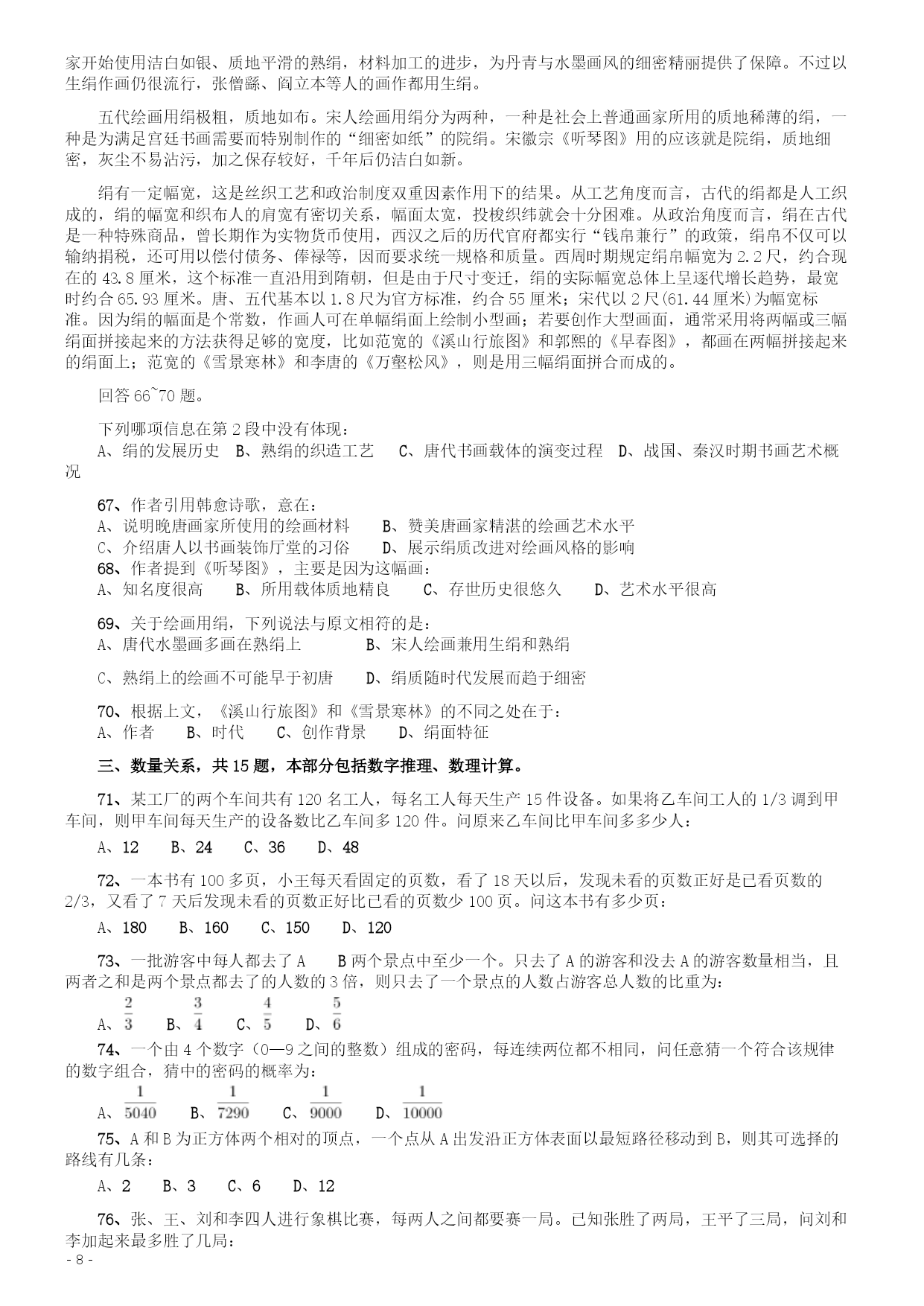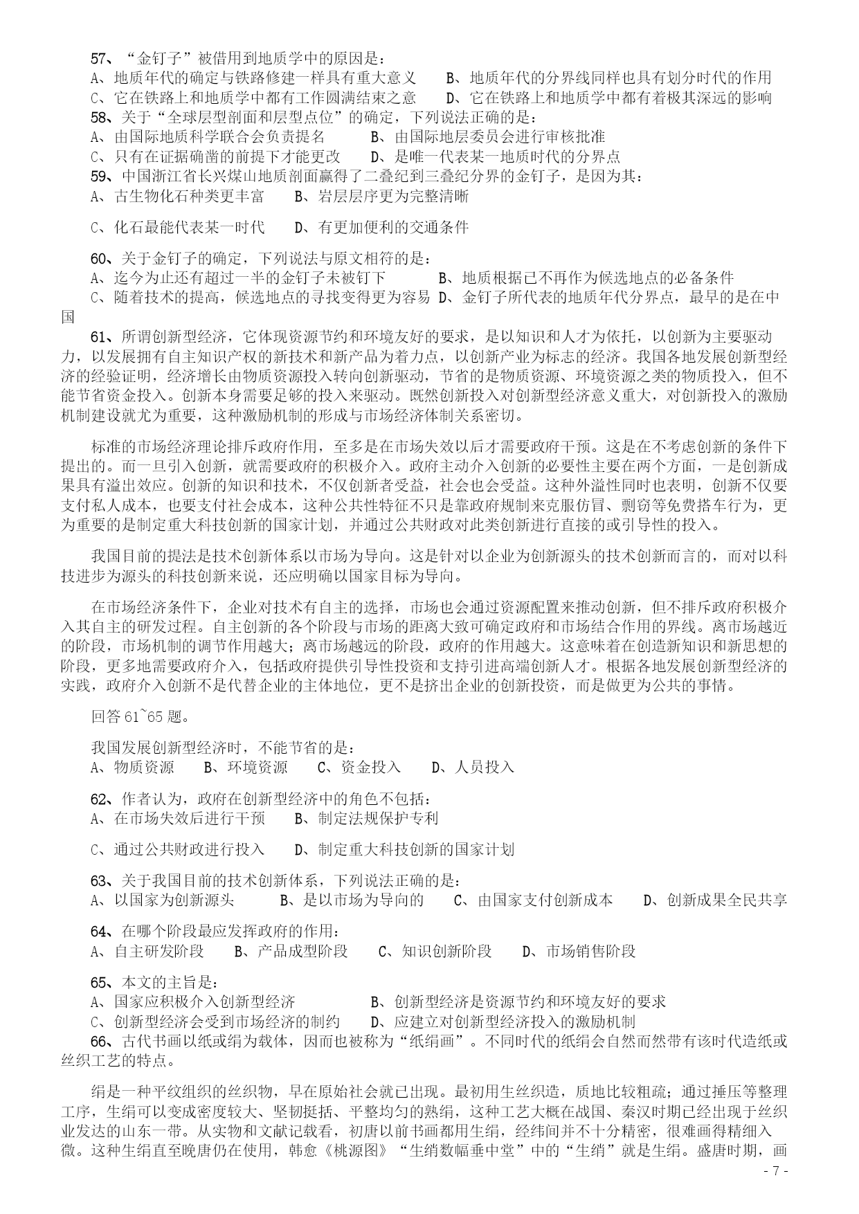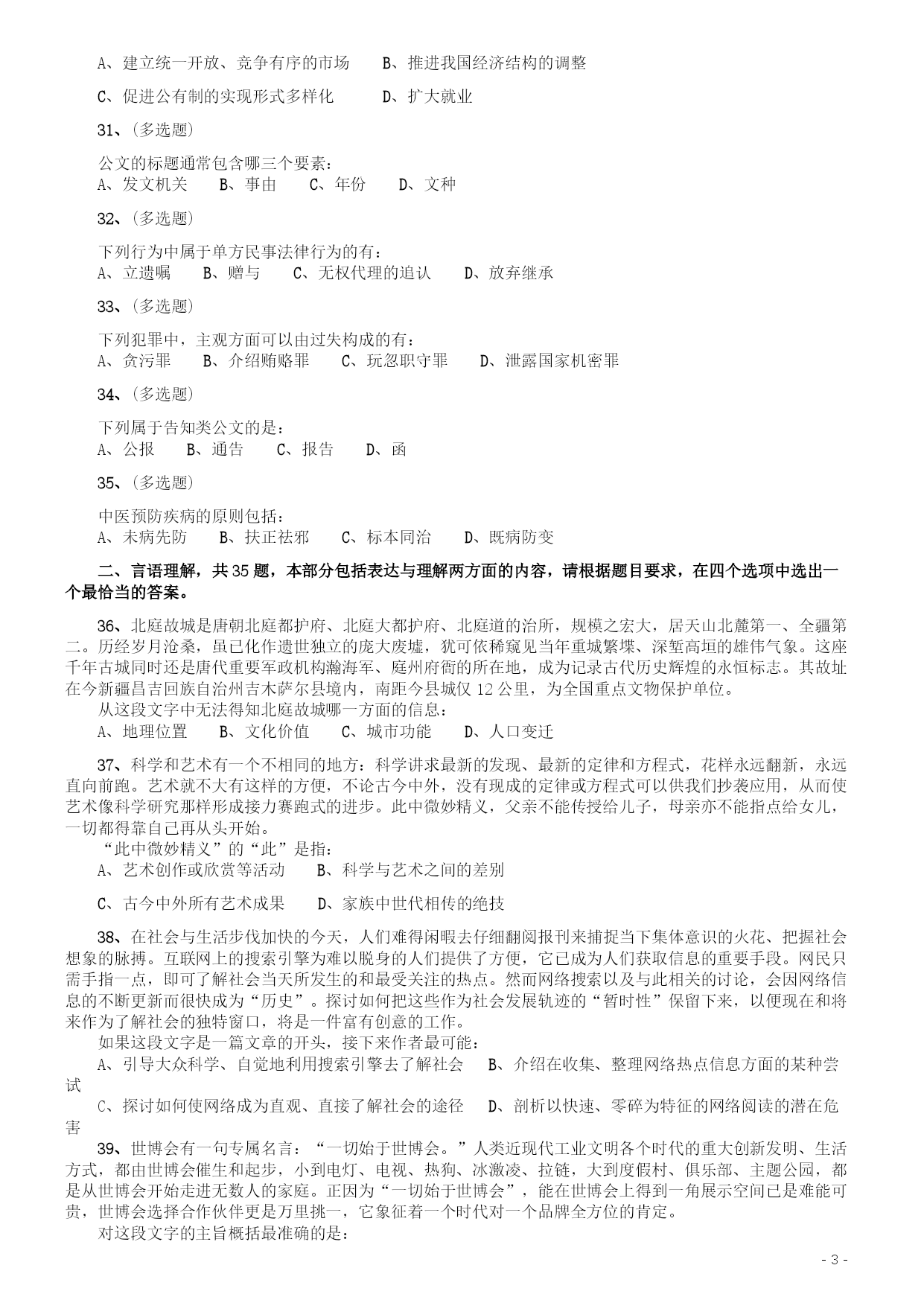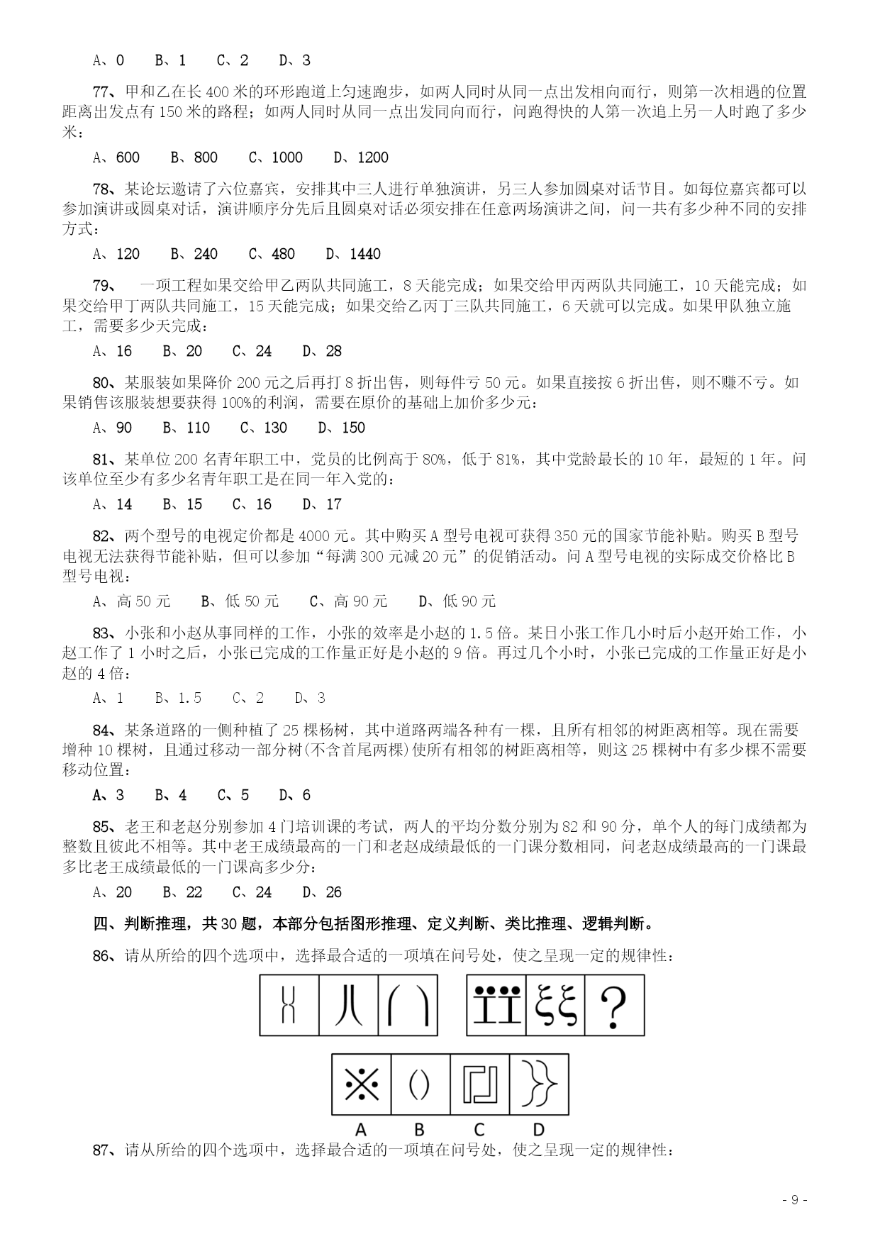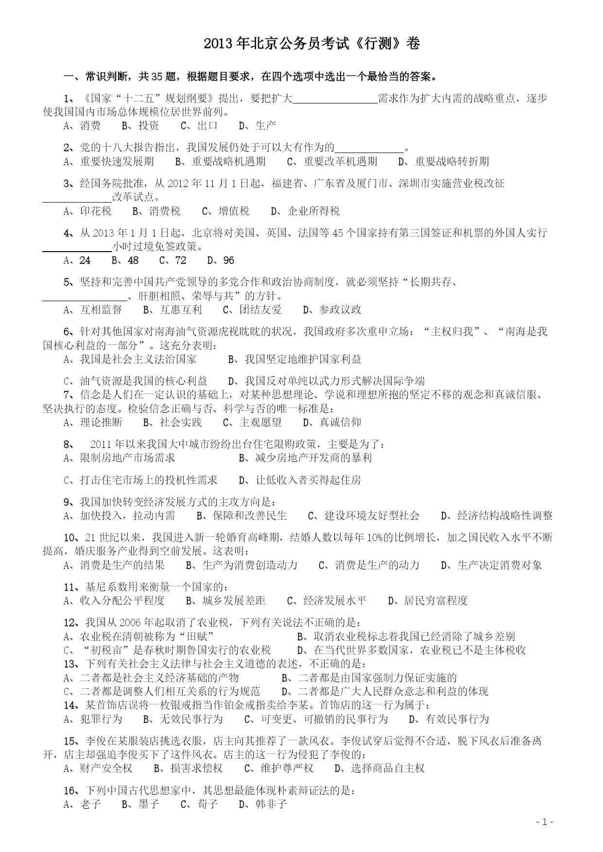 PAGE\*MERGEFORMAT-17-2013年北京公务员考试《行测》卷一、常识判断,共35题,根据题目要求,在四个选项中选出一个最恰当的答案。1、《国家“十二五”规划纲要》提出,要把扩大需求作为扩大内需的战略重点,逐步使我国国内市场总体规模位居世界前列。A、消费B、投资C、出口D、生产2、党的十八大报告指出,我国发展仍处于可以大有作为的。A、重要快速发展期B、重要战略机遇期C、重要改革机遇期D、重要战略转折期3、经国务院批准,从2012年11月1日起,福建省、广东省及厦门市、深圳市实施营业税改征改革试点。A、印花税B、消费税C、增值税D、企业所得税4、从2013年1月1日起,北京将对美国、英国、法国等45个国家持有第三国签证和机票的外国人实行小时过境免签政策。A、24B、48C、72D、965、坚持和完善中国共产党领导的多党合作和政治协商制度,就必须坚持“长期共存、、肝胆相照、荣辱与共”的方针。A、互相监督B、互惠互利C、团结友爱D、参政议政6、针对其他国家对南海油气资源虎视眈眈的状况,我国政府多次重申立场:“主权归我”、“南海是我国核心利益的一部分”。这充分表明:A、我国是社会主义法治国家B、我国坚定地维护国家利益C、油气资源是我国的核心利益D、我国反对单纯以武力形式解决国际争端7、信念是人们在一定认识的基础上,对某种思想理论、学说和理想所抱的坚定不移的观念和真诚信服、坚决执行的态度。检验信念正确与否、科学与否的唯一标准是:A、理论推断B、社会实践C、主观愿望D、真诚信仰8、2011年以来我国大中城市纷纷出台住宅限购政策,主要是为了:A、限制房地产市场需求B、减少房地产开发商的暴利C、打击住宅市场上的投机性需求D、让低收入者买得起住房9、我国加快转变经济发展方式的主攻方向是:A、加快投入,拉动内需B、保障和改善民生C、建设环境友好型社会D、经济结构战略性调整10、21世纪以来,我国进入新一轮婚育高峰期,结婚人数以每年10%的比例增长,加之国民收入水平不断提高,婚庆服务产业得到空前发展。这表明:A、消费是生产的结果B、生产为消费创造动力C、消费是生产的动力D、生产决定消费对象11、基尼系数用来衡量一个国家的:A、收入分配公平程度B、城乡发展差距C、经济发展水平D、居民穷富程度12、我国从2006年起取消了农业税,下列有关说法不正确的是:A、农业税在清朝被称为“田赋”B、取消农业税标志着我国已经消除了城乡差别C、“初税亩”是春秋时期鲁国实行的农业税D、在当代世界多数国家,农业税已不是主体税收13、下列有关社会主义法律与社会主义道德的表述,不正确的是:A、二者都是社会主义经济基础的产物B、二者都是由国家强制力保证实施的C、二者都是调整人们相互关系的行为规范D、二者都是广大人民群众意志和利益的体现14、某首饰店误将一枚银戒指当作铂金戒指卖给李某。首饰店的这一行为属于:A、犯罪行为B、无效民事行为C、可变更、可撤销的民事行为D、有效民事行为15、李俊在某服装店挑选衣服,店主向其推荐了一款风衣。李俊试穿后觉得不合适,脱下风衣后准备离开,店主却强追李俊买下了这件风衣。店主的这一行为侵犯了李俊的:A、财产安全权B、损害求偿权C、维护尊严权D、选择商品自主权16、下列中国古代思想家中,其思想最能体现朴素辩证法的是:A、老子B、墨子C、荀子D、韩非子17、联合国是当代世界重要的国际组织,下列表述正确的是:A、联合国总部位于美国华盛顿B、《联合国宪章》是联合国的基本法C、德国属于联合国安全理事会常任理事国D、每年的6月25日是联合国日18、恩格斯说:“……他用这本书来向自然事物方面的教会权威挑战。从此自然科学便开始从神学中解放出来……”。引文中的“他”和“这本书”指的是:A、但丁和《神曲》B、哥白尼和《天体运行论》C、达尔文和《生物进化论》D、托马斯•莫尔和《乌托邦》19、1927年八七会议上,毛泽东提出了()思想。A、游击战争B、农村包围城市C、支部建在连上D、枪杆子里面出政权20、“杂交水稻之父”袁隆平院士将野生水稻和普通水稻多次杂交,培育出高产的杂交水稻新品种,利用的原理是:A、生态系统的多样性B、染色体的多样性C、基因的多样性D、细胞的多样性21、自然界中不同生物之间的共生关系一般理解为“相互依存,互利互惠”,下列存在共生关系的是:A、寄居蟹与海葵B、同一草原上的牛群与羊群C、菟丝子与豆科植物D、霸王花与大叶山毛榉22、某城市素有“十三朝古都、八代陪都”之说,是我国建都时间最长,建都朝代最多的千年帝都。这座城市是:A、开封B、杭州C、西安D、洛阳23、2012年北京市第十一次党代会提出,北京必须