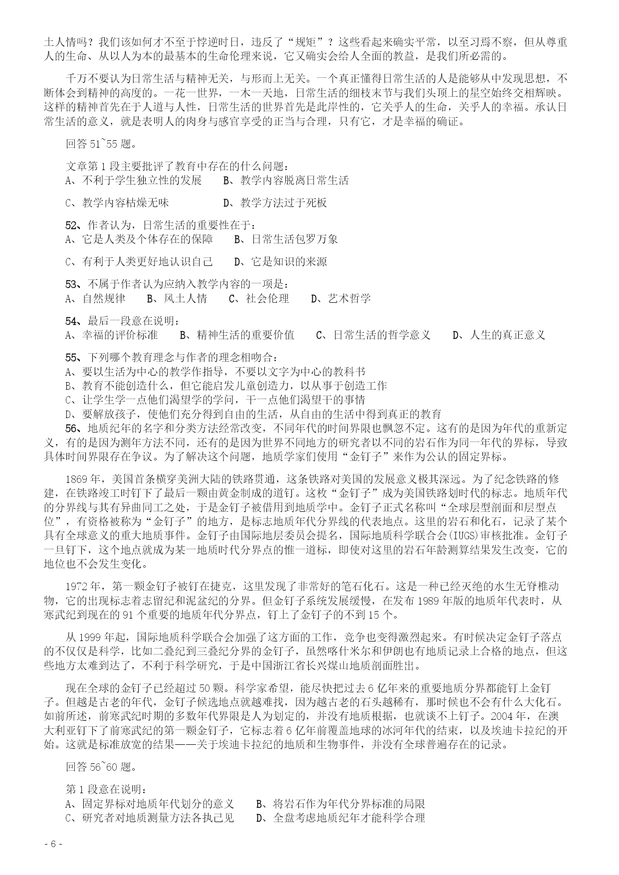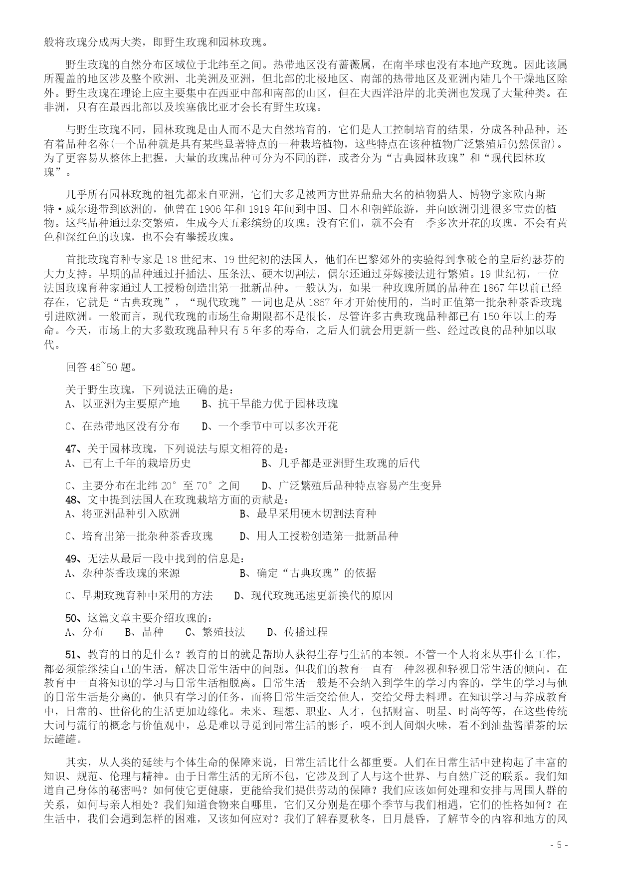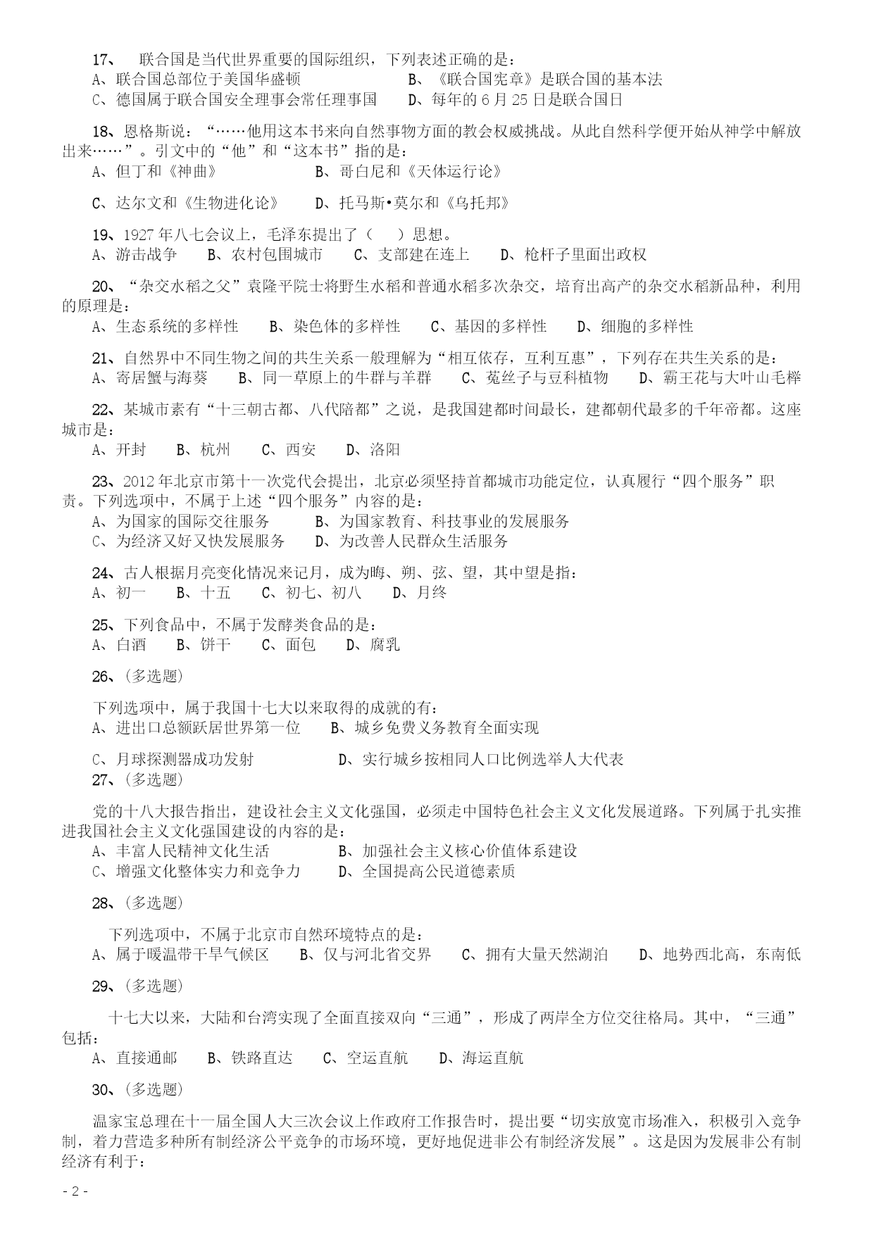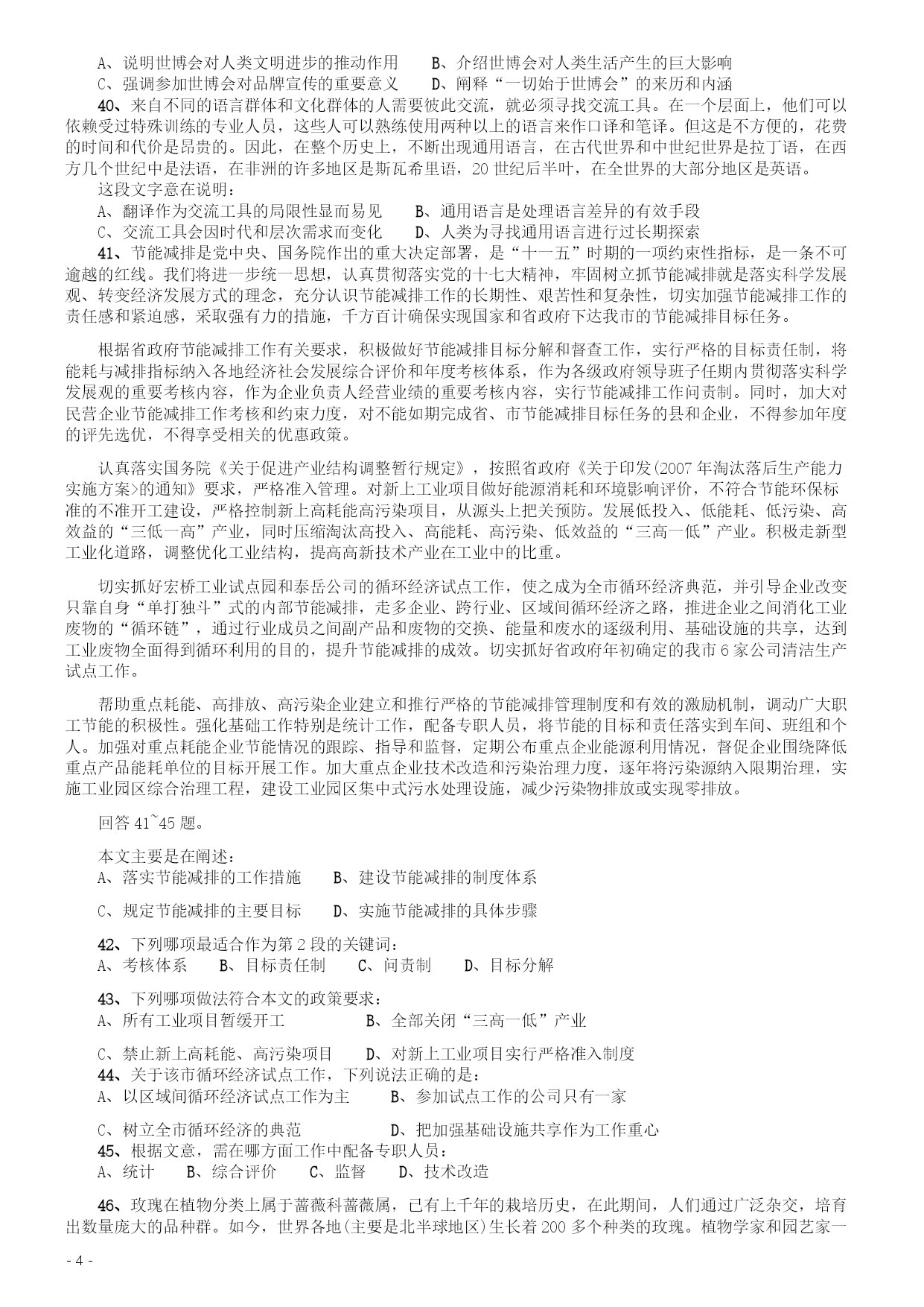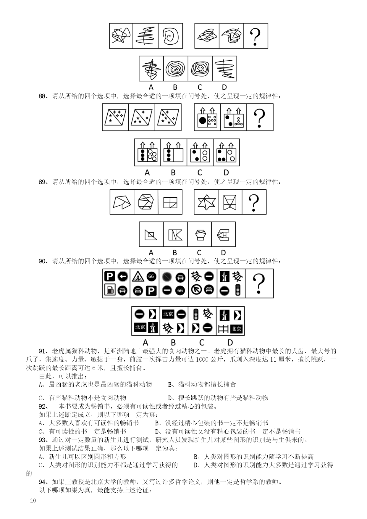 PAGE\*MERGEFORMAT-17-2013年北京公务员考试《行测》卷一、常识判断,共35题,根据题目要求,在四个选项中选出一个最恰当的答案。1、《国家“十二五”规划纲要》提出,要把扩大需求作为扩大内需的战略重点,逐步使我国国内市场总体规模位居世界前列。A、消费B、投资C、出口D、生产2、党的十八大报告指出,我国发展仍处于可以大有作为的。A、重要快速发展期B、重要战略机遇期C、重要改革机遇期D、重要战略转折期3、经国务院批准,从2012年11月1日起,福建省、广东省及厦门市、深圳市实施营业税改征改革试点。A、印花税B、消费税C、增值税D、企业所得税4、从2013年1月1日起,北京将对美国、英国、法国等45个国家持有第三国签证和机票的外国人实行小时过境免签政策。A、24B、48C、72D、965、坚持和完善中国共产党领导的多党合作和政治协商制度,就必须坚持“长期共存、、肝胆相照、荣辱与共”的方针。A、互相监督B、互惠互利C、团结友爱D、参政议政6、针对其他国家对南海油气资源虎视眈眈的状况,我国政府多次重申立场:“主权归我”、“南海是我国核心利益的一部分”。这充分表明:A、我国是社会主义法治国家B、我国坚定地维护国家利益C、油气资源是我国的核心利益D、我国反对单纯以武力形式解决国际争端7、信念是人们在一定认识的基础上,对某种思想理论、学说和理想所抱的坚定不移的观念和真诚信服、坚决执行的态度。检验信念正确与否、科学与否的唯一标准是:A、理论推断B、社会实践C、主观愿望D、真诚信仰8、2011年以来我国大中城市纷纷出台住宅限购政策,主要是为了:A、限制房地产市场需求B、减少房地产开发商的暴利C、打击住宅市场上的投机性需求D、让低收入者买得起住房9、我国加快转变经济发展方式的主攻方向是:A、加快投入,拉动内需B、保障和改善民生C、建设环境友好型社会D、经济结构战略性调整10、21世纪以来,我国进入新一轮婚育高峰期,结婚人数以每年10%的比例增长,加之国民收入水平不断提高,婚庆服务产业得到空前发展。这表明:A、消费是生产的结果B、生产为消费创造动力C、消费是生产的动力D、生产决定消费对象11、基尼系数用来衡量一个国家的:A、收入分配公平程度B、城乡发展差距C、经济发展水平D、居民穷富程度12、我国从2006年起取消了农业税,下列有关说法不正确的是:A、农业税在清朝被称为“田赋”B、取消农业税标志着我国已经消除了城乡差别C、“初税亩”是春秋时期鲁国实行的农业税D、在当代世界多数国家,农业税已不是主体税收13、下列有关社会主义法律与社会主义道德的表述,不正确的是:A、二者都是社会主义经济基础的产物B、二者都是由国家强制力保证实施的C、二者都是调整人们相互关系的行为规范D、二者都是广大人民群众意志和利益的体现14、某首饰店误将一枚银戒指当作铂金戒指卖给李某。首饰店的这一行为属于:A、犯罪行为B、无效民事行为C、可变更、可撤销的民事行为D、有效民事行为15、李俊在某服装店挑选衣服,店主向其推荐了一款风衣。李俊试穿后觉得不合适,脱下风衣后准备离开,店主却强追李俊买下了这件风衣。店主的这一行为侵犯了李俊的:A、财产安全权B、损害求偿权C、维护尊严权D、选择商品自主权16、下列中国古代思想家中,其思想最能体现朴素辩证法的是:A、老子B、墨子C、荀子D、韩非子17、联合国是当代世界重要的国际组织,下列表述正确的是:A、联合国总部位于美国华盛顿B、《联合国宪章》是联合国的基本法C、德国属于联合国安全理事会常任理事国D、每年的6月25日是联合国日18、恩格斯说:“……他用这本书来向自然事物方面的教会权威挑战。从此自然科学便开始从神学中解放出来……”。引文中的“他”和“这本书”指的是:A、但丁和《神曲》B、哥白尼和《天体运行论》C、达尔文和《生物进化论》D、托马斯•莫尔和《乌托邦》19、1927年八七会议上,毛泽东提出了()思想。A、游击战争B、农村包围城市C、支部建在连上D、枪杆子里面出政权20、“杂交水稻之父”袁隆平院士将野生水稻和普通水稻多次杂交,培育出高产的杂交水稻新品种,利用的原理是:A、生态系统的多样性B、染色体的多样性C、基因的多样性D、细胞的多样性21、自然界中不同生物之间的共生关系一般理解为“相互依存,互利互惠”,下列存在共生关系的是:A、寄居蟹与海葵B、同一草原上的牛群与羊群C、菟丝子与豆科植物D、霸王花与大叶山毛榉22、某城市素有“十三朝古都、八代陪都”之说,是我国建都时间最长,建都朝代最多的千年帝都。这座城市是:A、开封B、杭州C、西安D、洛阳23、2012年北京市第十一次党代会提出,北京必须