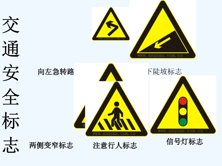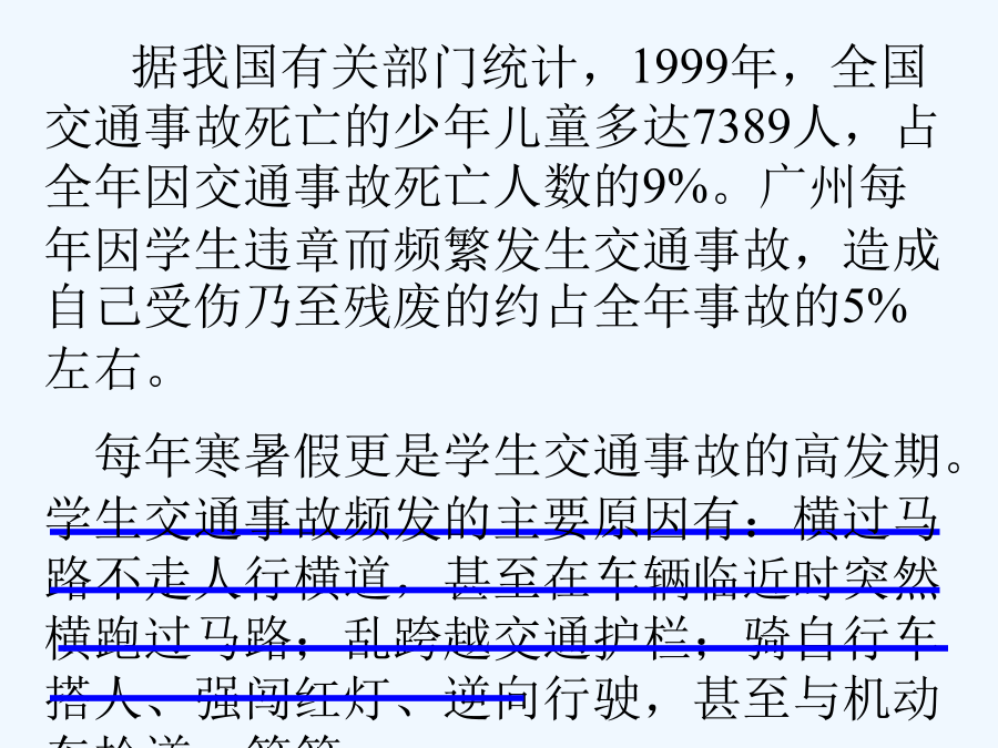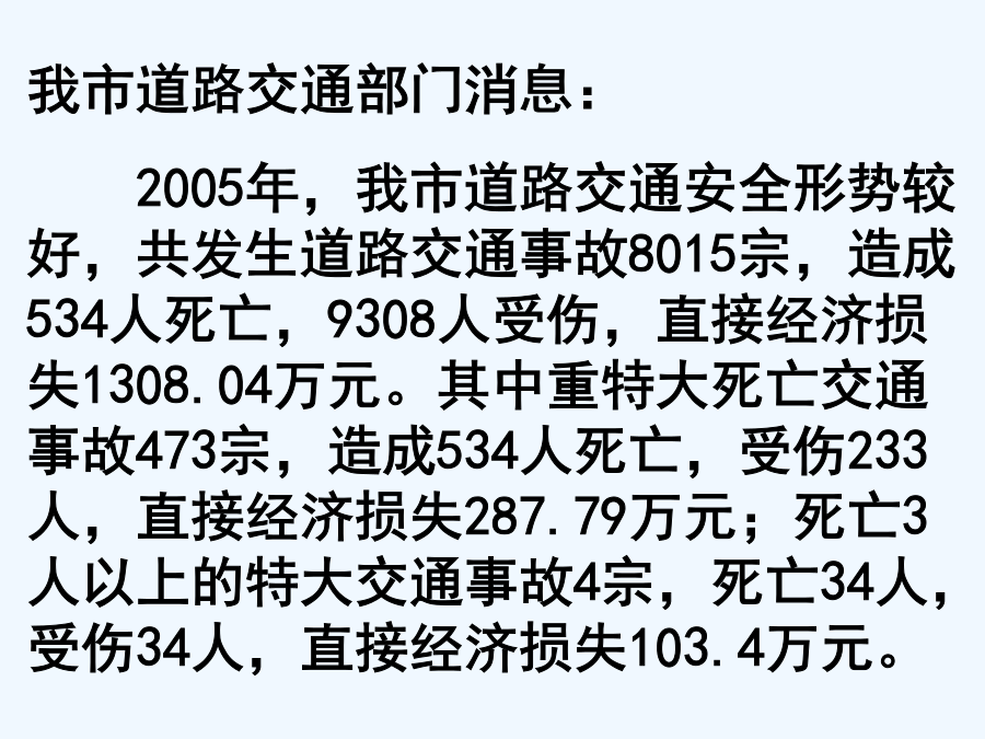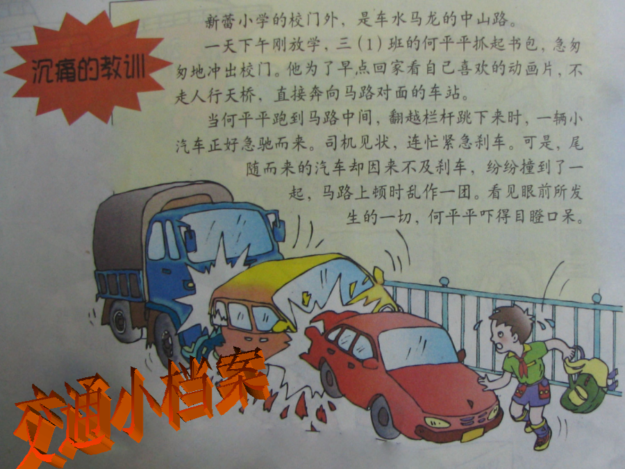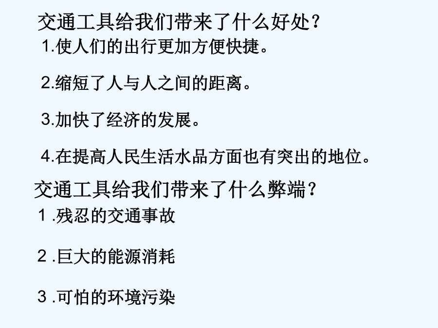 交通工具交通工具给我们带来了什么好处?交通安全标志我市道路交通部门消息:2005年,我市道路交通安全形势较好,共发生道路交通事故8015宗,造成534人死亡,9308人受伤,直接经济损失1308.04万元。其中重特大死亡交通事故473宗,造成534人死亡,受伤233人,直接经济损失287.79万元;死亡3人以上的特大交通事故4宗,死亡34人,受伤34人,直接经济损失103.4万元。据我国有关部门统计,1999年,全国交通事故死亡的少年儿童多达7389人,占全年因交通事故死亡人数的9%。广州每年因学生违章而频繁发生交通事故,造成自己受伤乃至残废的约占全年事故的5%左右。每年寒暑假更是学生交通事故的高发期。学生交通事故频发的主要原因有:横过马路不走人行横道,甚至在车辆临近时突然横跑过马路;乱跨越交通护栏;骑自行车搭人、强闯红灯、逆向行驶,甚至与机动车抢道,等等。大家有疑问的,可以询问和交流交通小档案看图片过马路时,要走人行横道。那又该怎样过人行横道?在马路上走时,要走人行道过马路,没有人行横道时,要先左右看,没有车再过。在没有人行横道时,过马路应该注意什么?看图说话看图说话看图说话看图说话怎样预防交通事故乘坐小客车时,前座乘客应系好安全带。横过车行道时须走人行道或天桥;有交通信号灯时,做到红灯停、绿灯行;没有交通灯时,须注意车辆,不要追逐猛跑。不要在道路上玩耍、坐卧或进行其他妨碍交通的行为。学龄前儿童应当由成年人带领在道路行走。谁违反了交通规则?安全儿歌