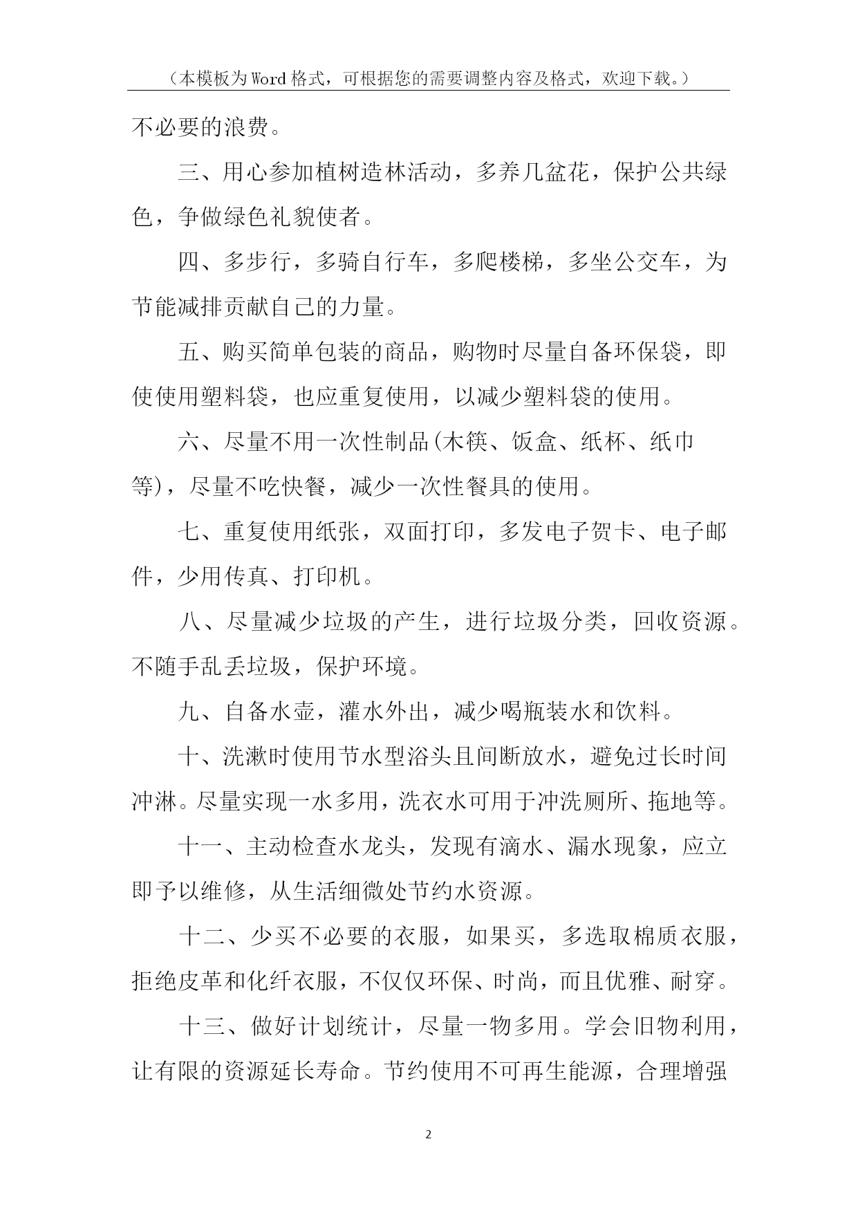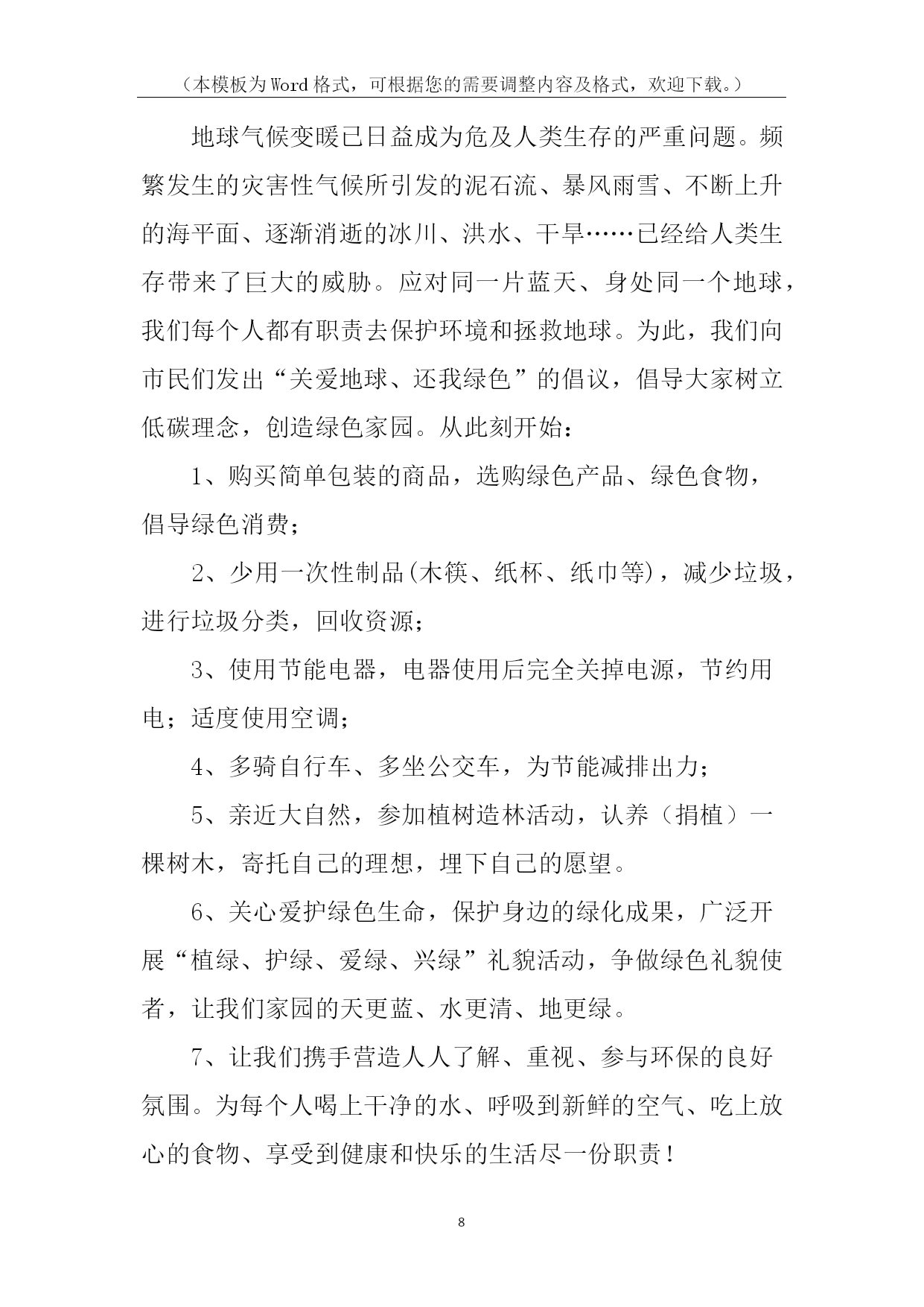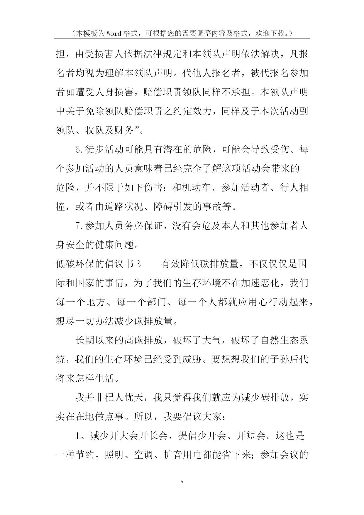 (本模板为Word格式,可根据您的需要调整内容及格式,欢迎下载。)PAGE\*MERGEFORMAT17低碳环保的倡议书我们生活的地球正在遭受浩劫!全球气候变暖、冰川消融、海平面上升、臭氧层空洞20xx年12月7日联合国气候变化峰会在丹麦首都哥本哈根召开,专家再次指出,一切根源在于人类生活中燃烧煤炭、石油等排放的二氧化碳。因此,减少二氧化碳排放才是“治本”之举。应对同一片蓝天、身处同一个地球气候系统之中,我们每个人都有职责去拯救地球。为此,我们向全体老师和同学发出“关爱地球、践行低碳”的倡议,号召全体师生行动起来,为营造绿色环保的和谐校园,践行低碳生活贡献自己的力量,做到:一、在日常工作和生活中,时时刻刻注意节约用电,教师要做到在午休和下班后关掉办公室电脑、电灯、电扇等电源;学生要做到随手关掉教室、宿舍的电灯、电扇等电器设备。手机一旦充电完成立即断开电源。二、尽量少用电梯。如果你登楼梯7层,就能够减碳近2千克,同时能够减少缺乏运动而带来的肥胖。即便我们不得不搭乘电梯,也不必在楼梯间内同时按下两部电梯,增加不必要的浪费。三、用心参加植树造林活动,多养几盆花,保护公共绿色,争做绿色礼貌使者。四、多步行,多骑自行车,多爬楼梯,多坐公交车,为节能减排贡献自己的力量。五、购买简单包装的商品,购物时尽量自备环保袋,即使使用塑料袋,也应重复使用,以减少塑料袋的使用。六、尽量不用一次性制品(木筷、饭盒、纸杯、纸巾等),尽量不吃快餐,减少一次性餐具的使用。七、重复使用纸张,双面打印,多发电子贺卡、电子邮件,少用传真、打印机。八、尽量减少垃圾的产生,进行垃圾分类,回收资源。不随手乱丢垃圾,保护环境。九、自备水壶,灌水外出,减少喝瓶装水和饮料。十、洗漱时使用节水型浴头且间断放水,避免过长时间冲淋。尽量实现一水多用,洗衣水可用于冲洗厕所、拖地等。十一、主动检查水龙头,发现有滴水、漏水现象,应立即予以维修,从生活细微处节约水资源。十二、少买不必要的衣服,如果买,多选取棉质衣服,拒绝皮革和化纤衣服,不仅仅环保、时尚,而且优雅、耐穿。十三、做好计划统计,尽量一物多用。学会旧物利用,让有限的资源延长寿命。节约使用不可再生能源,合理增强应用再生能源。不积跬步,无以至千里;不积小流,无以成江海。期望大家共同努力,让“低碳生活”的概念传递到每一位同学、每一位老师的内心深处!让我们携起手来,以自己的行动拯救我们的地球!亲爱的老师、同学们,让我们一齐行动起来吧!保护校园环境,争做低碳环保一族!低碳环保的倡议书2环保意识,爱护家园环境,倡导低碳生活。斗门区青年志愿者协会拟开展“绿色低碳行”长期环保志愿服务活动,透过徒步、沿途拾垃圾的方式,清理环境卫生,传播环保理念,增强生活质素。现将有关活动事项公布如下:1.活动时间:20xx年03月05日上午9:30至14:302.集合地点:井岸金鸿酒店门口(即原先新鸿酒店)3.对象及人数:会员(18岁以上),30人4.活动领队:xxx(小兵)电话:xxx副领队:xxx(阳光)电话:xxx副领队:xxx(真水)电话:xxx5.报名方式:请发信息“姓名+电话+身份证号码”至赵豪华手机报名截止时间:20xx年03月04日下午20:00止行程安排:9:15分在金鸿酒店门口集中,签到,9:30准时乘公交出发,过期不候。到御温泉下车,约10点。我们的徒步活动从绿道4号线的驿站开始,以金台寺为目标。沿着绿道,一边欣赏沿途旖旎的风光,一边进行环保活动。为了配合本次的环保活动,请各位伙伴自备胶手套、米袋,作为环保的工具。从驿站至金台寺约5.5公里,估计11:30到达金台寺的山门。山门前有一块空地,我们能够就地休息,进行休整。利用1小时的时间,搞一些团队的拓展游戏。12:30进入回程,从山门往金台寺路口走,到达路口约2点。全程约11公里。2点我们能够到华姐饭店进行午餐,品尝具有农家特色的小菜。费用aa。饭后,再乘公交车回到井岸,解散。活动费用:保险费用3元/人(协会统一购买),午餐aa约40元,公交车费约8元;总开销约51元。活动装备:协会的太阳帽、运动装束、舒适的运动鞋、厚袜、饮用水、小量带糖的食物(用于中途补给),请注意防晒防雨;为配合环保活动,请带上环保用具;温馨提醒:1.参加的朋友最好带足够的水和运动饮料,早餐要吃好;2.一切行动务必听从指挥,不得擅自离队;中途离队或有状况要告知领队;3.当天如果下大雨,活动取消,小雨照常进行;4.本次活动执行预报名制度,如果报名参加活动,当天有事不能来的,请向领队请假。否则将会影响你的信誉哦。活动声明:1.领队的服务是义务的,所起的作用是协调与支持活动的顺利开展,无法保障你避免意外的可能,亦不承担任何职责。领队对于线路的行进和更改具有全权。以上预计可能的以及其它无法预计的风险是客观存在的,参