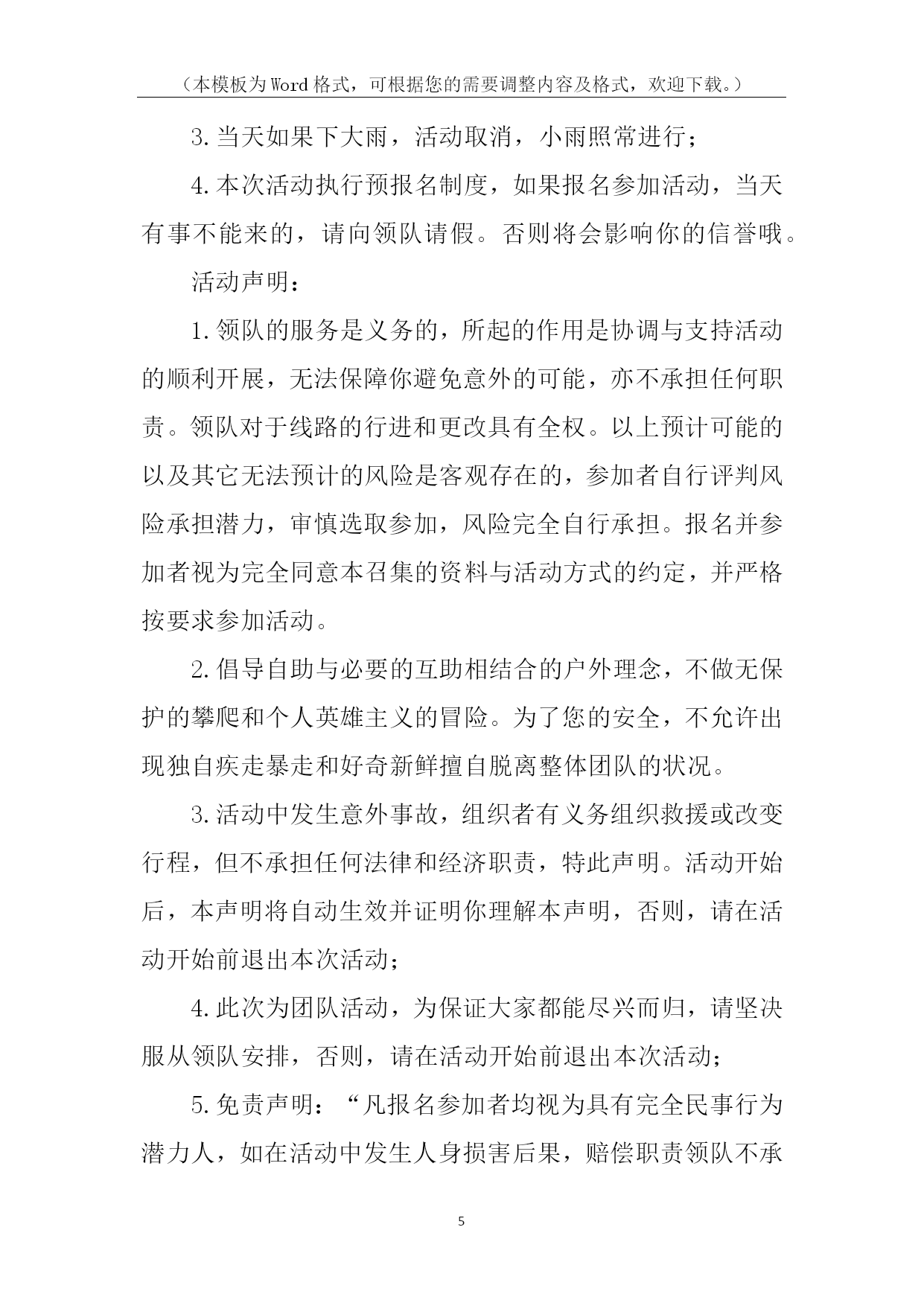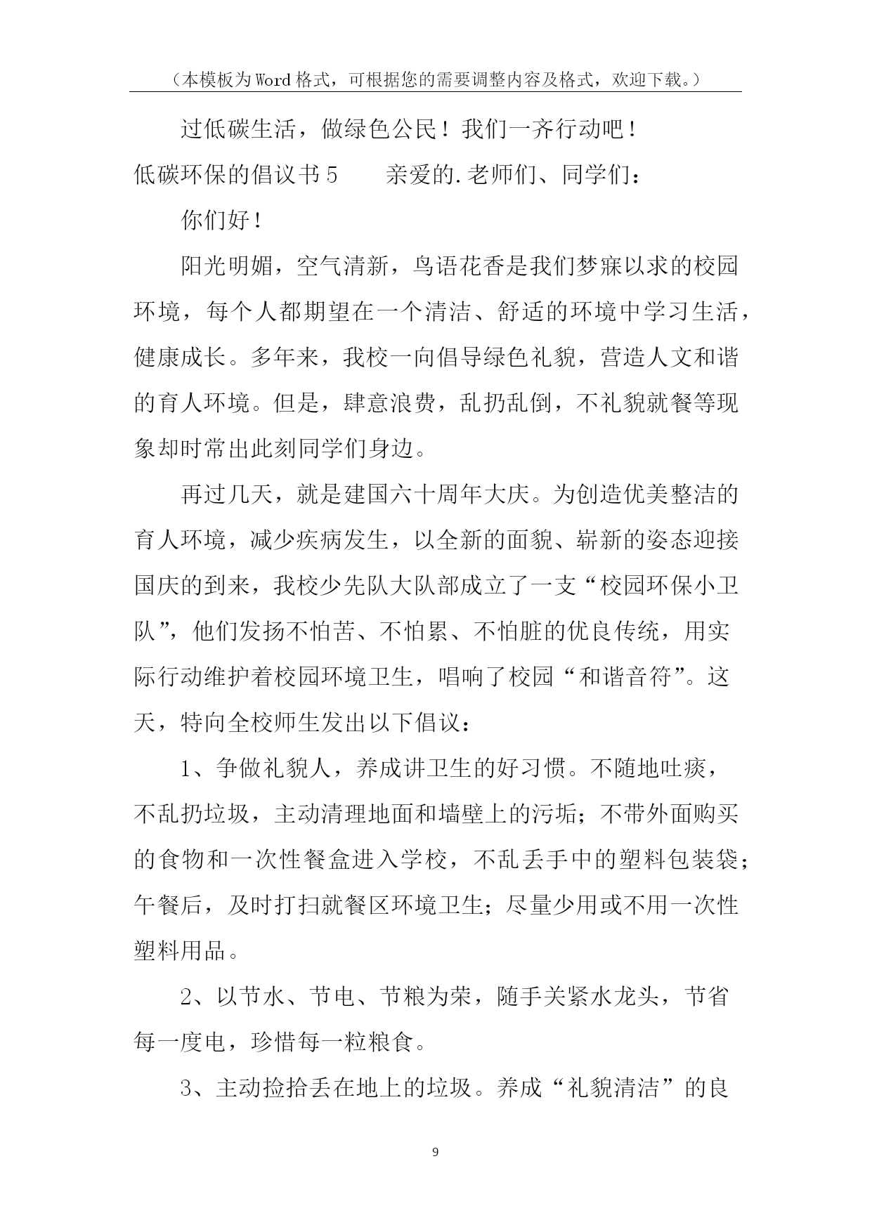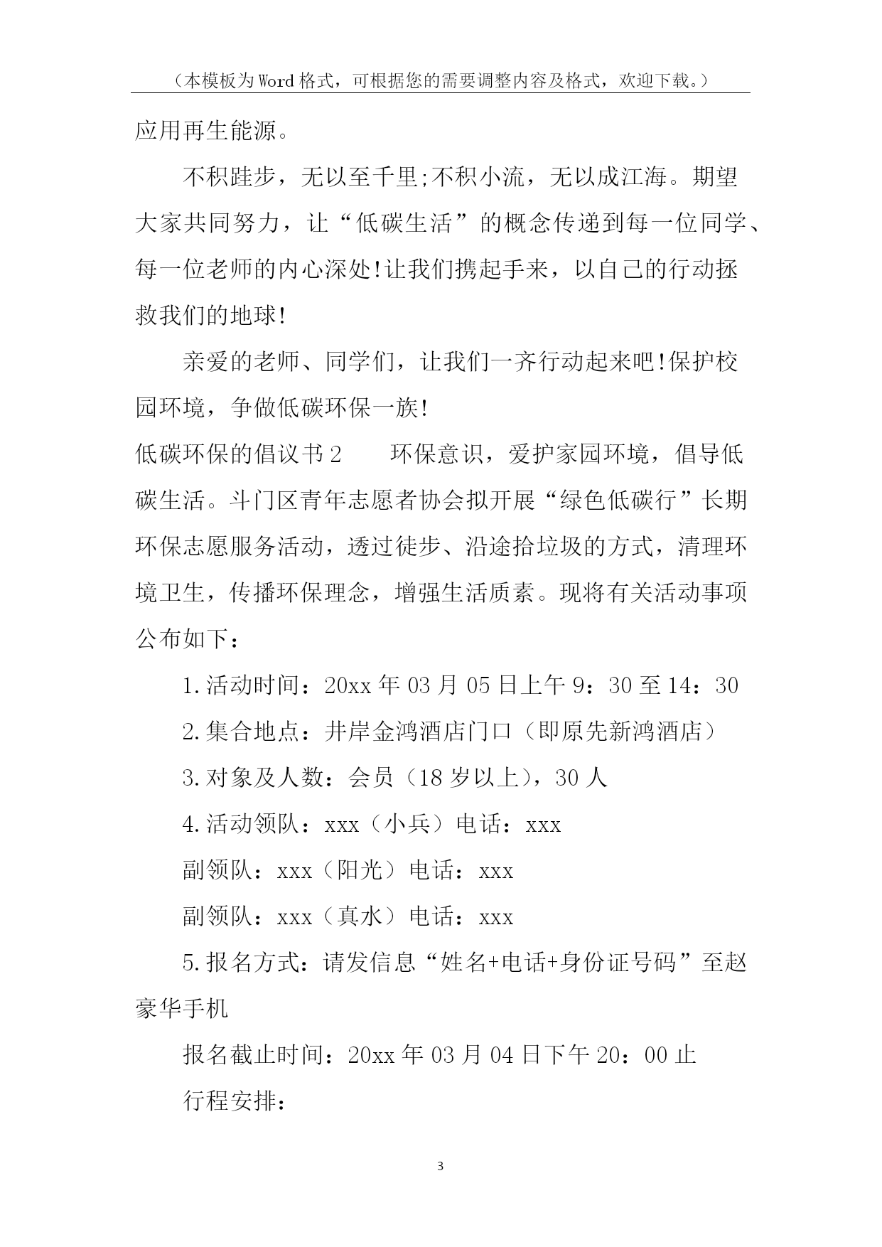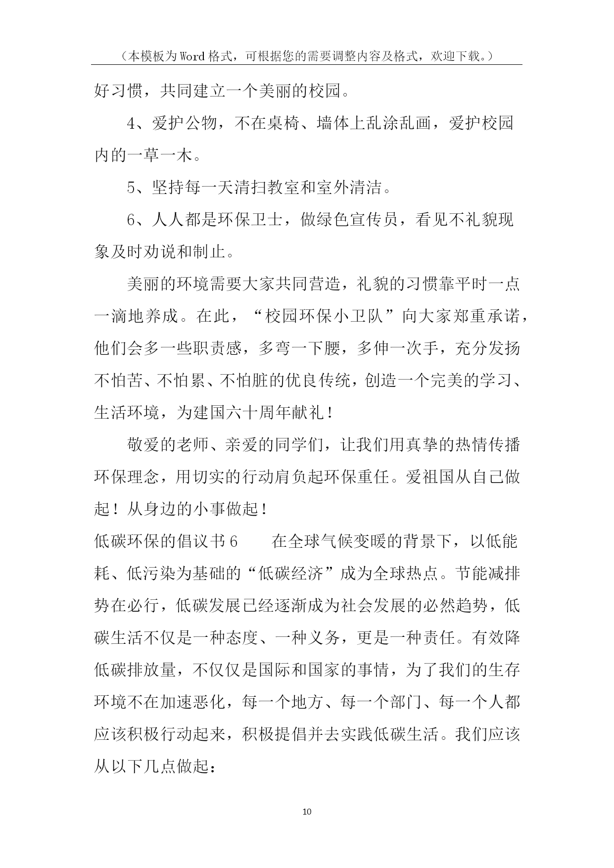 (本模板为Word格式,可根据您的需要调整内容及格式,欢迎下载。)PAGE\*MERGEFORMAT17低碳环保的倡议书我们生活的地球正在遭受浩劫!全球气候变暖、冰川消融、海平面上升、臭氧层空洞20xx年12月7日联合国气候变化峰会在丹麦首都哥本哈根召开,专家再次指出,一切根源在于人类生活中燃烧煤炭、石油等排放的二氧化碳。因此,减少二氧化碳排放才是“治本”之举。应对同一片蓝天、身处同一个地球气候系统之中,我们每个人都有职责去拯救地球。为此,我们向全体老师和同学发出“关爱地球、践行低碳”的倡议,号召全体师生行动起来,为营造绿色环保的和谐校园,践行低碳生活贡献自己的力量,做到:一、在日常工作和生活中,时时刻刻注意节约用电,教师要做到在午休和下班后关掉办公室电脑、电灯、电扇等电源;学生要做到随手关掉教室、宿舍的电灯、电扇等电器设备。手机一旦充电完成立即断开电源。二、尽量少用电梯。如果你登楼梯7层,就能够减碳近2千克,同时能够减少缺乏运动而带来的肥胖。即便我们不得不搭乘电梯,也不必在楼梯间内同时按下两部电梯,增加不必要的浪费。三、用心参加植树造林活动,多养几盆花,保护公共绿色,争做绿色礼貌使者。四、多步行,多骑自行车,多爬楼梯,多坐公交车,为节能减排贡献自己的力量。五、购买简单包装的商品,购物时尽量自备环保袋,即使使用塑料袋,也应重复使用,以减少塑料袋的使用。六、尽量不用一次性制品(木筷、饭盒、纸杯、纸巾等),尽量不吃快餐,减少一次性餐具的使用。七、重复使用纸张,双面打印,多发电子贺卡、电子邮件,少用传真、打印机。八、尽量减少垃圾的产生,进行垃圾分类,回收资源。不随手乱丢垃圾,保护环境。九、自备水壶,灌水外出,减少喝瓶装水和饮料。十、洗漱时使用节水型浴头且间断放水,避免过长时间冲淋。尽量实现一水多用,洗衣水可用于冲洗厕所、拖地等。十一、主动检查水龙头,发现有滴水、漏水现象,应立即予以维修,从生活细微处节约水资源。十二、少买不必要的衣服,如果买,多选取棉质衣服,拒绝皮革和化纤衣服,不仅仅环保、时尚,而且优雅、耐穿。十三、做好计划统计,尽量一物多用。学会旧物利用,让有限的资源延长寿命。节约使用不可再生能源,合理增强应用再生能源。不积跬步,无以至千里;不积小流,无以成江海。期望大家共同努力,让“低碳生活”的概念传递到每一位同学、每一位老师的内心深处!让我们携起手来,以自己的行动拯救我们的地球!亲爱的老师、同学们,让我们一齐行动起来吧!保护校园环境,争做低碳环保一族!低碳环保的倡议书2环保意识,爱护家园环境,倡导低碳生活。斗门区青年志愿者协会拟开展“绿色低碳行”长期环保志愿服务活动,透过徒步、沿途拾垃圾的方式,清理环境卫生,传播环保理念,增强生活质素。现将有关活动事项公布如下:1.活动时间:20xx年03月05日上午9:30至14:302.集合地点:井岸金鸿酒店门口(即原先新鸿酒店)3.对象及人数:会员(18岁以上),30人4.活动领队:xxx(小兵)电话:xxx副领队:xxx(阳光)电话:xxx副领队:xxx(真水)电话:xxx5.报名方式:请发信息“姓名+电话+身份证号码”至赵豪华手机报名截止时间:20xx年03月04日下午20:00止行程安排:9:15分在金鸿酒店门口集中,签到,9:30准时乘公交出发,过期不候。到御温泉下车,约10点。我们的徒步活动从绿道4号线的驿站开始,以金台寺为目标。沿着绿道,一边欣赏沿途旖旎的风光,一边进行环保活动。为了配合本次的环保活动,请各位伙伴自备胶手套、米袋,作为环保的工具。从驿站至金台寺约5.5公里,估计11:30到达金台寺的山门。山门前有一块空地,我们能够就地休息,进行休整。利用1小时的时间,搞一些团队的拓展游戏。12:30进入回程,从山门往金台寺路口走,到达路口约2点。全程约11公里。2点我们能够到华姐饭店进行午餐,品尝具有农家特色的小菜。费用aa。饭后,再乘公交车回到井岸,解散。活动费用:保险费用3元/人(协会统一购买),午餐aa约40元,公交车费约8元;总开销约51元。活动装备:协会的太阳帽、运动装束、舒适的运动鞋、厚袜、饮用水、小量带糖的食物(用于中途补给),请注意防晒防雨;为配合环保活动,请带上环保用具;温馨提醒:1.参加的朋友最好带足够的水和运动饮料,早餐要吃好;2.一切行动务必听从指挥,不得擅自离队;中途离队或有状况要告知领队;3.当天如果下大雨,活动取消,小雨照常进行;4.本次活动执行预报名制度,如果报名参加活动,当天有事不能来的,请向领队请假。否则将会影响你的信誉哦。活动声明:1.领队的服务是义务的,所起的作用是协调与支持活动的顺利开展,无法保障你避免意外的可能,亦不承担任何职责。领队对于线路的行进和更改具有全权。以上预计可能的以及其它无法预计的风险是客观存在的,参