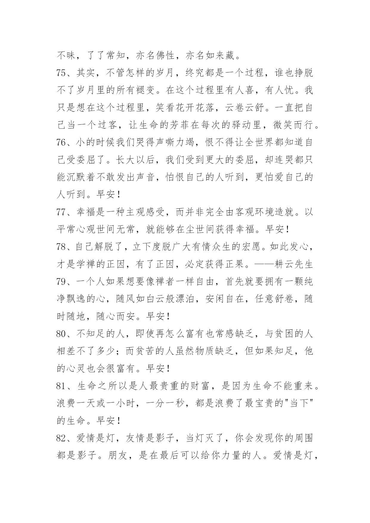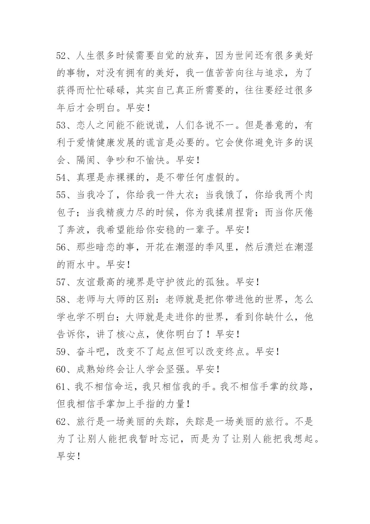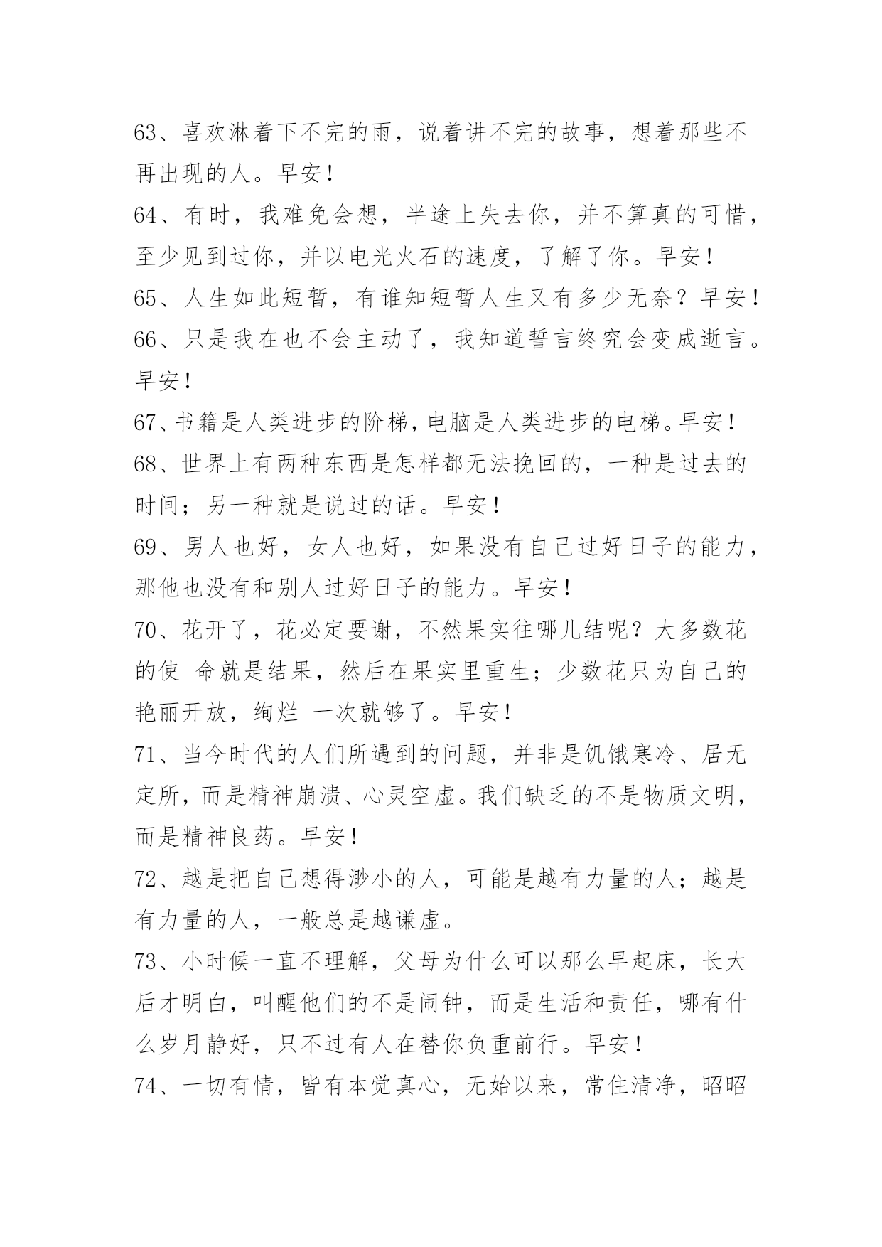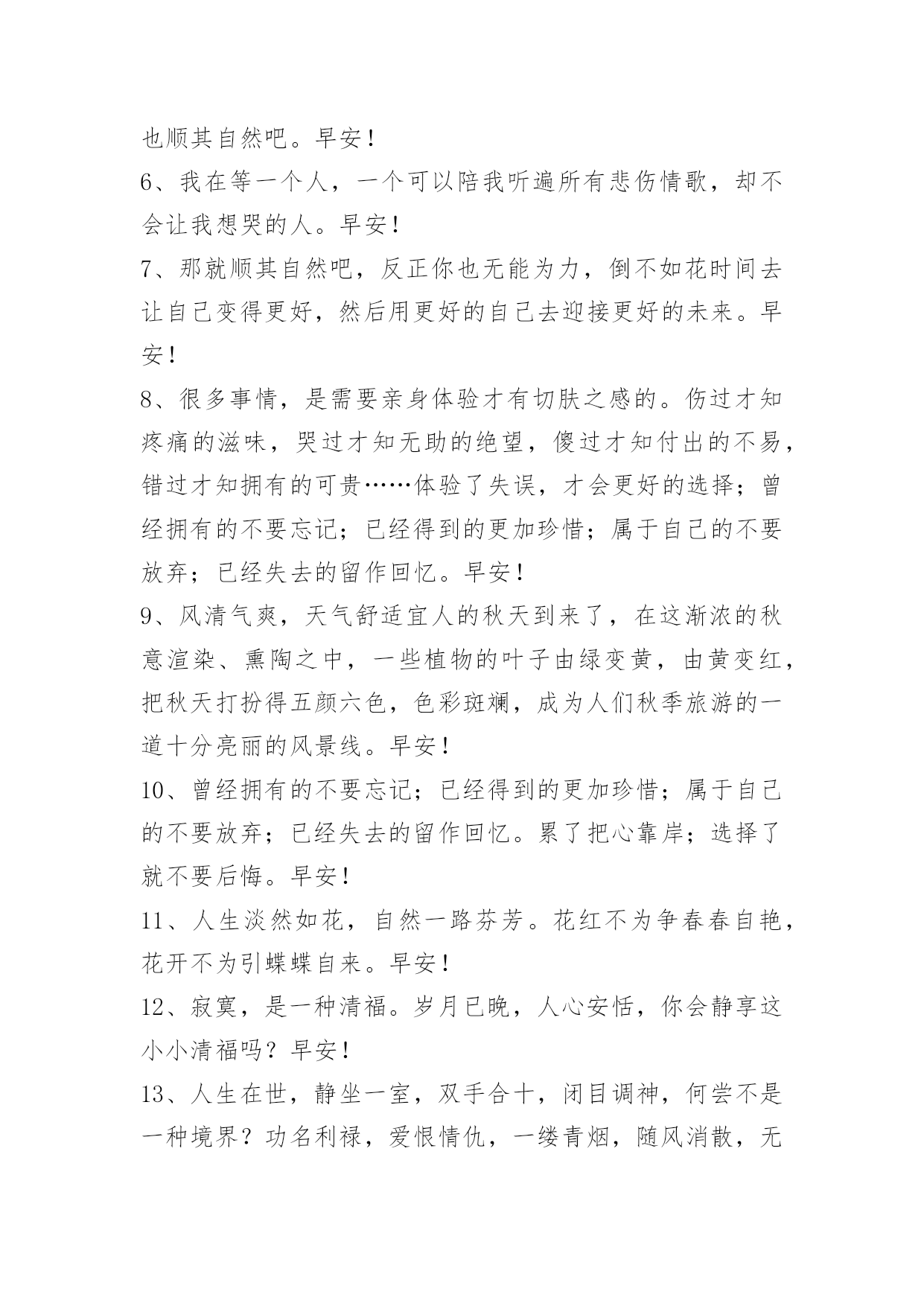 最新唯美早安文案最新唯美早安文案大全105句认输不会死,但死也不认输。早安!下文是关于唯美早安文案的句子,大家可以参考一下。1、睡前跟喜欢的人打电话是多么幸福又微小的事情。早安!2、李嘉诚说了一句很经典的话:当你放下方子赚钱的时候,说明你已经懂事了。当你用钱赚回面子的时候,说明你已经成功了。当你用面子能够赚钱的时候,说明你已经是人物了。当你还停留在那里喝酒吹牛,啥也不懂还装懂,只爱所谓的面子的时候,说明你这辈子也就这样了!早安!3、假如你曾有过虚度的时光,请不要以叹息作为补偿,明天的路途毕竟长于逝去的岁月。快迈步,前面相迎的是幸福的曙光!早安!4、能让你强大的,不是坚持,而是放下;能让你淡泊的,不是得到,而是失去;能让你登高的,不是他人的肩膀,而是内心的学识;能让你站立的,不是卑微的苟活,而是不屈的抗争;能让你重生的,不是等待住事的结束,而是勇敢地和它说再见;能让你终生追逐的,不是远方的目标,而是不死的信念。早安!5、世上有一些东西,是你自己支配不了的,比如运气和机会,舆论和毁誉,那就不去管它们,顺其自然吧。世上有一些东西,是你自己可以支配的,比如兴趣和志向,处世和做人,那就在这些方面好好地努力,至于努力的结果是什么,也顺其自然吧。早安!6、我在等一个人,一个可以陪我听遍所有悲伤情歌,却不会让我想哭的人。早安!7、那就顺其自然吧,反正你也无能为力,倒不如花时间去让自己变得更好,然后用更好的自己去迎接更好的未来。早安!8、很多事情,是需要亲身体验才有切肤之感的。伤过才知疼痛的滋味,哭过才知无助的绝望,傻过才知付出的不易,错过才知拥有的可贵……体验了失误,才会更好的选择;曾经拥有的不要忘记;已经得到的更加珍惜;属于自己的不要放弃;已经失去的留作回忆。早安!9、风清气爽,天气舒适宜人的秋天到来了,在这渐浓的秋意渲染、熏陶之中,一些植物的叶子由绿变黄,由黄变红,把秋天打扮得五颜六色,色彩斑斓,成为人们秋季旅游的一道十分亮丽的风景线。早安!10、曾经拥有的不要忘记;已经得到的更加珍惜;属于自己的不要放弃;已经失去的留作回忆。累了把心靠岸;选择了就不要后悔。早安!11、人生淡然如花,自然一路芬芳。花红不为争春春自艳,花开不为引蝶蝶自来。早安!12、寂寞,是一种清福。岁月已晚,人心安恬,你会静享这小小清福吗?早安!13、人生在世,静坐一室,双手合十,闭目调神,何尝不是一种境界?功名利禄,爱恨情仇,一缕青烟,随风消散,无影无踪,淡然一世,何其妙哉?早安!14、秋季养生记心上:天凉要加衣,睡觉关门窗;腹部应盖被,莫把脾胃伤;开窗换空气,流行感冒防;酸味食物防秋燥,温补食物尝。祝你开心身健康!早安!15、热水沏茶叶成浓喷鼻,由于温度;伴侣挂念联络成习气,由于朴拙;消息祝愿你高兴一笑,由于情绪;消息传情,早上好!愿你高兴高兴天天!16、人可以通过很多种方式证明自己,勇敢无畏地生活便是其中之一。早安!17、相信爱情的人,迟早有一天会遇见爱情。18、微笑,还有不懈的努力!早安!19、要学会驾驭自己的命运:不仅在顺境时高歌猛进,而且在逆境中奋力拼搏。早安!20、逆境中的挣扎比顺境中的沉沦更有意义;困境中的奋起比平安时的叹息更有作为。早安!21、想要成功,首先要相信有成功的可能。把每次"失败"带来的教训掌握了,每次便都变成了成长。早安!22、生命,需要我们去努力。年轻时,我们要努力锻炼自己的能力,掌握知识、掌握技能、掌握必要的社会经验。机会,需要我们去寻找。让我们鼓起勇气,运用智慧,把握我们生命的每一分钟,创造出一个更加精彩的人生。早安!23、希望说-人生就是万绿之源的绚丽花朵;自由说-人生就是清晨冲出笼子的飞鸟。磨难是少不了的,幸福是跑不掉的,只要奋力追求,磨难会低下头的。成功有个副作用,就是以为过去的做法同样适应于将来。早安!24、可贵的人生,离不开微笑生活像一杯酒。当你细细品尝的时候,会觉得它韵味无穷:当你一口吞下它的时候,会觉得一无所有。早安!25、现代人最大的困扰,不是选择什么,而是,因为选择而失去了什么。早安!26、微笑着面对失败,把每一次的失败都归结为一次尝试,不去自卑;把每一次的成功都想成一种幸运,不去自傲。早安!27、把理想当作美丽的鲜花挂在胸前,只能使你原地踏步:把理想当作指路的明灯,才能使你奋发前进。早安!28、每一个日出,总想带去希望的问候:让每一天的空气都是清新让每一天的情绪都是舒展让每一天的收获都是充实,早安!29、有两个字藏在心中很久,哽住了喉咙总是说不出口,于是对着镜子微微笑,阳光透过镜子将我的笑容折射给了你,里面包含了我无限祝福。早安!30、其实,人一直在为能静下来而努力,因为静下来了人,才是幸福的人。早安!31、我在努力长大,努力成熟,还是被人说幼稚。早安!32、有的人认为坚持会让我们变得更强大,但有时候放手也会。早