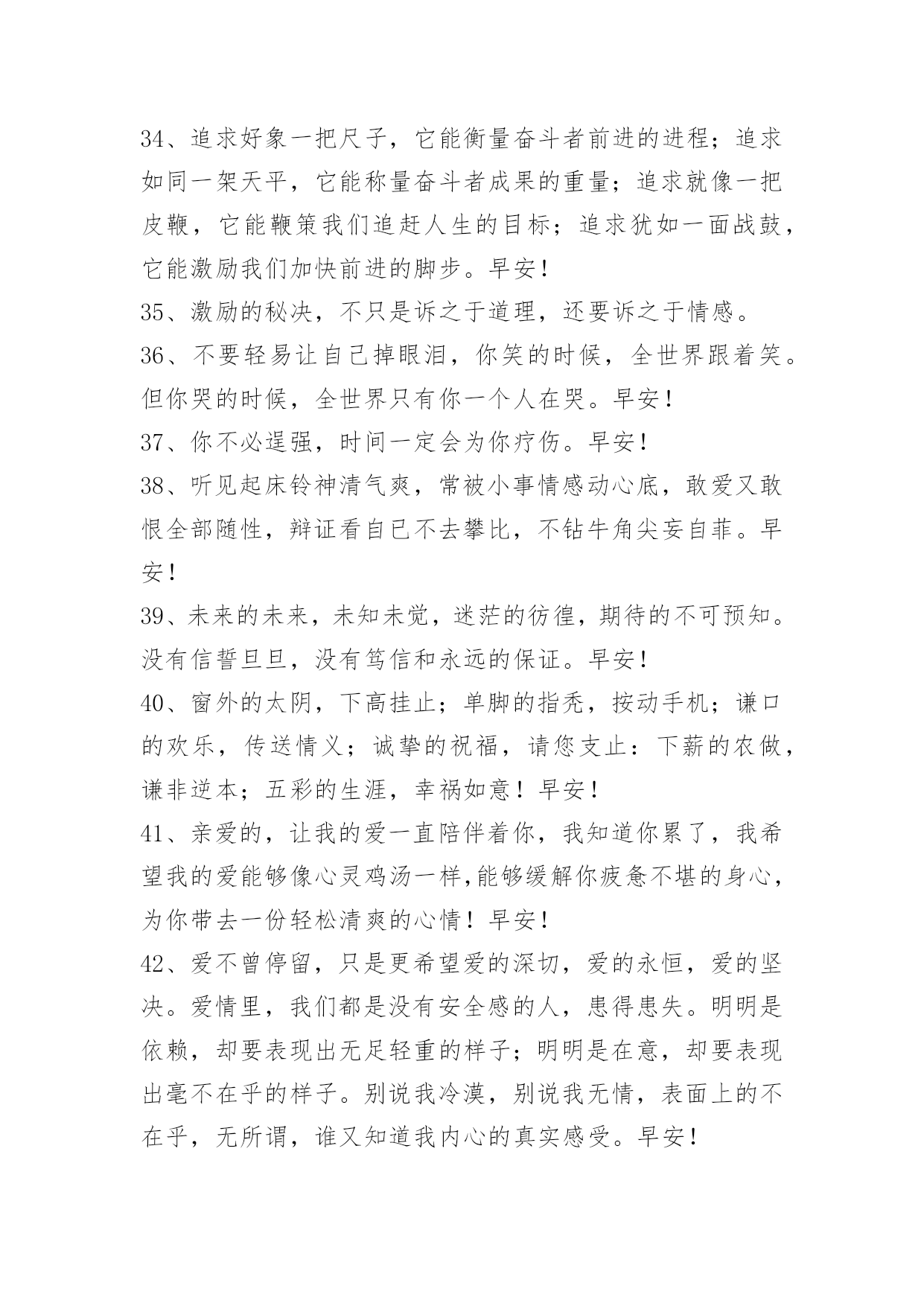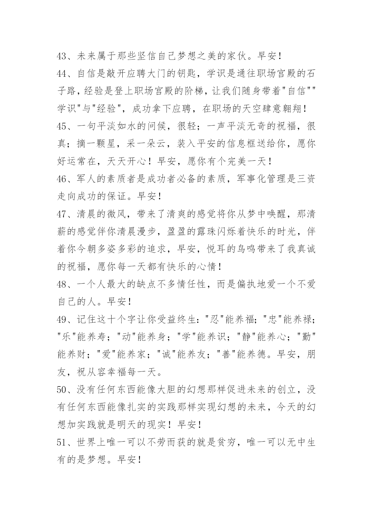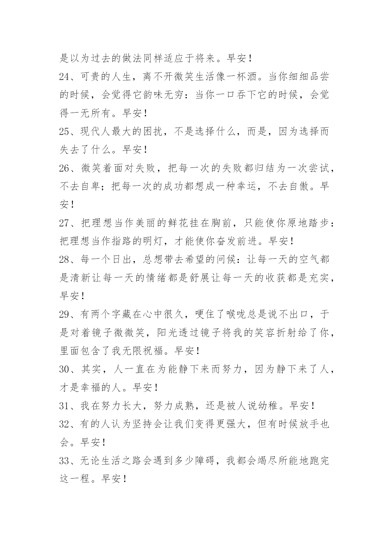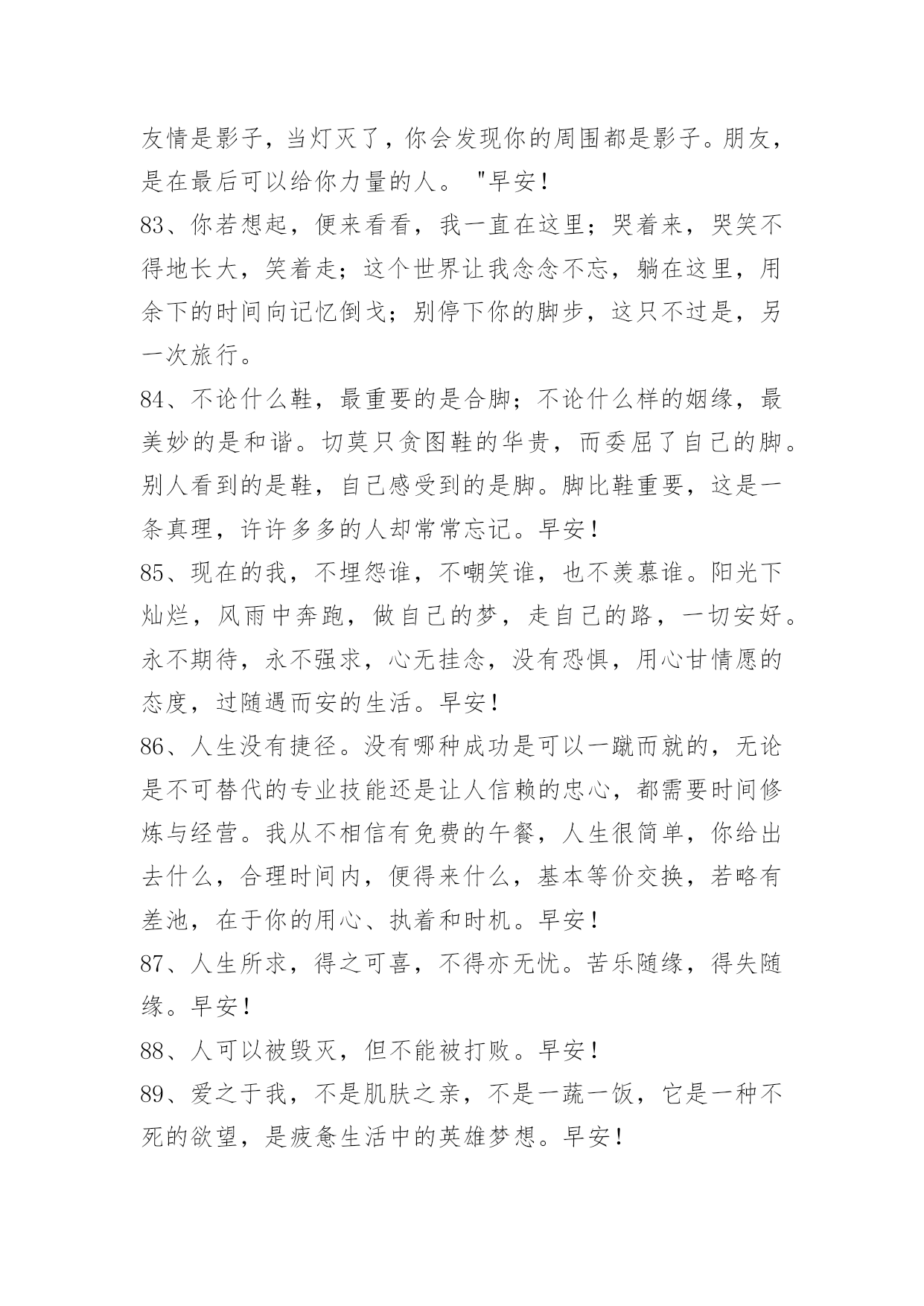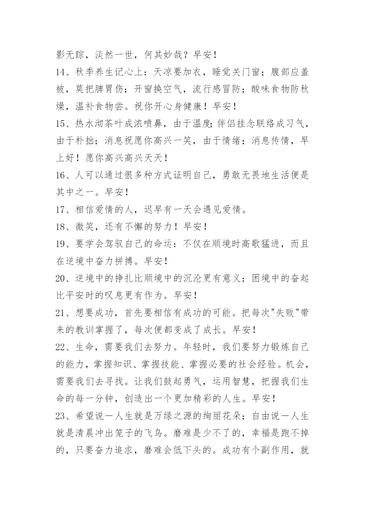 最新唯美早安文案最新唯美早安文案大全105句认输不会死,但死也不认输。早安!下文是关于唯美早安文案的句子,大家可以参考一下。1、睡前跟喜欢的人打电话是多么幸福又微小的事情。早安!2、李嘉诚说了一句很经典的话:当你放下方子赚钱的时候,说明你已经懂事了。当你用钱赚回面子的时候,说明你已经成功了。当你用面子能够赚钱的时候,说明你已经是人物了。当你还停留在那里喝酒吹牛,啥也不懂还装懂,只爱所谓的面子的时候,说明你这辈子也就这样了!早安!3、假如你曾有过虚度的时光,请不要以叹息作为补偿,明天的路途毕竟长于逝去的岁月。快迈步,前面相迎的是幸福的曙光!早安!4、能让你强大的,不是坚持,而是放下;能让你淡泊的,不是得到,而是失去;能让你登高的,不是他人的肩膀,而是内心的学识;能让你站立的,不是卑微的苟活,而是不屈的抗争;能让你重生的,不是等待住事的结束,而是勇敢地和它说再见;能让你终生追逐的,不是远方的目标,而是不死的信念。早安!5、世上有一些东西,是你自己支配不了的,比如运气和机会,舆论和毁誉,那就不去管它们,顺其自然吧。世上有一些东西,是你自己可以支配的,比如兴趣和志向,处世和做人,那就在这些方面好好地努力,至于努力的结果是什么,也顺其自然吧。早安!6、我在等一个人,一个可以陪我听遍所有悲伤情歌,却不会让我想哭的人。早安!7、那就顺其自然吧,反正你也无能为力,倒不如花时间去让自己变得更好,然后用更好的自己去迎接更好的未来。早安!8、很多事情,是需要亲身体验才有切肤之感的。伤过才知疼痛的滋味,哭过才知无助的绝望,傻过才知付出的不易,错过才知拥有的可贵……体验了失误,才会更好的选择;曾经拥有的不要忘记;已经得到的更加珍惜;属于自己的不要放弃;已经失去的留作回忆。早安!9、风清气爽,天气舒适宜人的秋天到来了,在这渐浓的秋意渲染、熏陶之中,一些植物的叶子由绿变黄,由黄变红,把秋天打扮得五颜六色,色彩斑斓,成为人们秋季旅游的一道十分亮丽的风景线。早安!10、曾经拥有的不要忘记;已经得到的更加珍惜;属于自己的不要放弃;已经失去的留作回忆。累了把心靠岸;选择了就不要后悔。早安!11、人生淡然如花,自然一路芬芳。花红不为争春春自艳,花开不为引蝶蝶自来。早安!12、寂寞,是一种清福。岁月已晚,人心安恬,你会静享这小小清福吗?早安!13、人生在世,静坐一室,双手合十,闭目调神,何尝不是一种境界?功名利禄,爱恨情仇,一缕青烟,随风消散,无影无踪,淡然一世,何其妙哉?早安!14、秋季养生记心上:天凉要加衣,睡觉关门窗;腹部应盖被,莫把脾胃伤;开窗换空气,流行感冒防;酸味食物防秋燥,温补食物尝。祝你开心身健康!早安!15、热水沏茶叶成浓喷鼻,由于温度;伴侣挂念联络成习气,由于朴拙;消息祝愿你高兴一笑,由于情绪;消息传情,早上好!愿你高兴高兴天天!16、人可以通过很多种方式证明自己,勇敢无畏地生活便是其中之一。早安!17、相信爱情的人,迟早有一天会遇见爱情。18、微笑,还有不懈的努力!早安!19、要学会驾驭自己的命运:不仅在顺境时高歌猛进,而且在逆境中奋力拼搏。早安!20、逆境中的挣扎比顺境中的沉沦更有意义;困境中的奋起比平安时的叹息更有作为。早安!21、想要成功,首先要相信有成功的可能。把每次"失败"带来的教训掌握了,每次便都变成了成长。早安!22、生命,需要我们去努力。年轻时,我们要努力锻炼自己的能力,掌握知识、掌握技能、掌握必要的社会经验。机会,需要我们去寻找。让我们鼓起勇气,运用智慧,把握我们生命的每一分钟,创造出一个更加精彩的人生。早安!23、希望说-人生就是万绿之源的绚丽花朵;自由说-人生就是清晨冲出笼子的飞鸟。磨难是少不了的,幸福是跑不掉的,只要奋力追求,磨难会低下头的。成功有个副作用,就是以为过去的做法同样适应于将来。早安!24、可贵的人生,离不开微笑生活像一杯酒。当你细细品尝的时候,会觉得它韵味无穷:当你一口吞下它的时候,会觉得一无所有。早安!25、现代人最大的困扰,不是选择什么,而是,因为选择而失去了什么。早安!26、微笑着面对失败,把每一次的失败都归结为一次尝试,不去自卑;把每一次的成功都想成一种幸运,不去自傲。早安!27、把理想当作美丽的鲜花挂在胸前,只能使你原地踏步:把理想当作指路的明灯,才能使你奋发前进。早安!28、每一个日出,总想带去希望的问候:让每一天的空气都是清新让每一天的情绪都是舒展让每一天的收获都是充实,早安!29、有两个字藏在心中很久,哽住了喉咙总是说不出口,于是对着镜子微微笑,阳光透过镜子将我的笑容折射给了你,里面包含了我无限祝福。早安!30、其实,人一直在为能静下来而努力,因为静下来了人,才是幸福的人。早安!31、我在努力长大,努力成熟,还是被人说幼稚。早安!32、有的人认为坚持会让我们变得更强大,但有时候放手也会。早