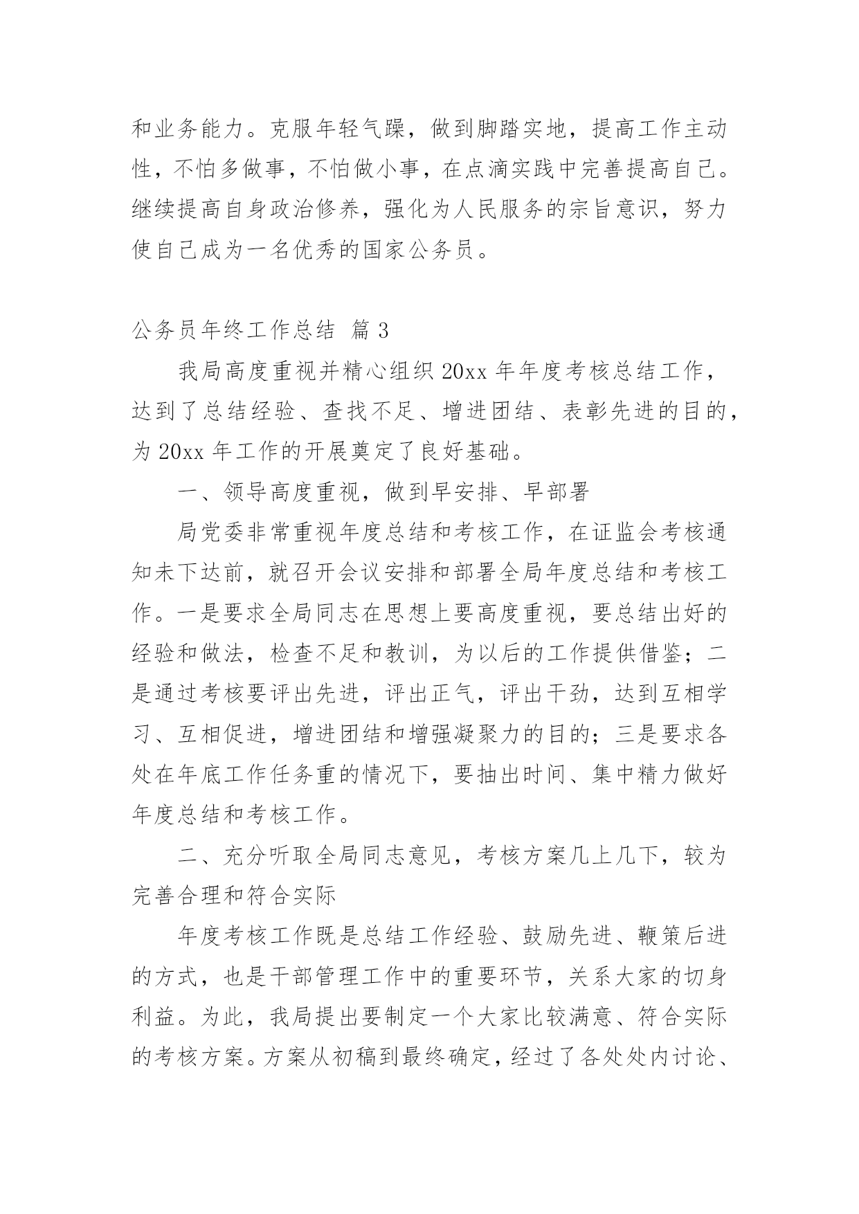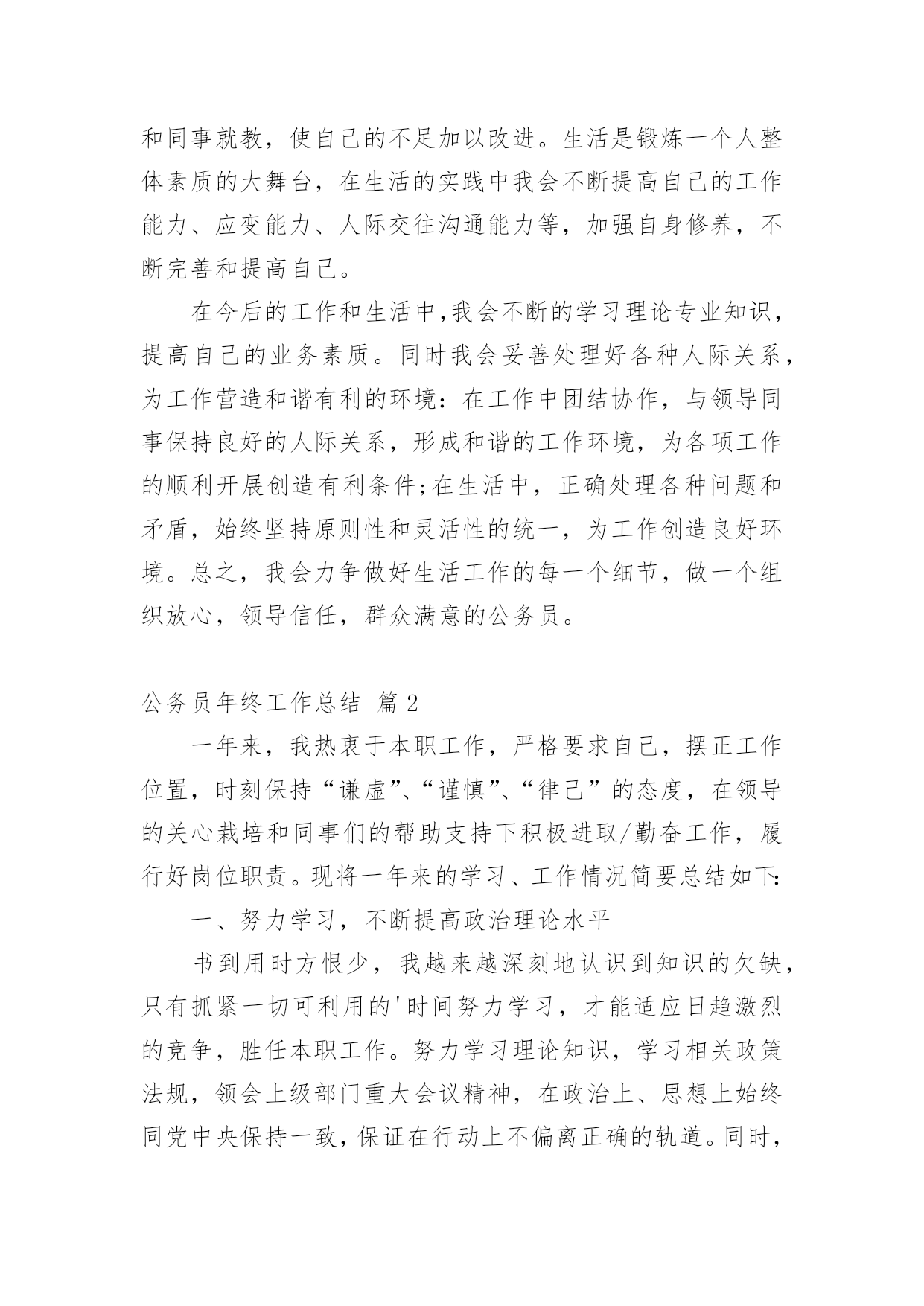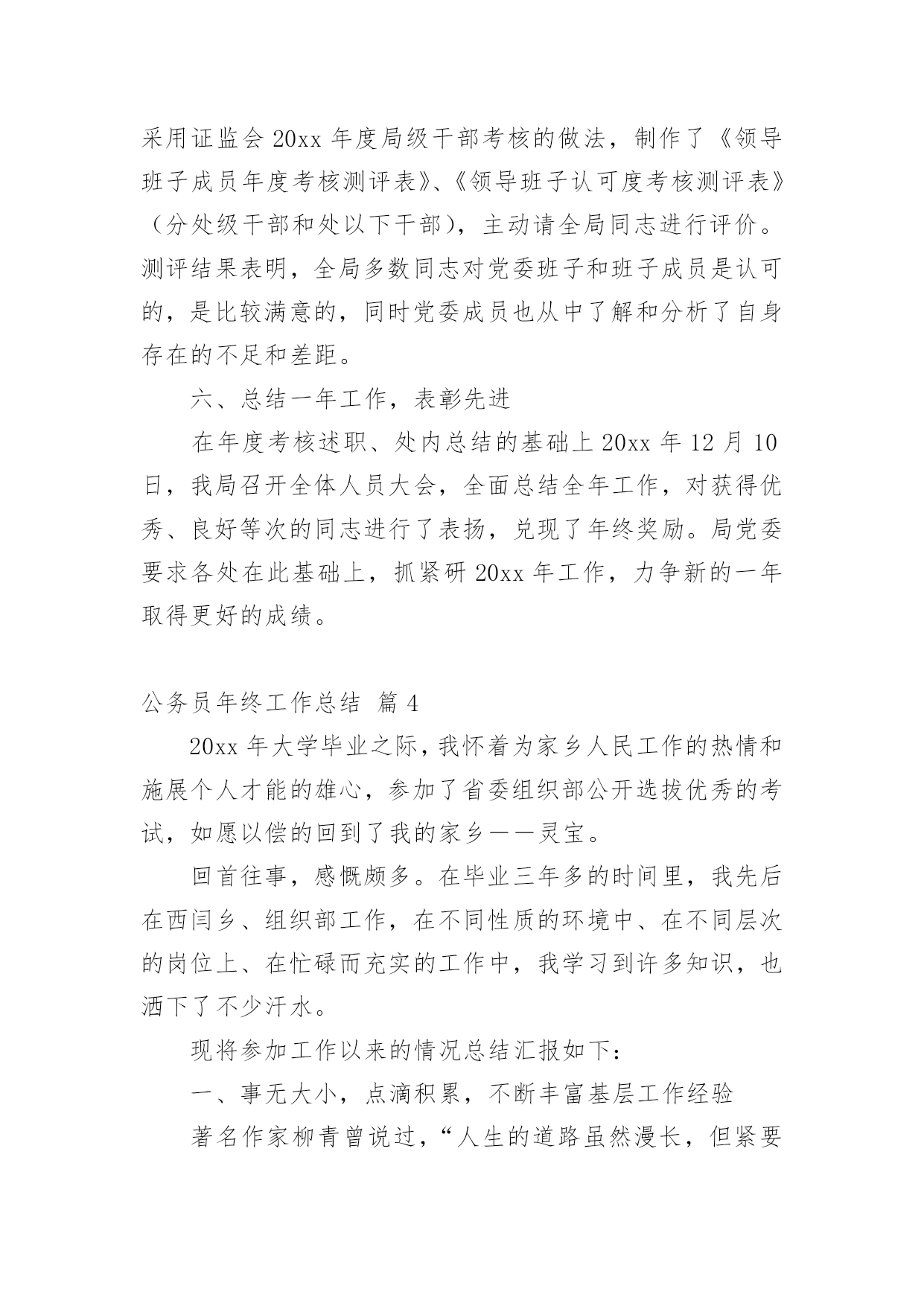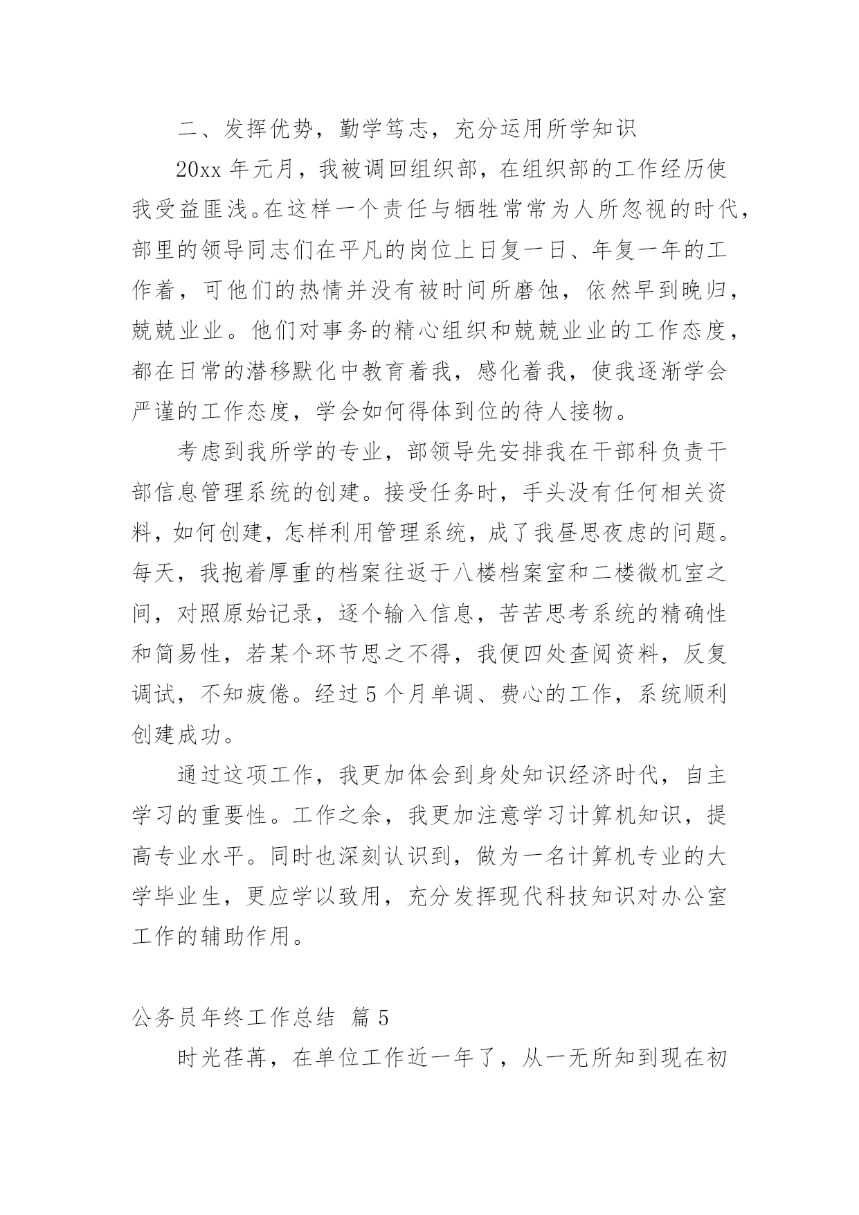 公务员年终工作总结公务员年终工作总结集合五篇总结是对某一特定时间段内的学习和工作生活等表现情况加以回顾和分析的一种书面材料,它可以促使我们思考,是时候写一份总结了。你想知道总结怎么写吗?下面是小编为大家整理的公务员年终工作总结7篇,仅供参考,大家一起来看看吧。公务员年终工作总结篇1为了能更好的走向工作岗位,让领导对我有更深的了解,现对自己以往的思想、学习、生活情况做如下小结。一、思想方面长期以来,我思想上积极上进,时时处处严格要求自己。我树立了全心全意为人民服务的人生观,坚决抵制各种错误人生观的侵蚀,反对拜金主义,享乐主义和个人主义。同时,用马克思主义思想武装自己,加强自己的理论修养,争取在自己工作岗位上实现人生的价值。在日常的工作、学习和生活中,主动通过报纸、杂志、书籍、网络等积极学习政治理论,不断提高自己的理论和思想水平。作为一名公务员,以实际行动践行科学发展观。多与群众沟通交流,,真正的解决人民群众的最现实、最直接、最根本的利益问题和矛盾。二、学习方面在校期间,我时刻将学习作为我的第一要务。我学的是临床医学专业,经过五年的系统学习,我已具备扎实的专业知识,在学习课本知识、掌握专业理论的同时,我积极培养自己的动手实践能力和解决实际问题的技能。在课余生活中,我注意培养、发展自己的兴趣和特长,在计算机操作和书法方面有一定功底。课余时间,我积极参加学校组织的社会实践活动和志愿者服务活动,认真完成专业实践和实习安排,使自己能够学习与实践相结合,学以致用,在实践过程中更提高了我发现问题、分析问题、解决问题的能力,提高了我综合运用知识的能力。对于学习,无论是在学校还是以后工作,我始终树立全面学习、创新学习、终身学习的理念,因为只有这样才能使自己的知识水平得到不断的提高,才能更好做好本职工作,更好的.完成各项任务。三、生活方面在生活上,我严格要求自己,与同学、朋友和谐相处,尊敬领导和长辈。多年来,我一直坚持自我检查和自我反省,生活上勤俭节约,不乱花一分钱。在学校和家庭,我总是友好对人,从不和同学朋友及家人争吵打架。当同学在生活和学习上有困难的时候,我也总是尽自己的努力去帮助他们。对于领导和长辈,我都十分敬重和尊重,因为他们传授了我知识并在我成长的历程中给了我指导和帮助。总结自己多一年来的学习、生活情况,尽管有了一定的进步和成绩,但在一些方面还存在着不足。比如由于一直在校学习,工作经验不足,这就需要在今后的工作中不断加强学习,向领导和同事就教,使自己的不足加以改进。生活是锻炼一个人整体素质的大舞台,在生活的实践中我会不断提高自己的工作能力、应变能力、人际交往沟通能力等,加强自身修养,不断完善和提高自己。在今后的工作和生活中,我会不断的学习理论专业知识,提高自己的业务素质。同时我会妥善处理好各种人际关系,为工作营造和谐有利的环境:在工作中团结协作,与领导同事保持良好的人际关系,形成和谐的工作环境,为各项工作的顺利开展创造有利条件;在生活中,正确处理各种问题和矛盾,始终坚持原则性和灵活性的统一,为工作创造良好环境。总之,我会力争做好生活工作的每一个细节,做一个组织放心,领导信任,群众满意的公务员。公务员年终工作总结篇2一年来,我热衷于本职工作,严格要求自己,摆正工作位置,时刻保持“谦虚”、“谨慎”、“律己”的态度,在领导的关心栽培和同事们的帮助支持下积极进取/勤奋工作,履行好岗位职责。现将一年来的学习、工作情况简要总结如下:一、努力学习,不断提高政治理论水平书到用时方恨少,我越来越深刻地认识到知识的欠缺,只有抓紧一切可利用的'时间努力学习,才能适应日趋激烈的竞争,胜任本职工作。努力学习理论知识,学习相关政策法规,领会上级部门重大会议精神,在政治上、思想上始终同党中央保持一致,保证在行动上不偏离正确的轨道。同时,结合本职工作,我认真学习有关的中央八项规定精神的相关政策法规以及财经纪律,不断武装自己的头脑。并根据工作实际情况,努力用理论指导实践,解决自己在工作中出现的问题。二、踏实肯干,努力完成好各项业务工作在工作中,始终把耐得平淡、舍得付出、默默无闻作为自己的准则,始终把作风建设的重点放在严谨、细致、扎实、求实脚踏实地埋头苦干上,以制度、纪律规范自己的一切言行,严格遵守机关各项规章制度。对每一项工作任务,都能遵照领导安排,做到分清轻重缓急,科学安排时间,按时、按质、按量地完成。同时,努力从每一件事情上进行总结,不断摸索,掌握方法,提高工作效率和工作质量。通过一年实践,使我不仅在政治上得到进一步锤炼,文字上得到提高,而且在个人整体素质上和工作能力上得到了强化训练。三、严于律己,努力提高个人素质坚持正直、谦虚、朴实的生活作风,摆正自己的位置,尊重领导,团结同志,平等相处,以诚待人,不趋炎附势,也不欺上压下,正确处理好与领导、同事相处的尺与度的关