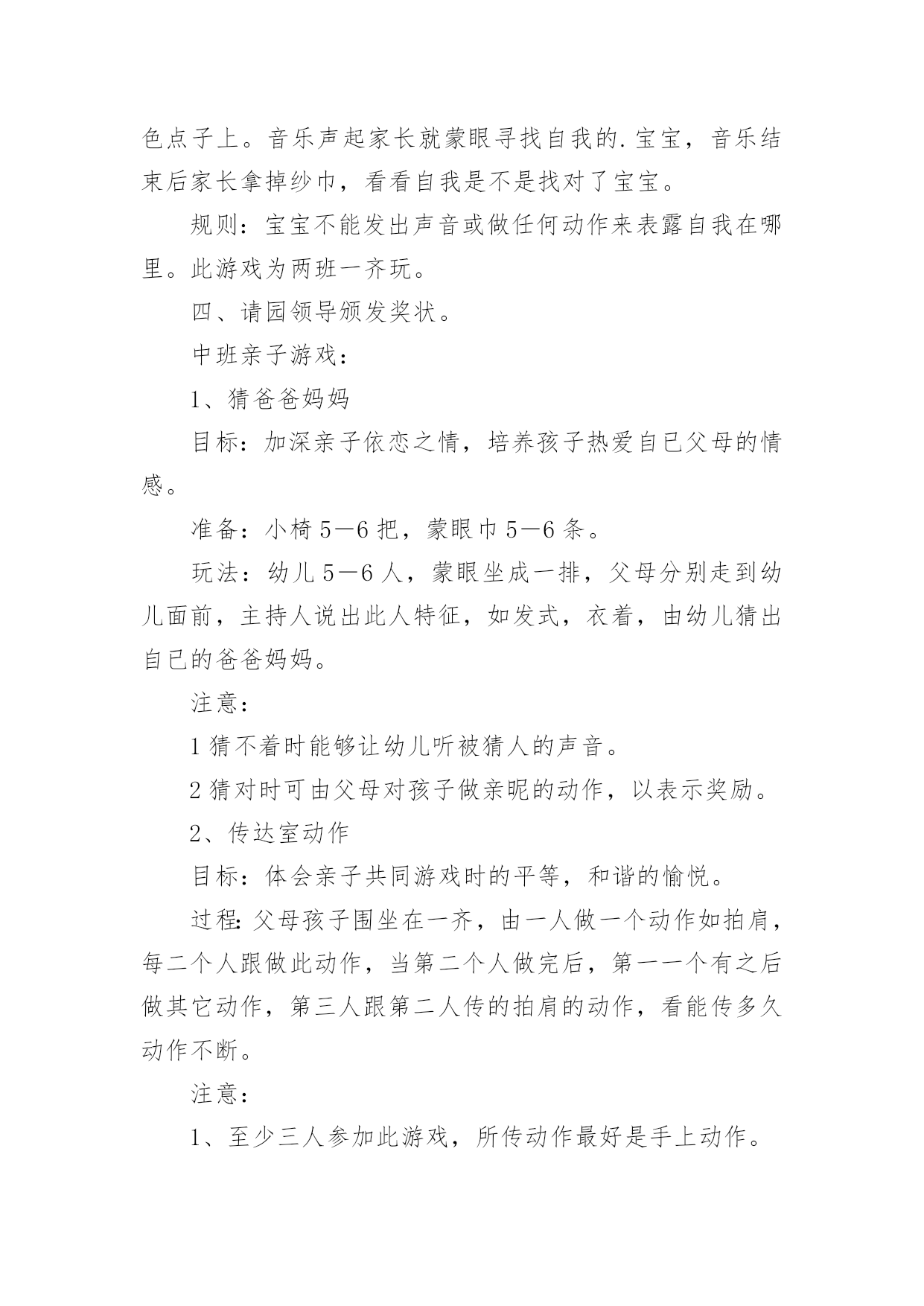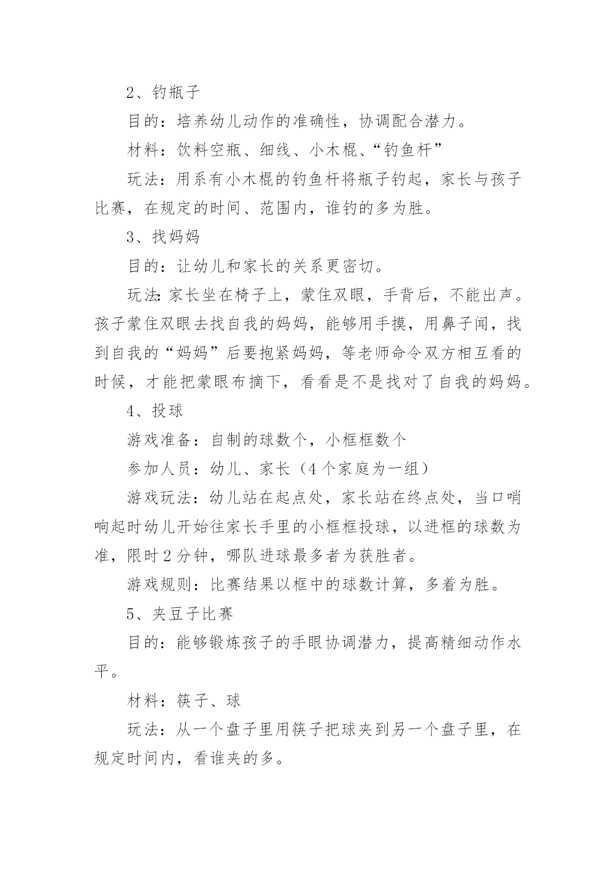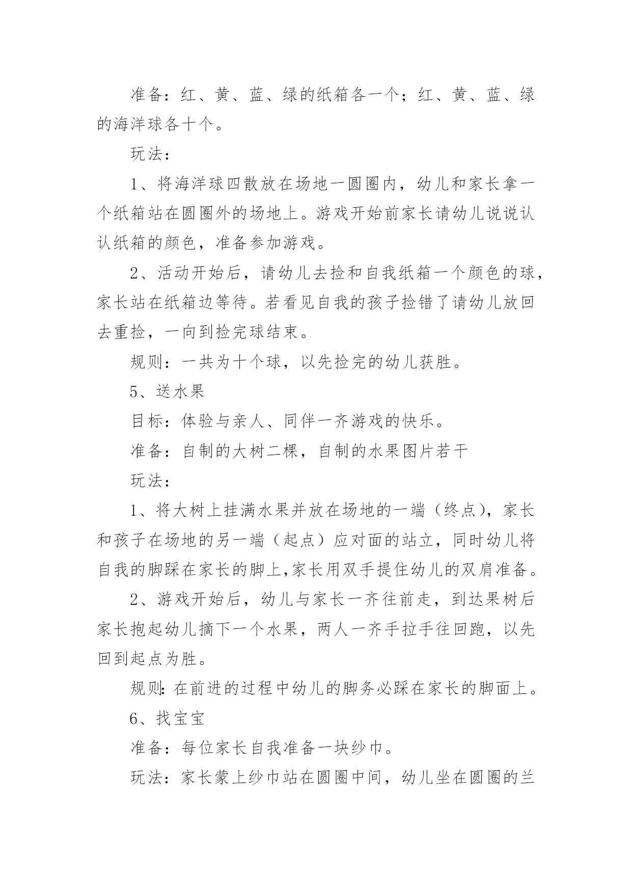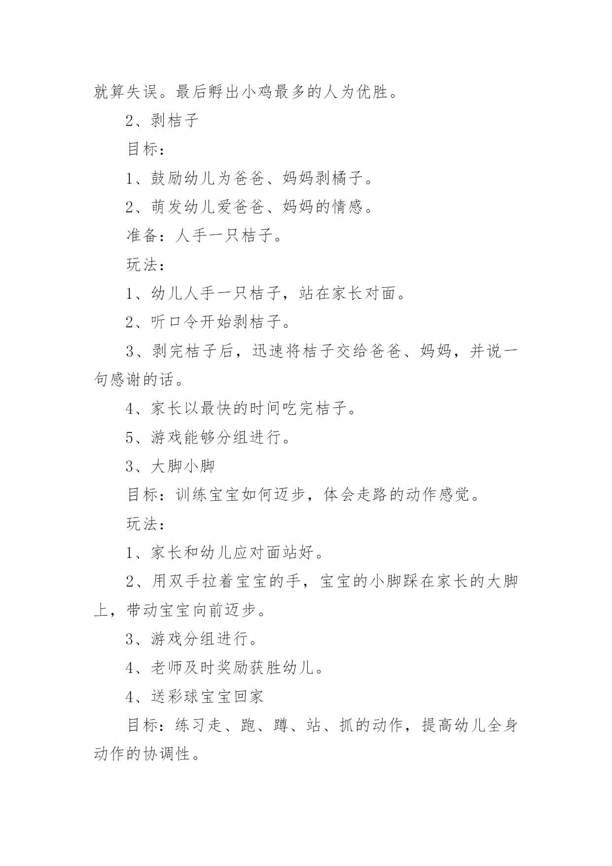 小班亲子游戏活动方案小班亲子游戏活动方案为了确保工作或事情有序地进行,我们需要提前开始方案制定工作,方案是在案前得出的方法计划。那么大家知道方案怎么写才规范吗?以下是小编为大家收集的小班亲子游戏活动方案,希望对大家有所帮助。小班亲子游戏活动方案1一、活动时间:20xx年11月26日二、活动地点:幼儿园大操场三、活动目标:1、透过好玩的亲子游戏,体验活动所带来的乐趣,增进与家人之间的情感。2、促进家长与幼儿园、家长与幼儿、家长与家长之间的沟通与交流。3、培养幼儿与父母或同伴共同克服困难夺得胜利的精神。4、培养幼儿参加体育活动的兴趣,亲身体验体育活动的魅力。四、活动准备:1、通知爸、妈来园参加亲子活动。2、准备游戏需要的材料。3、布置活动场地,准备奖品。五、具体活动方案:(一)活动流程:1、运动员入场仪式:放《运动员进行曲》2、主持人致欢迎词,领导讲话。3、主持人讲注意事项。(1)请您在活动中看好您的宝宝,以免其受到伤害。(2)请在活动过程中遵守活动规则。(3)在活动中请勿拥挤。(4)在活动中表现棒的小朋友能够由我们的小礼品哦!4、主持人介绍几种游戏的名称。托班亲子游戏:1、蹦蹦跳跳摘糖果目标:1、喜欢和老师,同伴一齐做游戏2、学习跳起摘糖果3、激发幼儿爱家人的情感准备:一张用绳编的网,网上挂着幼儿爱吃的糖果卡片玩法:1、教师和保育员一齐举起网,请幼儿分组钻到网下,跳起摘糖果。2、请幼儿看看、说说自我摘到什么“糖果”。3、幼儿把摘到的“糖果”给家长。2、采蘑菇目标:练习双脚向前跳跃,发展协调潜力。准备:兔子头饰与幼儿人数相等,做好的红、白蘑菇玩法:1、教师扮兔姐姐,带领“小兔”一齐去“采蘑菇”2、告诉幼儿地上有两种颜色的“蘑菇”,“小兔”要跳着去采“蘑菇”,回来告诉姐姐采到了什么颜色的“蘑菇”。3、让幼儿把采到的“蘑菇”放入筐内抬着回家给家人。3、推小车目标:训练上肢力和平衡感,训练空间知觉。准备:软垫数块玩法:1、让幼儿趴在软垫上,又手撑地,成人一人抓住幼儿的两条腿,使幼儿两腿向上呈倒立状。2、四个家庭为一组进行此游戏,以先到终点者为胜。小班亲子游戏:1、小鸡出壳目的:培养孩子动作的灵活性、细心和自信心。材料:大张的废报纸若干,每张画大鸡蛋,分散放在地上。玩法:让孩子发令说:“预备――起!”父母和孩子赶快拿起报纸,留意机灵地从蛋中间撕破一个洞,然后将头、肩、躯干和脚从报纸中钻过,再跨出报纸。发出“叽、叽”声,一只小鸡肉孵成了。能够之后再撕再钻,要是将报纸撕破了,就算失误。最后孵出小鸡最多的人为优胜。2、剥桔子目标:1、鼓励幼儿为爸爸、妈妈剥橘子。2、萌发幼儿爱爸爸、妈妈的情感。准备:人手一只桔子。玩法:1、幼儿人手一只桔子,站在家长对面。2、听口令开始剥桔子。3、剥完桔子后,迅速将桔子交给爸爸、妈妈,并说一句感谢的话。4、家长以最快的时间吃完桔子。5、游戏能够分组进行。3、大脚小脚目标:训练宝宝如何迈步,体会走路的动作感觉。玩法:1、家长和幼儿应对面站好。2、用双手拉着宝宝的手,宝宝的小脚踩在家长的大脚上,带动宝宝向前迈步。3、游戏分组进行。4、老师及时奖励获胜幼儿。4、送彩球宝宝回家目标:练习走、跑、蹲、站、抓的动作,提高幼儿全身动作的协调性。准备:红、黄、蓝、绿的纸箱各一个;红、黄、蓝、绿的海洋球各十个。玩法:1、将海洋球四散放在场地一圆圈内,幼儿和家长拿一个纸箱站在圆圈外的场地上。游戏开始前家长请幼儿说说认认纸箱的颜色,准备参加游戏。2、活动开始后,请幼儿去捡和自我纸箱一个颜色的球,家长站在纸箱边等待。若看见自我的孩子捡错了请幼儿放回去重捡,一向到捡完球结束。规则:一共为十个球,以先捡完的幼儿获胜。5、送水果目标:体验与亲人、同伴一齐游戏的快乐。准备:自制的大树二棵,自制的水果图片若干玩法:1、将大树上挂满水果并放在场地的一端(终点),家长和孩子在场地的另一端(起点)应对面的站立,同时幼儿将自我的脚踩在家长的脚上,家长用双手提住幼儿的双肩准备。2、游戏开始后,幼儿与家长一齐往前走,到达果树后家长抱起幼儿摘下一个水果,两人一齐手拉手往回跑,以先回到起点为胜。规则:在前进的过程中幼儿的脚务必踩在家长的脚面上。6、找宝宝准备:每位家长自我准备一块纱巾。玩法:家长蒙上纱巾站在圆圈中间,幼儿坐在圆圈的兰色点子上。音乐声起家长就蒙眼寻找自我的.宝宝,音乐结束后家长拿掉纱巾,看看自我是不是找对了宝宝。规则:宝宝不能发出声音或做任何动作来表露自我在哪里。此游戏为两班一齐玩。四、请园领导颁发奖状。中班亲子游戏:1、猜爸爸妈妈目标:加深亲子依恋之情,培养孩子热爱自已父母的情感。准备:小椅5-6把,蒙眼巾5-6条。玩法:幼儿5-6人,蒙眼坐成一排,父母分别走到幼儿面前,主持人说出此人特征,如发式,衣着,由幼儿猜出自已的爸爸妈妈。注意:1猜不