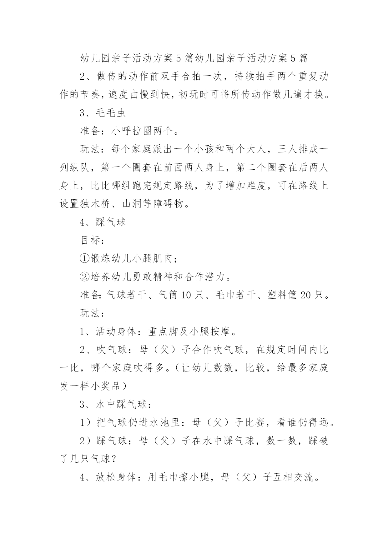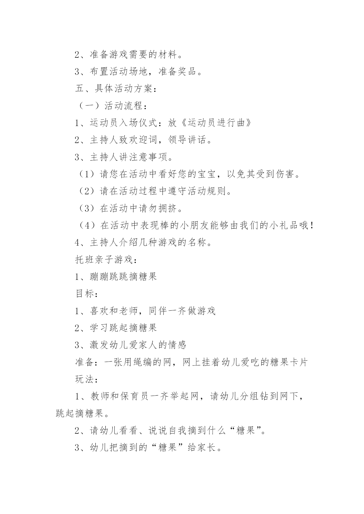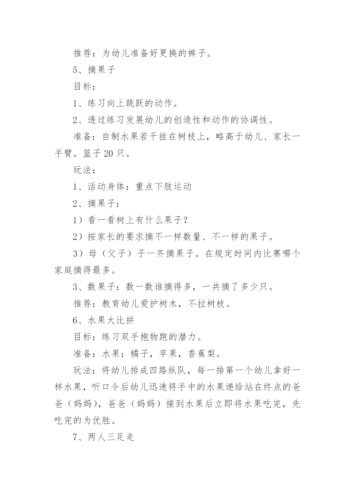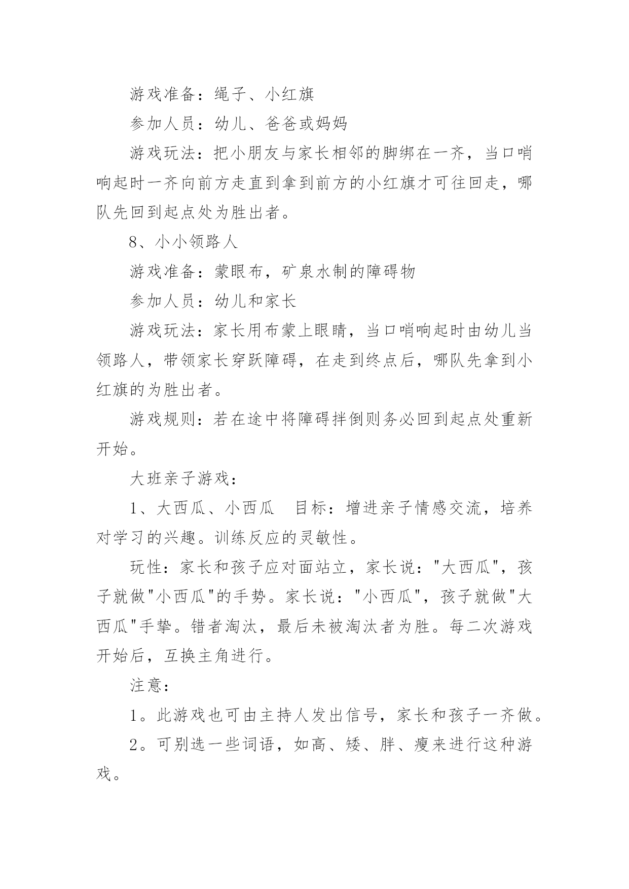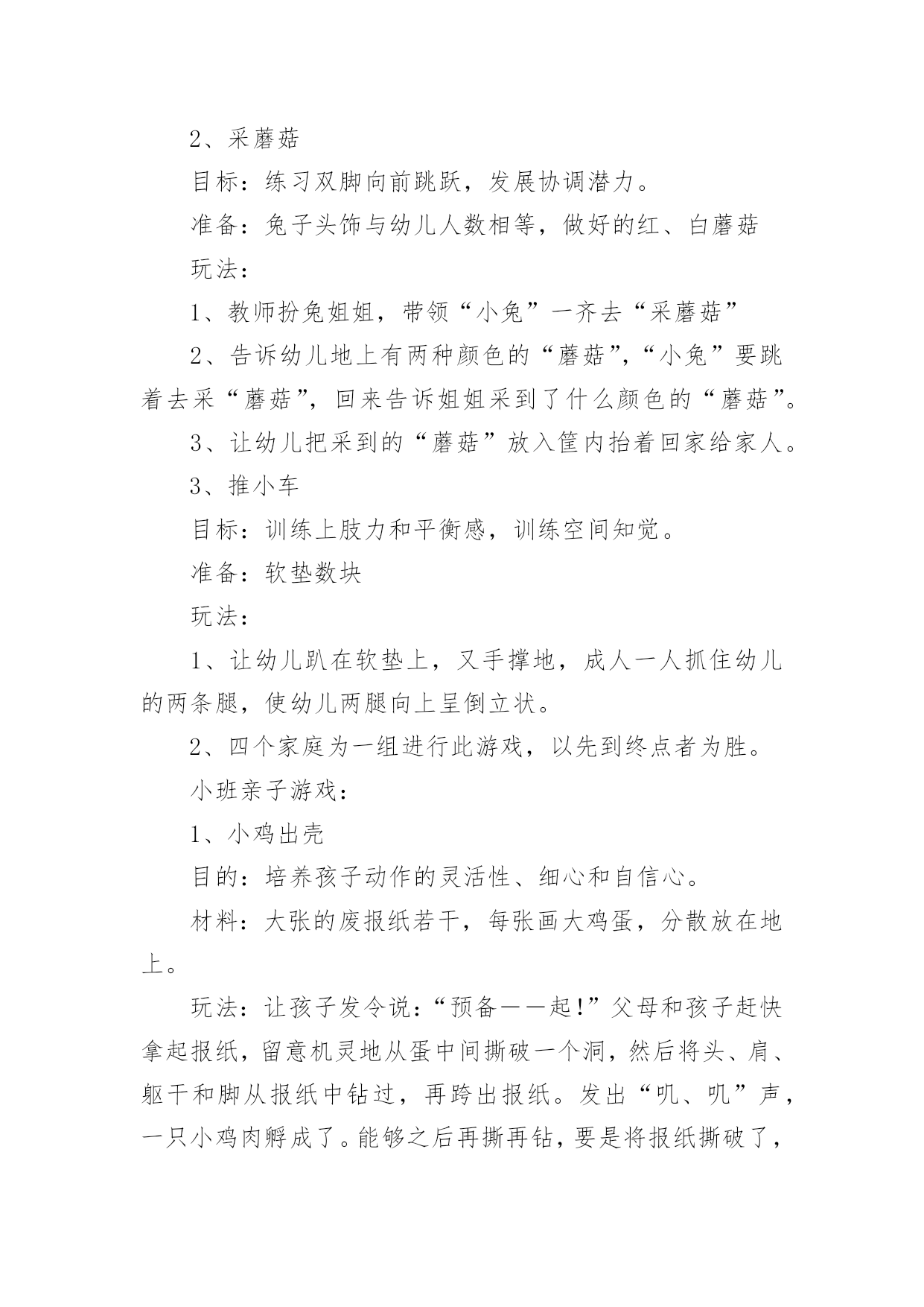 小班亲子游戏活动方案小班亲子游戏活动方案为了确保工作或事情有序地进行,我们需要提前开始方案制定工作,方案是在案前得出的方法计划。那么大家知道方案怎么写才规范吗?以下是小编为大家收集的小班亲子游戏活动方案,希望对大家有所帮助。小班亲子游戏活动方案1一、活动时间:20xx年11月26日二、活动地点:幼儿园大操场三、活动目标:1、透过好玩的亲子游戏,体验活动所带来的乐趣,增进与家人之间的情感。2、促进家长与幼儿园、家长与幼儿、家长与家长之间的沟通与交流。3、培养幼儿与父母或同伴共同克服困难夺得胜利的精神。4、培养幼儿参加体育活动的兴趣,亲身体验体育活动的魅力。四、活动准备:1、通知爸、妈来园参加亲子活动。2、准备游戏需要的材料。3、布置活动场地,准备奖品。五、具体活动方案:(一)活动流程:1、运动员入场仪式:放《运动员进行曲》2、主持人致欢迎词,领导讲话。3、主持人讲注意事项。(1)请您在活动中看好您的宝宝,以免其受到伤害。(2)请在活动过程中遵守活动规则。(3)在活动中请勿拥挤。(4)在活动中表现棒的小朋友能够由我们的小礼品哦!4、主持人介绍几种游戏的名称。托班亲子游戏:1、蹦蹦跳跳摘糖果目标:1、喜欢和老师,同伴一齐做游戏2、学习跳起摘糖果3、激发幼儿爱家人的情感准备:一张用绳编的网,网上挂着幼儿爱吃的糖果卡片玩法:1、教师和保育员一齐举起网,请幼儿分组钻到网下,跳起摘糖果。2、请幼儿看看、说说自我摘到什么“糖果”。3、幼儿把摘到的“糖果”给家长。2、采蘑菇目标:练习双脚向前跳跃,发展协调潜力。准备:兔子头饰与幼儿人数相等,做好的红、白蘑菇玩法:1、教师扮兔姐姐,带领“小兔”一齐去“采蘑菇”2、告诉幼儿地上有两种颜色的“蘑菇”,“小兔”要跳着去采“蘑菇”,回来告诉姐姐采到了什么颜色的“蘑菇”。3、让幼儿把采到的“蘑菇”放入筐内抬着回家给家人。3、推小车目标:训练上肢力和平衡感,训练空间知觉。准备:软垫数块玩法:1、让幼儿趴在软垫上,又手撑地,成人一人抓住幼儿的两条腿,使幼儿两腿向上呈倒立状。2、四个家庭为一组进行此游戏,以先到终点者为胜。小班亲子游戏:1、小鸡出壳目的:培养孩子动作的灵活性、细心和自信心。材料:大张的废报纸若干,每张画大鸡蛋,分散放在地上。玩法:让孩子发令说:“预备――起!”父母和孩子赶快拿起报纸,留意机灵地从蛋中间撕破一个洞,然后将头、肩、躯干和脚从报纸中钻过,再跨出报纸。发出“叽、叽”声,一只小鸡肉孵成了。能够之后再撕再钻,要是将报纸撕破了,就算失误。最后孵出小鸡最多的人为优胜。2、剥桔子目标:1、鼓励幼儿为爸爸、妈妈剥橘子。2、萌发幼儿爱爸爸、妈妈的情感。准备:人手一只桔子。玩法:1、幼儿人手一只桔子,站在家长对面。2、听口令开始剥桔子。3、剥完桔子后,迅速将桔子交给爸爸、妈妈,并说一句感谢的话。4、家长以最快的时间吃完桔子。5、游戏能够分组进行。3、大脚小脚目标:训练宝宝如何迈步,体会走路的动作感觉。玩法:1、家长和幼儿应对面站好。2、用双手拉着宝宝的手,宝宝的小脚踩在家长的大脚上,带动宝宝向前迈步。3、游戏分组进行。4、老师及时奖励获胜幼儿。4、送彩球宝宝回家目标:练习走、跑、蹲、站、抓的动作,提高幼儿全身动作的协调性。准备:红、黄、蓝、绿的纸箱各一个;红、黄、蓝、绿的海洋球各十个。玩法:1、将海洋球四散放在场地一圆圈内,幼儿和家长拿一个纸箱站在圆圈外的场地上。游戏开始前家长请幼儿说说认认纸箱的颜色,准备参加游戏。2、活动开始后,请幼儿去捡和自我纸箱一个颜色的球,家长站在纸箱边等待。若看见自我的孩子捡错了请幼儿放回去重捡,一向到捡完球结束。规则:一共为十个球,以先捡完的幼儿获胜。5、送水果目标:体验与亲人、同伴一齐游戏的快乐。准备:自制的大树二棵,自制的水果图片若干玩法:1、将大树上挂满水果并放在场地的一端(终点),家长和孩子在场地的另一端(起点)应对面的站立,同时幼儿将自我的脚踩在家长的脚上,家长用双手提住幼儿的双肩准备。2、游戏开始后,幼儿与家长一齐往前走,到达果树后家长抱起幼儿摘下一个水果,两人一齐手拉手往回跑,以先回到起点为胜。规则:在前进的过程中幼儿的脚务必踩在家长的脚面上。6、找宝宝准备:每位家长自我准备一块纱巾。玩法:家长蒙上纱巾站在圆圈中间,幼儿坐在圆圈的兰色点子上。音乐声起家长就蒙眼寻找自我的.宝宝,音乐结束后家长拿掉纱巾,看看自我是不是找对了宝宝。规则:宝宝不能发出声音或做任何动作来表露自我在哪里。此游戏为两班一齐玩。四、请园领导颁发奖状。中班亲子游戏:1、猜爸爸妈妈目标:加深亲子依恋之情,培养孩子热爱自已父母的情感。准备:小椅5-6把,蒙眼巾5-6条。玩法:幼儿5-6人,蒙眼坐成一排,父母分别走到幼儿面前,主持人说出此人特征,如发式,衣着,由幼儿猜出自已的爸爸妈妈。注意:1猜不