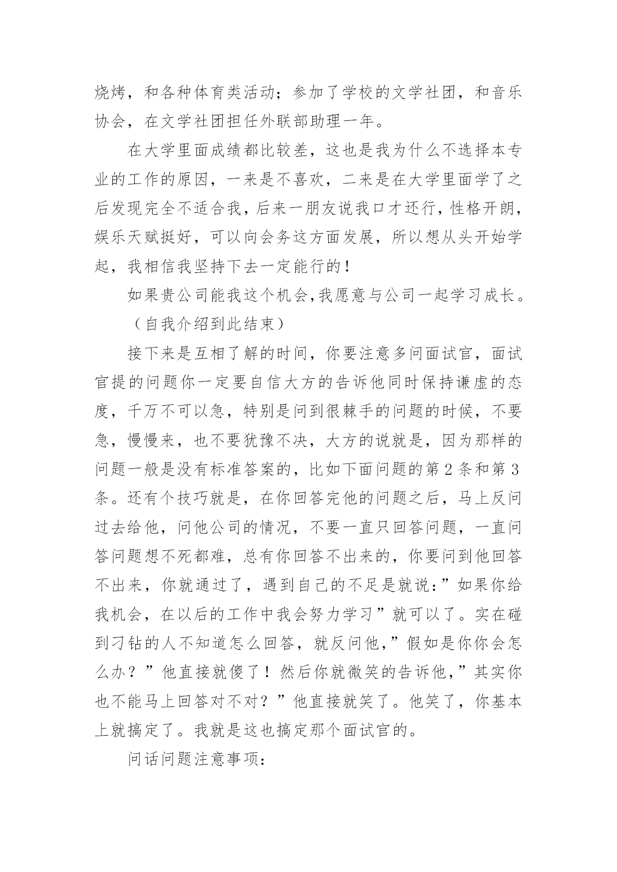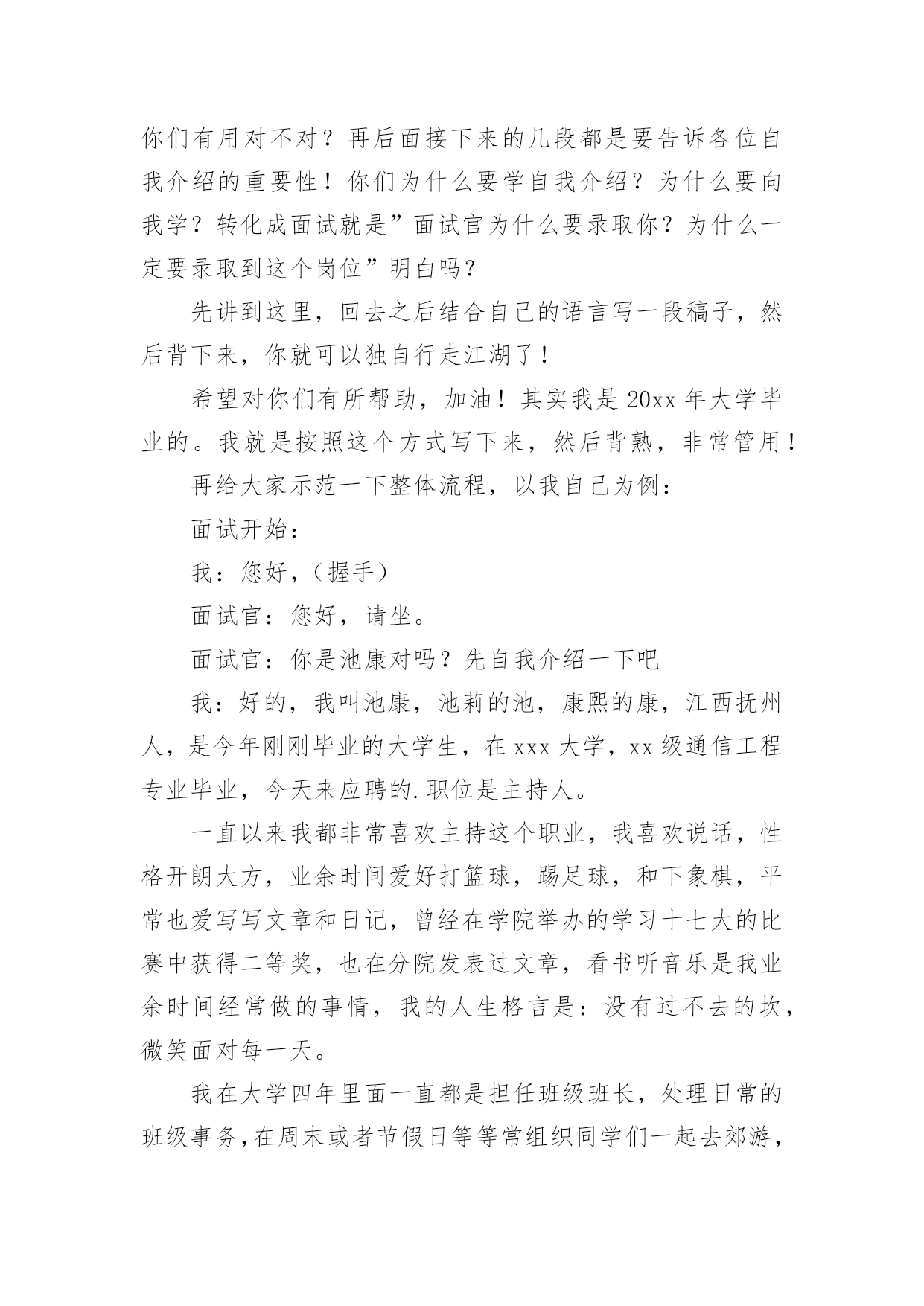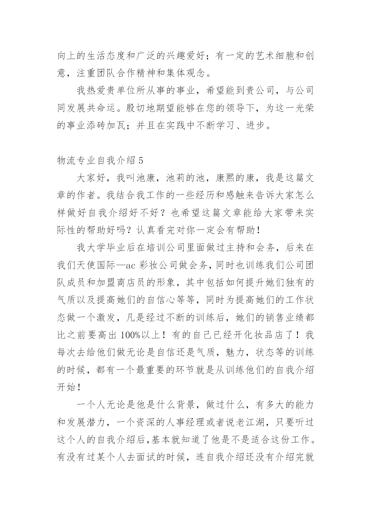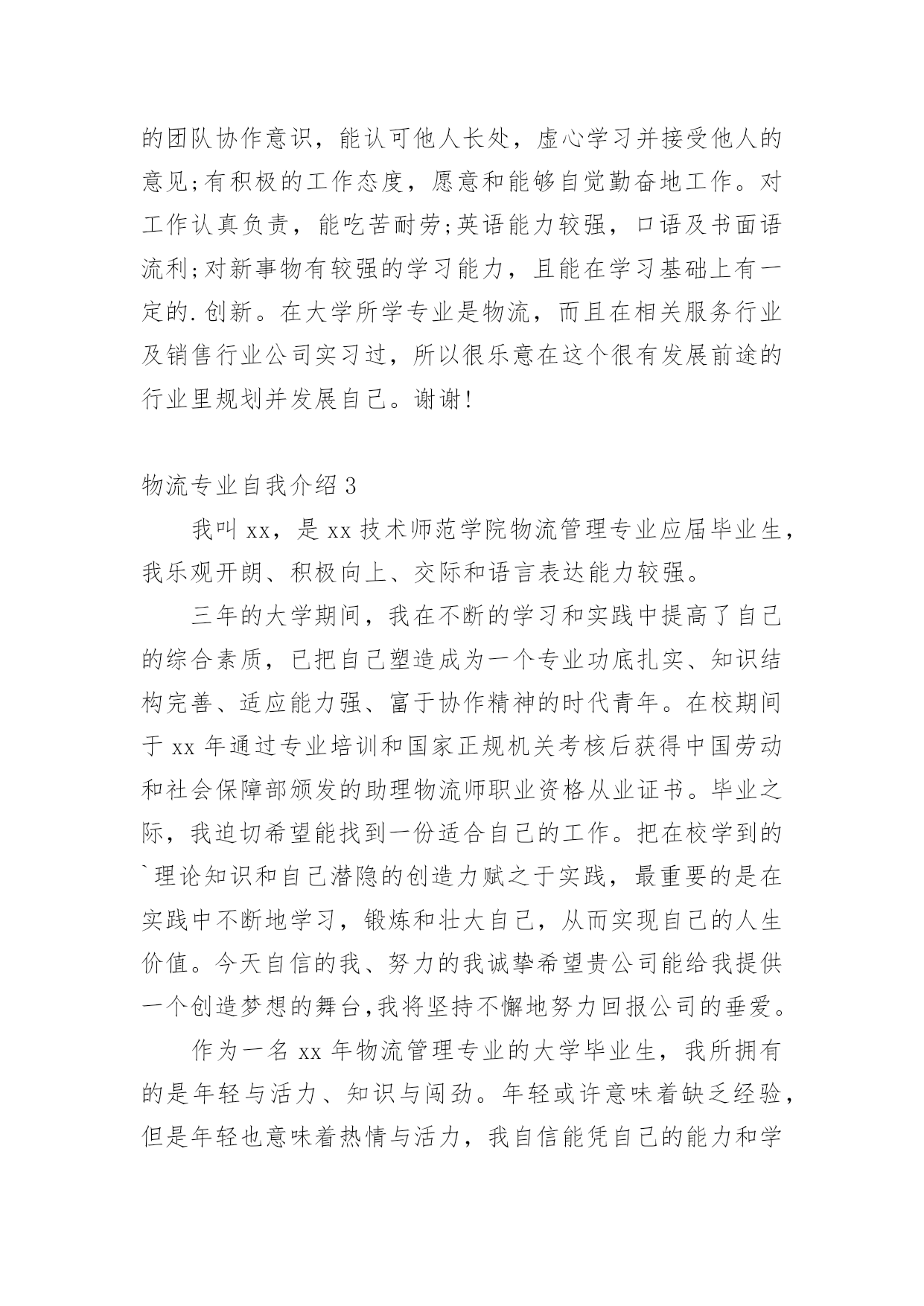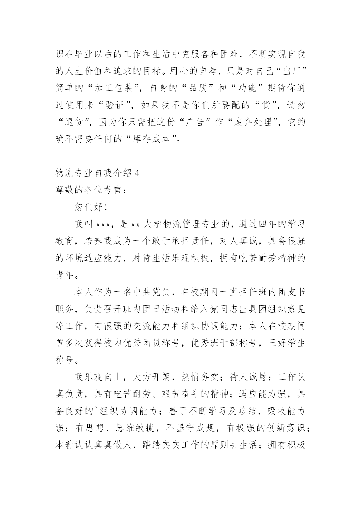 物流专业自我介绍当来到一个陌生的地方时,常常要进行自我介绍,用自我介绍往往可以让他人有一定的了解。如何写出一个与众不同的自我介绍?以下是小编为大家整理的物流专业自我介绍,欢迎阅读,希望大家能够喜欢。物流专业自我介绍1您好!很荣幸有这样一个机会,让我相各位介绍我自己。我毕业于xx大学主修xx专业。个性好学,思维敏捷,理解力强,具有较强的工作能力和团队协作精神。具有良好的职业道德和个人修养具有XX年在XXXX方面的工作经验,在xx公司全面负责物流事务,保证物流工作及档案资料符合管理体系要求。与总部、国外可客户及供应商联系物流事宜。进口包括HS归类,单证,许可证及免3C等证件申领;旧设备装运前预检,许可证申领,免表办理,报关报检及运输事务。在工作中,我始终抱着一种积极负责的态度去面对。而且我会一直保持下去,希望在以后的`工作中,能够得到多方面的学习。也希望能我一次机会,我不会让你们失望,我说的话将在我的工作中表现出来。物流专业自我介绍2您好!我性格比较开朗、乐观,善于和人相处;具有较强的团队协作意识,能认可他人长处,虚心学习并接受他人的意见;有积极的工作态度,愿意和能够自觉勤奋地工作。对工作认真负责,能吃苦耐劳;英语能力较强,口语及书面语流利;对新事物有较强的学习能力,且能在学习基础上有一定的.创新。在大学所学专业是物流,而且在相关服务行业及销售行业公司实习过,所以很乐意在这个很有发展前途的行业里规划并发展自己。谢谢!物流专业自我介绍3我叫xx,是xx技术师范学院物流管理专业应届毕业生,我乐观开朗、积极向上、交际和语言表达能力较强。三年的大学期间,我在不断的学习和实践中提高了自己的综合素质,已把自己塑造成为一个专业功底扎实、知识结构完善、适应能力强、富于协作精神的时代青年。在校期间于xx年通过专业培训和国家正规机关考核后获得中国劳动和社会保障部颁发的助理物流师职业资格从业证书。毕业之际,我迫切希望能找到一份适合自己的工作。把在校学到的`理论知识和自己潜隐的创造力赋之于实践,最重要的是在实践中不断地学习,锻炼和壮大自己,从而实现自己的人生价值。今天自信的我、努力的我诚挚希望贵公司能给我提供一个创造梦想的舞台,我将坚持不懈地努力回报公司的垂爱。作为一名xx年物流管理专业的大学毕业生,我所拥有的是年轻与活力、知识与闯劲。年轻或许意味着缺乏经验,但是年轻也意味着热情与活力,我自信能凭自己的能力和学识在毕业以后的工作和生活中克服各种困难,不断实现自我的人生价值和追求的目标。用心的自荐,只是对自己“出厂”简单的“加工包装”,自身的“品质”和“功能”期待你通过使用来“验证”,如果我不是你们所要配的“货”,请勿“退货”,因为你只需把这份“广告”作“废弃处理”,它的确不需要任何的“库存成本”。物流专业自我介绍4尊敬的各位考官:您们好!我叫xxx,是xx大学物流管理专业的,通过四年的学习教育,培养我成为一个敢于承担责任,对人真诚,具备很强的环境适应能力,对待生活乐观积极,拥有吃苦耐劳精神的青年。本人作为一名中共党员,在校期间一直担任班内团支书职务,负责召开班内团日活动和给入党同志出具团组织意见等工作,有很强的交流能力和组织协调能力;本人在校期间曾多次获得校内优秀团员称号,优秀班干部称号,三好学生称号。我乐观向上,大方开朗,热情务实;待人诚恳;工作认真负责,具有吃苦耐劳、艰苦奋斗的精神;适应能力强,具备良好的`组织协调能力;善于不断学习及总结,吸收能力强;有思想、思维敏捷,不墨守成规,有极强的创新意识;本着认认真真做人,踏踏实实工作的原则去生活;拥有积极向上的生活态度和广泛的兴趣爱好;有一定的艺术细胞和创意,注重团队合作精神和集体观念。我热爱贵单位所从事的事业,希望能到贵公司,与公司同发展共命运。殷切地期望能够在您的领导下,为这一光荣的事业添砖加瓦;并且在实践中不断学习、进步。物流专业自我介绍5大家好,我叫池康,池莉的池,康熙的康,我是这篇文章的作者。我结合我工作的一些经历和感触来告诉大家怎么样做好自我介绍好不好?也希望这篇文章能给大家带来实际性的帮助好吗?认真看完对你一定会有帮助!我大学毕业后在培训公司里面做过主持和会务,后来在我们天使国际—ac彩妆公司做会务,同时也训练我们公司团队成员和加盟商店员的形象,其中包括如何提升她们独有的气质以及提高她们的自信心等等,同时为提高她们的工作状态做一个激发,凡是经过不断的训练后,她们的销售业绩都比之前要高出100%以上!有的自己已经开化妆品店了!我每次去给他们做无论是自信还是气质,魅力,状态等的训练的时候,都有一个最重要的环节就是从训练他们的自我介绍开始!一个人无论是他是什么背景,做过什么,有多大的能力和发展潜力,一个资深的人事经理或者说老江湖,只要听过这个人的自我介绍后,基本就知道了他是不是适合这份工作。有