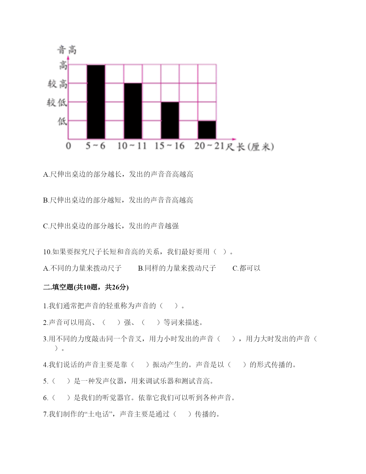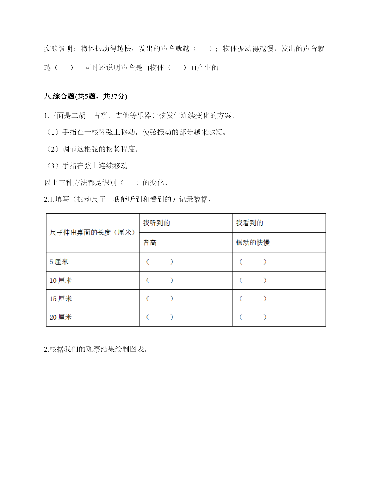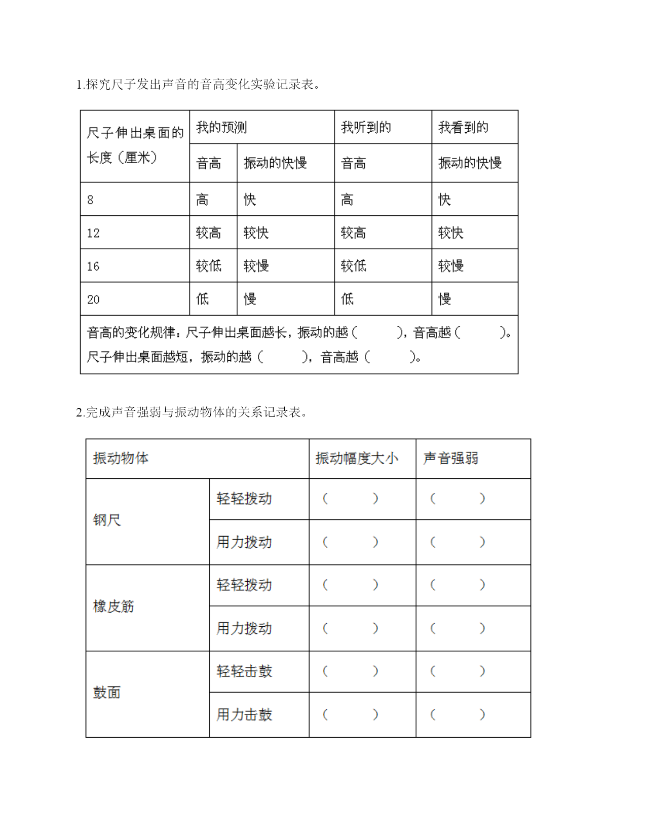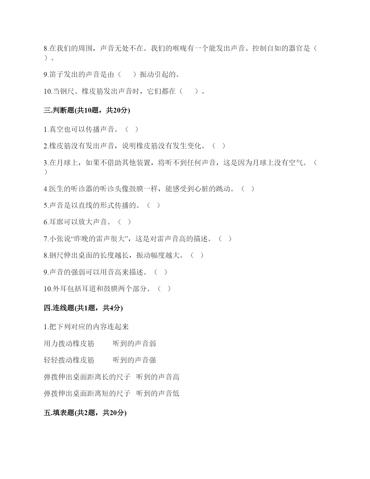 小学科学《声音》练习题一.选择题(共10题,共20分)1.唐代诗人张继的名句“姑苏城外寒山寺,夜半钟声到客船”描述了客船中的人听到远方的场景。此时听到的钟声是通过()传来的。A.水面B.客船C.空气2.下列声音中()属于人为的制造声音。A.海浪声B.歌声C.风声3.我们读书时发出的声音是()振动而产生的。A.舌头B.嘴唇C.声带4.用棉线和纸杯制作的“土电话”,声音主要是通过()从话筒传到听筒的。A.空气B.棉线C.纸杯5.不能影响弦乐器音调高低的因素有()。A.音色B.松紧C.长短D.粗细6.黄莺的叫声婉转动听,它的叫声是用()发出的。A.声带B.翅膀C.唇舌D.鸣管7.拨弹橡皮筋时,皮筋越紧,声音();皮筋越松,声音越低。A.越高B.越低C.不变8.描述声音高低的是()。A.音高B.大声C.音量9.下图是钢尺发声实验中尺伸出桌边的长度与它被拨动发出声音的一份研究图表。从图中可以看出()。A.尺伸出桌边的部分越长,发出的声音音高越高B.尺伸出桌边的部分越短,发出的声音音高越高C.尺伸出桌边的部分越长,发出的声音越强10.如果要探究尺子长短和音高的关系,我们最好要用()。A.不同的力量来拨动尺子B.同样的力量来拨动尺子C.都可以二.填空题(共10题,共26分)1.我们通常把声音的轻重称为声音的()。2.声音可以用高、()强、()等词来描述。3.用不同的力度敲击同一个音叉,用力小时发出的声音(),用力大时发出的声音()。4.我们说话的声音主要是靠()振动产生的。声音是以()的形式传播的。5.()是一种发声仪器,用来调试乐器和测试音高。6.()是我们的听觉器官。依靠它我们可以听到各种声音。7.我们制作的“土电话”,声音主要是通过()传播的。8.在我们的周围,声音无处不在。我们的喉咙有一个能发出声音、控制自如的器官是()。9.笛子发出的声音是由()振动引起的。10.当钢尺、橡皮筋发出声音时,它们都在()。三.判断题(共10题,共20分)1.真空也可以传播声音。()2.橡皮筋没有发出声音,说明橡皮筋没有发生变化。()3.在月球上,如果不借助其他装置,将听不到任何声音,这是因为月球上没有空气。()4.医生的听诊器的听诊头像鼓膜一样,能感受到心脏的跳动。()5.声音是以直线的形式传播的。()6.耳廓可以放大声音。()7.小张说“昨晚的雷声很大”,这是对雷声音高的描述。()8.钢尺伸出桌面的长度越长,振动幅度越大。()9.声音的强弱可以用音高来描述。()10.外耳包括耳道和鼓膜两个部分。()四.连线题(共1题,共4分)1.把下列对应的内容连起来用力拨动橡皮筋听到的声音弱轻轻拨动橡皮筋听到的声音强弹拨伸出桌面距离长的尺子听到的声音高弹拨伸出桌面距离短的尺子听到的声音低五.填表题(共2题,共20分)1.探究尺子发出声音的音高变化实验记录表。2.完成声音强弱与振动物体的关系记录表。六.简答题(共5题,共25分)1.自制小乐器分为几个步骤?依次是什么?2.我们可以从哪几个方面对自制的小乐器进行评价?3.二胡有两根弦,空弦拉的时候,发出的声音有高有低,这是为什么?4.宇航员在太空中工作时,需要借助电子通信设备才能进行沟通,为什么?5.为什么女生的音高比男生高?七.材料题(共3题,共17分)1.小明有3根长短相同,粗细不同的钢管,小丽说:“我可以闭上眼睛,只通过用相同的力敲击钢管就可以判断它们的粗细。”请解释其中的原理。2.夏天的夜晚,我们经常能听到蟋蟀的叫声,可是,你知道吗?只有雄性蟋蟀会叫,雌性是不会叫的。而且,蟋蟀的叫声不是从口中发出的,而是靠翅膀的摩擦来发声的。在雄性蟋蟀的前翅上,有旋涡纹状的翅膜,一边翅膀长着锉刀状的翅膜——弦器,另一边翅膀长着较硬的翅膜——弹器。当这两种发音器相互摩擦时,就能发出声音。蟋蟀称得上是昆虫界里一名优秀的小提琴师。你还听见过哪些动物的叫声?试写出5种。3.如图所示:在一块木板上钉两个钉子,在两个钉子之间绑一根橡皮筋,拨弹橡皮筋,观察比较声音高低的变化。实验记录如下:实验说明:物体振动得越快,发出的声音就越();物体振动得越慢,发出的声音就越();同时还说明声音是由物体()而产生的。八.综合题(共5题,共37分)1.下面是二胡、古筝、吉他等乐器让弦发生连续变化的方案。(1)手指在一根琴弦上移动,使弦振动的部分越来越短。(2)调节这根弦的松紧程度。(3)手指在弦上连续移动。以上三种方法都是识别()的变化。2.1.填写(振动尺子—我能听到和看到的)记录数据。2.根据我们的观察结果绘制图表。3.通过伸出桌面的尺子长度和音高变化的记录表与柱状图,我们发现:()。3