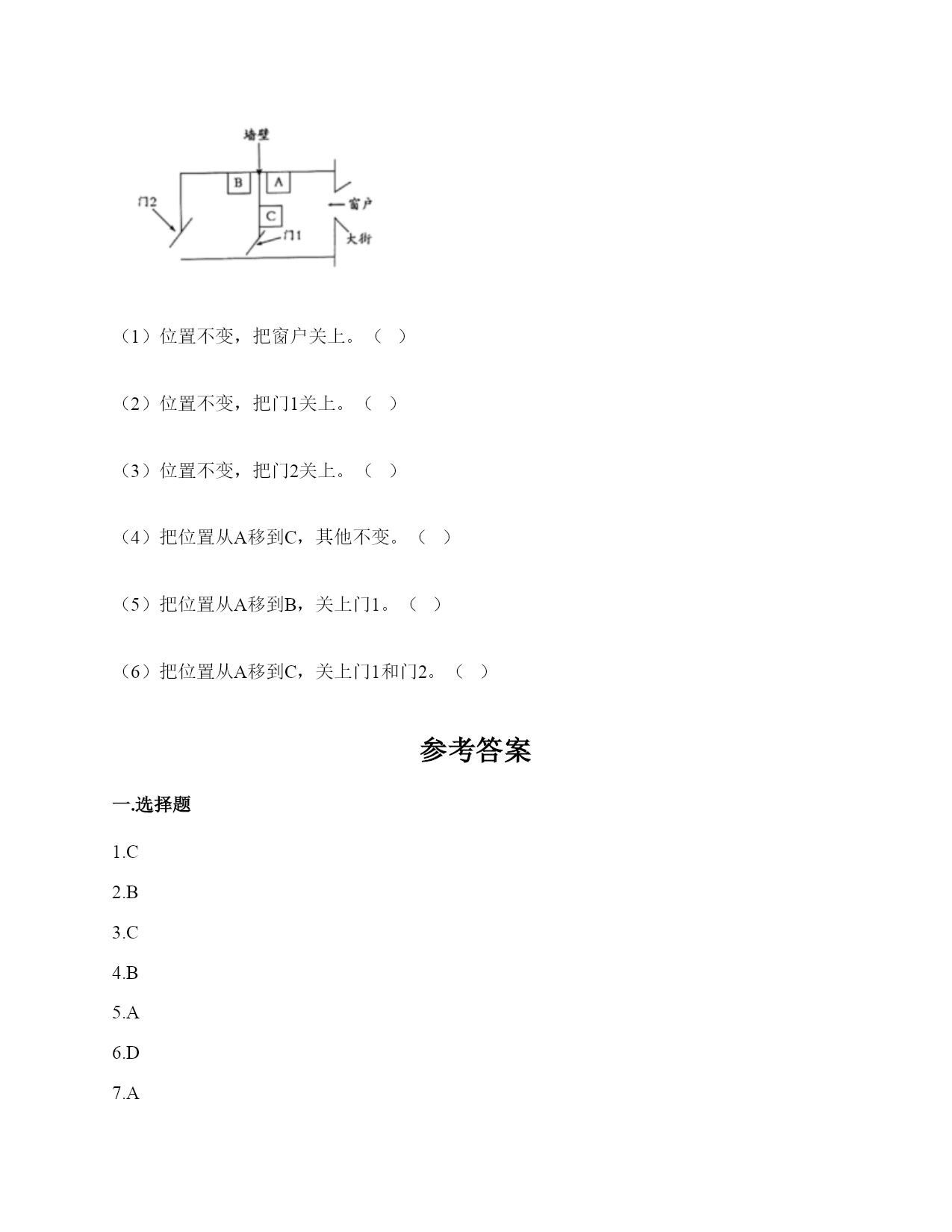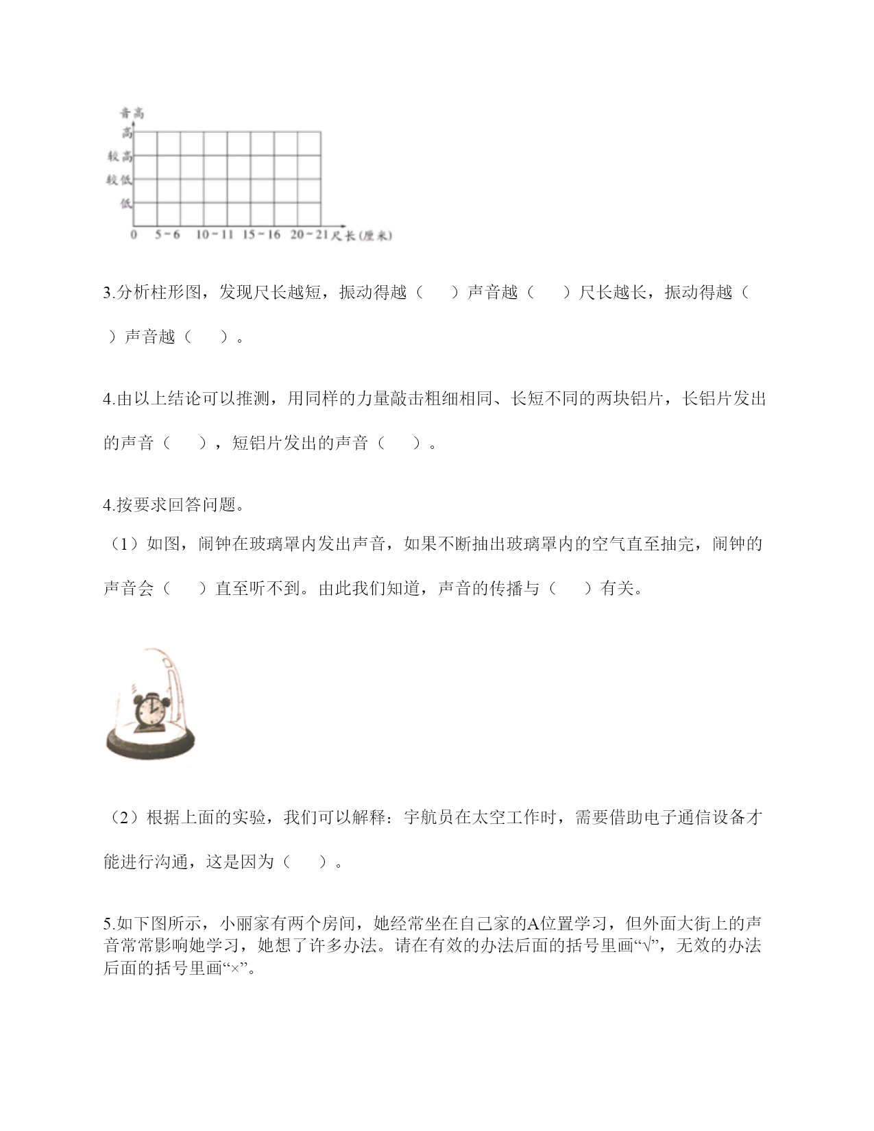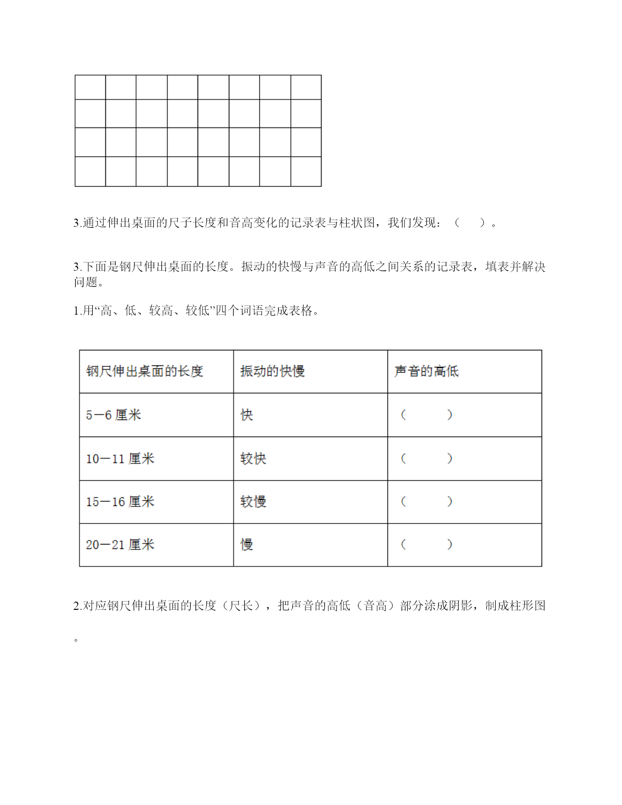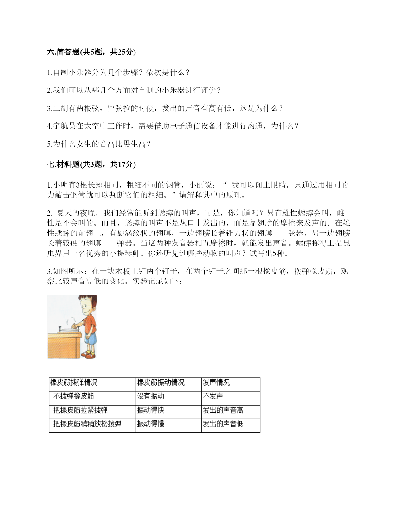 小学科学《声音》练习题一.选择题(共10题,共20分)1.唐代诗人张继的名句“姑苏城外寒山寺,夜半钟声到客船”描述了客船中的人听到远方的场景。此时听到的钟声是通过()传来的。A.水面B.客船C.空气2.下列声音中()属于人为的制造声音。A.海浪声B.歌声C.风声3.我们读书时发出的声音是()振动而产生的。A.舌头B.嘴唇C.声带4.用棉线和纸杯制作的“土电话”,声音主要是通过()从话筒传到听筒的。A.空气B.棉线C.纸杯5.不能影响弦乐器音调高低的因素有()。A.音色B.松紧C.长短D.粗细6.黄莺的叫声婉转动听,它的叫声是用()发出的。A.声带B.翅膀C.唇舌D.鸣管7.拨弹橡皮筋时,皮筋越紧,声音();皮筋越松,声音越低。A.越高B.越低C.不变8.描述声音高低的是()。A.音高B.大声C.音量9.下图是钢尺发声实验中尺伸出桌边的长度与它被拨动发出声音的一份研究图表。从图中可以看出()。A.尺伸出桌边的部分越长,发出的声音音高越高B.尺伸出桌边的部分越短,发出的声音音高越高C.尺伸出桌边的部分越长,发出的声音越强10.如果要探究尺子长短和音高的关系,我们最好要用()。A.不同的力量来拨动尺子B.同样的力量来拨动尺子C.都可以二.填空题(共10题,共26分)1.我们通常把声音的轻重称为声音的()。2.声音可以用高、()强、()等词来描述。3.用不同的力度敲击同一个音叉,用力小时发出的声音(),用力大时发出的声音()。4.我们说话的声音主要是靠()振动产生的。声音是以()的形式传播的。5.()是一种发声仪器,用来调试乐器和测试音高。6.()是我们的听觉器官。依靠它我们可以听到各种声音。7.我们制作的“土电话”,声音主要是通过()传播的。8.在我们的周围,声音无处不在。我们的喉咙有一个能发出声音、控制自如的器官是()。9.笛子发出的声音是由()振动引起的。10.当钢尺、橡皮筋发出声音时,它们都在()。三.判断题(共10题,共20分)1.真空也可以传播声音。()2.橡皮筋没有发出声音,说明橡皮筋没有发生变化。()3.在月球上,如果不借助其他装置,将听不到任何声音,这是因为月球上没有空气。()4.医生的听诊器的听诊头像鼓膜一样,能感受到心脏的跳动。()5.声音是以直线的形式传播的。()6.耳廓可以放大声音。()7.小张说“昨晚的雷声很大”,这是对雷声音高的描述。()8.钢尺伸出桌面的长度越长,振动幅度越大。()9.声音的强弱可以用音高来描述。()10.外耳包括耳道和鼓膜两个部分。()四.连线题(共1题,共4分)1.把下列对应的内容连起来用力拨动橡皮筋听到的声音弱轻轻拨动橡皮筋听到的声音强弹拨伸出桌面距离长的尺子听到的声音高弹拨伸出桌面距离短的尺子听到的声音低五.填表题(共2题,共20分)1.探究尺子发出声音的音高变化实验记录表。2.完成声音强弱与振动物体的关系记录表。六.简答题(共5题,共25分)1.自制小乐器分为几个步骤?依次是什么?2.我们可以从哪几个方面对自制的小乐器进行评价?3.二胡有两根弦,空弦拉的时候,发出的声音有高有低,这是为什么?4.宇航员在太空中工作时,需要借助电子通信设备才能进行沟通,为什么?5.为什么女生的音高比男生高?七.材料题(共3题,共17分)1.小明有3根长短相同,粗细不同的钢管,小丽说:“我可以闭上眼睛,只通过用相同的力敲击钢管就可以判断它们的粗细。”请解释其中的原理。2.夏天的夜晚,我们经常能听到蟋蟀的叫声,可是,你知道吗?只有雄性蟋蟀会叫,雌性是不会叫的。而且,蟋蟀的叫声不是从口中发出的,而是靠翅膀的摩擦来发声的。在雄性蟋蟀的前翅上,有旋涡纹状的翅膜,一边翅膀长着锉刀状的翅膜——弦器,另一边翅膀长着较硬的翅膜——弹器。当这两种发音器相互摩擦时,就能发出声音。蟋蟀称得上是昆虫界里一名优秀的小提琴师。你还听见过哪些动物的叫声?试写出5种。3.如图所示:在一块木板上钉两个钉子,在两个钉子之间绑一根橡皮筋,拨弹橡皮筋,观察比较声音高低的变化。实验记录如下:实验说明:物体振动得越快,发出的声音就越();物体振动得越慢,发出的声音就越();同时还说明声音是由物体()而产生的。八.综合题(共5题,共37分)1.下面是二胡、古筝、吉他等乐器让弦发生连续变化的方案。(1)手指在一根琴弦上移动,使弦振动的部分越来越短。(2)调节这根弦的松紧程度。(3)手指在弦上连续移动。以上三种方法都是识别()的变化。2.1.填写(振动尺子—我能听到和看到的)记录数据。2.根据我们的观察结果绘制图表。3.通过伸出桌面的尺子长度和音高变化的记录表与柱状图,我们发现:()。3