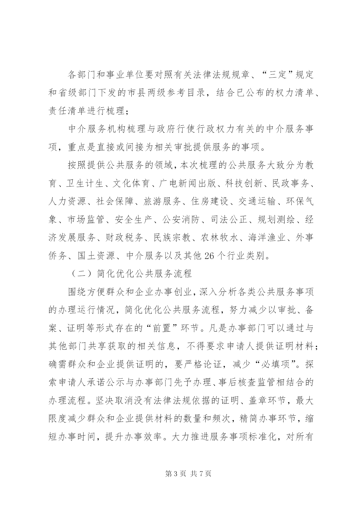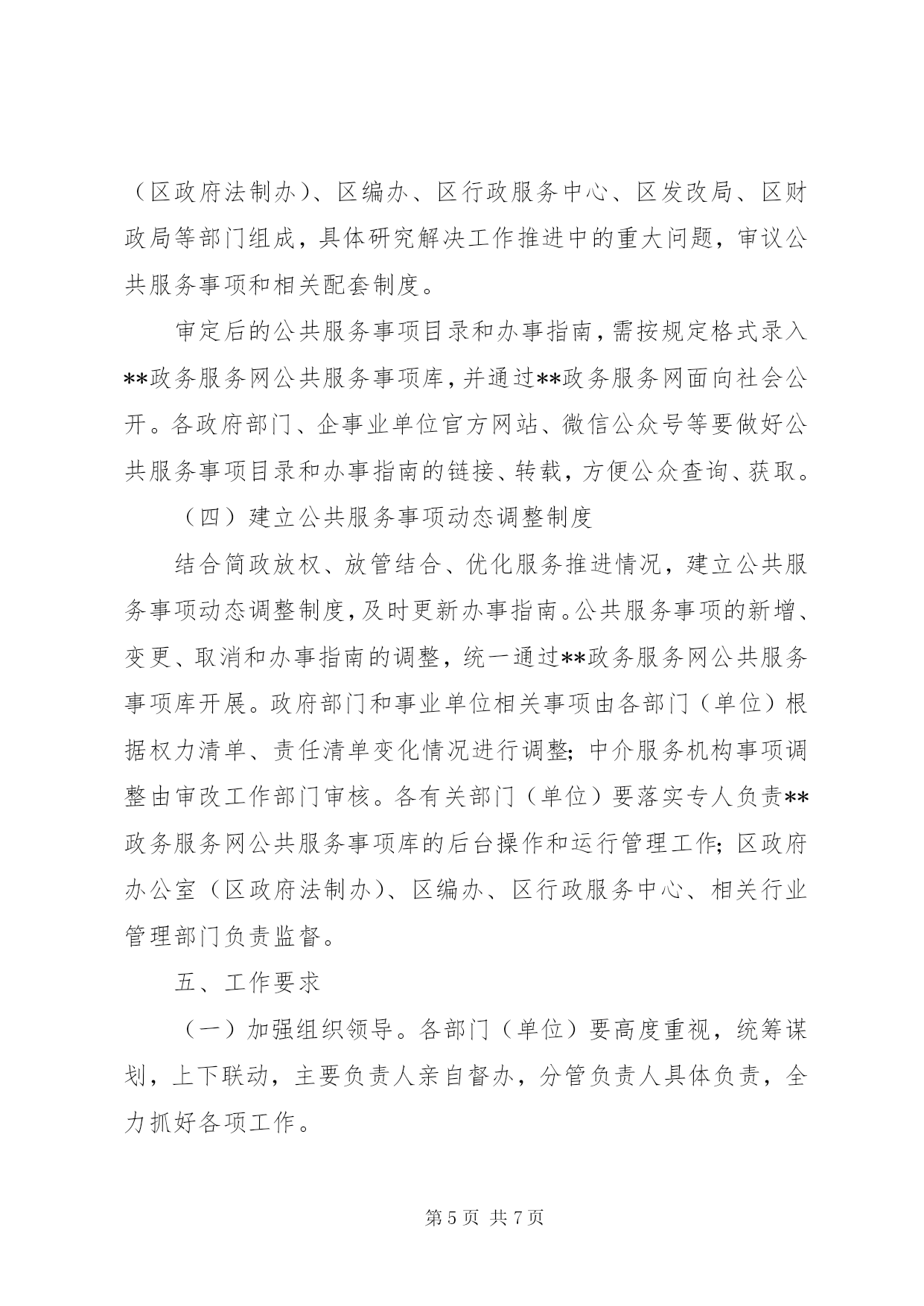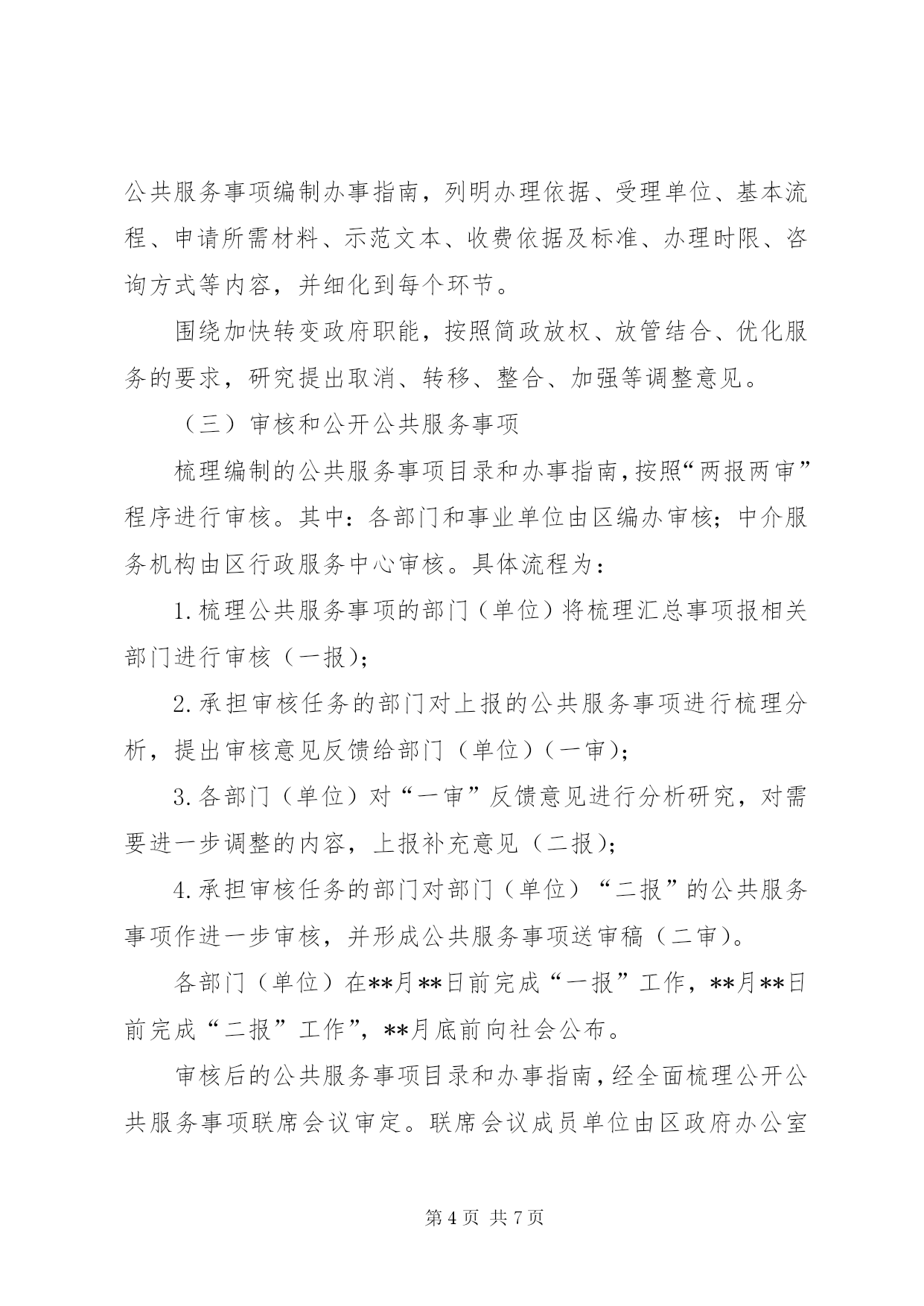 第PAGE\*Arabic\*MERGEFORMAT7页共NUMPAGES\*MERGEFORMAT7页全面梳理公开公共服务事项实施方案小编寄语。下面是我们6点公文网的小编为大家整理的全面梳理公开公共服务事项实施方案,请大家参阅。为贯彻落实《国务院办公厅关于简化优化公共服务流程方便基层群众办事创业的通知》(国办发〔2015〕86号)、《**省人民政府办公厅关于实施服务型政府建设“1113”行动计划的通知》(**政办发〔2016〕116号)和《**市人民政府办公室关于全面梳理公开公共服务事项的实施意见》(**政办发〔2017〕4号)文件要求,深化“四张清单一张网”和“放管服”改革,加快转变政府职能,为群众提供优质高效便捷的公共服务,结合我区实际,经区政府同意,现就全面梳理公开公共服务事项有关工作提出如下实施意见。一、总体要求围绕进一步深化简政放权、放管结合、优化服务和公共服务供给侧结构性改革的要求,坚持需求导向、问题导向和效能导向,梳理公开公共服务事项,补齐公共服务短板,完善公共服务供给,畅通公共服务渠道,有效解决基层群众和企业办事“找谁办、哪里办、怎么办”的问题,激发市场活力和发展动力,增强人民群众改革获得感,努力打造人民满意的服务型政府。二、基本原则(一)坚持便民利民。以提高基层群众获得感和满意度为核心,简化办事环节和手续,优化公共服务流程,明确标准和时限要求,为群众提供优质高效便捷的公共服务,最大程度方便群众办事创业。(二)坚持依法依规。严格遵循相关法律法规,坚持法治思维和法治方式,全面梳理公共服务事项,规范完善办理程序,限制自由裁量行为,维护基层群众和企业合法权益,推进公共服务制度化、规范化。(三)坚持公开透明。向社会全面公开公共服务事项,从群众和企业利益出发,建立健全服务规则,提升运用大数据等现代信息技术为民服务的能力,实现办事过程公开透明,接受社会监督。(四)坚持统筹兼顾。与深化权力清单、责任清单、行政审批制度改革等有机融合,利用现有平台,整合服务资源,持续深化完善“四张清单一张网”改革。三、范围对象本次梳理公开公共服务事项的范围主要是直接面向公民、法人和其他组织的公共服务以及行政管理中的便民事项。对象为区涉及公共服务领域的政府部门、事业单位、行政审批中介服务机构等。镇(街道)参照执行。四、主要任务(一)全面梳理公共服务事项目录各部门和事业单位要对照有关法律法规规章、“三定”规定和省级部门下发的市县两级参考目录,结合已公布的权力清单、责任清单进行梳理;中介服务机构梳理与政府行使行政权力有关的中介服务事项,重点是直接或间接为相关审批提供服务的事项。按照提供公共服务的领域,本次梳理的公共服务大致分为教育、卫生计生、文化体育、广电新闻出版、科技创新、民政事务、人力资源、社会保障、旅游服务、住房建设、交通运输、环保气象、市场监管、安全生产、公安消防、司法公正、规划测绘、经济发展服务、财政税务、民族宗教、农林牧水、海洋渔业、外事侨务、国土资源、中介服务以及其他26个行业类别。(二)简化优化公共服务流程围绕方便群众和企业办事创业,深入分析各类公共服务事项的办理运行情况,简化优化公共服务流程,努力减少以审批、备案、证明等形式存在的“前置”环节。凡是办事部门可以通过与其他部门共享获取的相关信息,不得要求申请人提供证明材料;确需群众和企业提供证明的,要严格论证,减少“必填项”。探索申请人承诺公示与办事部门先予办理、事后核查监管相结合的办理流程。坚决取消没有法律法规依据的证明、盖章环节,最大限度减少群众和企业提供材料的数量和频次,精简办事环节,缩短办事时间,提升办事效率。大力推进服务事项标准化,对所有公共服务事项编制办事指南,列明办理依据、受理单位、基本流程、申请所需材料、示范文本、收费依据及标准、办理时限、咨询方式等内容,并细化到每个环节。围绕加快转变政府职能,按照简政放权、放管结合、优化服务的要求,研究提出取消、转移、整合、加强等调整意见。(三)审核和公开公共服务事项梳理编制的公共服务事项目录和办事指南,按照“两报两审”程序进行审核。其中:各部门和事业单位由区编办审核;中介服务机构由区行政服务中心审核。具体流程为:1.梳理公共服务事项的部门(单位)将梳理汇总事项报相关部门进行审核(一报);2.承担审核任务的部门对上报的公共服务事项进行梳理分析,提出审核意见反馈给部门(单位)(一审);3.各部门(单位)对“一审”反馈意见进行分析研究,对需要进一步调整的内容,上报补充意见(二报);4.承担审核任务的部门对部门(单位)“二报”的公共服务事项作进一步审核,并形成公共服务事项送审稿(二审)。各部门(单位)在**月**日前完成“一报”工作,**月**日前完成“二报”工作”,**月底前向社会公布。审核后的公共服务事项目录