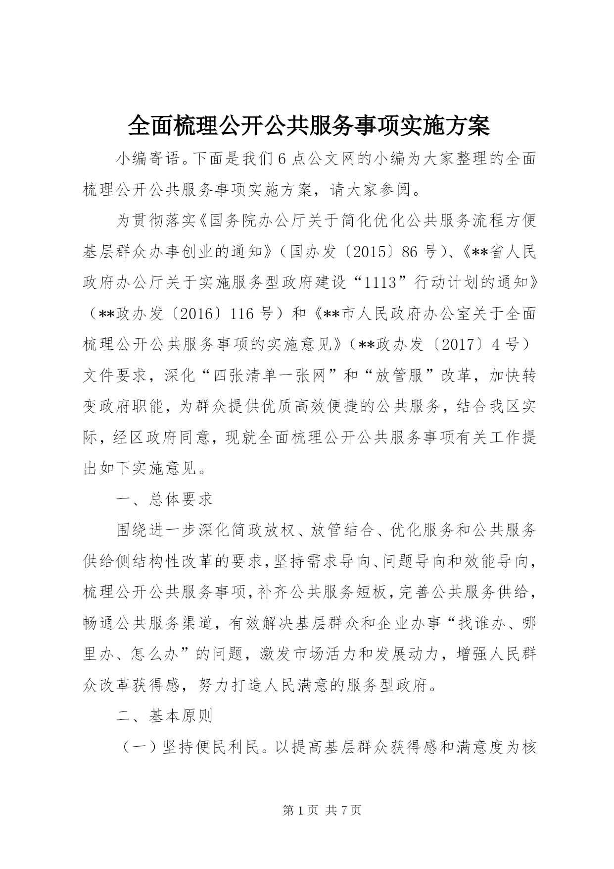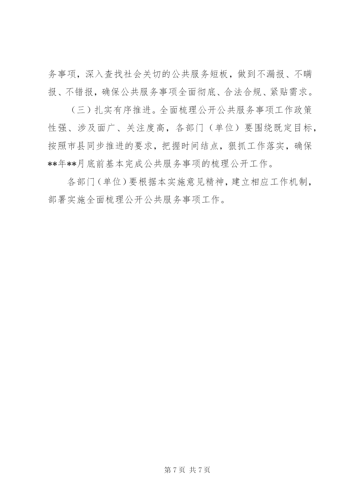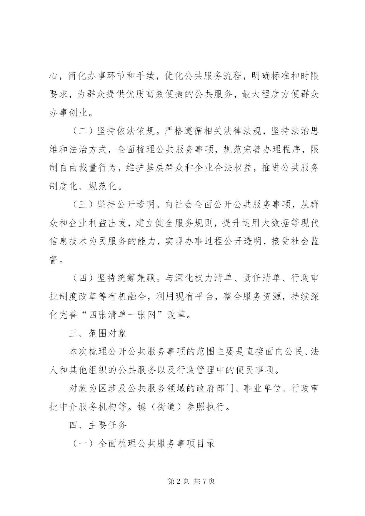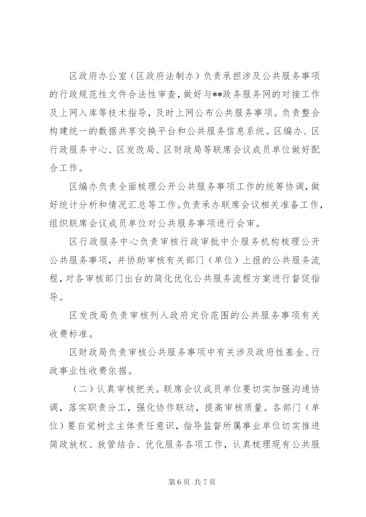 第PAGE\*Arabic\*MERGEFORMAT7页共NUMPAGES\*MERGEFORMAT7页全面梳理公开公共服务事项实施方案小编寄语。下面是我们6点公文网的小编为大家整理的全面梳理公开公共服务事项实施方案,请大家参阅。为贯彻落实《国务院办公厅关于简化优化公共服务流程方便基层群众办事创业的通知》(国办发〔2015〕86号)、《**省人民政府办公厅关于实施服务型政府建设“1113”行动计划的通知》(**政办发〔2016〕116号)和《**市人民政府办公室关于全面梳理公开公共服务事项的实施意见》(**政办发〔2017〕4号)文件要求,深化“四张清单一张网”和“放管服”改革,加快转变政府职能,为群众提供优质高效便捷的公共服务,结合我区实际,经区政府同意,现就全面梳理公开公共服务事项有关工作提出如下实施意见。一、总体要求围绕进一步深化简政放权、放管结合、优化服务和公共服务供给侧结构性改革的要求,坚持需求导向、问题导向和效能导向,梳理公开公共服务事项,补齐公共服务短板,完善公共服务供给,畅通公共服务渠道,有效解决基层群众和企业办事“找谁办、哪里办、怎么办”的问题,激发市场活力和发展动力,增强人民群众改革获得感,努力打造人民满意的服务型政府。二、基本原则(一)坚持便民利民。以提高基层群众获得感和满意度为核心,简化办事环节和手续,优化公共服务流程,明确标准和时限要求,为群众提供优质高效便捷的公共服务,最大程度方便群众办事创业。(二)坚持依法依规。严格遵循相关法律法规,坚持法治思维和法治方式,全面梳理公共服务事项,规范完善办理程序,限制自由裁量行为,维护基层群众和企业合法权益,推进公共服务制度化、规范化。(三)坚持公开透明。向社会全面公开公共服务事项,从群众和企业利益出发,建立健全服务规则,提升运用大数据等现代信息技术为民服务的能力,实现办事过程公开透明,接受社会监督。(四)坚持统筹兼顾。与深化权力清单、责任清单、行政审批制度改革等有机融合,利用现有平台,整合服务资源,持续深化完善“四张清单一张网”改革。三、范围对象本次梳理公开公共服务事项的范围主要是直接面向公民、法人和其他组织的公共服务以及行政管理中的便民事项。对象为区涉及公共服务领域的政府部门、事业单位、行政审批中介服务机构等。镇(街道)参照执行。四、主要任务(一)全面梳理公共服务事项目录各部门和事业单位要对照有关法律法规规章、“三定”规定和省级部门下发的市县两级参考目录,结合已公布的权力清单、责任清单进行梳理;中介服务机构梳理与政府行使行政权力有关的中介服务事项,重点是直接或间接为相关审批提供服务的事项。按照提供公共服务的领域,本次梳理的公共服务大致分为教育、卫生计生、文化体育、广电新闻出版、科技创新、民政事务、人力资源、社会保障、旅游服务、住房建设、交通运输、环保气象、市场监管、安全生产、公安消防、司法公正、规划测绘、经济发展服务、财政税务、民族宗教、农林牧水、海洋渔业、外事侨务、国土资源、中介服务以及其他26个行业类别。(二)简化优化公共服务流程围绕方便群众和企业办事创业,深入分析各类公共服务事项的办理运行情况,简化优化公共服务流程,努力减少以审批、备案、证明等形式存在的“前置”环节。凡是办事部门可以通过与其他部门共享获取的相关信息,不得要求申请人提供证明材料;确需群众和企业提供证明的,要严格论证,减少“必填项”。探索申请人承诺公示与办事部门先予办理、事后核查监管相结合的办理流程。坚决取消没有法律法规依据的证明、盖章环节,最大限度减少群众和企业提供材料的数量和频次,精简办事环节,缩短办事时间,提升办事效率。大力推进服务事项标准化,对所有公共服务事项编制办事指南,列明办理依据、受理单位、基本流程、申请所需材料、示范文本、收费依据及标准、办理时限、咨询方式等内容,并细化到每个环节。围绕加快转变政府职能,按照简政放权、放管结合、优化服务的要求,研究提出取消、转移、整合、加强等调整意见。(三)审核和公开公共服务事项梳理编制的公共服务事项目录和办事指南,按照“两报两审”程序进行审核。其中:各部门和事业单位由区编办审核;中介服务机构由区行政服务中心审核。具体流程为:1.梳理公共服务事项的部门(单位)将梳理汇总事项报相关部门进行审核(一报);2.承担审核任务的部门对上报的公共服务事项进行梳理分析,提出审核意见反馈给部门(单位)(一审);3.各部门(单位)对“一审”反馈意见进行分析研究,对需要进一步调整的内容,上报补充意见(二报);4.承担审核任务的部门对部门(单位)“二报”的公共服务事项作进一步审核,并形成公共服务事项送审稿(二审)。各部门(单位)在**月**日前完成“一报”工作,**月**日前完成“二报”工作”,**月底前向社会公布。审核后的公共服务事项目录