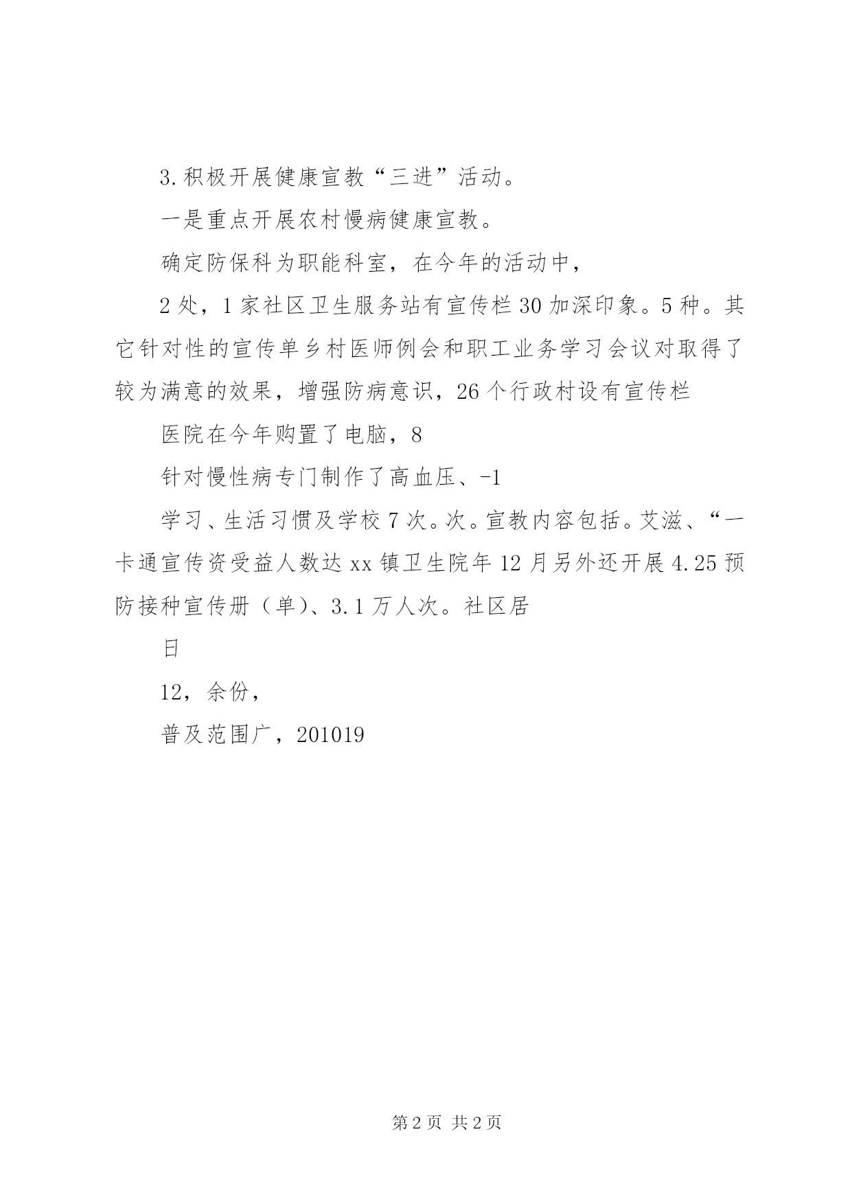 第PAGE\*Arabic\*MERGEFORMAT2页共NUMPAGES\*MERGEFORMAT2页公共卫生工作总结乡镇卫生院2010年健康教育工作总结根据上级卫生行政部门对今年农村健康宣教的精神,院领导高度重视,制定完善的工作计划,投入部分经费,成立领导小组,由副院长分管负责,布置任务,医疗队伍进行业务培训学习,开展针对性健康宣教活动,善辖区居民生活环境,差距,促进农村经济发展作出巨大贡献。一、健康宣教阵地建设概况xx内设置专门健康宣教栏处,30二、村(社区)健康宣教主要作法充分利用卫生网络和责任医师队伍对辖区内的村居、媒体健康讲座,面对面个人健康咨询、广播、黑板报、宣传栏、分发健康宣教资料等多种形式,开展针对性的健康宣教活动。1.加强健康宣教队伍的建设配合上级部门深入村(社区)开展面对面的多媒体健康宣教,卫生室责任医生组成的慢性病健康咨询和健康干预队伍。2.加大健康宣教专项经费投入。为了今年的健康宣教工作真正起到能为辖区居民增强各种卫生知识,各一台,慢性病、传染病防治和针对健康生活及针对学校、企业的健康宣教幻灯片10种。3.积极开展健康宣教“三进”活动。一是重点开展农村慢病健康宣教。确定防保科为职能科室,在今年的活动中,2处,1家社区卫生服务站有宣传栏30加深印象。5种。其它针对性的宣传单乡村医师例会和职工业务学习会议对取得了较为满意的效果,增强防病意识,26个行政村设有宣传栏医院在今年购置了电脑,8针对慢性病专门制作了高血压、-1学习、生活习惯及学校7次。次。宣教内容包括。艾滋、“一卡通宣传资受益人数达xx镇卫生院年12月另外还开展4.25预防接种宣传册(单)、3.1万人次。社区居日12,余份,普及范围广,201019