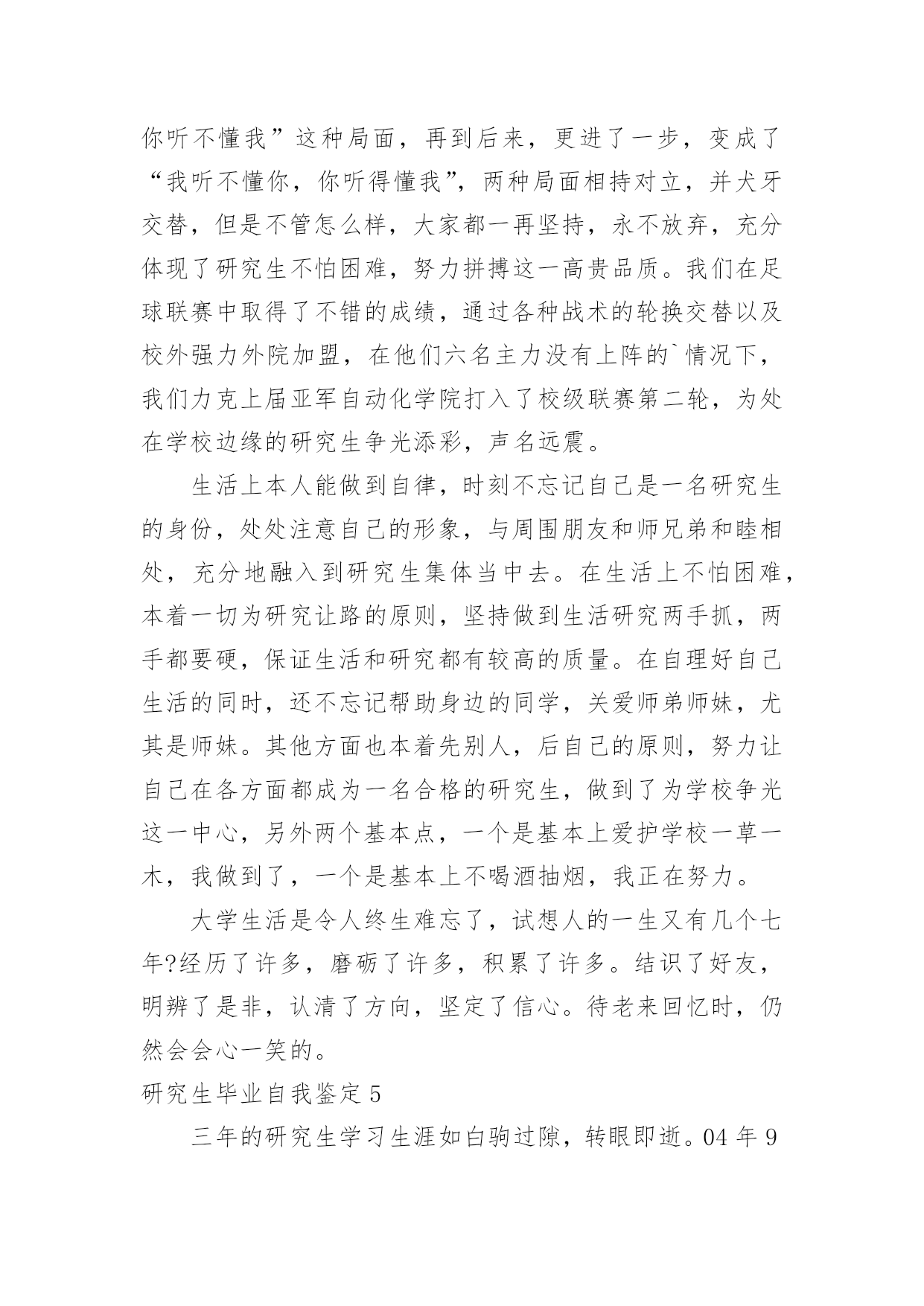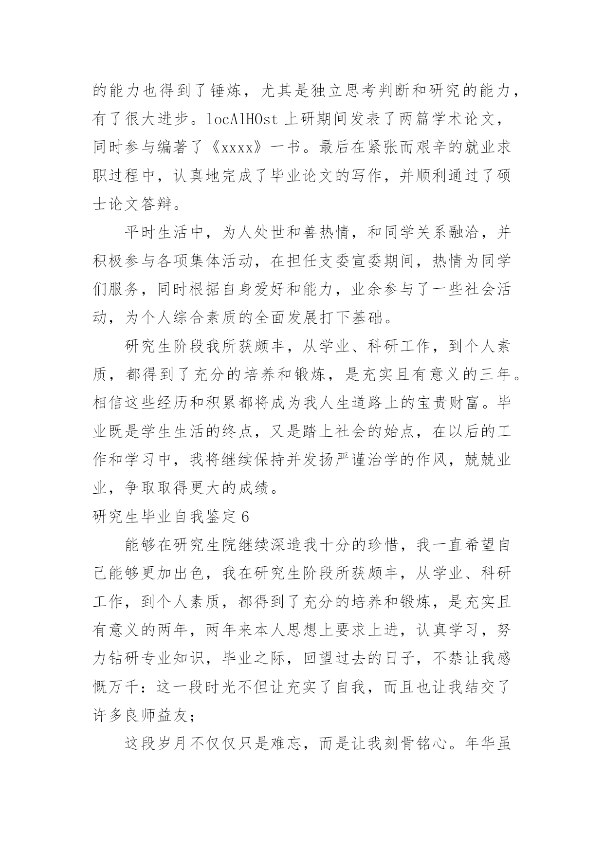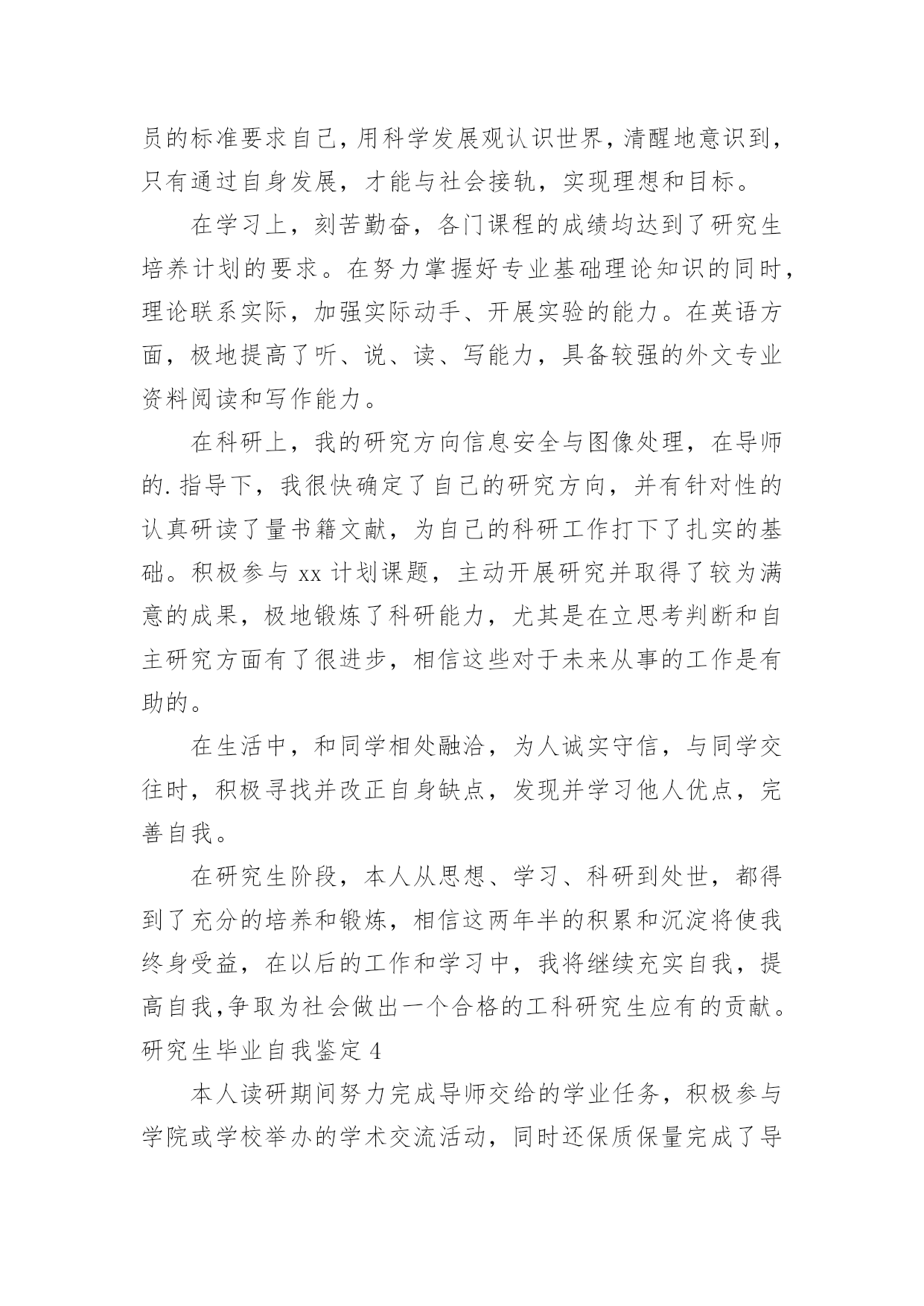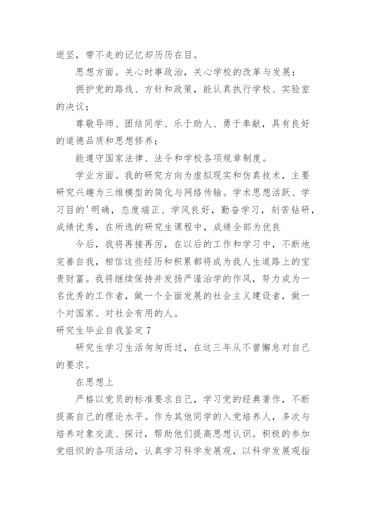 研究生毕业自我鉴定研究生毕业自我鉴定(15篇)正常来讲,自我鉴定即为自我总结,它可以给我们下一阶段的学习生活做指导,我想我们需要写一份自我鉴定了吧。但是自我鉴定有什么要求呢?下面是小编帮大家整理的研究生毕业自我鉴定,希望对大家有所帮助。研究生毕业自我鉴定1时间如白驹过隙,三年的研究生生活转迅即失。在毕业之际,回首这三年走过的路,收获颇多,总的说起来有以下几点:在政治上、思想上我一直积极要求进步。我是在xx年荣地成为了一名预备党员,在进入华南农业大学后,通过本党支部同志的影响,带动,帮助,思想上有了更大的进步,并加深了我对建设有中国特色的社会主义理论和党的基本路线深刻的认识,进一步的树立了坚定的共产主义信念。经过党组织1年预备期的考察,于xx年年5月如期转为正式党员。在成为一名党员后我时刻牢记自己是一名党员,处处以身作则,以一名合格党员的'要求严格规范自己的言行举止。自愿缴纳特殊党费,贡献出自己的一份绵薄之力。在学习上,文化课的学习使我对本专业有了更深刻、更准确的认识;查阅相关的文献和资料使我对专业的相关进展有了更加清晰的了解;在不断的学习中,积累了知识和经验;在平常的实验中,提高了动手技能;在导师的指导下,积极参与各项教学科研活动,在课题的研究过程中,对相关的领域有了全面而具体的认知。专业课程的学习上,根据自身研究方向的要求,有针对性的认真研读了有关核心课程,为自己的科研工作打下扎实基础;并涉猎了一部分其他课程,开阔视野,对本人研究方向的应用背景以及整个学科的结构有了宏观的认识。在英语学习方面,通过了国家英语六级考试,具备了较强的英语听说能力。在学习和科研工作之余,我还热心社会工作,积极为同学服务。上研究生后我主动承担起临时班长的职务,在新生入学的一系列工作中充分发挥自己“老生”的优势,热情周到地为同学服务。尽管学业和科研任务繁重,但为了配合院学生工作组老师做好学生工作,我服从组织安排,在团学联中担任学生工作助理。高度的责任心和使命感促使我在工作中勇挑重担,坚决地执行党的教育方针,认真完成好每一项工作任务,并注意在实践中学习、提高。在生活中,我积极参加各项集体活动,同学之间和睦相处,关系融洽。平常注意锻炼身体,参加丰富多彩的各种体育活动,如篮球,乒乓球等。保持朴素的生活作风,注意节俭,抵制各种浪费行为。提高自身修养,从小事做起严格要求自己。上面主要是我在过去三年的学习、工作和生活中的收获和今后要继续发扬的优点。当然,我也存在一些不足之处。在以后的人生路上我会更加明确自己的目标,以全新的面貌面向社会、迎接未来,迈好人生新旅程的第一步。在硕士研究生期间,无论是在思想上、个人素质上还是在学业上我都有了长足的进步,是充实且有意义的三年。我相信在这三年当中所得到的培养和锻炼将是我人生当中的一笔不可多的财富。在今后的工作当中我将继续保持并发扬这些优点,以取得更大的成绩。研究生毕业自我鉴定2该同学政治立场坚定,思想纯洁,有一定奉献精神,党员的`先锋模范作用发挥比较好。能自觉遵守《学生行为准则》和学校的各项规章制度,尊敬师长,团结、关心同学,热爱集体,积极参加班级集体活动;学习目的明确,态度端正,勤奋刻苦,成绩优良;为人诚实,做事认真负责,同学中有较好口碑。不足是工学矛盾处理不够好,学习成绩需进一步提高。希望以后能发扬成绩,克服不足,争取更大进步。研究生毕业自我鉴定3自20xx年xx月入校以来,这两年半的研究生生活充实而有意义,本人觉得成长迅速,收获颇丰,现做自我鉴定如下:在思想上,认真学习,关心时政,坚决拥护党的路线、方针和政策。虽然组织上未入党,但在思想上时刻以合格党员的标准要求自己,用科学发展观认识世界,清醒地意识到,只有通过自身发展,才能与社会接轨,实现理想和目标。在学习上,刻苦勤奋,各门课程的成绩均达到了研究生培养计划的要求。在努力掌握好专业基础理论知识的同时,理论联系实际,加强实际动手、开展实验的能力。在英语方面,极地提高了听、说、读、写能力,具备较强的外文专业资料阅读和写作能力。在科研上,我的研究方向信息安全与图像处理,在导师的.指导下,我很快确定了自己的研究方向,并有针对性的认真研读了量书籍文献,为自己的科研工作打下了扎实的基础。积极参与xx计划课题,主动开展研究并取得了较为满意的成果,极地锻炼了科研能力,尤其是在立思考判断和自主研究方面有了很进步,相信这些对于未来从事的工作是有助的。在生活中,和同学相处融洽,为人诚实守信,与同学交往时,积极寻找并改正自身缺点,发现并学习他人优点,完善自我。在研究生阶段,本人从思想、学习、科研到处世,都得到了充分的培养和锻炼,相信这两年半的积累和沉淀将使我终身受益,在以后的工作和学习中,我将继续充实自我,提高自我,争取为社会做出一个合格的工科研究生应有的贡献。研究生毕业自我鉴定4本人读研期