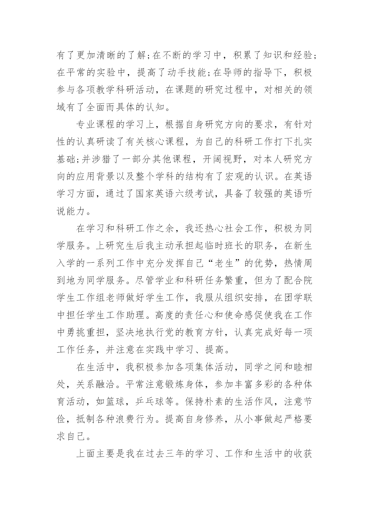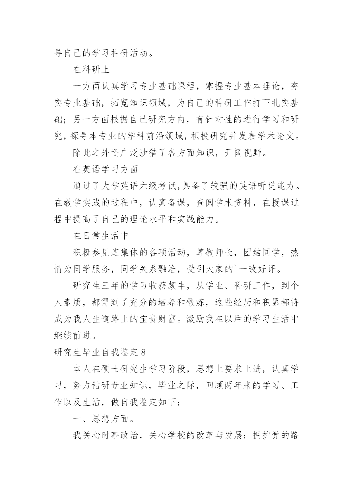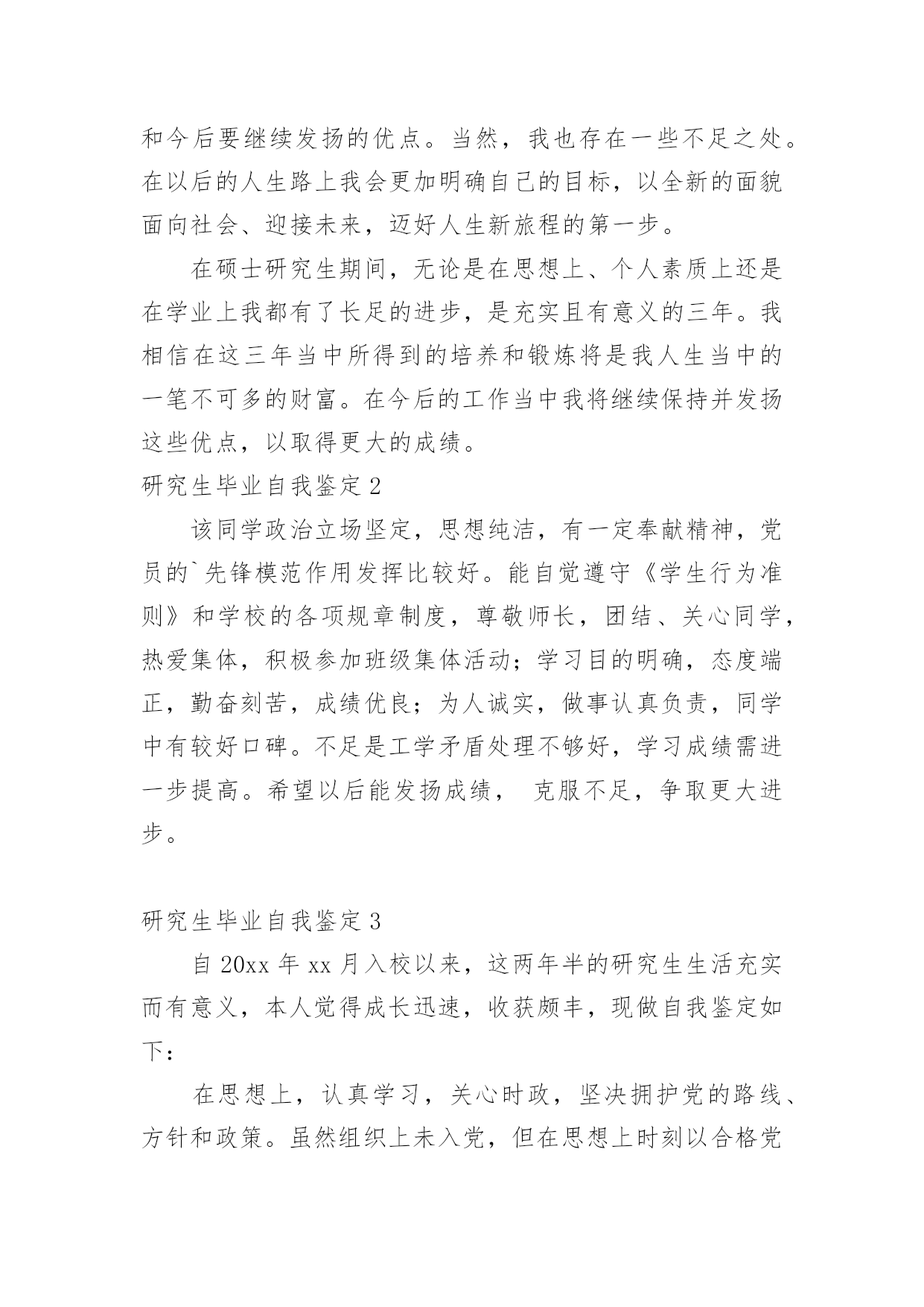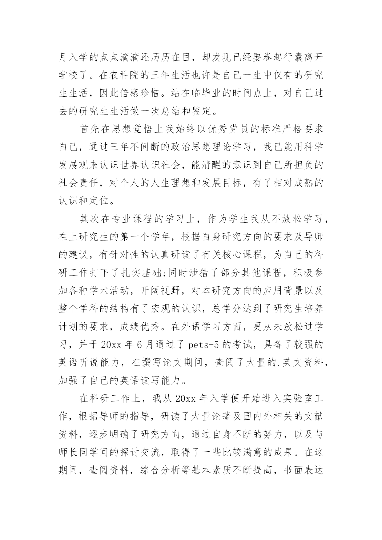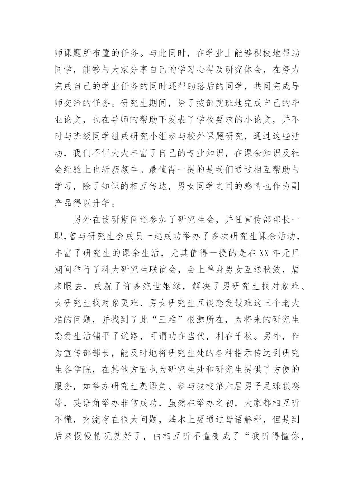 研究生毕业自我鉴定研究生毕业自我鉴定(15篇)正常来讲,自我鉴定即为自我总结,它可以给我们下一阶段的学习生活做指导,我想我们需要写一份自我鉴定了吧。但是自我鉴定有什么要求呢?下面是小编帮大家整理的研究生毕业自我鉴定,希望对大家有所帮助。研究生毕业自我鉴定1时间如白驹过隙,三年的研究生生活转迅即失。在毕业之际,回首这三年走过的路,收获颇多,总的说起来有以下几点:在政治上、思想上我一直积极要求进步。我是在xx年荣地成为了一名预备党员,在进入华南农业大学后,通过本党支部同志的影响,带动,帮助,思想上有了更大的进步,并加深了我对建设有中国特色的社会主义理论和党的基本路线深刻的认识,进一步的树立了坚定的共产主义信念。经过党组织1年预备期的考察,于xx年年5月如期转为正式党员。在成为一名党员后我时刻牢记自己是一名党员,处处以身作则,以一名合格党员的'要求严格规范自己的言行举止。自愿缴纳特殊党费,贡献出自己的一份绵薄之力。在学习上,文化课的学习使我对本专业有了更深刻、更准确的认识;查阅相关的文献和资料使我对专业的相关进展有了更加清晰的了解;在不断的学习中,积累了知识和经验;在平常的实验中,提高了动手技能;在导师的指导下,积极参与各项教学科研活动,在课题的研究过程中,对相关的领域有了全面而具体的认知。专业课程的学习上,根据自身研究方向的要求,有针对性的认真研读了有关核心课程,为自己的科研工作打下扎实基础;并涉猎了一部分其他课程,开阔视野,对本人研究方向的应用背景以及整个学科的结构有了宏观的认识。在英语学习方面,通过了国家英语六级考试,具备了较强的英语听说能力。在学习和科研工作之余,我还热心社会工作,积极为同学服务。上研究生后我主动承担起临时班长的职务,在新生入学的一系列工作中充分发挥自己“老生”的优势,热情周到地为同学服务。尽管学业和科研任务繁重,但为了配合院学生工作组老师做好学生工作,我服从组织安排,在团学联中担任学生工作助理。高度的责任心和使命感促使我在工作中勇挑重担,坚决地执行党的教育方针,认真完成好每一项工作任务,并注意在实践中学习、提高。在生活中,我积极参加各项集体活动,同学之间和睦相处,关系融洽。平常注意锻炼身体,参加丰富多彩的各种体育活动,如篮球,乒乓球等。保持朴素的生活作风,注意节俭,抵制各种浪费行为。提高自身修养,从小事做起严格要求自己。上面主要是我在过去三年的学习、工作和生活中的收获和今后要继续发扬的优点。当然,我也存在一些不足之处。在以后的人生路上我会更加明确自己的目标,以全新的面貌面向社会、迎接未来,迈好人生新旅程的第一步。在硕士研究生期间,无论是在思想上、个人素质上还是在学业上我都有了长足的进步,是充实且有意义的三年。我相信在这三年当中所得到的培养和锻炼将是我人生当中的一笔不可多的财富。在今后的工作当中我将继续保持并发扬这些优点,以取得更大的成绩。研究生毕业自我鉴定2该同学政治立场坚定,思想纯洁,有一定奉献精神,党员的`先锋模范作用发挥比较好。能自觉遵守《学生行为准则》和学校的各项规章制度,尊敬师长,团结、关心同学,热爱集体,积极参加班级集体活动;学习目的明确,态度端正,勤奋刻苦,成绩优良;为人诚实,做事认真负责,同学中有较好口碑。不足是工学矛盾处理不够好,学习成绩需进一步提高。希望以后能发扬成绩,克服不足,争取更大进步。研究生毕业自我鉴定3自20xx年xx月入校以来,这两年半的研究生生活充实而有意义,本人觉得成长迅速,收获颇丰,现做自我鉴定如下:在思想上,认真学习,关心时政,坚决拥护党的路线、方针和政策。虽然组织上未入党,但在思想上时刻以合格党员的标准要求自己,用科学发展观认识世界,清醒地意识到,只有通过自身发展,才能与社会接轨,实现理想和目标。在学习上,刻苦勤奋,各门课程的成绩均达到了研究生培养计划的要求。在努力掌握好专业基础理论知识的同时,理论联系实际,加强实际动手、开展实验的能力。在英语方面,极地提高了听、说、读、写能力,具备较强的外文专业资料阅读和写作能力。在科研上,我的研究方向信息安全与图像处理,在导师的.指导下,我很快确定了自己的研究方向,并有针对性的认真研读了量书籍文献,为自己的科研工作打下了扎实的基础。积极参与xx计划课题,主动开展研究并取得了较为满意的成果,极地锻炼了科研能力,尤其是在立思考判断和自主研究方面有了很进步,相信这些对于未来从事的工作是有助的。在生活中,和同学相处融洽,为人诚实守信,与同学交往时,积极寻找并改正自身缺点,发现并学习他人优点,完善自我。在研究生阶段,本人从思想、学习、科研到处世,都得到了充分的培养和锻炼,相信这两年半的积累和沉淀将使我终身受益,在以后的工作和学习中,我将继续充实自我,提高自我,争取为社会做出一个合格的工科研究生应有的贡献。研究生毕业自我鉴定4本人读研期