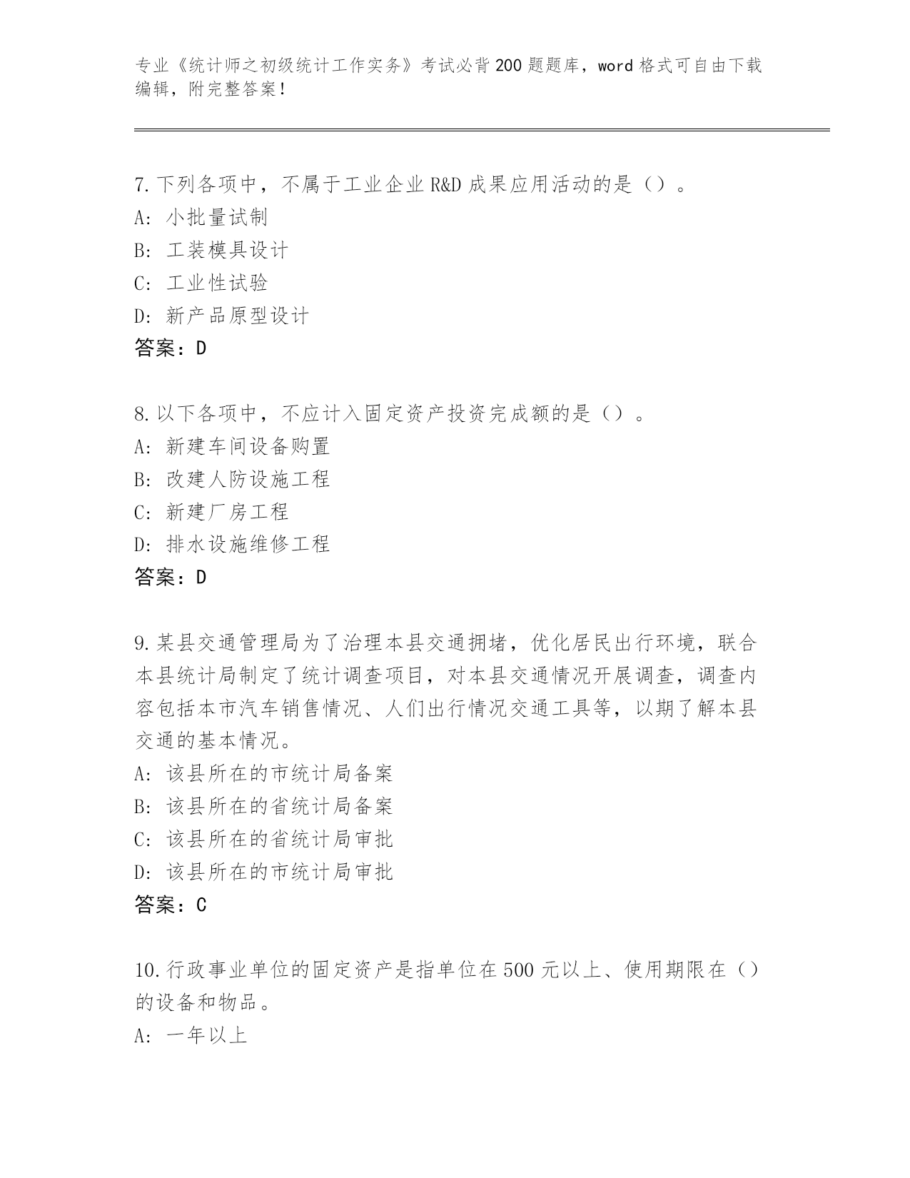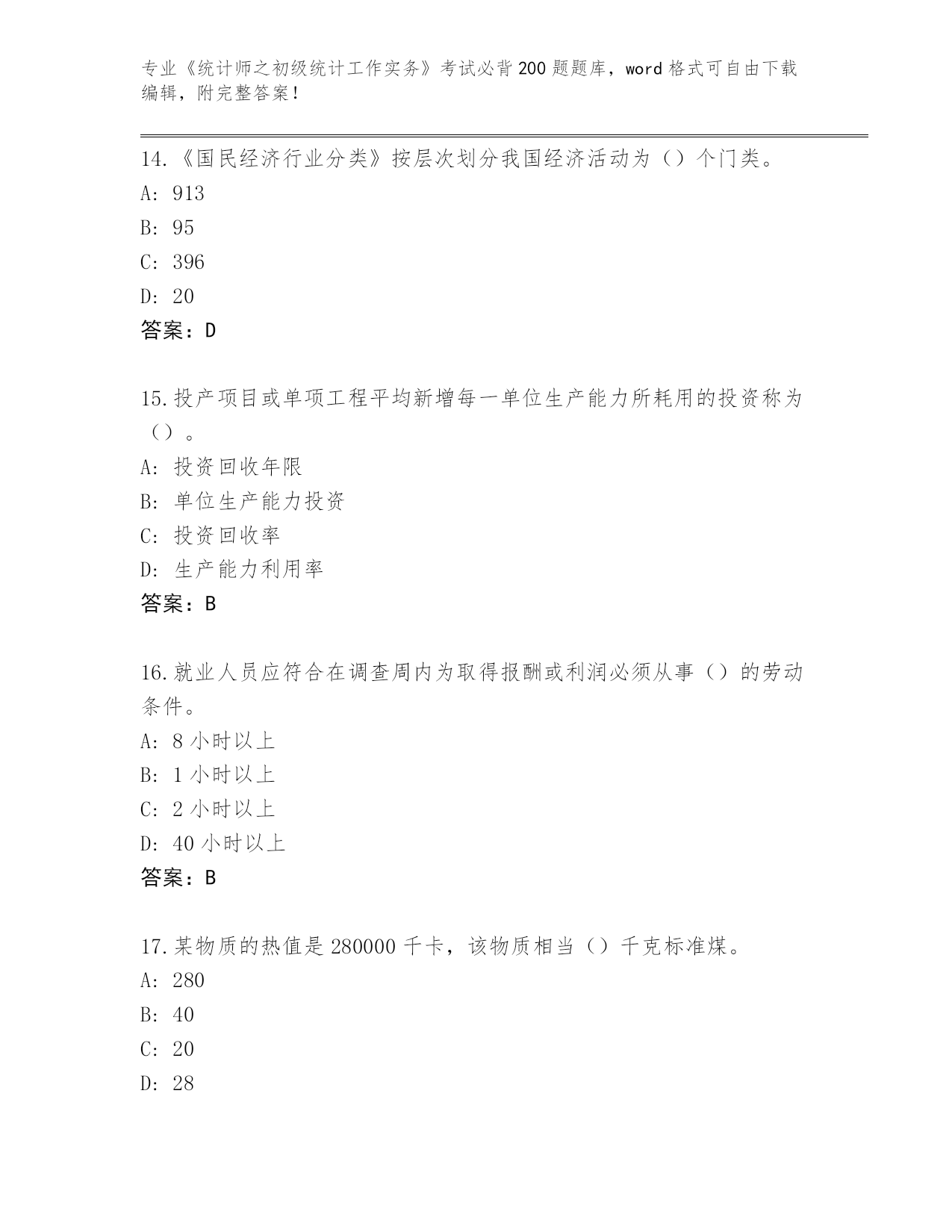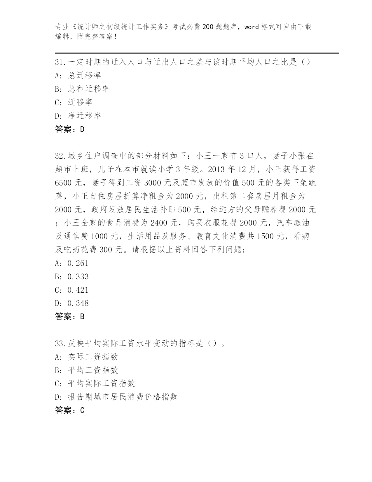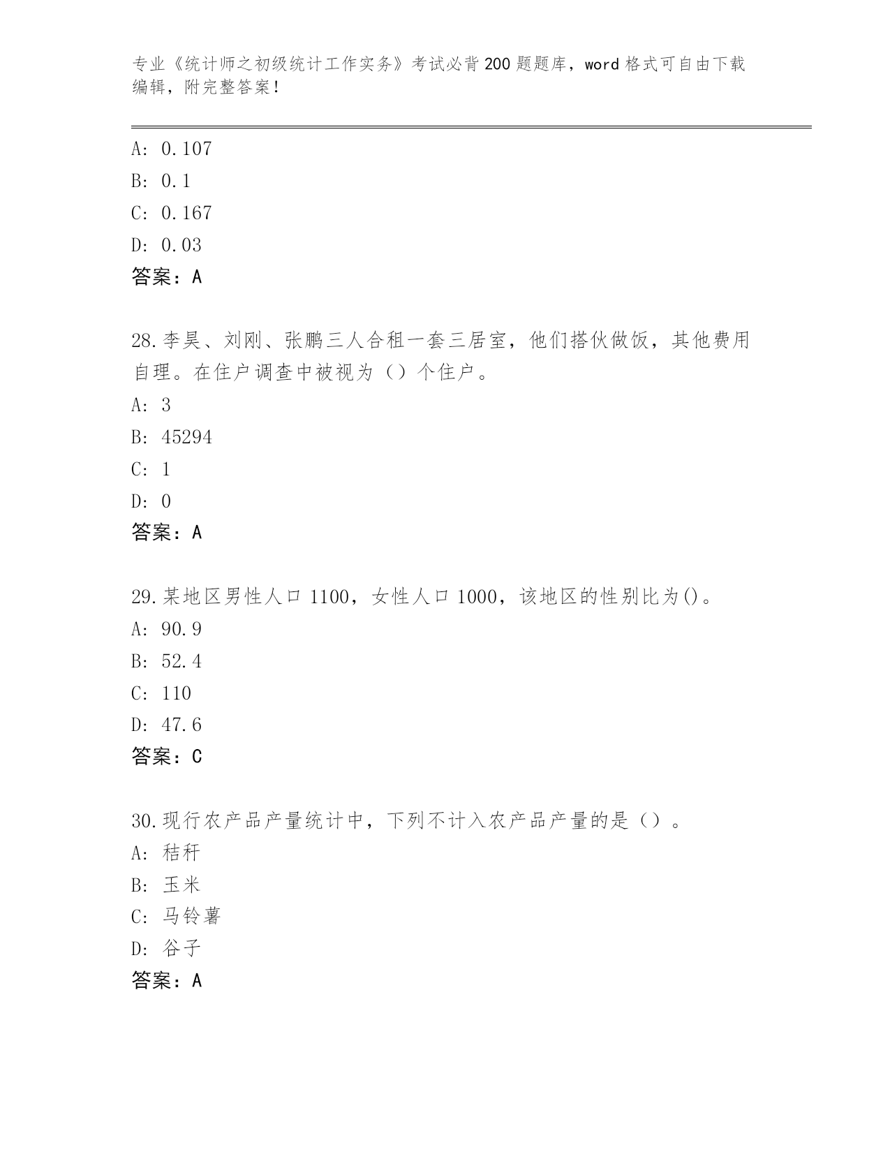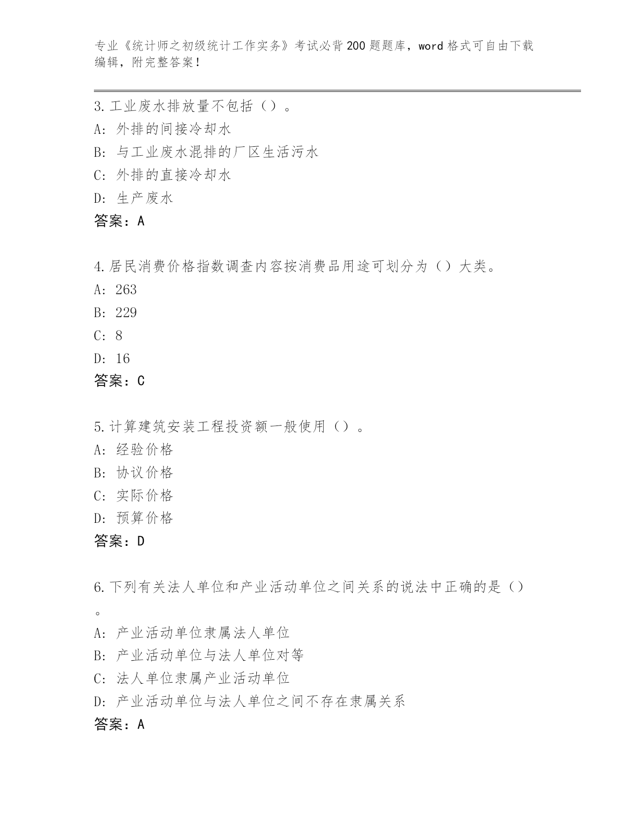 2024年安徽省泾县《统计师之初级统计工作实务》资格考试必背200题(必刷)