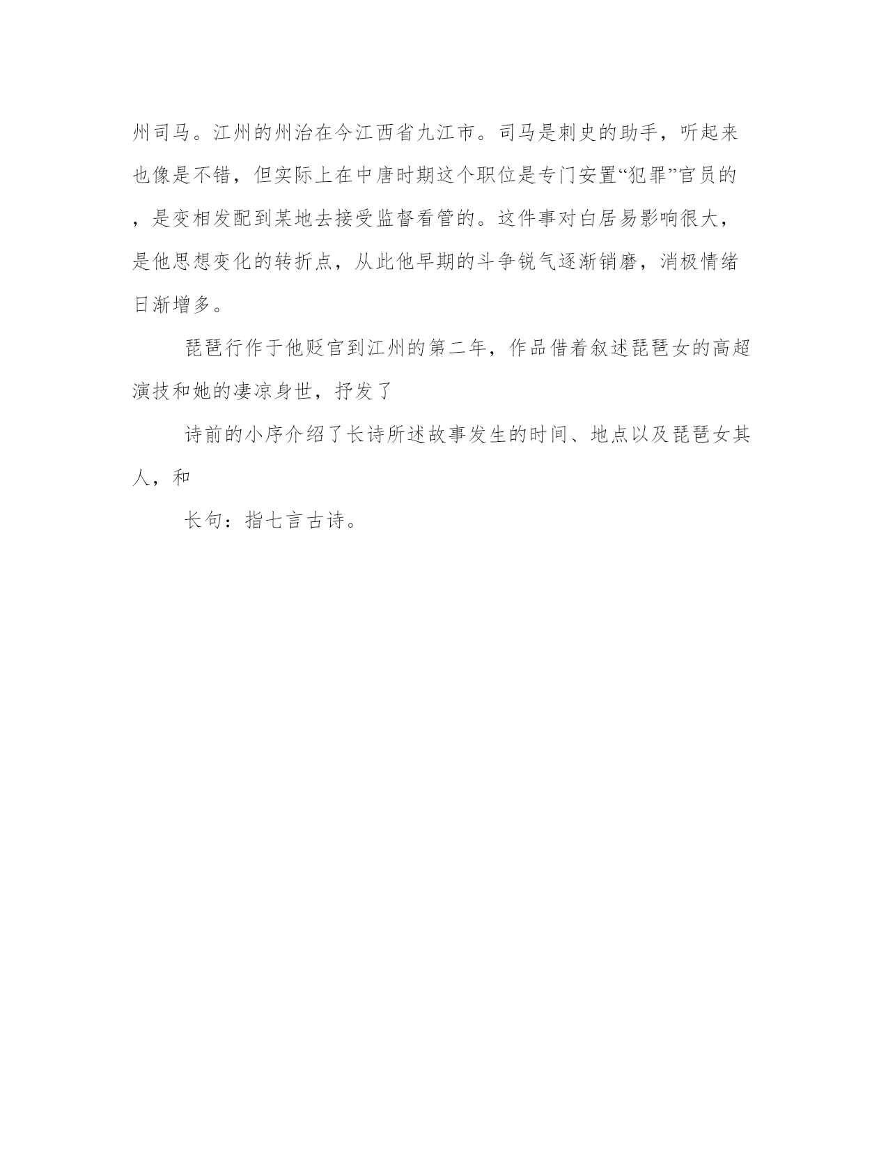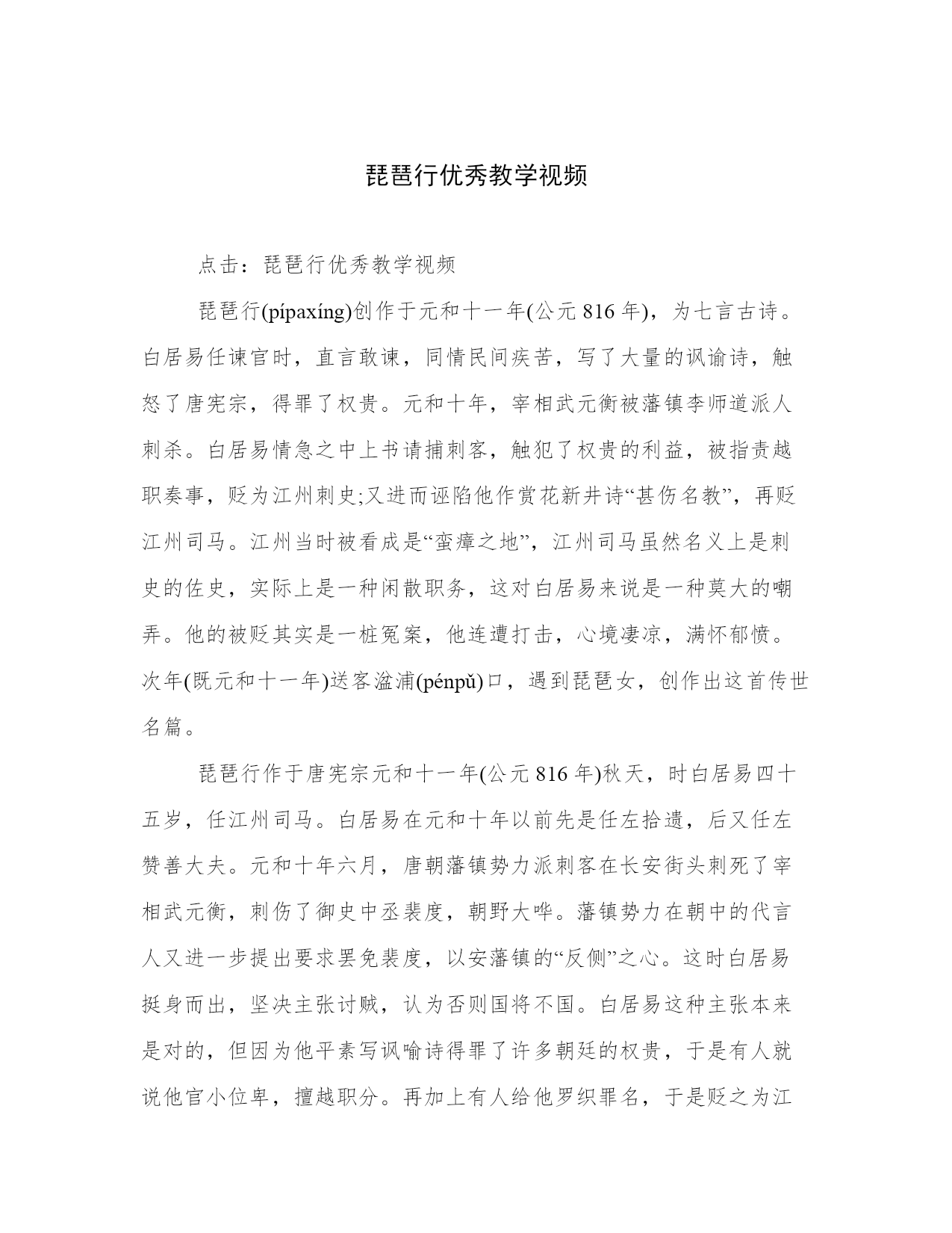 琵琶行优秀教学视频点击:琵琶行优秀教学视频琵琶行(pípaxíng)创作于元和十一年(公元816年),为七言古诗。白居易任谏官时,直言敢谏,同情民间疾苦,写了大量的讽谕诗,触怒了唐宪宗,得罪了权贵。元和十年,宰相武元衡被藩镇李师道派人刺杀。白居易情急之中上书请捕刺客,触犯了权贵的利益,被指责越职奏事,贬为江州刺史;又进而诬陷他作赏花新井诗“甚伤名教”,再贬江州司马。江州当时被看成是“蛮瘴之地”,江州司马虽然名义上是刺史的佐史,实际上是一种闲散职务,这对白居易来说是一种莫大的嘲弄。他的被贬其实是一桩冤案,他连遭打击,心境凄凉,满怀郁愤。次年(既元和十一年)送客湓浦(pénpǔ)口,遇到琵琶女,创作出这首传世名篇。琵琶行作于唐宪宗元和十一年(公元816年)秋天,时白居易四十五岁,任江州司马。白居易在元和十年以前先是任左拾遗,后又任左赞善大夫。元和十年六月,唐朝藩镇势力派刺客在长安街头刺死了宰相武元衡,刺伤了御史中丞裴度,朝野大哗。藩镇势力在朝中的代言人又进一步提出要求罢免裴度,以安藩镇的“反侧”之心。这时白居易挺身而出,坚决主张讨贼,认为否则国将不国。白居易这种主张本来是对的,但因为他平素写讽喻诗得罪了许多朝廷的权贵,于是有人就说他官小位卑,擅越职分。再加上有人给他罗织罪名,于是贬之为江州司马。江州的州治在今江西省九江市。司马是刺史的助手,听起来也像是不错,但实际上在中唐时期这个职位是专门安置“犯罪”官员的,是变相发配到某地去接受监督看管的。这件事对白居易影响很大,是他思想变化的转折点,从此他早期的斗争锐气逐渐销磨,消极情绪日渐增多。琵琶行作于他贬官到江州的第二年,作品借着叙述琵琶女的高超演技和她的凄凉身世,抒发了诗前的小序介绍了长诗所述故事发生的时间、地点以及琵琶女其人,和长句:指七言古诗。