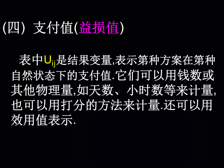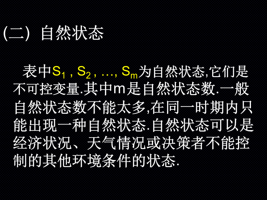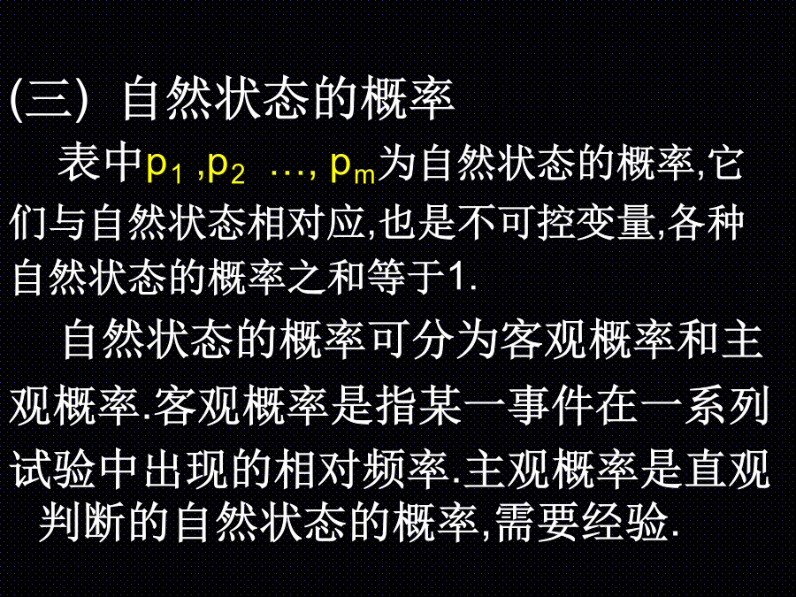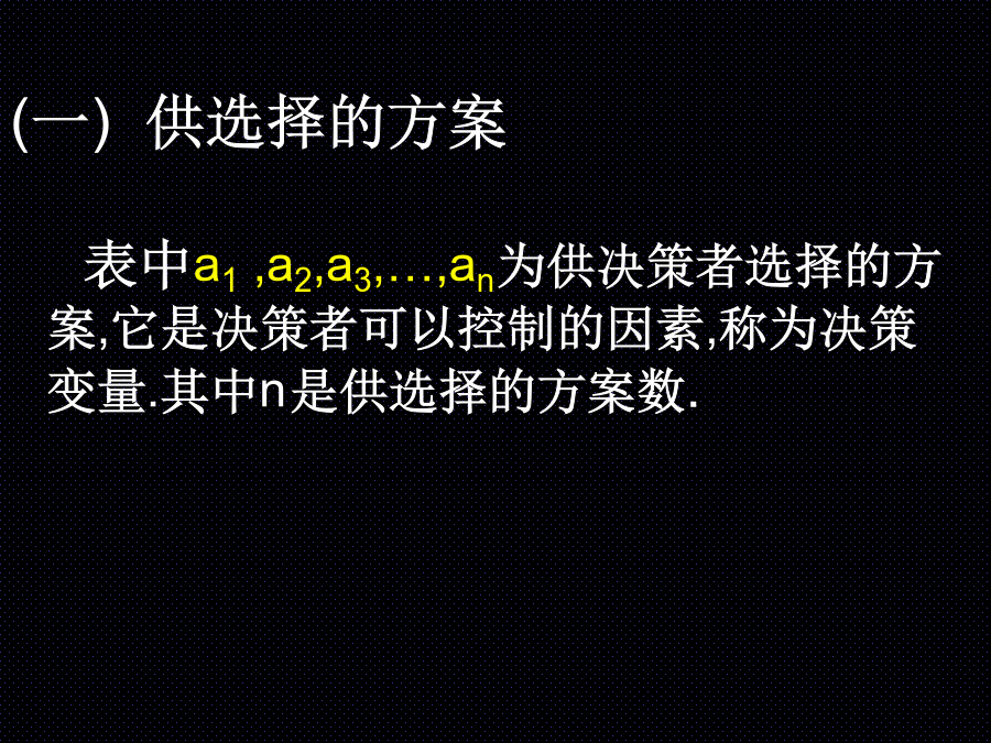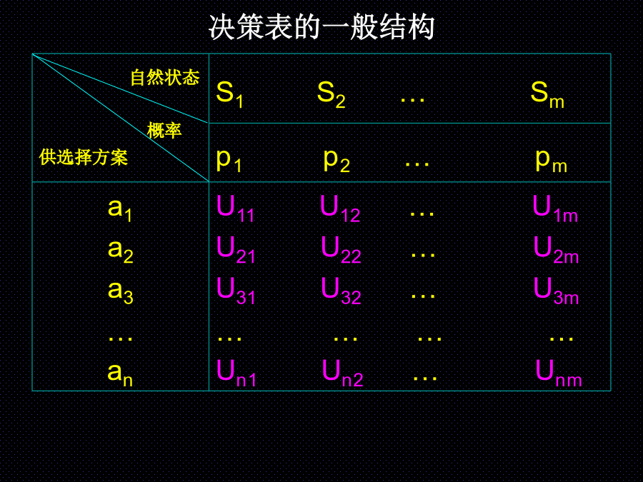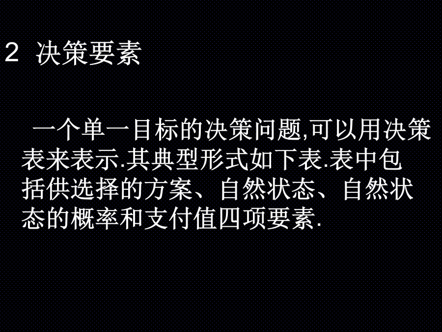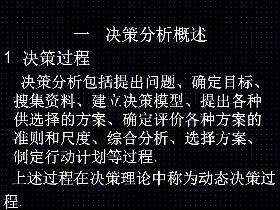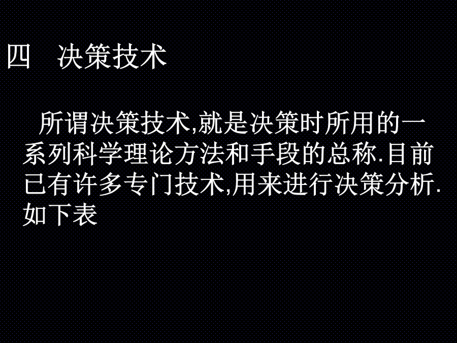 第三章决策所谓决策是指从系统整体出发,为了实现特定目标,在占有一定信息和经验的基础上,借助一定的理论、方法和工具,对几个可供选择的方案,进行科学的分析和正确的计算与判断,确定指导未来行动的方案、方针和策略.一决策分析概述1决策过程决策分析包括提出问题、确定目标、搜集资料、建立决策模型、提出各种供选择的方案、确定评价各种方案的准则和尺度、综合分析、选择方案、制定行动计划等过程.上述过程在决策理论中称为动态决策过程.2决策要素一个单一目标的决策问题,可以用决策表来表示.其典型形式如下表.表中包括供选择的方案、自然状态、自然状态的概率和支付值四项要素.(一)供选择的方案表中a1,a2,a3,…,an为供决策者选择的方案,它是决策者可以控制的因素,称为决策变量.其中n是供选择的方案数.(二)自然状态表中S1,S2,…,Sm为自然状态,它们是不可控变量.其中m是自然状态数.一般自然状态数不能太多,在同一时期内只能出现一种自然状态.自然状态可以是经济状况、天气情况或决策者不能控制的其他环境条件的状态.(三)自然状态的概率表中p1,p2…,pm为自然状态的概率,它们与自然状态相对应,也是不可控变量,各种自然状态的概率之和等于1.自然状态的概率可分为客观概率和主观概率.客观概率是指某一事件在一系列试验中出现的相对频率.主观概率是直观判断的自然状态的概率,需要经验.(四)支付值(益损值)表中Uij是结果变量,表示第种方案在第种自然状态下的支付值.它们可以用钱数或其他物理量,如天数、小时数等来计量,也可以用打分的方法来计量.还可以用效用值表示.3决策状态根据决策者所掌握的状态的不同可以把决策问题分为三种类型:确定型、风险型和不确定型.四决策技术所谓决策技术,就是决策时所用的一系列科学理论方法和手段的总称.目前已有许多专门技术,用来进行决策分析.如下表管理科学技术二确定型决策确定型决策的特点:第一,具有一个确定的自然状态;第二,具有决策者希望达到的明确目标;第三,存在两个以上的备选方案;第四,可以计算出不同方案在确定状态下的支付值.例有三块面积相同而土质不同的土地,计划种植三种不同的作物,预计每种作物在每种土地上种植时,每年可获得的纯收益如下表.问怎样安排种植计划可获得总的纯收益最大(单位:百元).种植计划决策表