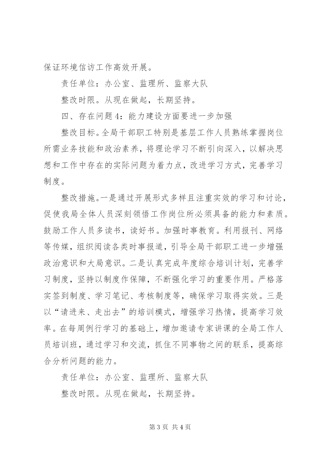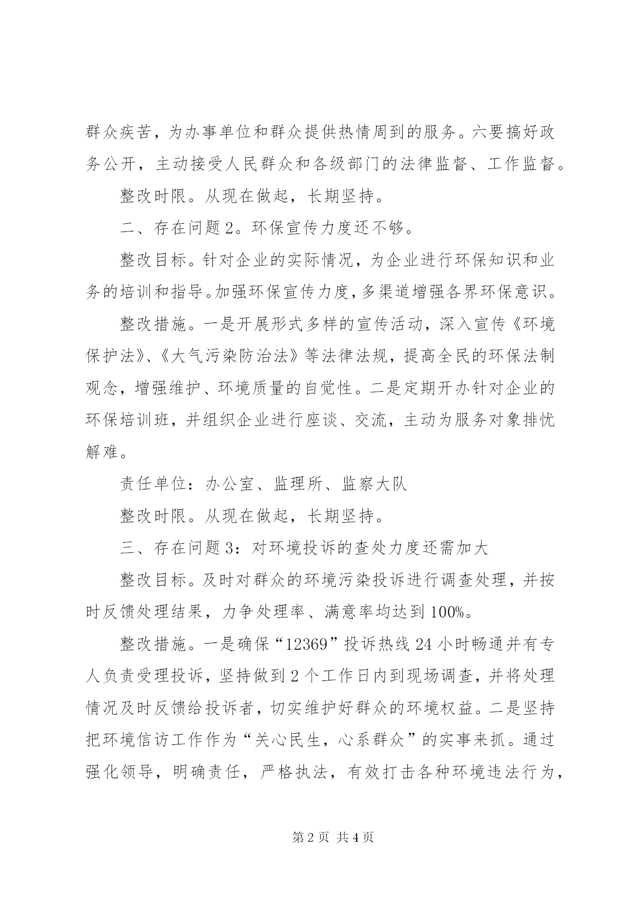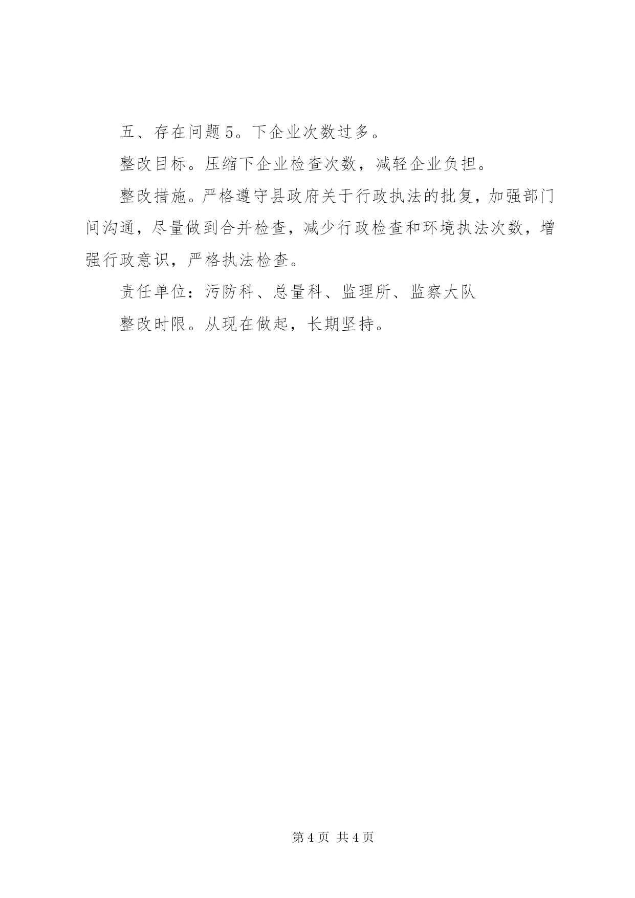 第PAGE\*Arabic\*MERGEFORMAT4页共NUMPAGES\*MERGEFORMAT4页环保局作风效能治理方案按照县委、县政府“作风大转变、效能大提速、环境大优化”集中整治活动的统一部署和安排,我局“三大”整治活动现已进入自我整改,巩固提高阶段,我局在学习动员和查摆问题两个工作阶段的基础上,对照自查出的突出问题,针对群众提出的意见和建议,结合实际工作,对整改工作进行了认真的分析。按照着力打造出“一流的作风,一流的效能,一流的环境”的目标要求,制定如下整改方案:一、存在问题1:排污费征收和行政执法工作不够细致具体表现。对困难企业关心不够,在排污费征收和行政执法方面未能予以服务对象完整的解释和细致的帮助,造成某些企业和个体对我们的工作存在疑惑和误解。整改目标。劳固树立服务意识和宗旨意识,增强责任感和使命感,深入企业、基层,做到热情服务、靠前服务、全程服务。整改措施。一要坚持为人民服务的宗旨,发扬群众路线的优良传统,努力为人民群众办好事。二要坚持依法行政,履行好环境保护、污染治理、环境监管和公共服务的职能。三要加强行政执法队伍建设,提高执法人员素质和依法能力。提升工作方法和工作技巧,掌握好工作的原则性和灵活性。四要做到规范执法、文明执法,克服、杜绝在工作中出现作风漂浮,工作方法简单粗暴,办事拖拉等现象。五要端正服务态度,倾听群众呼声,解决群众疾苦,为办事单位和群众提供热情周到的服务。六要搞好政务公开,主动接受人民群众和各级部门的法律监督、工作监督。整改时限。从现在做起,长期坚持。二、存在问题2。环保宣传力度还不够。整改目标。针对企业的实际情况,为企业进行环保知识和业务的培训和指导。加强环保宣传力度,多渠道增强各界环保意识。整改措施。一是开展形式多样的宣传活动,深入宣传《环境保护法》、《大气污染防治法》等法律法规,提高全民的环保法制观念,增强维护、环境质量的自觉性。二是定期开办针对企业的环保培训班,并组织企业进行座谈、交流,主动为服务对象排忧解难。责任单位:办公室、监理所、监察大队整改时限。从现在做起,长期坚持。三、存在问题3:对环境投诉的查处力度还需加大整改目标。及时对群众的环境污染投诉进行调查处理,并按时反馈处理结果,力争处理率、满意率均达到100%。整改措施。一是确保“12369”投诉热线24小时畅通并有专人负责受理投诉,坚持做到2个工作日内到现场调查,并将处理情况及时反馈给投诉者,切实维护好群众的环境权益。二是坚持把环境信访工作作为“关心民生,心系群众”的实事来抓。通过强化领导,明确责任,严格执法,有效打击各种环境违法行为,保证环境信访工作高效开展。责任单位:办公室、监理所、监察大队整改时限。从现在做起,长期坚持。四、存在问题4:能力建设方面要进一步加强整改目标。全局干部职工特别是基层工作人员熟练掌握岗位所需业务技能和政治素养,将理论学习不断引向深入,以解决思想和工作中存在的实际问题为着力点,改进学习方式,完善学习制度。整改措施。一是通过开展形式多样且注重实效的学习和讨论,促使我局全体人员深刻领悟工作岗位所必须具备的能力和素质。鼓励工作人员多读书,读好书。加强时事教育。利用报刊、网络等传媒,组织阅读各类时事报道,引导全局干部职工进一步增强政治意识和大局意识。二是认真完成年度综合培训计划,完善学习制度,坚持以制度作保障,不断强化学习的重要作用。严格落实签到制度、学习笔记、考核制度等,确保学习取得实效。三是以“请进来、走出去”的培训模式,增强学习热情,提高学习效率。在每周例行学习的基础上,增加邀请专家讲课的全局工作人员培训班,通过学习和交流,抓住不同事物之间的联系,提高综合分析问题的能力。责任单位:办公室、监理所、监察大队整改时限。从现在做起,长期坚持。五、存在问题5。下企业次数过多。整改目标。压缩下企业检查次数,减轻企业负担。整改措施。严格遵守县政府关于行政执法的批复,加强部门间沟通,尽量做到合并检查,减少行政检查和环境执法次数,增强行政意识,严格执法检查。责任单位:污防科、总量科、监理所、监察大队整改时限。从现在做起,长期坚持。