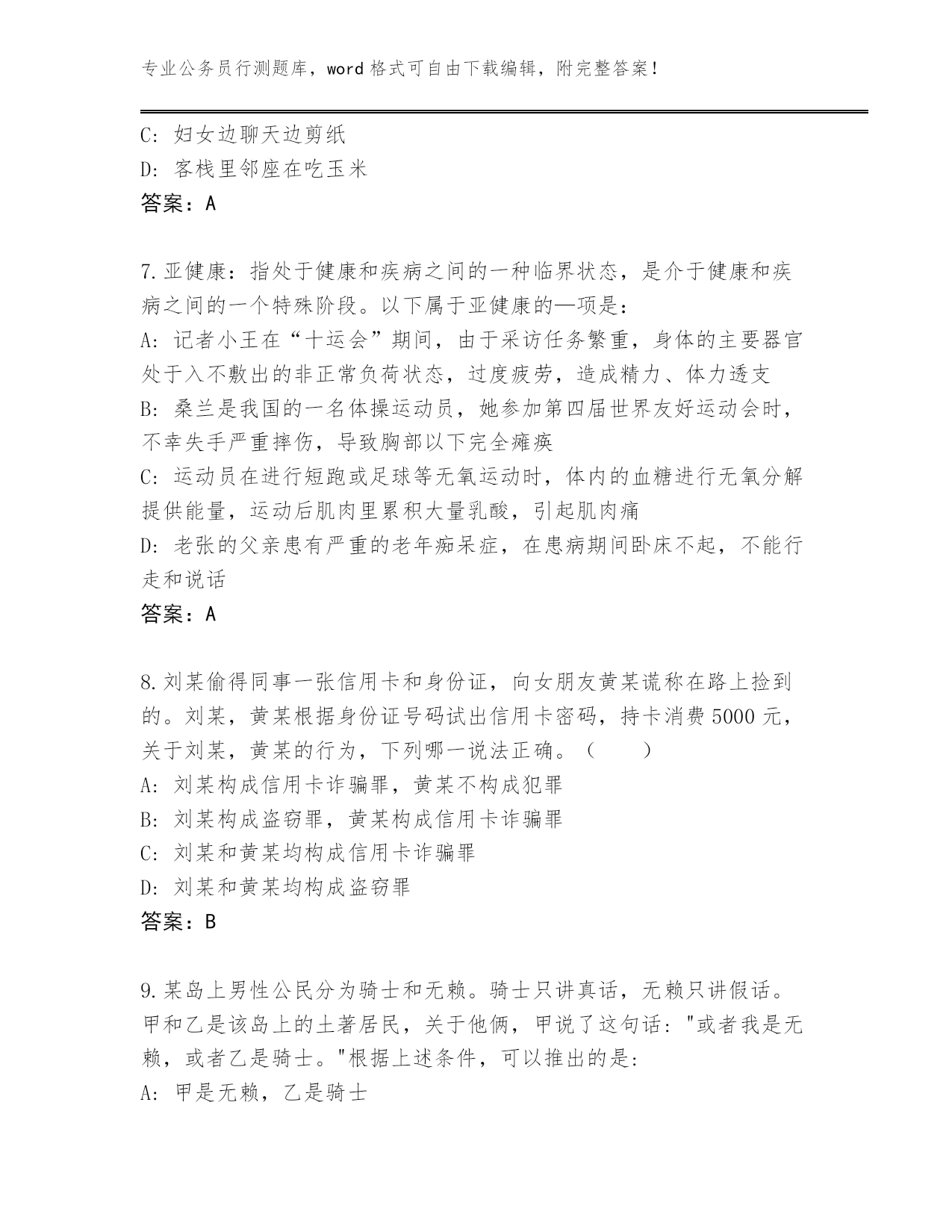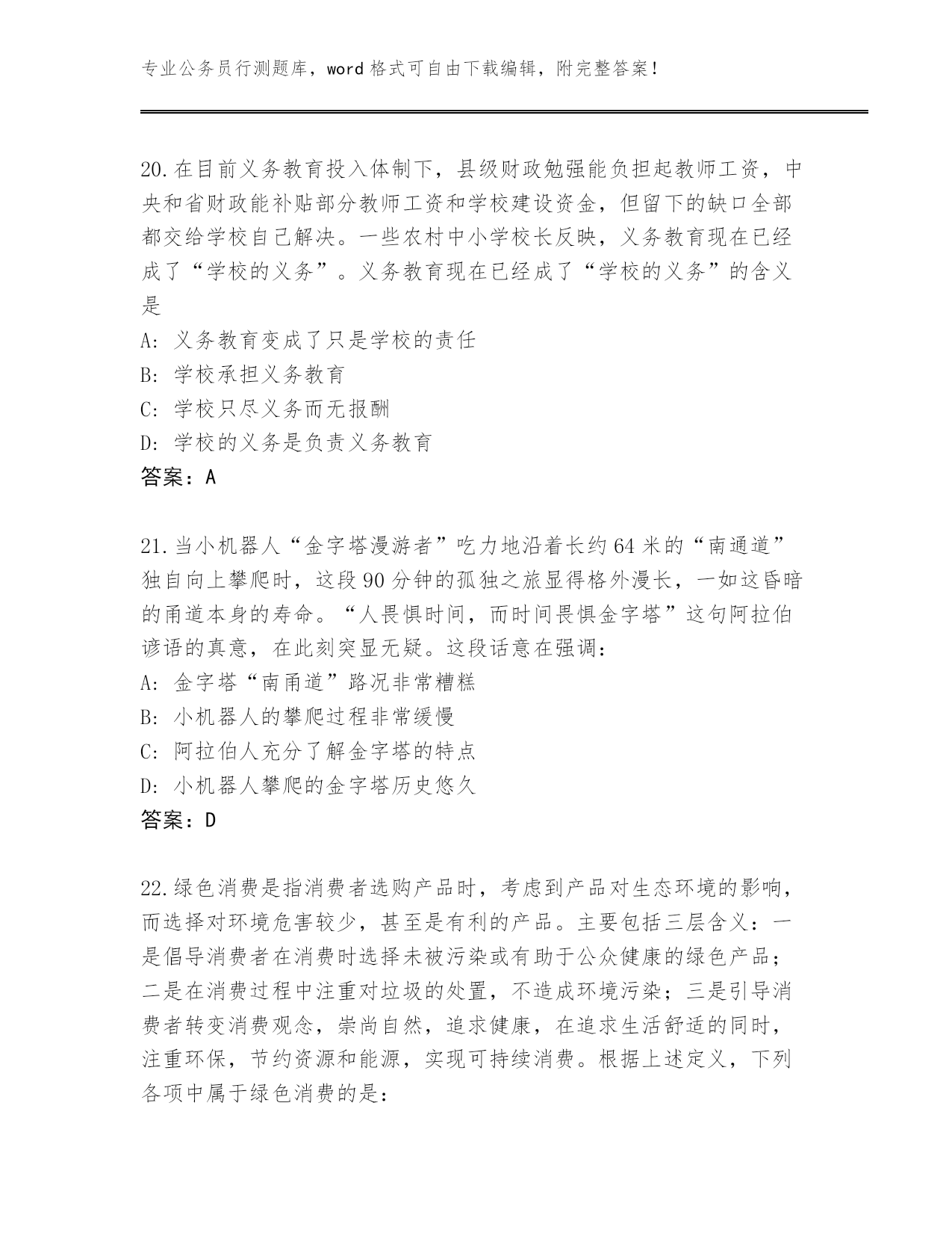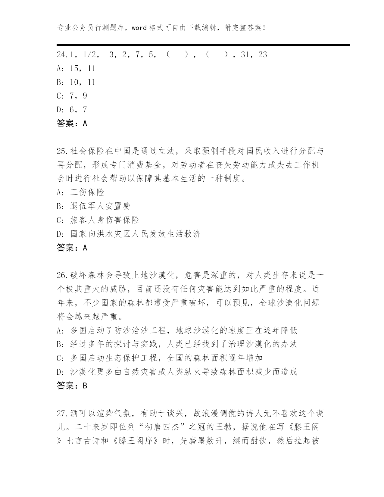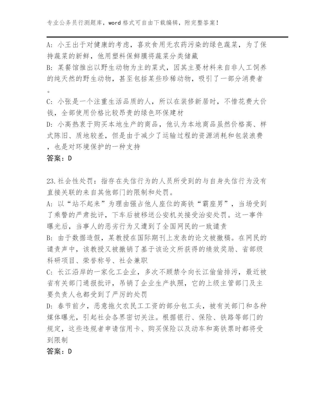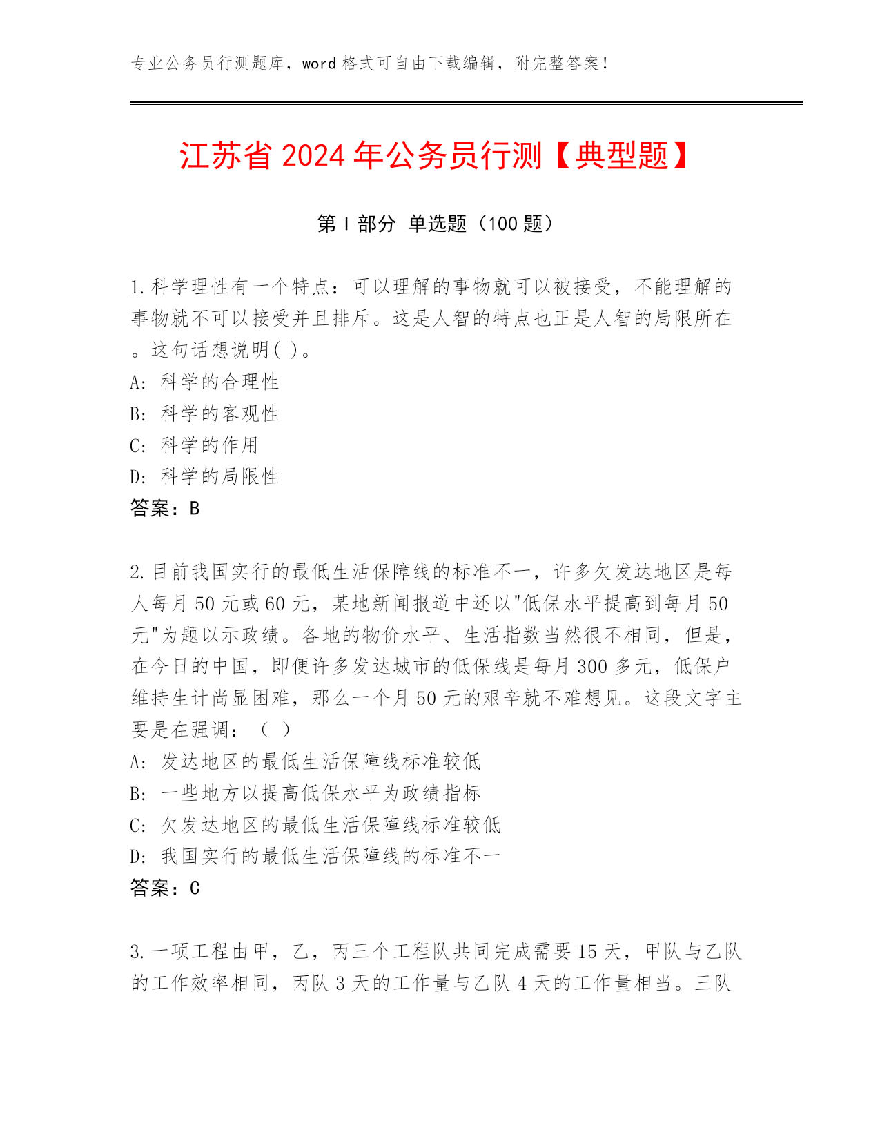专业公务员行测题库,word格式可自由下载编辑,附完整答案!江苏省2024年公务员行测【典型题】第I部分单选题(100题)1.科学理性有一个特点:可以理解的事物就可以被接受,不能理解的事物就不可以接受并且排斥。这是人智的特点也正是人智的局限所在。这句话想说明()。A:科学的合理性B:科学的客观性C:科学的作用D:科学的局限性答案:B2.目前我国实行的最低生活保障线的标准不一,许多欠发达地区是每人每月50元或60元,某地新闻报道中还以"低保水平提高到每月50元"为题以示政绩。各地的物价水平、生活指数当然很不相同,但是,在今日的中国,即便许多发达城市的低保线是每月300多元,低保户维持生计尚显困难,那么一个月50元的艰辛就不难想见。这段文字主要是在强调:()A:发达地区的最低生活保障线标准较低B:一些地方以提高低保水平为政绩指标C:欠发达地区的最低生活保障线标准较低D:我国实行的最低生活保障线的标准不一答案:C3.一项工程由甲,乙,丙三个工程队共同完成需要15天,甲队与乙队的工作效率相同,丙队3天的工作量与乙队4天的工作量相当。三队同时开工2天后,丙队被调往另一工地,甲乙两队留下继续工作,那么开井22天后,这项工程:()A:余下在量需甲乙丙三队共同工作1天B:余下在量需乙丙两队共同工作1天C:已经完工D:余下在量需甲乙两队共同工作1天答案:A4.针对其他国家对南海油气资源虎视眈眈的状况,我国政府多次重申立场:“主权归我”,“南海是我国核心利益的一部分”。这充分表明()。A:我国是社会主义法治国家B:油气资源是我国的核心利益C:我国反对单纯以武力形式解决国际争端D:我国坚定地维护国家利益答案:D5.侧向思维方法,是指利用其他领域的观念、知识或方法来寻找解决本领域某个问题的可能途径和思路的一种方式。A:居里夫人根据实验室中看到的蓝光,发现了天然放射性元素镭B:奥地利的医生奥恩布鲁格,受到凭敲酒桶叩击声就能知道桶内有多少酒的启发,想出以“叩诊”的方法诊断人体胸腔中是否有积水C:鲁班由茅草的细齿刮破手指而发明了锯D:格拉塞通过观察啤酒冒泡的现象,提出了汽泡室的设想答案:A6.如果能够穿越到秦朝,最可能看到的事情是A:士兵使用铁制武器B:学者收藏雕版印制的“四书五经”C:妇女边聊天边剪纸D:客栈里邻座在吃玉米答案:A7.亚健康:指处于健康和疾病之间的一种临界状态,是介于健康和疾病之间的一个特殊阶段。以下属于亚健康的—项是:A:记者小王在“十运会”期间,由于采访任务繁重,身体的主要器官处于入不敷出的非正常负荷状态,过度疲劳,造成精力、体力透支B:桑兰是我国的一名体操运动员,她参加第四届世界友好运动会时,不幸失手严重摔伤,导致胸部以下完全瘫痪C:运动员在进行短跑或足球等无氧运动时,体内的血糖进行无氧分解提供能量,运动后肌肉里累积大量乳酸,引起肌肉痛D:老张的父亲患有严重的老年痴呆症,在患病期间卧床不起,不能行走和说话答案:A8.刘某偷得同事一张信用卡和身份证,向女朋友黄某谎称在路上捡到的。刘某,黄某根据身份证号码试出信用卡密码,持卡消费5000元,关于刘某,黄某的行为,下列哪一说法正确。()A:刘某构成信用卡诈骗罪,黄某不构成犯罪B:刘某构成盗窃罪,黄某构成信用卡诈骗罪C:刘某和黄某均构成信用卡诈骗罪D:刘某和黄某均构成盗窃罪答案:B9.某岛上男性公民分为骑士和无赖。骑士只讲真话,无赖只讲假话。甲和乙是该岛上的土著居民,关于他俩,甲说了这句话:"或者我是无赖,或者乙是骑士。"根据上述条件,可以推出的是:A:甲是无赖,乙是骑士B:甲和乙都是骑士C:甲和乙都是无赖D:甲是骑士,乙是无赖答案:B10.法的规范作用包括()。A:指引、评价、教育、预测、惩罚作用B:指引、教育、强制、鼓励、预测作用C:指引、评价、预测、教育、强制作用D:指引、评价、惩罚、强制、教育作用答案:C11.早期宇宙中仅含有最轻的元素,氢和氮。重一些的元素比如碳,仅在星体核反应中形成,并在星体爆炸时被发散。一层最近发现的星云中含的碳是几十亿年前形成的,当时宇宙的年龄还不到二十亿年。由此可知()。A:气云中都含有氢和氮B:最早的星体里面只含有氢C:气云中的碳稍后又成为组成星体的一部分D:在宇宙二十亿岁之前,就有星星形成了答案:D12.某市地铁1号线、2号线均是早上6点首发,分别间隔4分钟、6分钟发一次车。小李每天上班的路线及所需时间为:早上从家步行5分钟到达地铁1号线A站乘车(列车从1号线起点到A站需行驶15分钟),15分钟后到达B站,随后步行4分钟抵达2号线的起点站C,然后换乘2号线,20分钟后到D站,最后步行6