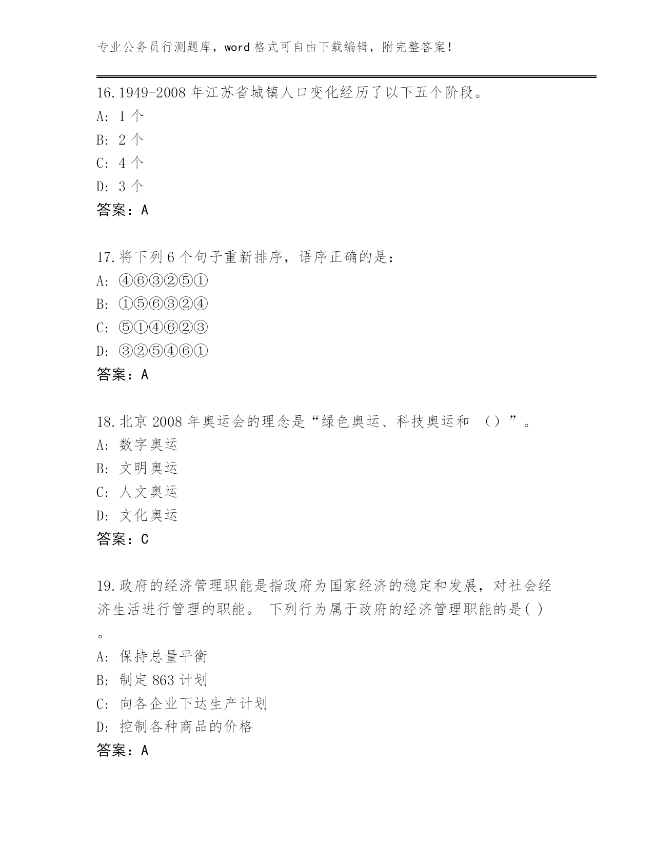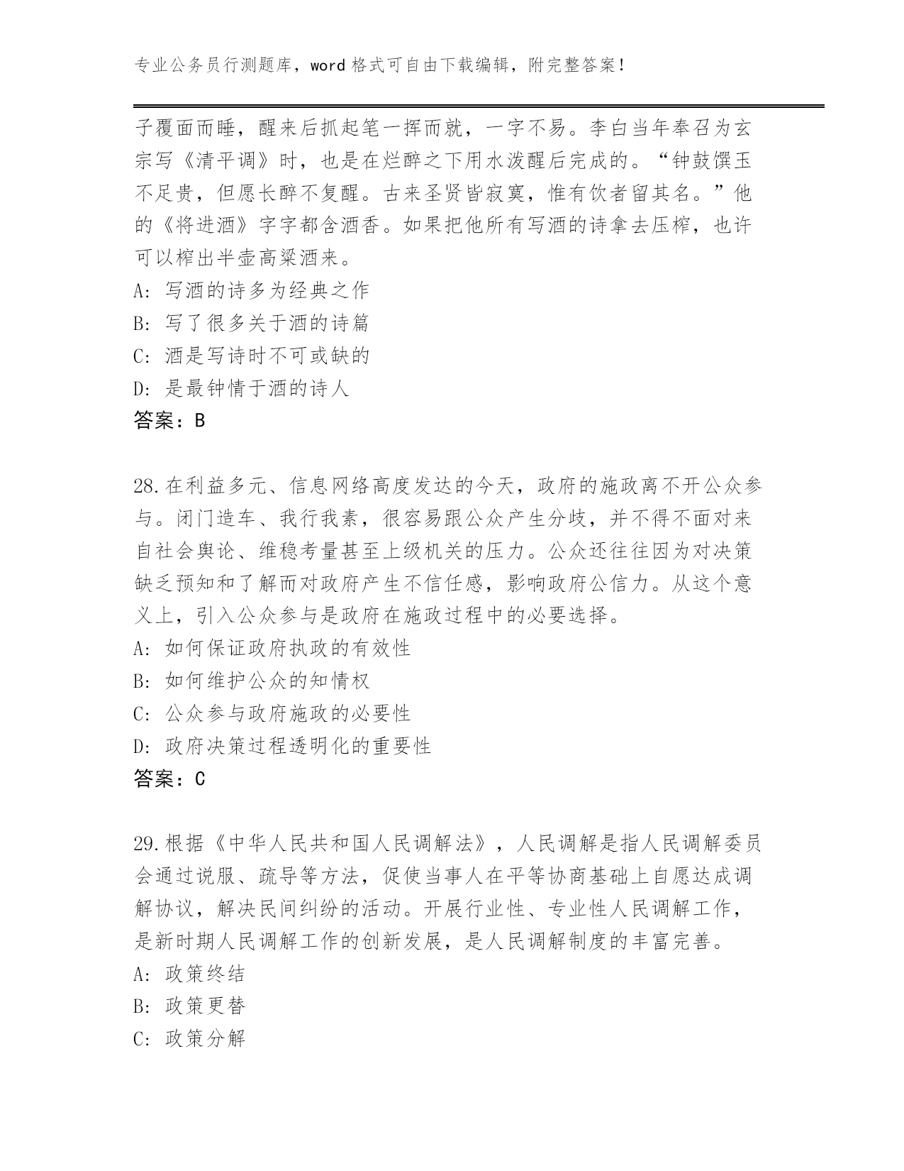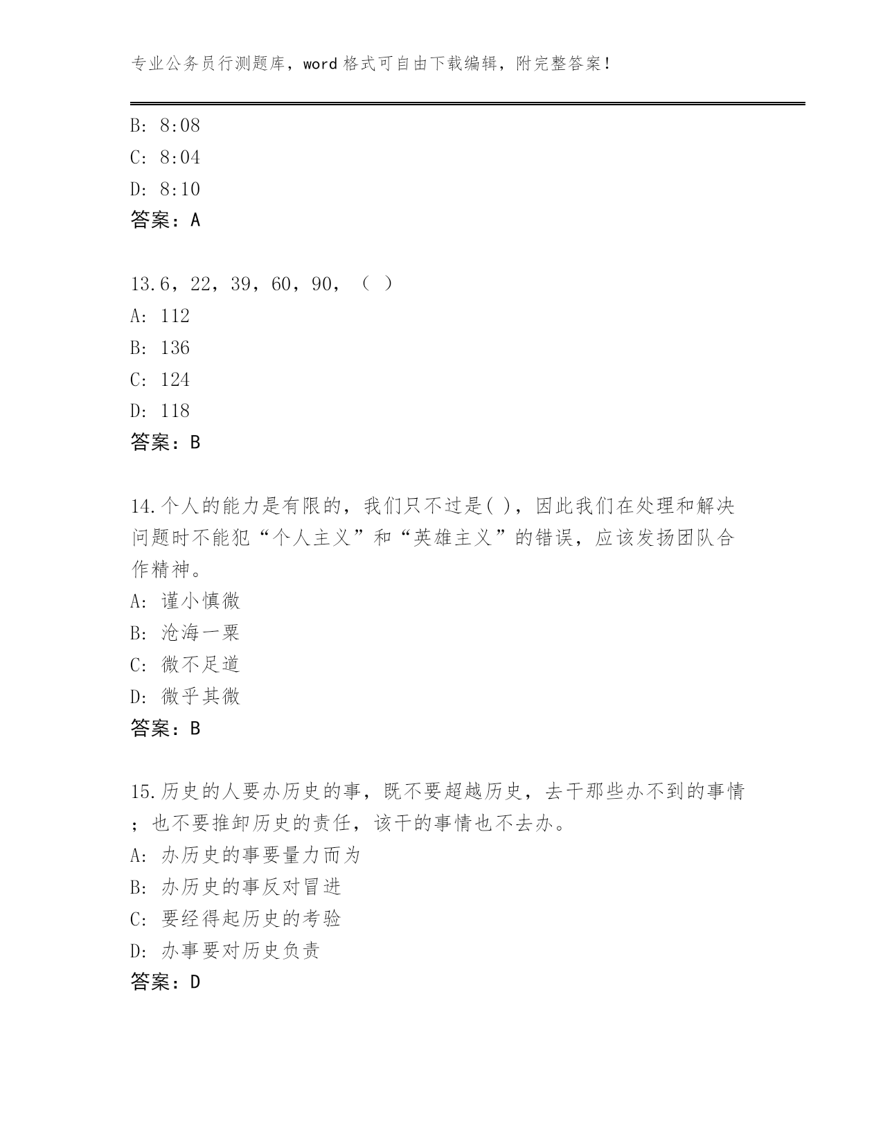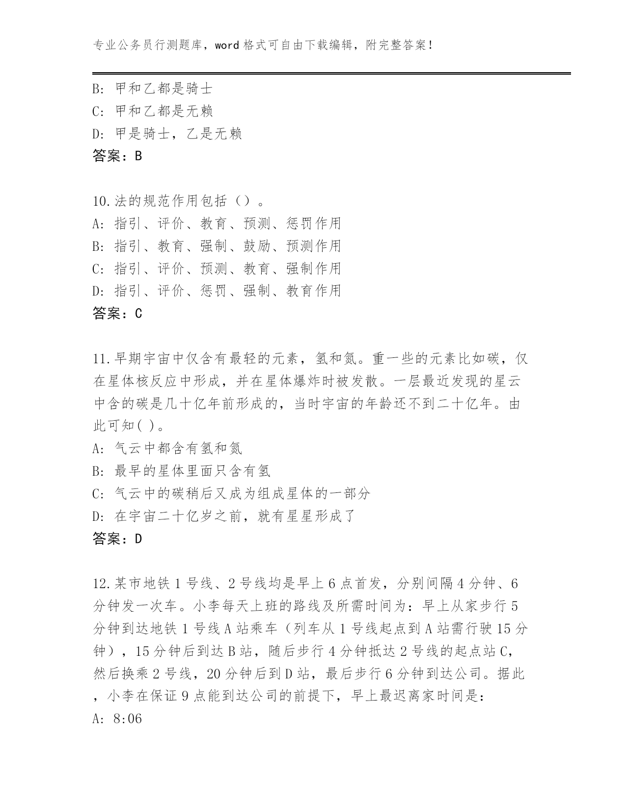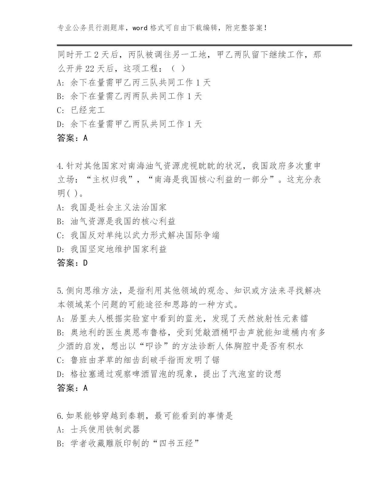 专业公务员行测题库,word格式可自由下载编辑,附完整答案!江苏省2024年公务员行测【典型题】第I部分单选题(100题)1.科学理性有一个特点:可以理解的事物就可以被接受,不能理解的事物就不可以接受并且排斥。这是人智的特点也正是人智的局限所在。这句话想说明()。A:科学的合理性B:科学的客观性C:科学的作用D:科学的局限性答案:B2.目前我国实行的最低生活保障线的标准不一,许多欠发达地区是每人每月50元或60元,某地新闻报道中还以"低保水平提高到每月50元"为题以示政绩。各地的物价水平、生活指数当然很不相同,但是,在今日的中国,即便许多发达城市的低保线是每月300多元,低保户维持生计尚显困难,那么一个月50元的艰辛就不难想见。这段文字主要是在强调:()A:发达地区的最低生活保障线标准较低B:一些地方以提高低保水平为政绩指标C:欠发达地区的最低生活保障线标准较低D:我国实行的最低生活保障线的标准不一答案:C3.一项工程由甲,乙,丙三个工程队共同完成需要15天,甲队与乙队的工作效率相同,丙队3天的工作量与乙队4天的工作量相当。三队同时开工2天后,丙队被调往另一工地,甲乙两队留下继续工作,那么开井22天后,这项工程:()A:余下在量需甲乙丙三队共同工作1天B:余下在量需乙丙两队共同工作1天C:已经完工D:余下在量需甲乙两队共同工作1天答案:A4.针对其他国家对南海油气资源虎视眈眈的状况,我国政府多次重申立场:“主权归我”,“南海是我国核心利益的一部分”。这充分表明()。A:我国是社会主义法治国家B:油气资源是我国的核心利益C:我国反对单纯以武力形式解决国际争端D:我国坚定地维护国家利益答案:D5.侧向思维方法,是指利用其他领域的观念、知识或方法来寻找解决本领域某个问题的可能途径和思路的一种方式。A:居里夫人根据实验室中看到的蓝光,发现了天然放射性元素镭B:奥地利的医生奥恩布鲁格,受到凭敲酒桶叩击声就能知道桶内有多少酒的启发,想出以“叩诊”的方法诊断人体胸腔中是否有积水C:鲁班由茅草的细齿刮破手指而发明了锯D:格拉塞通过观察啤酒冒泡的现象,提出了汽泡室的设想答案:A6.如果能够穿越到秦朝,最可能看到的事情是A:士兵使用铁制武器B:学者收藏雕版印制的“四书五经”C:妇女边聊天边剪纸D:客栈里邻座在吃玉米答案:A7.亚健康:指处于健康和疾病之间的一种临界状态,是介于健康和疾病之间的一个特殊阶段。以下属于亚健康的—项是:A:记者小王在“十运会”期间,由于采访任务繁重,身体的主要器官处于入不敷出的非正常负荷状态,过度疲劳,造成精力、体力透支B:桑兰是我国的一名体操运动员,她参加第四届世界友好运动会时,不幸失手严重摔伤,导致胸部以下完全瘫痪C:运动员在进行短跑或足球等无氧运动时,体内的血糖进行无氧分解提供能量,运动后肌肉里累积大量乳酸,引起肌肉痛D:老张的父亲患有严重的老年痴呆症,在患病期间卧床不起,不能行走和说话答案:A8.刘某偷得同事一张信用卡和身份证,向女朋友黄某谎称在路上捡到的。刘某,黄某根据身份证号码试出信用卡密码,持卡消费5000元,关于刘某,黄某的行为,下列哪一说法正确。()A:刘某构成信用卡诈骗罪,黄某不构成犯罪B:刘某构成盗窃罪,黄某构成信用卡诈骗罪C:刘某和黄某均构成信用卡诈骗罪D:刘某和黄某均构成盗窃罪答案:B9.某岛上男性公民分为骑士和无赖。骑士只讲真话,无赖只讲假话。甲和乙是该岛上的土著居民,关于他俩,甲说了这句话:"或者我是无赖,或者乙是骑士。"根据上述条件,可以推出的是:A:甲是无赖,乙是骑士B:甲和乙都是骑士C:甲和乙都是无赖D:甲是骑士,乙是无赖答案:B10.法的规范作用包括()。A:指引、评价、教育、预测、惩罚作用B:指引、教育、强制、鼓励、预测作用C:指引、评价、预测、教育、强制作用D:指引、评价、惩罚、强制、教育作用答案:C11.早期宇宙中仅含有最轻的元素,氢和氮。重一些的元素比如碳,仅在星体核反应中形成,并在星体爆炸时被发散。一层最近发现的星云中含的碳是几十亿年前形成的,当时宇宙的年龄还不到二十亿年。由此可知()。A:气云中都含有氢和氮B:最早的星体里面只含有氢C:气云中的碳稍后又成为组成星体的一部分D:在宇宙二十亿岁之前,就有星星形成了答案:D12.某市地铁1号线、2号线均是早上6点首发,分别间隔4分钟、6分钟发一次车。小李每天上班的路线及所需时间为:早上从家步行5分钟到达地铁1号线A站乘车(列车从1号线起点到A站需行驶15分钟),15分钟后到达B站,随后步行4分钟抵达2号线的起点站C,然后换乘2号线,20分钟后到D站,最后步行6