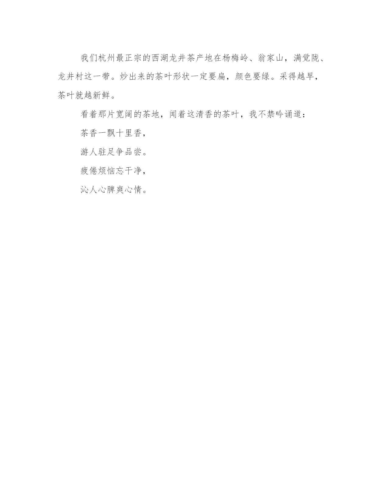 家乡的茶文化500字作文清晨,太阳公公起床了,阳光照耀在美丽的茶山上,每一棵茶叶好像都被唤醒了,舒展着碧绿的叶子,伸着懒腰在风中起舞。随着采茶工手指的跳跃,像在演奏动听的歌曲,一棵棵小茶叶像音符果实一样跳到茶蒌里。采茶工“弹琴弹完后”满载而归。茶叶的采摘期为3月底、4月初,此时的茶为明前茶。它经过了一年的营养储存,里面含有丰富的茶多酚等营养成份,对人体起到抗辐射、抗癌等功效。将采来的茶叶放入炒茶机里,使茶叶里的水分蒸发,这一道工序叫“杀青”。只见机器发出哧哧的声音,小嫩茶们在机器里调皮地跳跃着,翻着跟斗,顿时传来一阵阵清香,五彩缤纷的蝴蝶和歌唱家小鸟也飞过来了,似乎也想品尝一下这美味的茶叶。把第一道炒好的茶叶放进手动炒茶锅里定型,叫“辉锅”。只见小嫩茶们翻完了跟斗又在爷爷的手掌之间优雅地跳起了芭蕾舞,你看,它们的舞姿是多么得优美呀!为了定型使茶叶的外观漂亮,爷爷的手抓着茶叶贴着锅子上下摆动,小嫩茶们好像又荡起了秋千。爷爷一边炒着一边不断地用手摸一把茶叶,仔细观察着它的色泽和形状的变化。好像是一位老科学家在仔细分析学问似的。不一会儿,经过爷爷的细心制作,一颗颗婀娜多姿、亭亭玉立的嫩茶新鲜出炉啦!真香!我们杭州最正宗的西湖龙井茶产地在杨梅岭、翁家山,满觉陇、龙井村这一带。炒出来的茶叶形状一定要扁,颜色要绿。采得越早,茶叶就越新鲜。看着那片宽阔的茶地,闻着这清香的茶叶,我不禁吟诵道:茶香一飘十里香,游人驻足争品尝。疲倦烦恼忘干净,沁人心脾爽心情。