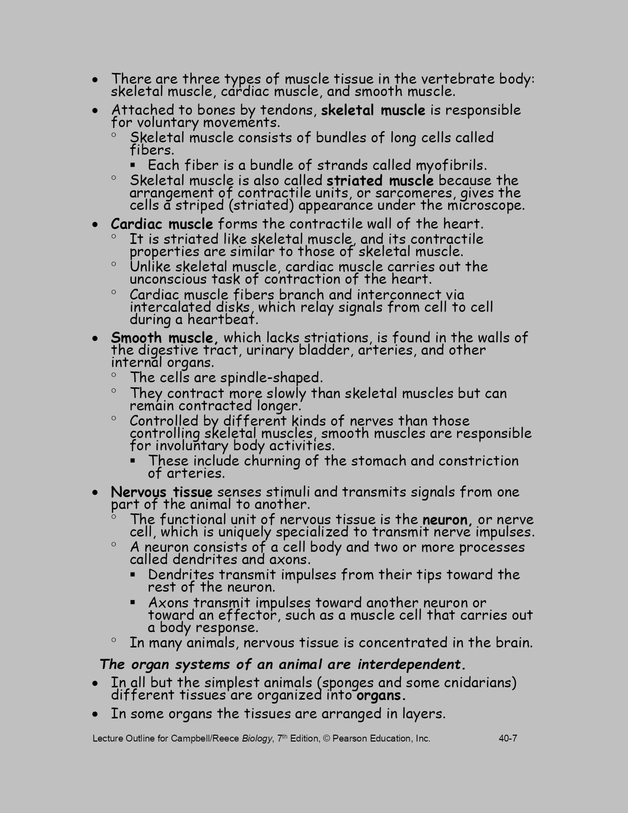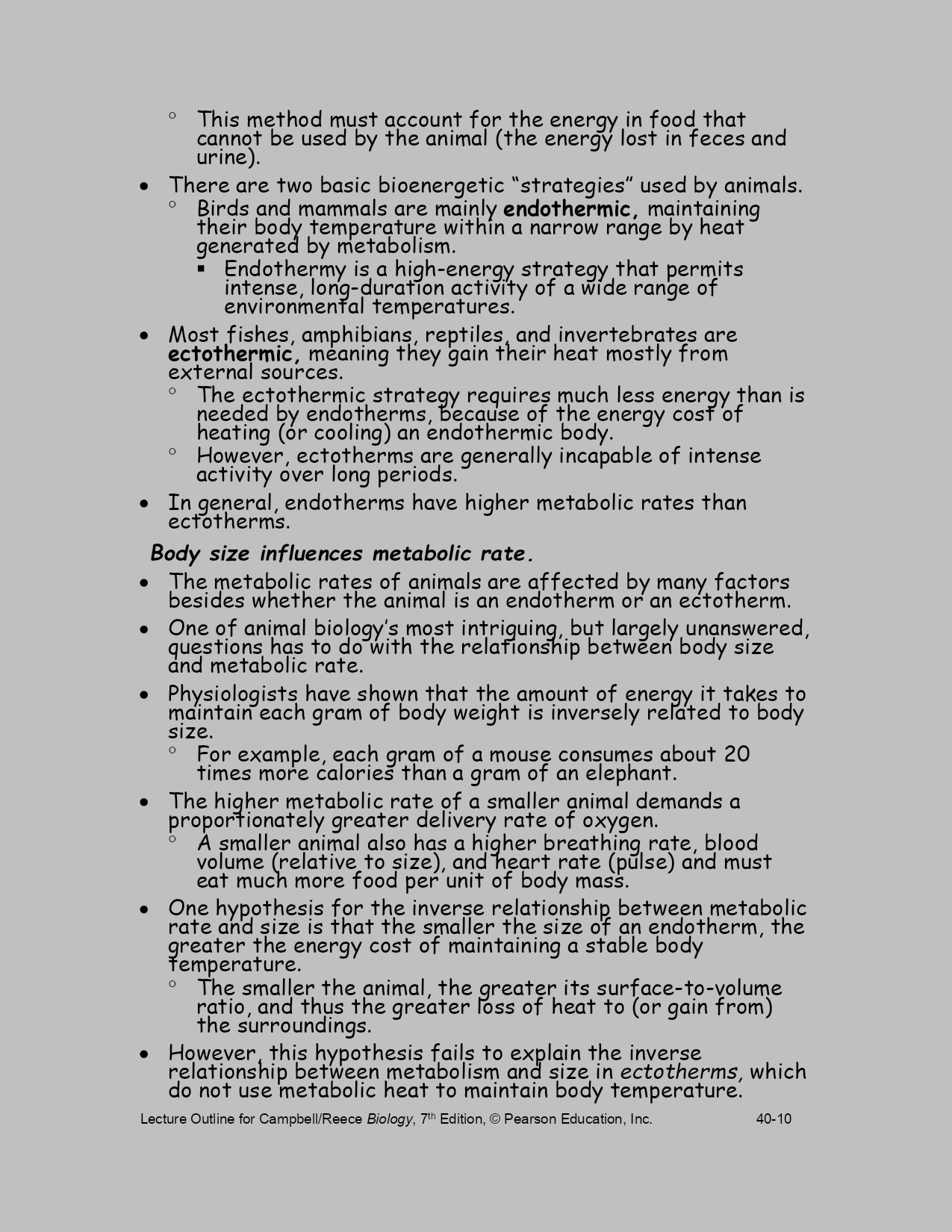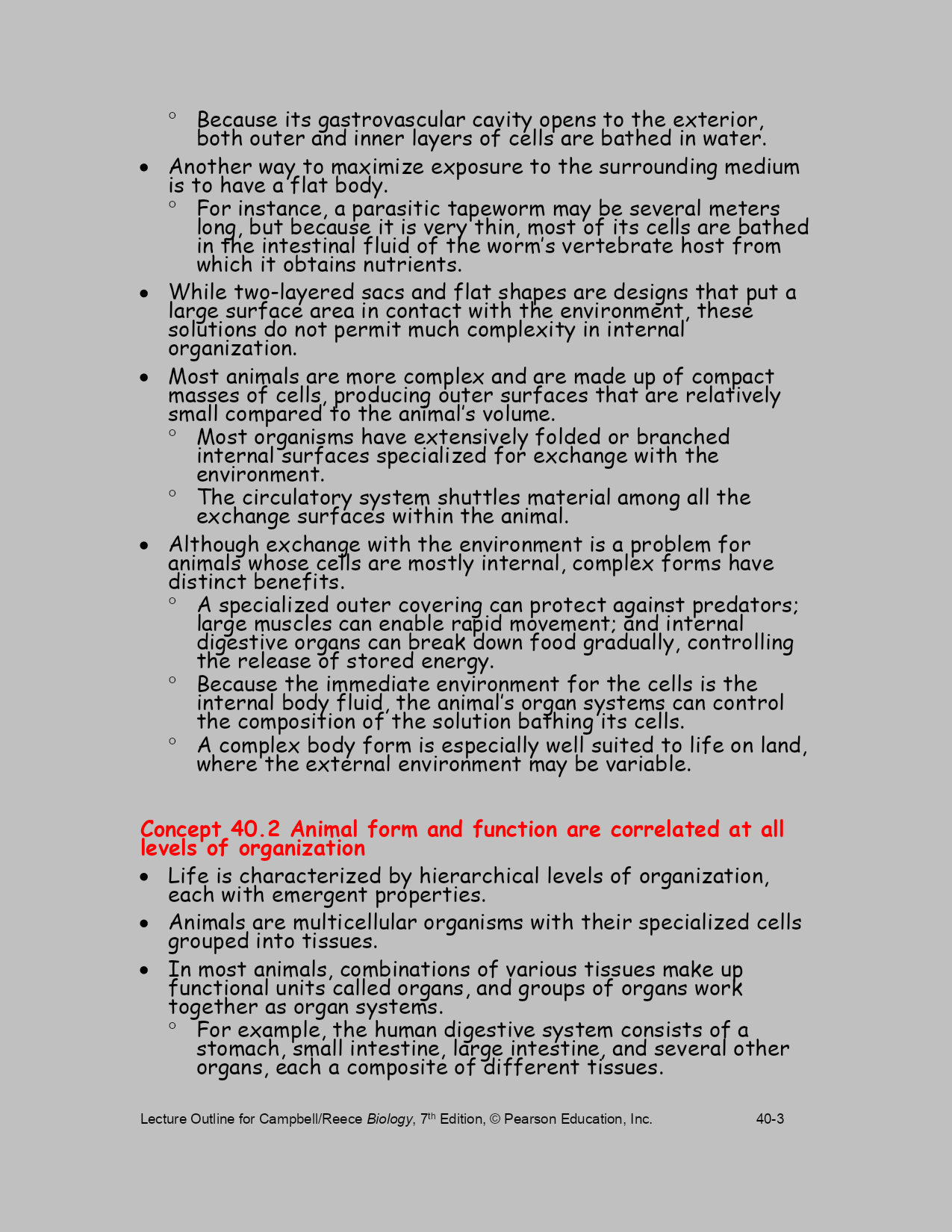 LectureOutlineforCampbell/ReeceBiology,7thEdition,©PearsonEducation,Inc.40-Chapter40BasicPrinciplesofAnimalFormandFunctionLectureOutlineOverview:DiverseForms,CommonChallengesAnimalsinhabitalmosteverypartofthebiosphere.Despitetheirgreatdiversity,allanimalsmustsolveacommonsetofproblems.Allanimalsmustobtainoxygen,nourishthemselves,excretewastes,andmove.Animalsofdiverseevolutionaryhistoriesandvaryingcomplexitymustsolvethesegeneralchallengesoflife.Considerthelong,tongue-likeproboscisofahawkmoth,astructuraladaptationforfeeding.Recoiledwhennotinuse,theproboscisextendsasastrawthroughwhichthemothcansucknectarfromdeepwithintube-shapedflowers.Analyzingthehawkmoth’sproboscisgivescluesaboutwhatitdoesandhowitfunctions.Anatomyisthestudyofthestructureofanorganism.Physiologyisthestudyofthefunctionsanorganismperforms.Naturalselectioncanfitstructuretofunctionbyselecting,overmanygenerations,thebestoftheavailablevariationsinapopulation.Searchingforfood,generatingbodyheatandregulatinginternaltemperature,sensingandrespondingtoenvironmentalstimuli,andallotheranimalactivitiesrequirefuelintheformofchemicalenergy.Theconceptofbioenergetics—howorganismsobtain,process,anduseenergyresources—isaconnectingthemeinthecomparativestudyofanimals.Concept40.1PhysicallawsandtheenvironmentconstrainanimalsizeandshapeAnanimal’ssizeandshape,featuresoftencalled“bodyplans”or“designs,”arefundamentalaspectsofformandfunctionthatsignificantlyaffectthewayananimalinteractswithitsenvironment.Thetermsplananddesigndonotmeanthatanimalbodyformsareproductsofconsciousinvention.Thebodyplanordesignofananimalresultsfromapatternofdevelopmentprogrammedbythegenome,itselftheproductofmillionsofyearsofevolutionduetonaturalselection.Physicalrequirementsconstrainwhatnaturalselectioncan“invent.”Ananimalsuchasthemythicalwingeddragoncannotexist.Noanimalaslargeasadragoncouldgenerateenoughlifttotakeoffandfly.Similarly,thelawsofhydrodynamicsconstraintheshapesthatarepossibleforaquaticorganismsthatswimveryfast.Tunas,