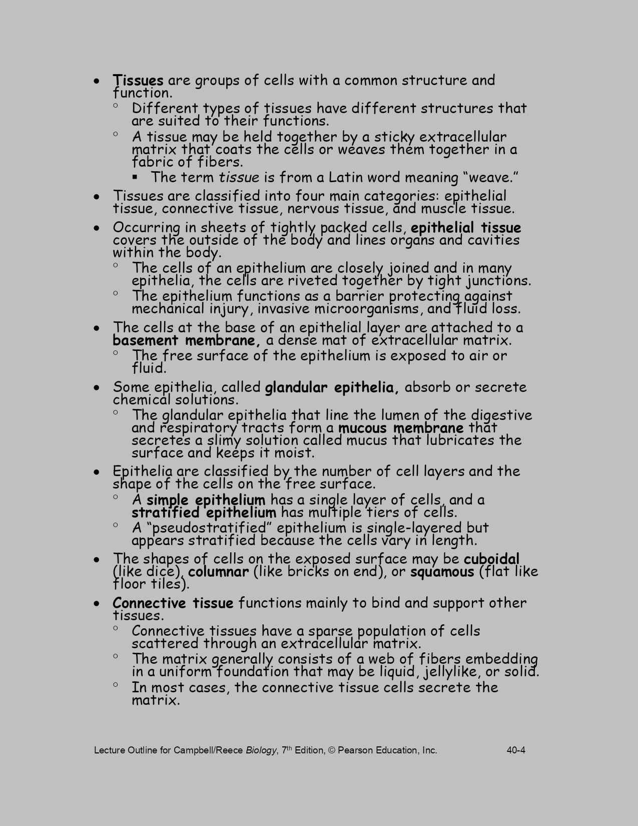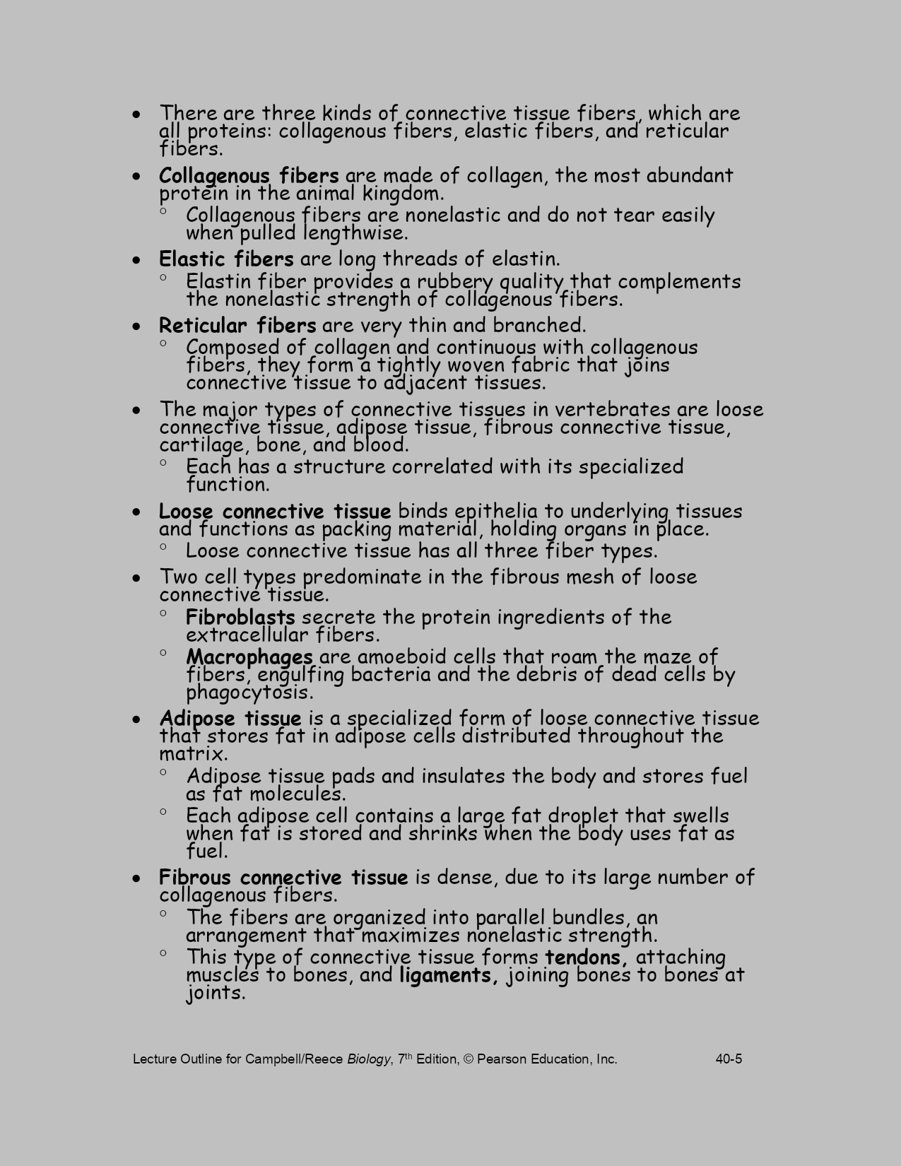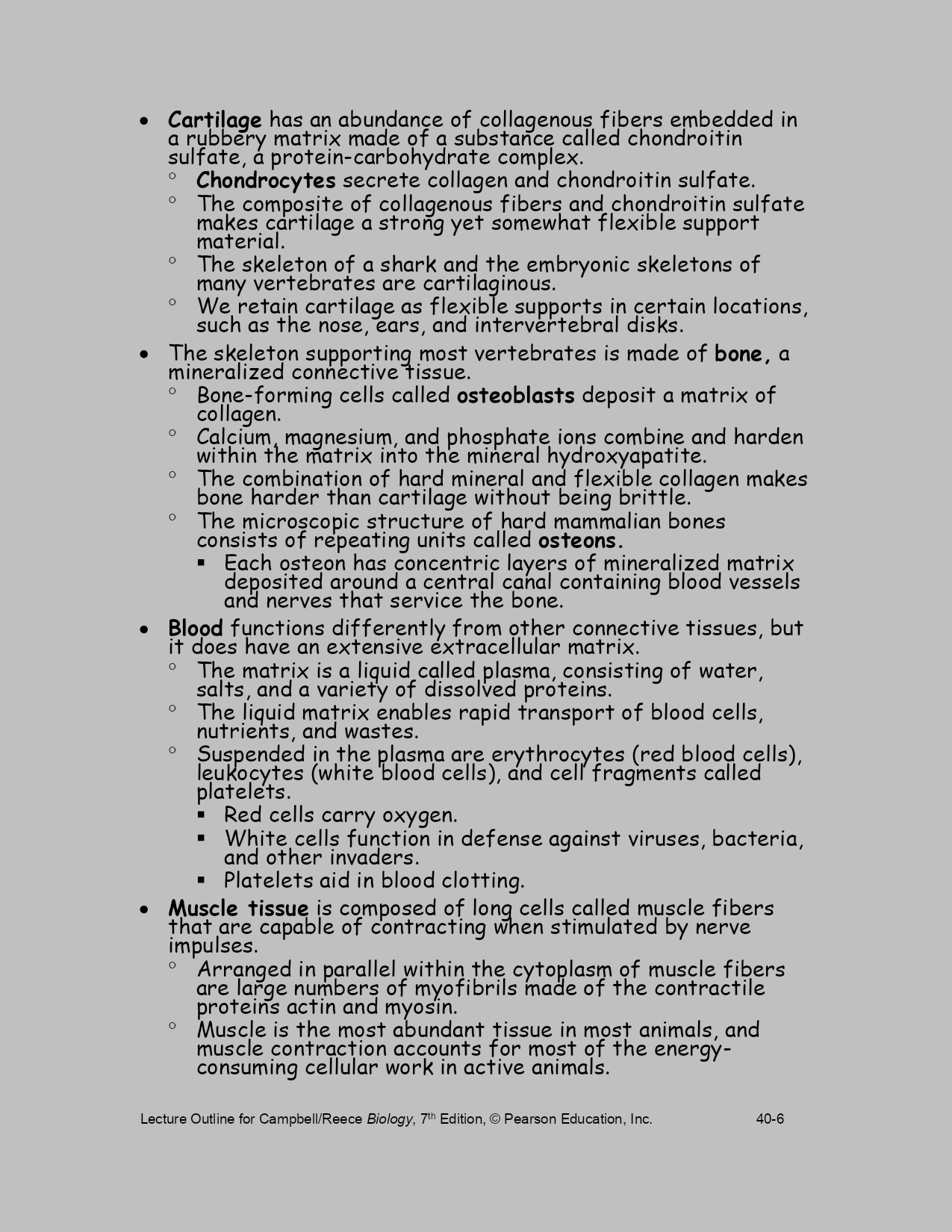 LectureOutlineforCampbell/ReeceBiology,7thEdition,©PearsonEducation,Inc.40-Chapter40BasicPrinciplesofAnimalFormandFunctionLectureOutlineOverview:DiverseForms,CommonChallengesAnimalsinhabitalmosteverypartofthebiosphere.Despitetheirgreatdiversity,allanimalsmustsolveacommonsetofproblems.Allanimalsmustobtainoxygen,nourishthemselves,excretewastes,andmove.Animalsofdiverseevolutionaryhistoriesandvaryingcomplexitymustsolvethesegeneralchallengesoflife.Considerthelong,tongue-likeproboscisofahawkmoth,astructuraladaptationforfeeding.Recoiledwhennotinuse,theproboscisextendsasastrawthroughwhichthemothcansucknectarfromdeepwithintube-shapedflowers.Analyzingthehawkmoth’sproboscisgivescluesaboutwhatitdoesandhowitfunctions.Anatomyisthestudyofthestructureofanorganism.Physiologyisthestudyofthefunctionsanorganismperforms.Naturalselectioncanfitstructuretofunctionbyselecting,overmanygenerations,thebestoftheavailablevariationsinapopulation.Searchingforfood,generatingbodyheatandregulatinginternaltemperature,sensingandrespondingtoenvironmentalstimuli,andallotheranimalactivitiesrequirefuelintheformofchemicalenergy.Theconceptofbioenergetics—howorganismsobtain,process,anduseenergyresources—isaconnectingthemeinthecomparativestudyofanimals.Concept40.1PhysicallawsandtheenvironmentconstrainanimalsizeandshapeAnanimal’ssizeandshape,featuresoftencalled“bodyplans”or“designs,”arefundamentalaspectsofformandfunctionthatsignificantlyaffectthewayananimalinteractswithitsenvironment.Thetermsplananddesigndonotmeanthatanimalbodyformsareproductsofconsciousinvention.Thebodyplanordesignofananimalresultsfromapatternofdevelopmentprogrammedbythegenome,itselftheproductofmillionsofyearsofevolutionduetonaturalselection.Physicalrequirementsconstrainwhatnaturalselectioncan“invent.”Ananimalsuchasthemythicalwingeddragoncannotexist.Noanimalaslargeasadragoncouldgenerateenoughlifttotakeoffandfly.Similarly,thelawsofhydrodynamicsconstraintheshapesthatarepossibleforaquaticorganismsthatswimveryfast.Tunas,