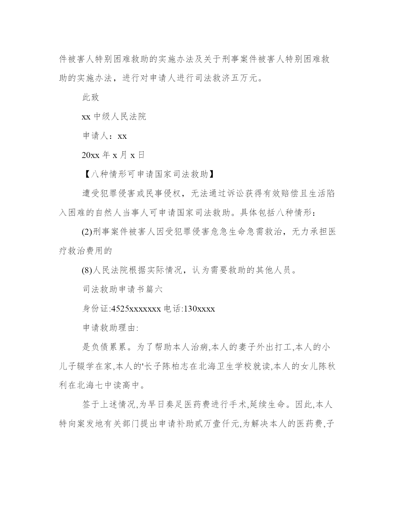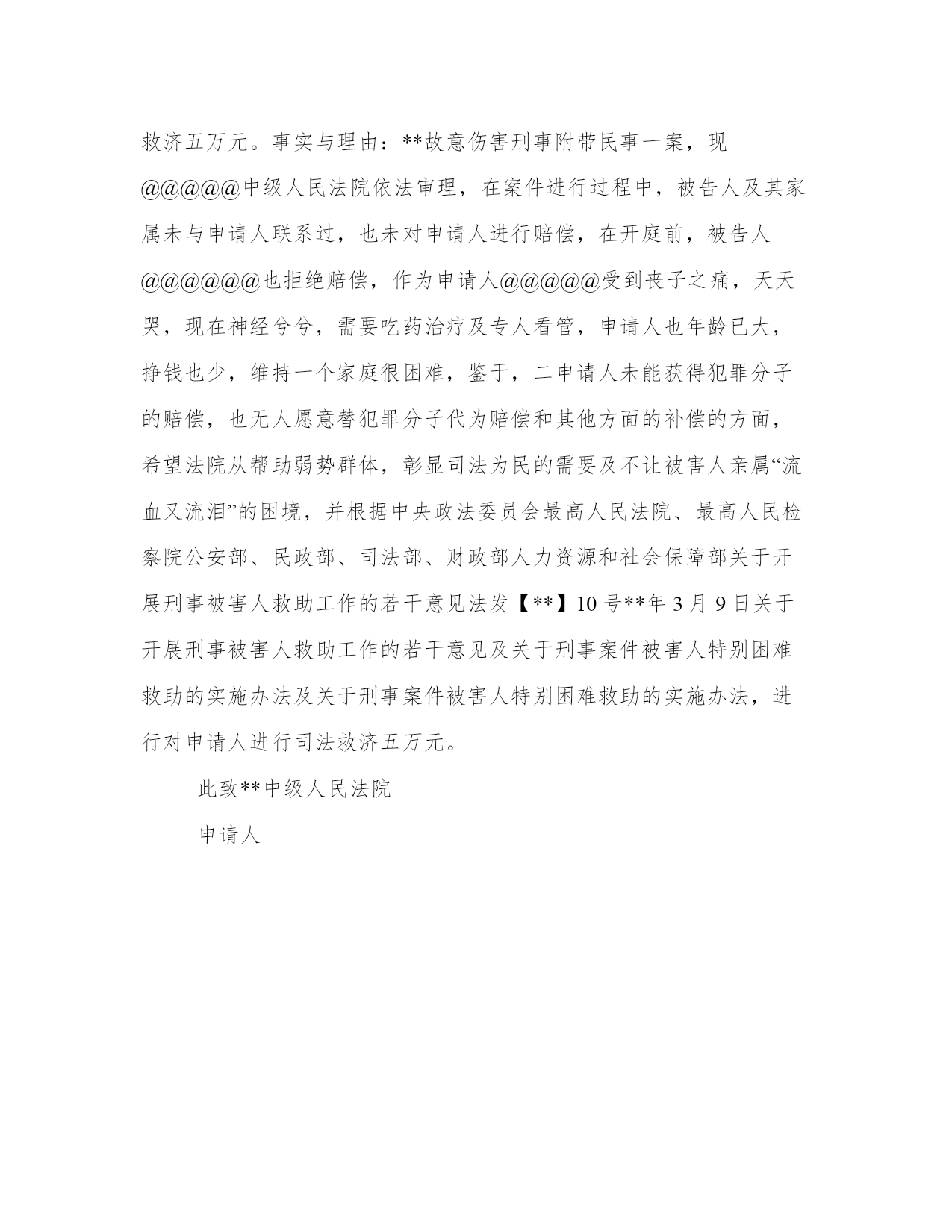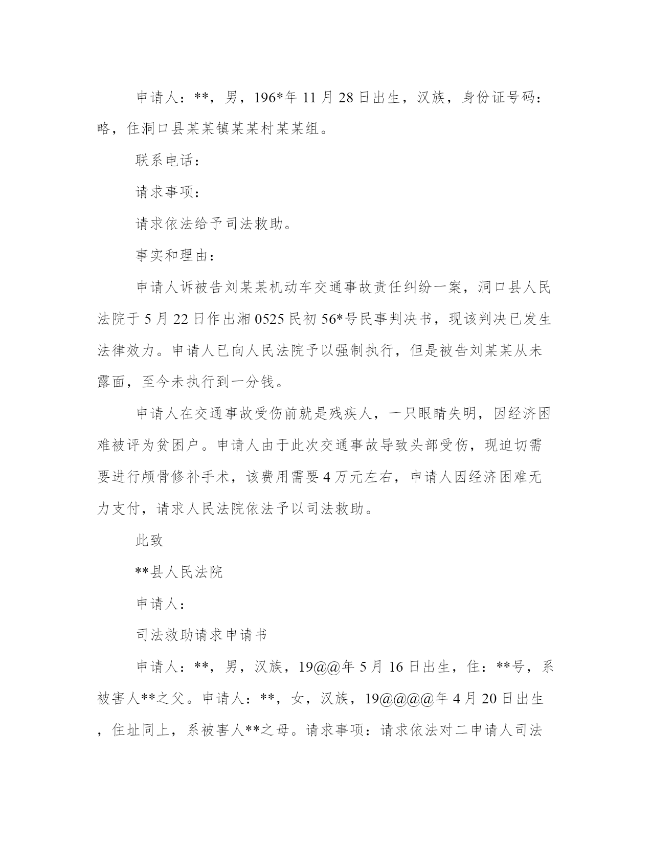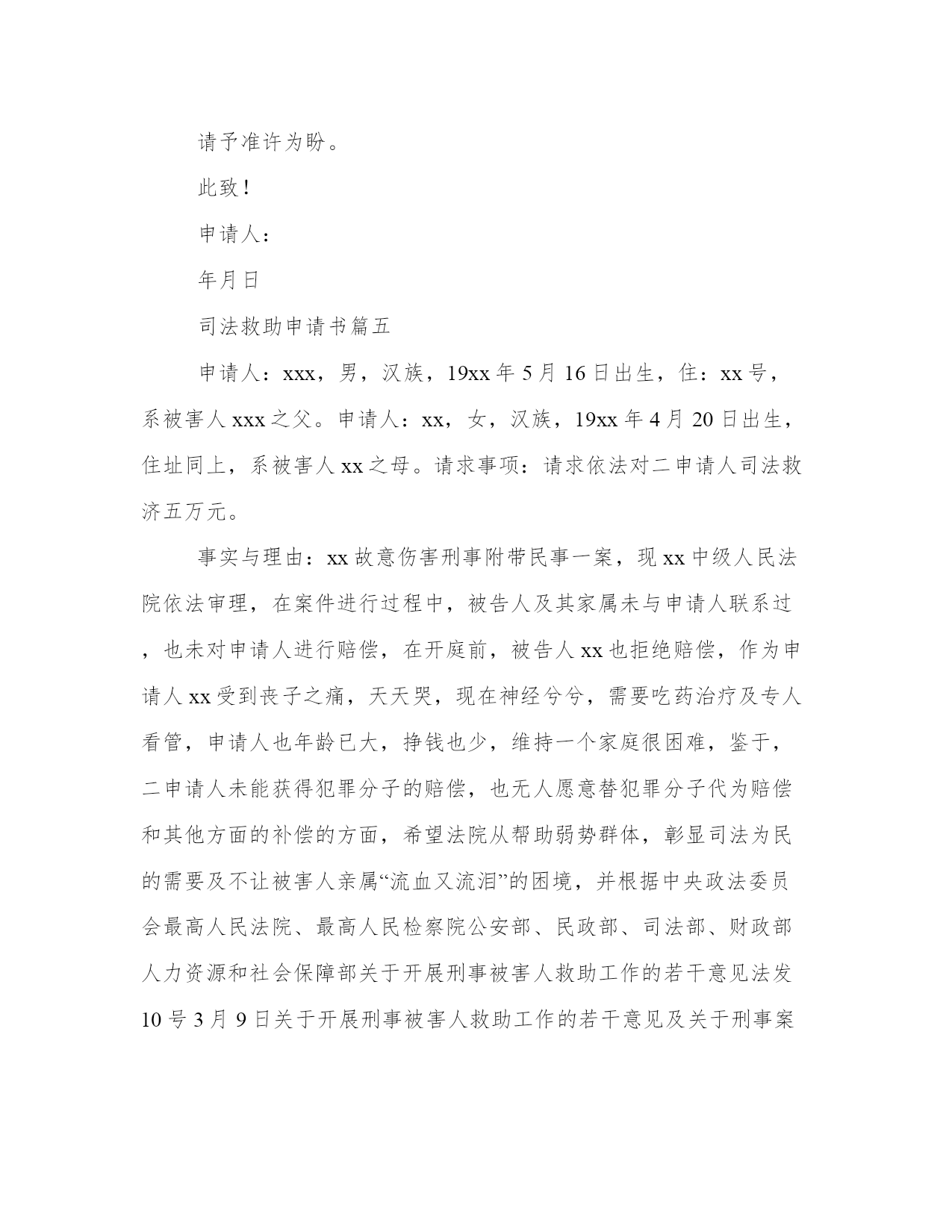 最新司法救助申请书(大全10篇)无论是身处学校还是步入社会,大家都尝试过写作吧,借助写作也可以提高我们的语言组织能力。那么我们该如何写一篇较为完美的范文呢?以下是小编为大家收集的优秀范文,欢迎大家分享阅读。司法救助申请书篇一尊敬的领导:申请人:某某某请求事项:免交诉讼费用理由:申请人已向贵院提起遗产继承诉讼,但是由于申请人目前属城市低保人员且生活非常困难,无力支付诉讼费用,特申请贵院依法提供司法救助,予以免交诉讼费用。请予准许为盼。此致!!申请人:年月日司法救助申请书篇二请求事项:免交诉讼费用理由:申请人已向贵院提起遗产继承诉讼,但是由于申请人目前属城市低保人员且生活非常困难,无力支付诉讼费用,特申请贵院依法提供司法救助,予以免交诉讼费用。请予准许为盼。此致某某区人民法院申请人:某某某20xx年x月x日附:街道低保及经济困难证明一份。司法救助申请书篇三因申请人现今伤残失业没有收入,兹就人身伤害索赔一案,依据最高人民法院关于对经济确有困难的当事人提供司法救助的规定第三条、第四条、第五条申请司法救助,请人民法院先予核准缓交诉讼费用。此致珠海市金湾区人民法院申请人:韩某生20xx年3月29日司法救助申请书篇四尊敬的领导:申请人:某某某请求事项:免交诉讼费用理由:申请人已向贵院提起遗产继承诉讼,但是由于申请人目前属城市低保人员且生活非常困难,无力支付诉讼费用,特申请贵院依法提供司法救助,予以免交诉讼费用。请予准许为盼。此致!申请人:年月日司法救助申请书篇五申请人:xxx,男,汉族,19xx年5月16日出生,住:xx号,系被害人xxx之父。申请人:xx,女,汉族,19xx年4月20日出生,住址同上,系被害人xx之母。请求事项:请求依法对二申请人司法救济五万元。事实与理由:xx故意伤害刑事附带民事一案,现xx中级人民法院依法审理,在案件进行过程中,被告人及其家属未与申请人联系过,也未对申请人进行赔偿,在开庭前,被告人xx也拒绝赔偿,作为申请人xx受到丧子之痛,天天哭,现在神经兮兮,需要吃药治疗及专人看管,申请人也年龄已大,挣钱也少,维持一个家庭很困难,鉴于,二申请人未能获得犯罪分子的赔偿,也无人愿意替犯罪分子代为赔偿和其他方面的补偿的方面,希望法院从帮助弱势群体,彰显司法为民的需要及不让被害人亲属“流血又流泪”的困境,并根据中央政法委员会最高人民法院、最高人民检察院公安部、民政部、司法部、财政部人力资源和社会保障部关于开展刑事被害人救助工作的若干意见法发10号3月9日关于开展刑事被害人救助工作的若干意见及关于刑事案件被害人特别困难救助的实施办法及关于刑事案件被害人特别困难救助的实施办法,进行对申请人进行司法救济五万元。此致xx中级人民法院申请人:xx20xx年x月x日【八种情形可申请国家司法救助】遭受犯罪侵害或民事侵权,无法通过诉讼获得有效赔偿且生活陷入困难的自然人当事人可申请国家司法救助。具体包括八种情形:(2)刑事案件被害人因受犯罪侵害危急生命急需救治,无力承担医疗救治费用的(8)人民法院根据实际情况,认为需要救助的其他人员。司法救助申请书篇六身份证:4525xxxxxxx电话:130xxxx申请救助理由:是负债累累。为了帮助本人治病,本人的妻子外出打工,本人的小儿子辍学在家,本人的'长子陈柏志在北海卫生学校就读,本人的女儿陈秋利在北海七中读高中。签于上述情况,为早日奏足医药费进行手术,延续生命。因此,本人特向案发地有关部门提出申请补助贰万壹仟元,为解决本人的医药费,子女读书和家庭实际生活困难问题。直到至今仍未见结果,因此恳请上级职能部门,深情关注本案,检查督办,衷心地感谢你们。此致各级职能部门申请人:陈xx20xx年x月x日司法救助申请书篇七请求事项:免交诉讼费用理由:申请人已向贵院提起遗产继承诉讼,但是由于申请人目前属城市低保人员且生活非常困难,无力支付诉讼费用,特申请贵院依法提供司法救助,予以免交诉讼费用。请予准许为盼。20xx年x月x日司法救助申请书篇八因申请人现今伤残失业没有收入,兹就人身伤害索赔一案,依据最高人民法院关于对经济确有困难的当事人提供司法救助的规定第三条、第四条、第五条申请司法救助,请人民法院先予核准缓交诉讼费用。此致珠海市金湾区人民法院申请人:韩某生2017年3月29日附:镇政府证明材料一份申请书将本文的word文档下载到电脑,方便收藏和打印推荐度:点击下载文档搜索文档司法救助申请书篇九尊敬的民政相关部门领导:我叫xx,现年25岁,是咸宁市咸安区大幕乡石桥村村1组村民。我家原有3口人,母亲、我和弟弟。由于我和弟弟目前都没有成家,一直以来,我们家都是靠勤劳的母亲操持内