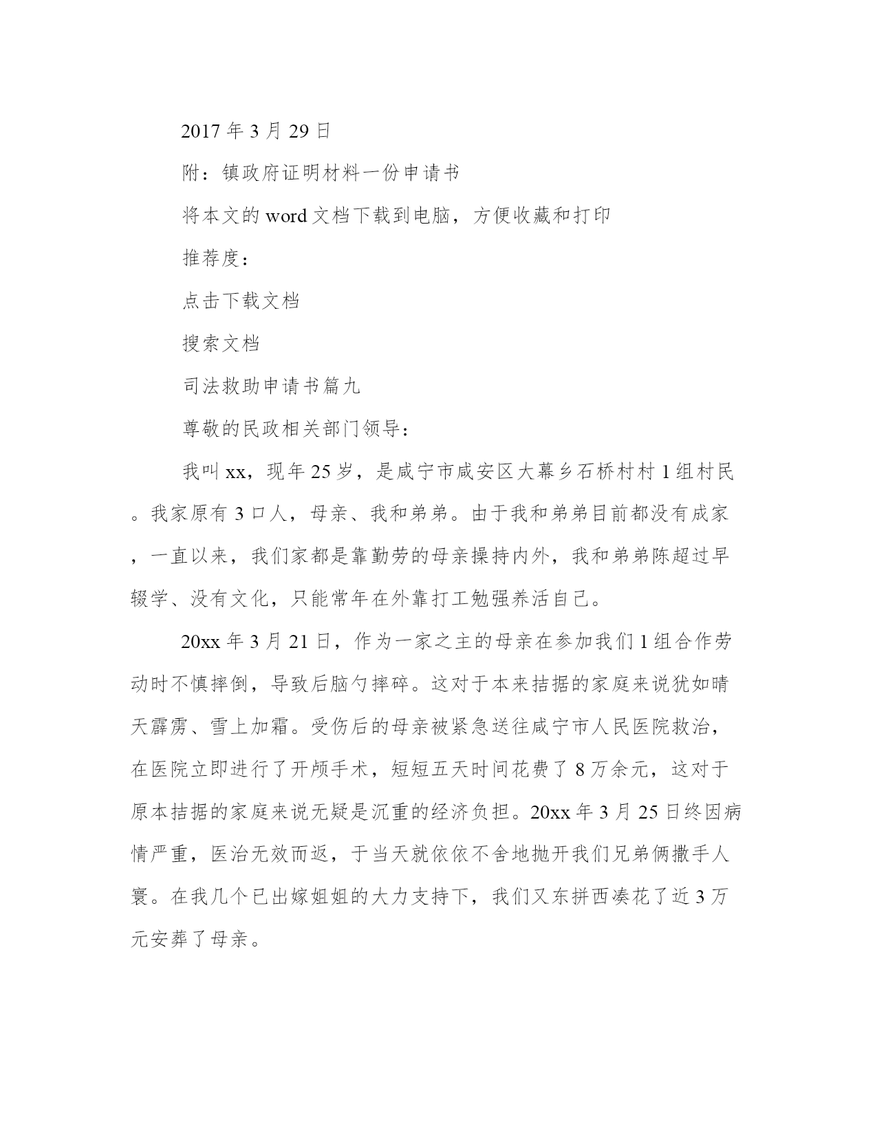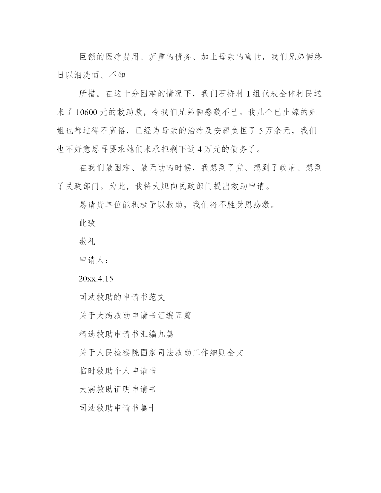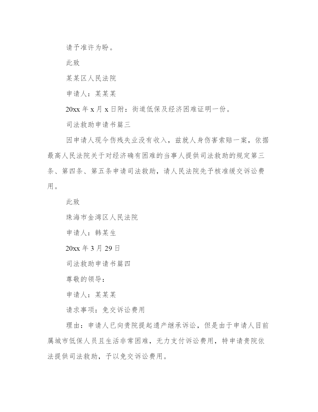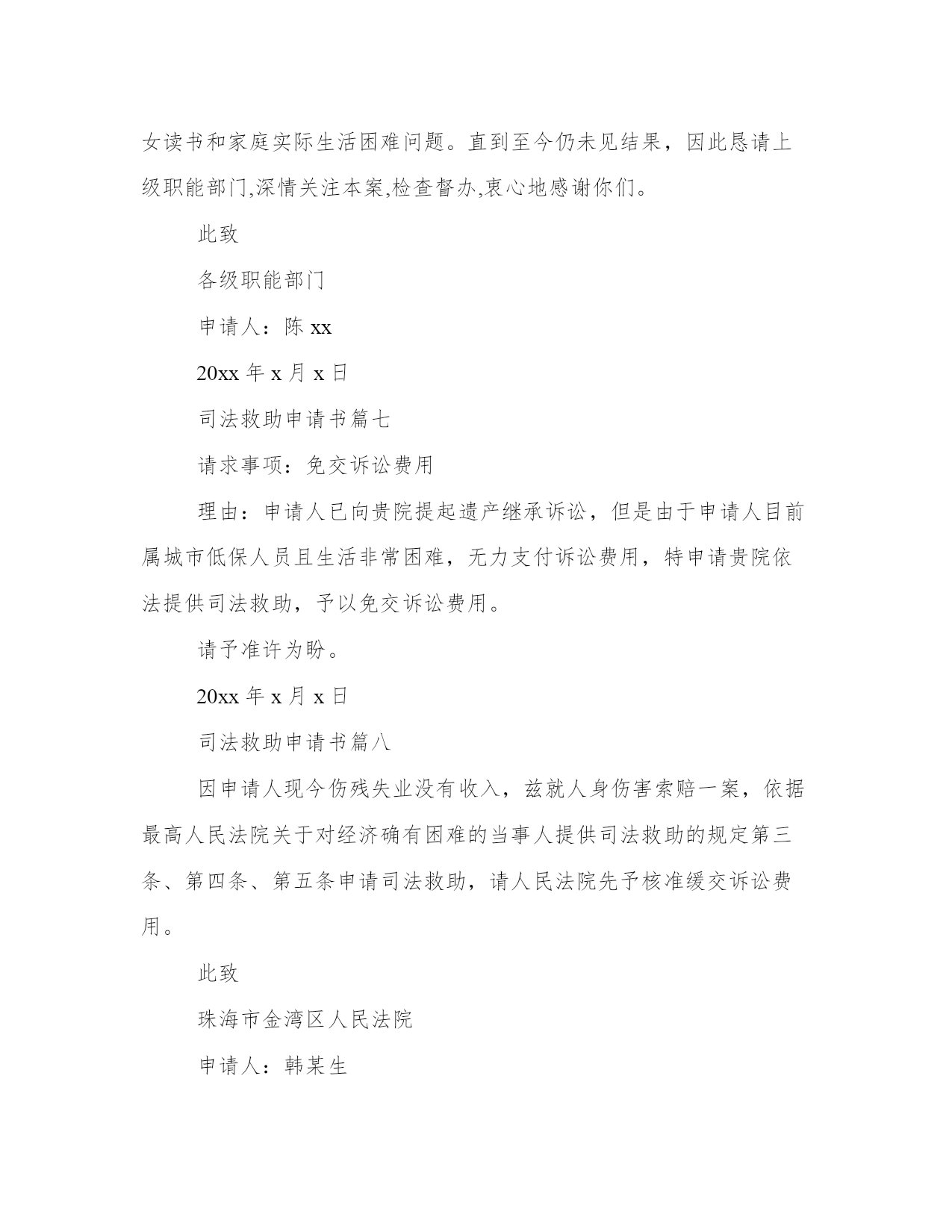 最新司法救助申请书(大全10篇)无论是身处学校还是步入社会,大家都尝试过写作吧,借助写作也可以提高我们的语言组织能力。那么我们该如何写一篇较为完美的范文呢?以下是小编为大家收集的优秀范文,欢迎大家分享阅读。司法救助申请书篇一尊敬的领导:申请人:某某某请求事项:免交诉讼费用理由:申请人已向贵院提起遗产继承诉讼,但是由于申请人目前属城市低保人员且生活非常困难,无力支付诉讼费用,特申请贵院依法提供司法救助,予以免交诉讼费用。请予准许为盼。此致!!申请人:年月日司法救助申请书篇二请求事项:免交诉讼费用理由:申请人已向贵院提起遗产继承诉讼,但是由于申请人目前属城市低保人员且生活非常困难,无力支付诉讼费用,特申请贵院依法提供司法救助,予以免交诉讼费用。请予准许为盼。此致某某区人民法院申请人:某某某20xx年x月x日附:街道低保及经济困难证明一份。司法救助申请书篇三因申请人现今伤残失业没有收入,兹就人身伤害索赔一案,依据最高人民法院关于对经济确有困难的当事人提供司法救助的规定第三条、第四条、第五条申请司法救助,请人民法院先予核准缓交诉讼费用。此致珠海市金湾区人民法院申请人:韩某生20xx年3月29日司法救助申请书篇四尊敬的领导:申请人:某某某请求事项:免交诉讼费用理由:申请人已向贵院提起遗产继承诉讼,但是由于申请人目前属城市低保人员且生活非常困难,无力支付诉讼费用,特申请贵院依法提供司法救助,予以免交诉讼费用。请予准许为盼。此致!申请人:年月日司法救助申请书篇五申请人:xxx,男,汉族,19xx年5月16日出生,住:xx号,系被害人xxx之父。申请人:xx,女,汉族,19xx年4月20日出生,住址同上,系被害人xx之母。请求事项:请求依法对二申请人司法救济五万元。事实与理由:xx故意伤害刑事附带民事一案,现xx中级人民法院依法审理,在案件进行过程中,被告人及其家属未与申请人联系过,也未对申请人进行赔偿,在开庭前,被告人xx也拒绝赔偿,作为申请人xx受到丧子之痛,天天哭,现在神经兮兮,需要吃药治疗及专人看管,申请人也年龄已大,挣钱也少,维持一个家庭很困难,鉴于,二申请人未能获得犯罪分子的赔偿,也无人愿意替犯罪分子代为赔偿和其他方面的补偿的方面,希望法院从帮助弱势群体,彰显司法为民的需要及不让被害人亲属“流血又流泪”的困境,并根据中央政法委员会最高人民法院、最高人民检察院公安部、民政部、司法部、财政部人力资源和社会保障部关于开展刑事被害人救助工作的若干意见法发10号3月9日关于开展刑事被害人救助工作的若干意见及关于刑事案件被害人特别困难救助的实施办法及关于刑事案件被害人特别困难救助的实施办法,进行对申请人进行司法救济五万元。此致xx中级人民法院申请人:xx20xx年x月x日【八种情形可申请国家司法救助】遭受犯罪侵害或民事侵权,无法通过诉讼获得有效赔偿且生活陷入困难的自然人当事人可申请国家司法救助。具体包括八种情形:(2)刑事案件被害人因受犯罪侵害危急生命急需救治,无力承担医疗救治费用的(8)人民法院根据实际情况,认为需要救助的其他人员。司法救助申请书篇六身份证:4525xxxxxxx电话:130xxxx申请救助理由:是负债累累。为了帮助本人治病,本人的妻子外出打工,本人的小儿子辍学在家,本人的'长子陈柏志在北海卫生学校就读,本人的女儿陈秋利在北海七中读高中。签于上述情况,为早日奏足医药费进行手术,延续生命。因此,本人特向案发地有关部门提出申请补助贰万壹仟元,为解决本人的医药费,子女读书和家庭实际生活困难问题。直到至今仍未见结果,因此恳请上级职能部门,深情关注本案,检查督办,衷心地感谢你们。此致各级职能部门申请人:陈xx20xx年x月x日司法救助申请书篇七请求事项:免交诉讼费用理由:申请人已向贵院提起遗产继承诉讼,但是由于申请人目前属城市低保人员且生活非常困难,无力支付诉讼费用,特申请贵院依法提供司法救助,予以免交诉讼费用。请予准许为盼。20xx年x月x日司法救助申请书篇八因申请人现今伤残失业没有收入,兹就人身伤害索赔一案,依据最高人民法院关于对经济确有困难的当事人提供司法救助的规定第三条、第四条、第五条申请司法救助,请人民法院先予核准缓交诉讼费用。此致珠海市金湾区人民法院申请人:韩某生2017年3月29日附:镇政府证明材料一份申请书将本文的word文档下载到电脑,方便收藏和打印推荐度:点击下载文档搜索文档司法救助申请书篇九尊敬的民政相关部门领导:我叫xx,现年25岁,是咸宁市咸安区大幕乡石桥村村1组村民。我家原有3口人,母亲、我和弟弟。由于我和弟弟目前都没有成家,一直以来,我们家都是靠勤劳的母亲操持内