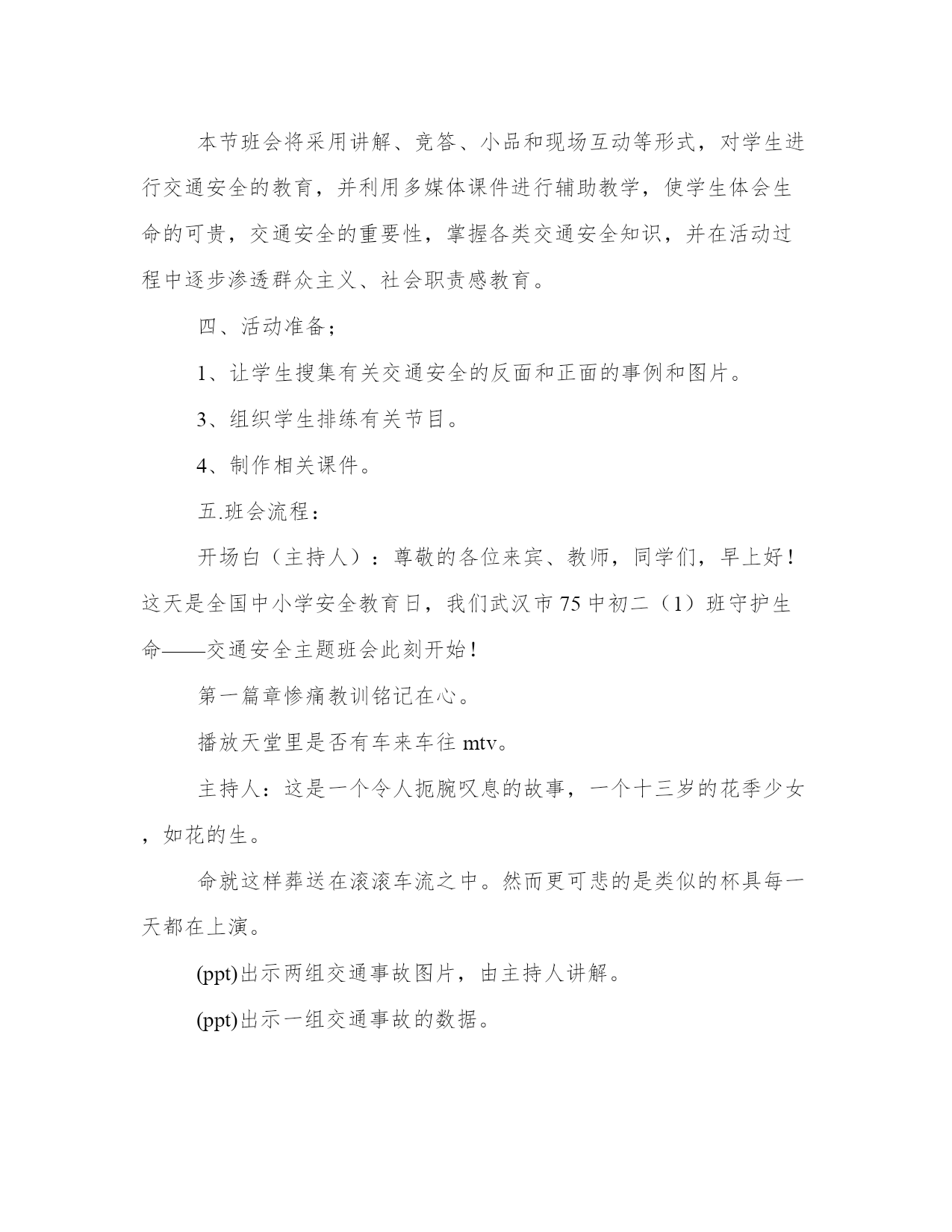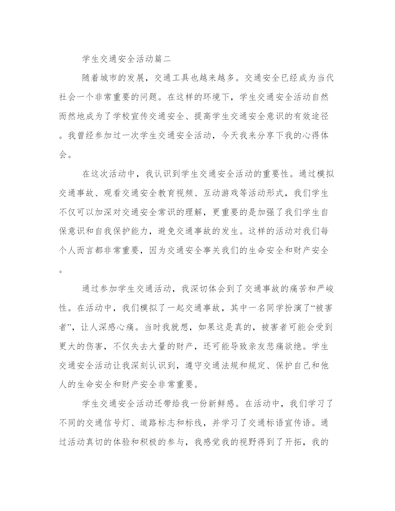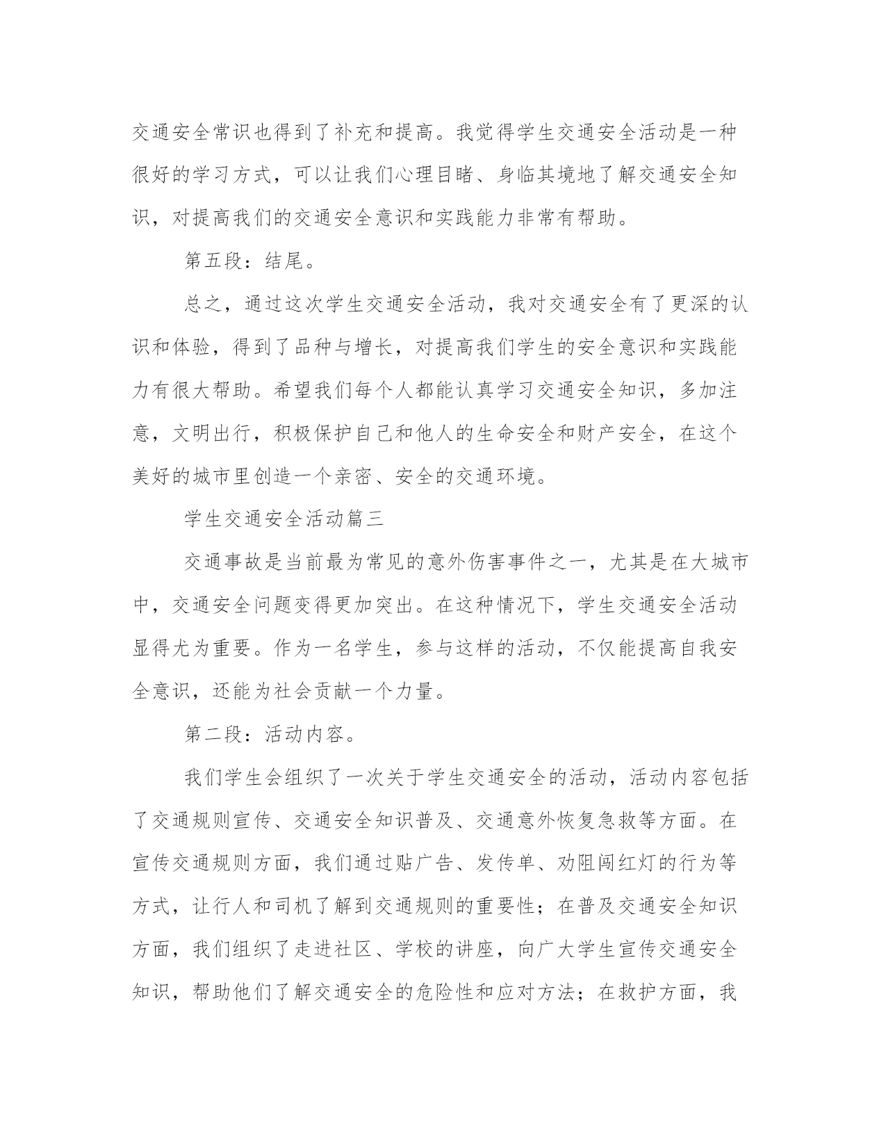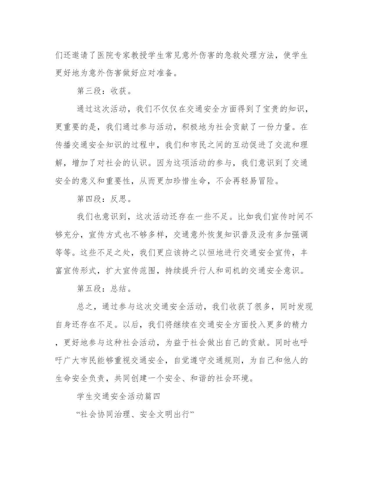 学生交通安全活动范文(18篇)在总结中,我们可以发现自己的不足之处,找到改进的方向。深入分析自己在任务中的优势和不足,进行全面反思是写一篇完美总结的必要环节。"以下是一些总结的典型案例,希望对你的写作提供一些思路和参考。"学生交通安全活动篇一一.班会背景:人流、物流、车流的快速增长,是国家经济发展、市场繁荣、人民生活水平提高的必然趋势。然而事物的另一面却向世人昭示:我国已经进入道路交通事故的高发期。日前我国道路交通安全形势十分严峻:事故持续上升,伤亡惨重,损失巨大,为了贯彻落实公安部、教育部关于加强中小学校交通安全工作的通知精神,继续进一步搞好我校的交通安全教育,减少交通违章,杜绝交通事故,特上一节关于交通安全的主题班会。二.班会目的:1、透过惨痛的教训让同学们铭记交通安全的重要性。2、透过丰富多彩的活动,让同学们学习了解交通法规并学会自我保护。3、与交警互动,培养学生的社会职责感,学做交通小卫士。三、班会设计:本节班会将采用讲解、竞答、小品和现场互动等形式,对学生进行交通安全的教育,并利用多媒体课件进行辅助教学,使学生体会生命的可贵,交通安全的重要性,掌握各类交通安全知识,并在活动过程中逐步渗透群众主义、社会职责感教育。四、活动准备;1、让学生搜集有关交通安全的反面和正面的事例和图片。3、组织学生排练有关节目。4、制作相关课件。五.班会流程:开场白(主持人):尊敬的各位来宾、教师,同学们,早上好!这天是全国中小学安全教育日,我们武汉市75中初二(1)班守护生命——交通安全主题班会此刻开始!第一篇章惨痛教训铭记在心。播放天堂里是否有车来车往mtv。主持人:这是一个令人扼腕叹息的故事,一个十三岁的花季少女,如花的生。命就这样葬送在滚滚车流之中。然而更可悲的是类似的杯具每一天都在上演。(ppt)出示两组交通事故图片,由主持人讲解。(ppt)出示一组交通事故的数据。主持人:这一个个触目惊心、血泪交织的杯具不能不叫人悲泪横流、心有余悸;上天赋予每个人的生命仅有一次,极其脆弱的一旦消逝就永不再来的生命多么需要我们用心守护!同学们:一人安全,全家幸福;生命至上,安全为天;安全第一,预防为主,预防之道,重在学习。让我们认真学习交通知识,自觉遵守交通法规。第二篇章学习交通法规,学会自我保护。主持人:此刻进入交通安全知识竞答环节(竞赛活动)。主持人:我们是21世纪的主力军;我们是跨世纪的接班人,我是展翅高飞的雏鹰;我们是社会的小主人。建设城市交通礼貌,事关你我他!(ppt)播放75中资料视频(主持人进行解说)。我们75中是交通安全示范校,向来有普及交通安全知识的好传统,每一个75中人都为此感到骄傲和自豪。此刻请丁斐扬同学代表学校向全班同学发出倡议。主持人:现代礼貌城市,需要大家具备现代交通意识。您请!我让!高风格。礼貌、畅通、有秩序。为了让交通事故远离我们,为了让交通杯具不再发生,让我们庄严承诺:(全体起立)。严格遵守交通规则,建设安全、畅通、礼貌的交通环境!从我做起;从身边做起;从此刻做起,走礼貌路、做礼貌人,做维护交通的小卫士!主持人:交通安全主题班会到此结束,多谢大家。学生交通安全活动篇二随着城市的发展,交通工具也越来越多。交通安全已经成为当代社会一个非常重要的问题。在这样的环境下,学生交通安全活动自然而然地成为了学校宣传交通安全、提高学生交通安全意识的有效途径。我曾经参加过一次学生交通安全活动,今天我来分享下我的心得体会。在这次活动中,我认识到学生交通安全活动的重要性。通过模拟交通事故、观看交通安全教育视频、互动游戏等活动形式,我们学生不仅可以加深对交通安全常识的理解,更重要的是加强了我们学生自保意识和自我保护能力,避免交通事故的发生。这样的活动对我们每个人而言都非常重要,因为交通安全事关我们的生命安全和财产安全。通过参加学生交通活动,我深切体会到了交通事故的痛苦和严峻性。在活动中,我们模拟了一起交通事故,其中一名同学扮演了“被害者”,让人深感心痛。当时我就想,如果这是真的,被害者可能会受到更大的伤害,不仅失去大量的财产,还可能导致亲友悲痛欲绝。学生交通安全活动让我深刻认识到,遵守交通法规和规定、保护自己和他人的生命安全和财产安全非常重要。学生交通安全活动还带给我一份新鲜感。在活动中,我们学习了不同的交通信号灯、道路标志和标线,并学习了交通标语宣传语。通过活动真切的体验和积极的参与,我感觉我的视野得到了开拓,我的交通安全常识也得到了补充和提高。我觉得学生交通安全活动是一种很好的学习方式,可以让我们心理目睹、身临其境地了解交通安全知识,对提高我们的交通安全意识和实践能力非常有帮助。第五段:结尾。总之,通过这次学生交通安全活动,我对交通安全有了更深的认识和体验,
