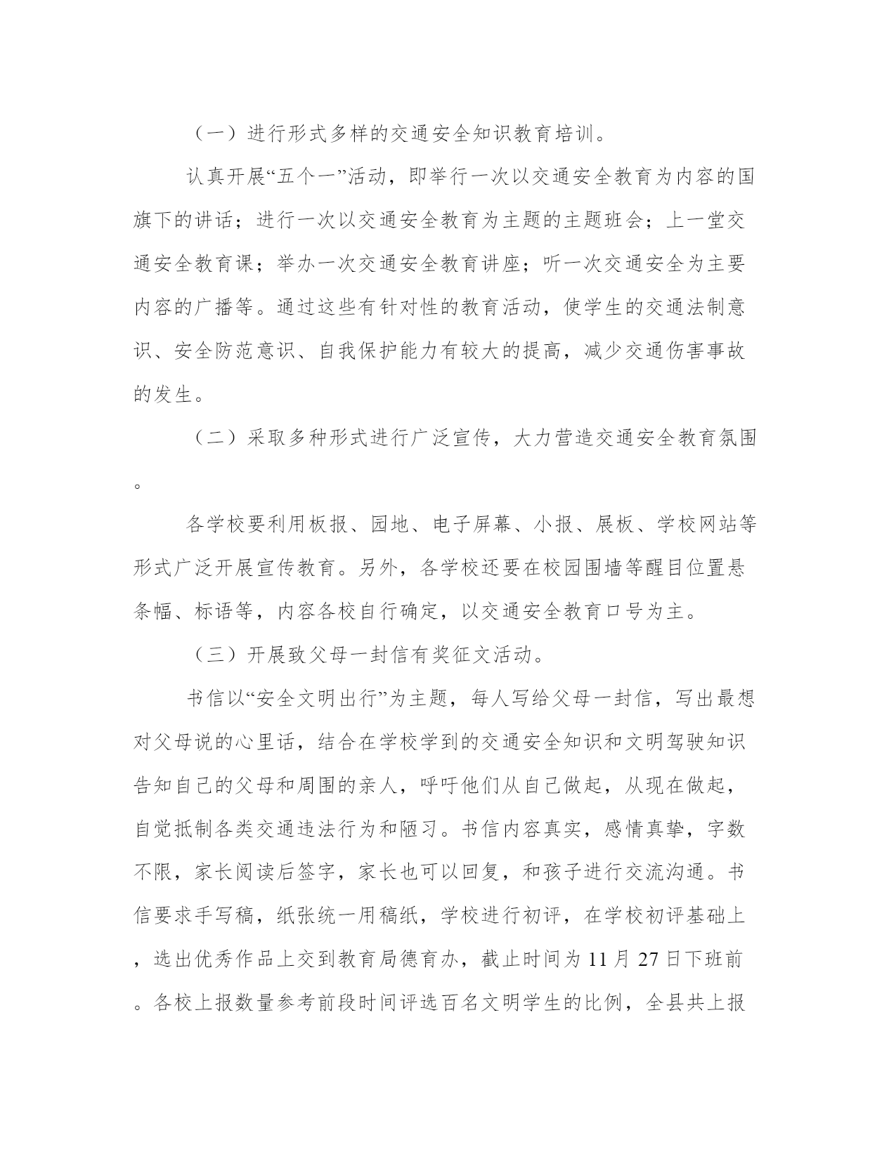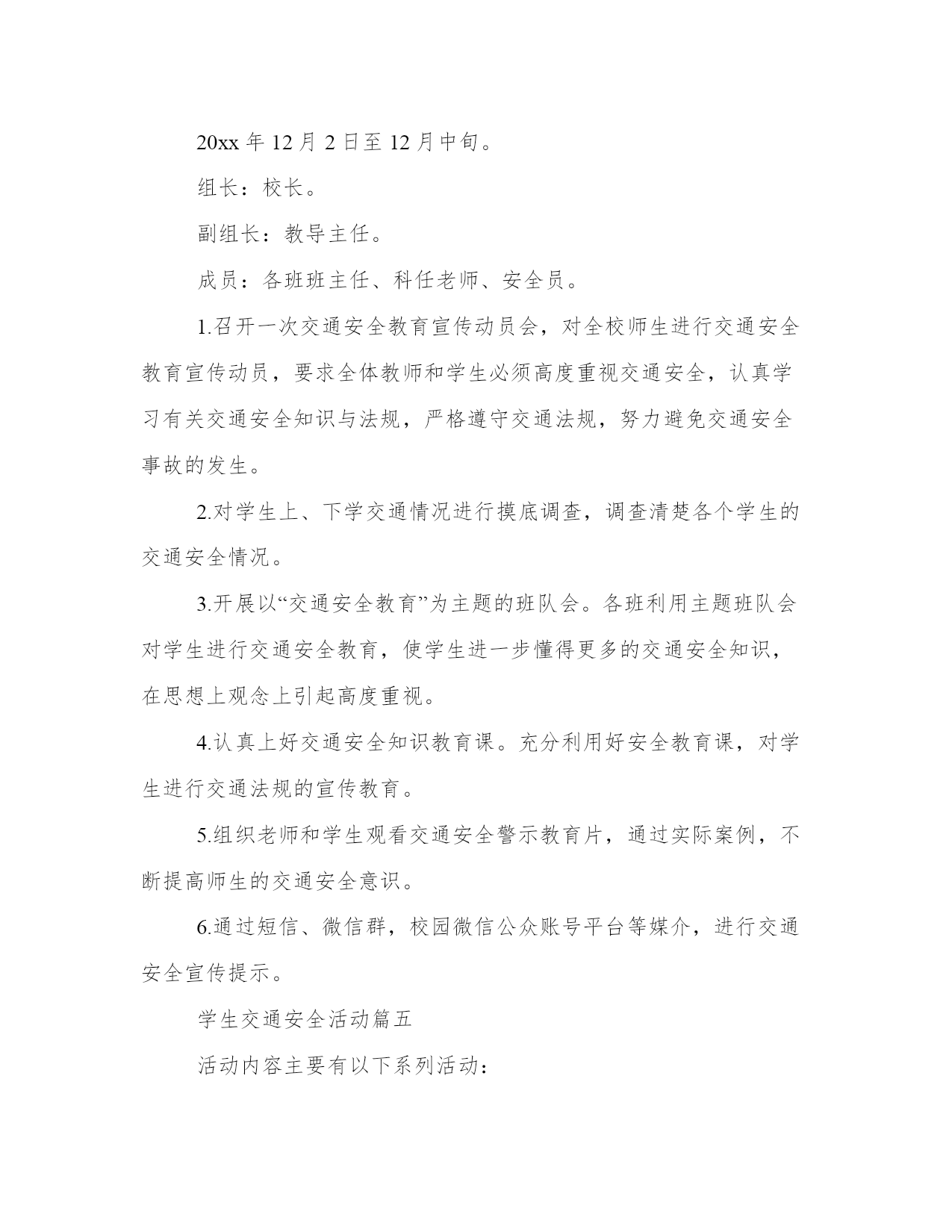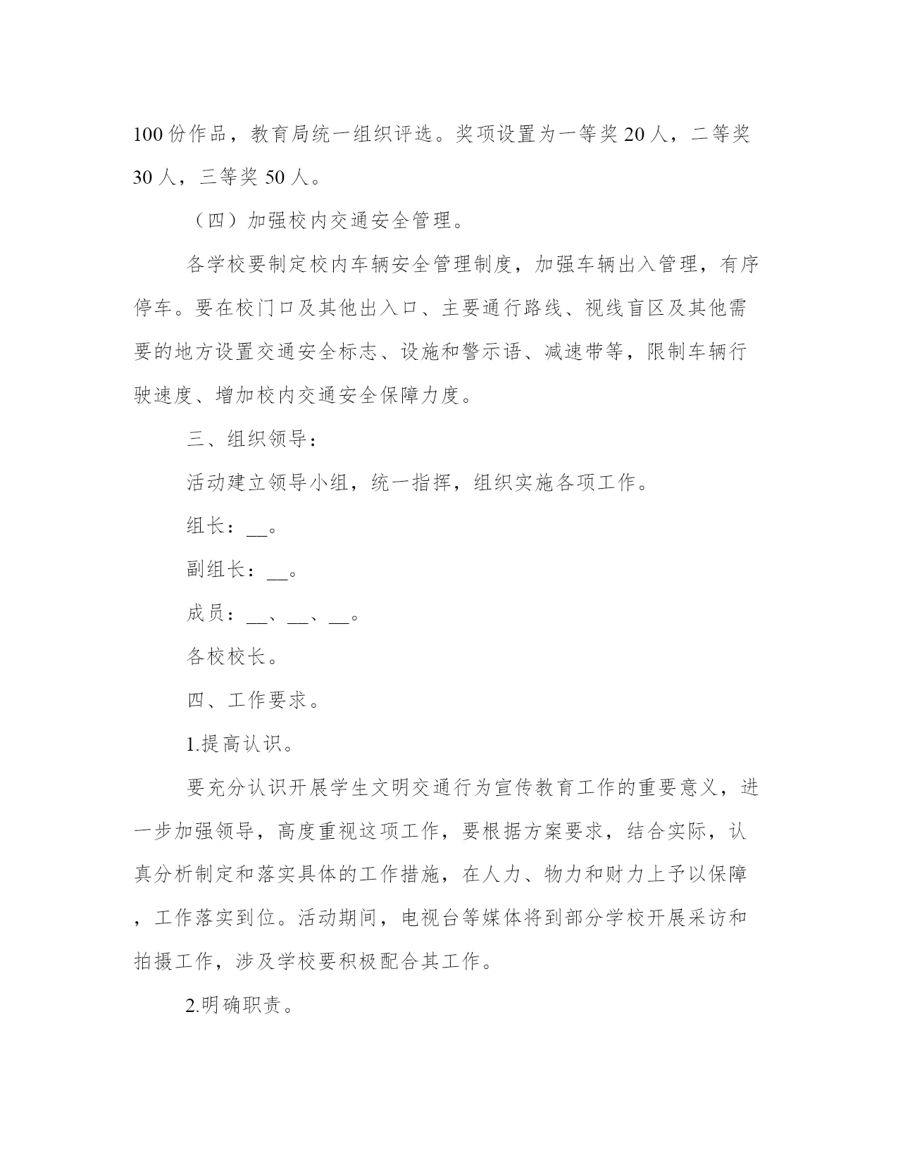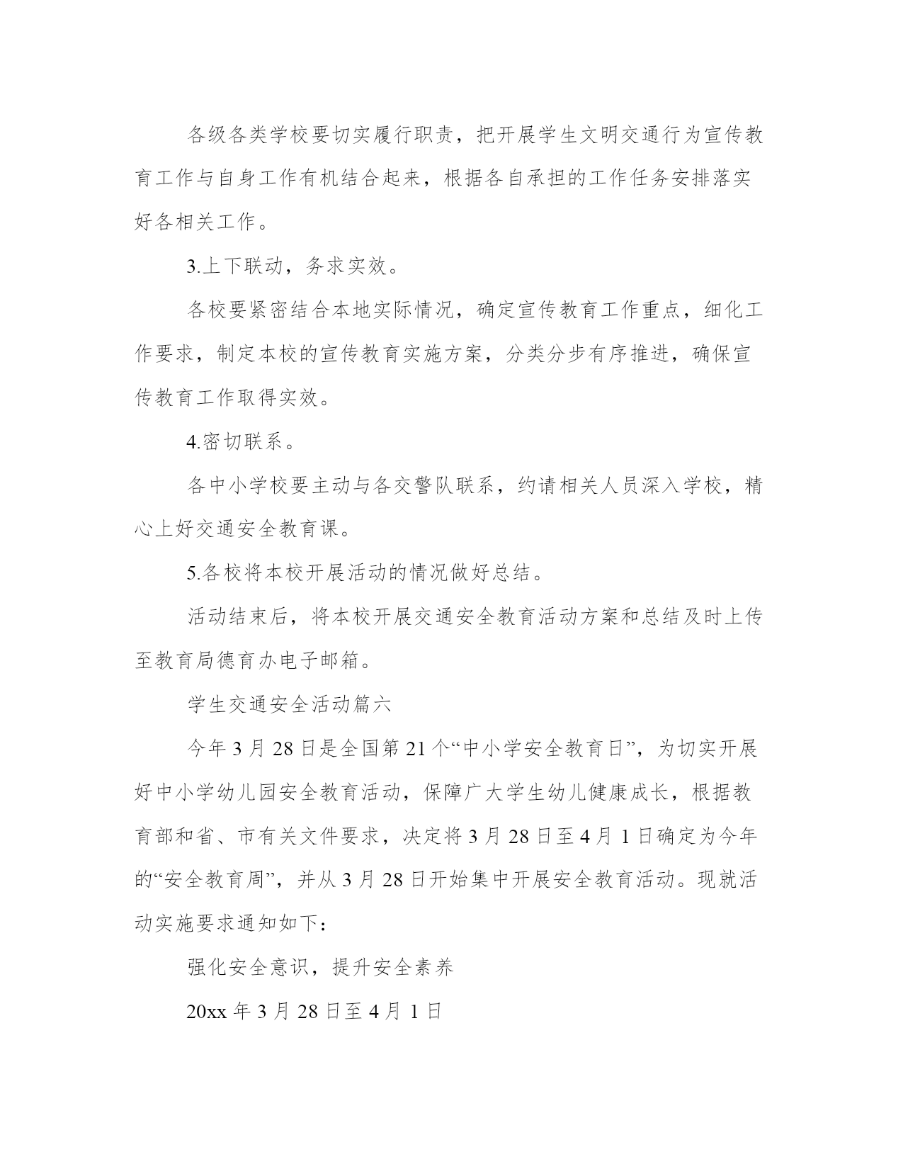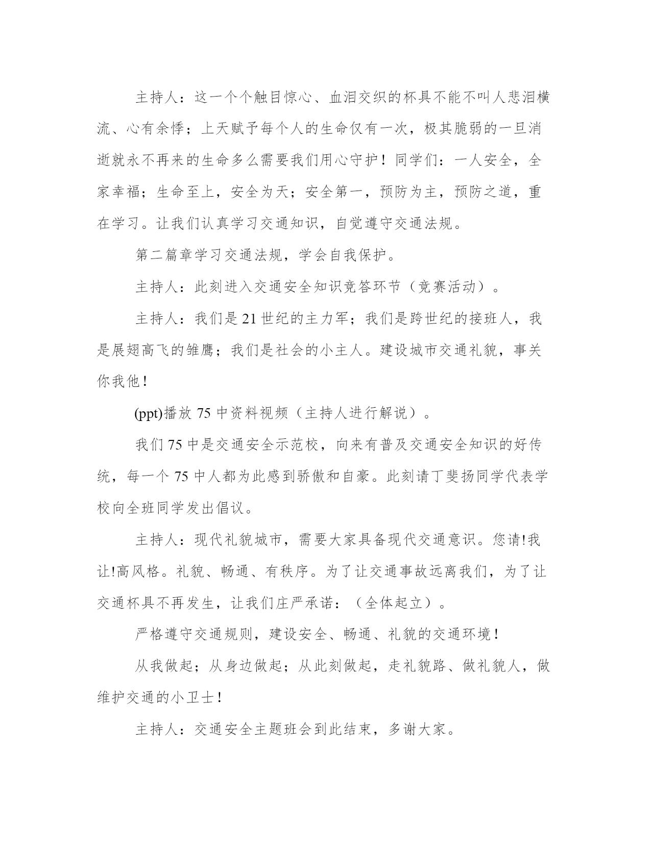 学生交通安全活动范文(18篇)在总结中,我们可以发现自己的不足之处,找到改进的方向。深入分析自己在任务中的优势和不足,进行全面反思是写一篇完美总结的必要环节。"以下是一些总结的典型案例,希望对你的写作提供一些思路和参考。"学生交通安全活动篇一一.班会背景:人流、物流、车流的快速增长,是国家经济发展、市场繁荣、人民生活水平提高的必然趋势。然而事物的另一面却向世人昭示:我国已经进入道路交通事故的高发期。日前我国道路交通安全形势十分严峻:事故持续上升,伤亡惨重,损失巨大,为了贯彻落实公安部、教育部关于加强中小学校交通安全工作的通知精神,继续进一步搞好我校的交通安全教育,减少交通违章,杜绝交通事故,特上一节关于交通安全的主题班会。二.班会目的:1、透过惨痛的教训让同学们铭记交通安全的重要性。2、透过丰富多彩的活动,让同学们学习了解交通法规并学会自我保护。3、与交警互动,培养学生的社会职责感,学做交通小卫士。三、班会设计:本节班会将采用讲解、竞答、小品和现场互动等形式,对学生进行交通安全的教育,并利用多媒体课件进行辅助教学,使学生体会生命的可贵,交通安全的重要性,掌握各类交通安全知识,并在活动过程中逐步渗透群众主义、社会职责感教育。四、活动准备;1、让学生搜集有关交通安全的反面和正面的事例和图片。3、组织学生排练有关节目。4、制作相关课件。五.班会流程:开场白(主持人):尊敬的各位来宾、教师,同学们,早上好!这天是全国中小学安全教育日,我们武汉市75中初二(1)班守护生命——交通安全主题班会此刻开始!第一篇章惨痛教训铭记在心。播放天堂里是否有车来车往mtv。主持人:这是一个令人扼腕叹息的故事,一个十三岁的花季少女,如花的生。命就这样葬送在滚滚车流之中。然而更可悲的是类似的杯具每一天都在上演。(ppt)出示两组交通事故图片,由主持人讲解。(ppt)出示一组交通事故的数据。主持人:这一个个触目惊心、血泪交织的杯具不能不叫人悲泪横流、心有余悸;上天赋予每个人的生命仅有一次,极其脆弱的一旦消逝就永不再来的生命多么需要我们用心守护!同学们:一人安全,全家幸福;生命至上,安全为天;安全第一,预防为主,预防之道,重在学习。让我们认真学习交通知识,自觉遵守交通法规。第二篇章学习交通法规,学会自我保护。主持人:此刻进入交通安全知识竞答环节(竞赛活动)。主持人:我们是21世纪的主力军;我们是跨世纪的接班人,我是展翅高飞的雏鹰;我们是社会的小主人。建设城市交通礼貌,事关你我他!(ppt)播放75中资料视频(主持人进行解说)。我们75中是交通安全示范校,向来有普及交通安全知识的好传统,每一个75中人都为此感到骄傲和自豪。此刻请丁斐扬同学代表学校向全班同学发出倡议。主持人:现代礼貌城市,需要大家具备现代交通意识。您请!我让!高风格。礼貌、畅通、有秩序。为了让交通事故远离我们,为了让交通杯具不再发生,让我们庄严承诺:(全体起立)。严格遵守交通规则,建设安全、畅通、礼貌的交通环境!从我做起;从身边做起;从此刻做起,走礼貌路、做礼貌人,做维护交通的小卫士!主持人:交通安全主题班会到此结束,多谢大家。学生交通安全活动篇二随着城市的发展,交通工具也越来越多。交通安全已经成为当代社会一个非常重要的问题。在这样的环境下,学生交通安全活动自然而然地成为了学校宣传交通安全、提高学生交通安全意识的有效途径。我曾经参加过一次学生交通安全活动,今天我来分享下我的心得体会。在这次活动中,我认识到学生交通安全活动的重要性。通过模拟交通事故、观看交通安全教育视频、互动游戏等活动形式,我们学生不仅可以加深对交通安全常识的理解,更重要的是加强了我们学生自保意识和自我保护能力,避免交通事故的发生。这样的活动对我们每个人而言都非常重要,因为交通安全事关我们的生命安全和财产安全。通过参加学生交通活动,我深切体会到了交通事故的痛苦和严峻性。在活动中,我们模拟了一起交通事故,其中一名同学扮演了“被害者”,让人深感心痛。当时我就想,如果这是真的,被害者可能会受到更大的伤害,不仅失去大量的财产,还可能导致亲友悲痛欲绝。学生交通安全活动让我深刻认识到,遵守交通法规和规定、保护自己和他人的生命安全和财产安全非常重要。学生交通安全活动还带给我一份新鲜感。在活动中,我们学习了不同的交通信号灯、道路标志和标线,并学习了交通标语宣传语。通过活动真切的体验和积极的参与,我感觉我的视野得到了开拓,我的交通安全常识也得到了补充和提高。我觉得学生交通安全活动是一种很好的学习方式,可以让我们心理目睹、身临其境地了解交通安全知识,对提高我们的交通安全意识和实践能力非常有帮助。第五段:结尾。总之,通过这次学生交通安全活动,我对交通安全有了更深的认识和体验,