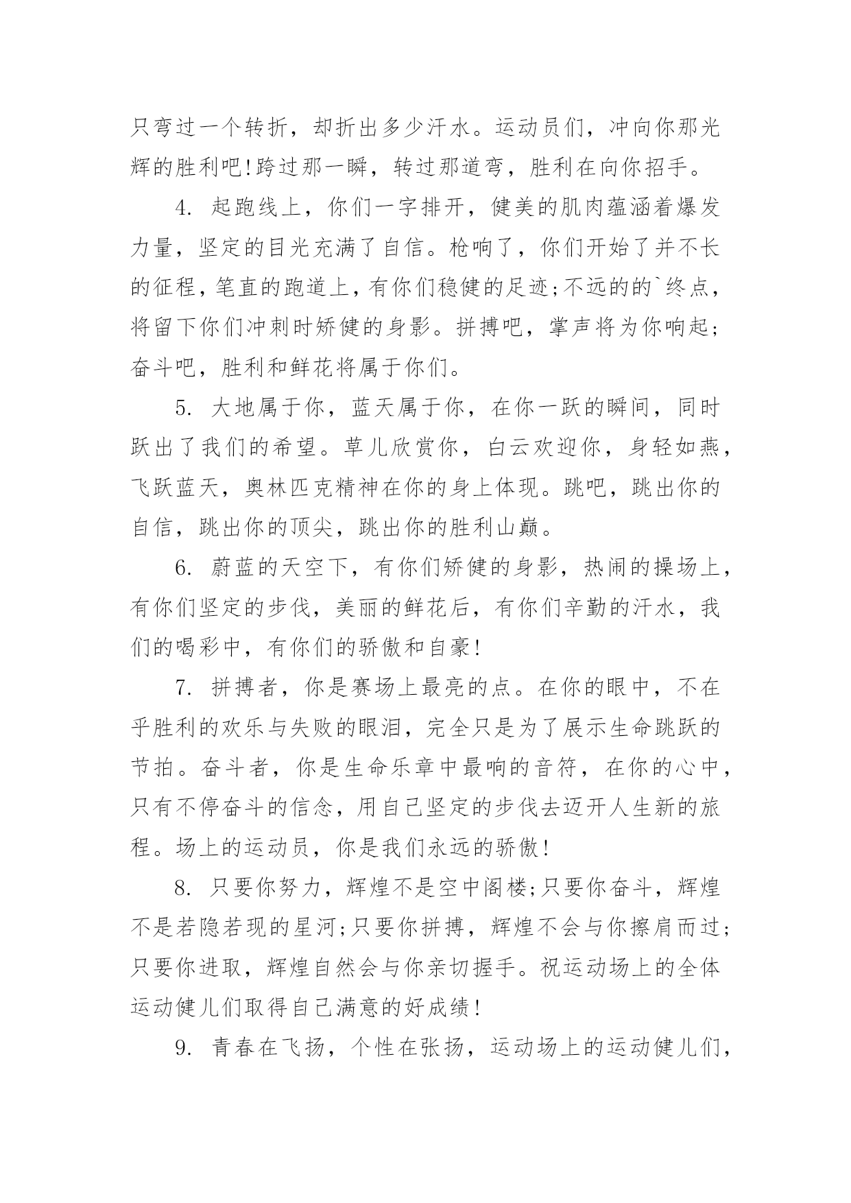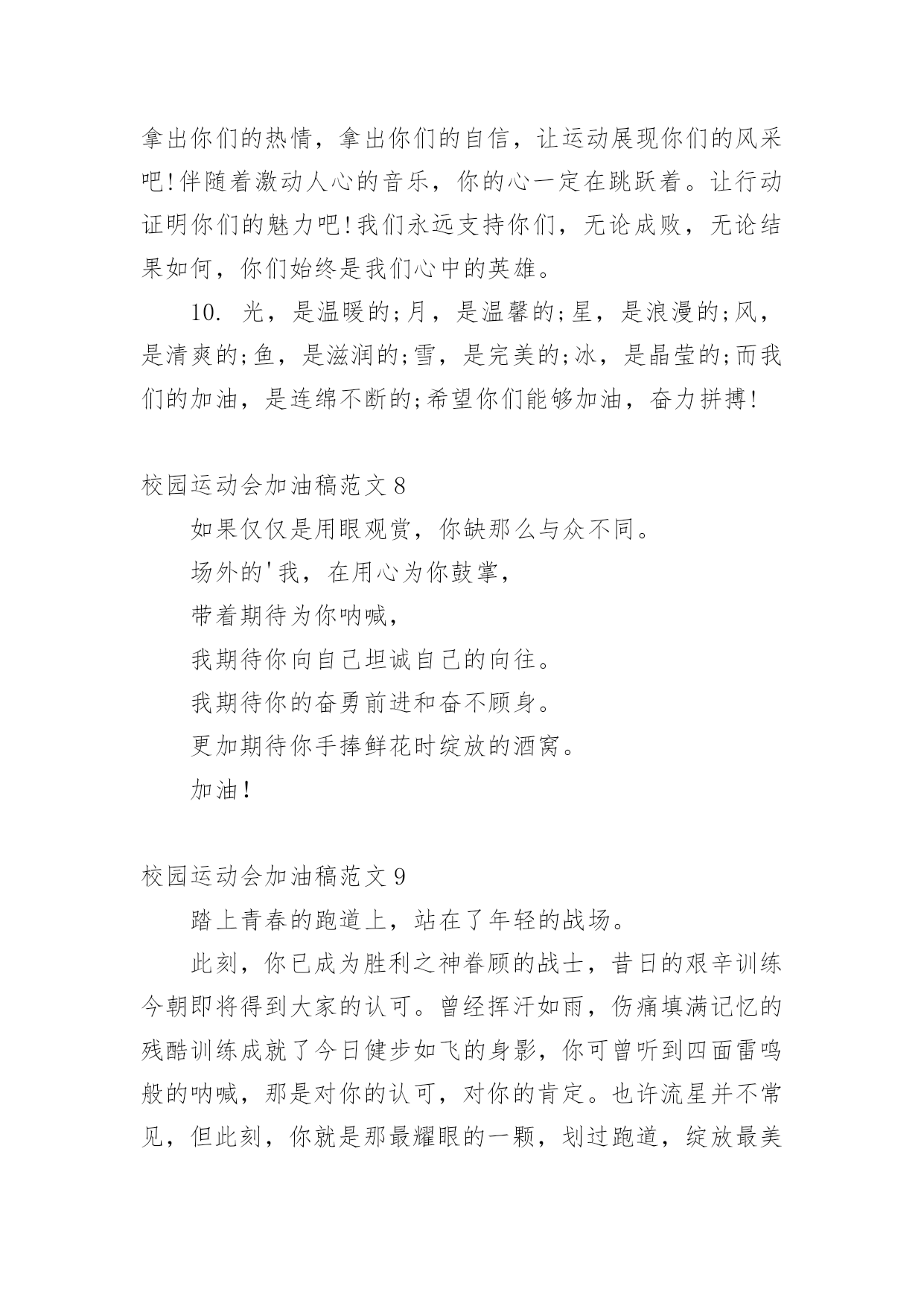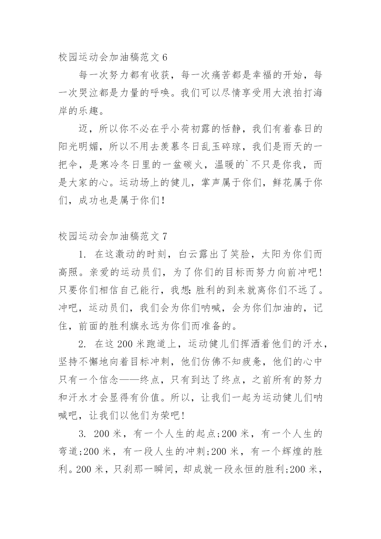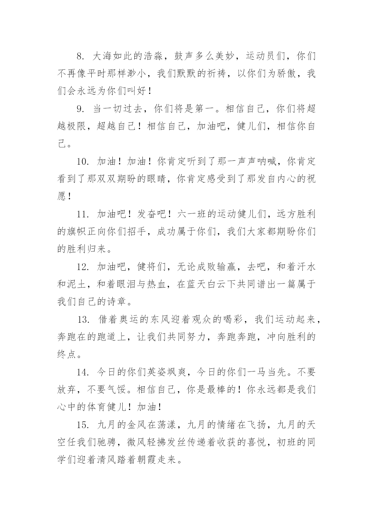 校园运动会加油稿校园运动会加油稿范文随着社会不断地进步,我们用到加油稿的地方越来越多,加油稿是鼓励激励对方的文稿。那么,怎么去写加油稿呢?以下是小编为大家收集的校园运动会加油稿范文,希望对大家有所帮助。校园运动会加油稿范文1在运动场上,你勇敢而英勇。你在运动场上挣扎。面对漫长的旅程,你没有恐惧,也没有退缩。让汗水浸湿后背,让疲劳爬满全身,你还在努力追赶,目标只有一个,只有一个信念。为了班级的荣誉,去争取吧,让我为你呐喊!校园运动会加油稿范文2这是意志力之拼搏。这是速度之挑战。胜利正在前方向你们招手。只因始终相信,去拼搏才能取得最后胜利。总在鼓舞自己,要成功就得努力。无论第几坚持胜利的信心,只要跑下来,你们就是英雄。迸发你全部的能量,成功是你汗水的写照。力量,信念,拼搏与奋斗,在遥远的`终点线上渐渐明亮。踏上跑道,是一种选择。离开起点,是一种勇气。驰骋赛场,是一种胜利。在乎汗水和泪水用勇往拼搏。加油!我们支持你。拼搏吧。奋斗是你的极至你在挑战极限运动健儿,冲刺吧。加油!你是最棒的。心中的信念只有一个:拼搏!用实力精神去开拓出,属于你的长跑天地。校园运动会加油稿范文3温暖的阳光洒在赛场上,男子1000米比赛即将开始。赛场上,一道道优美的弧线将轻盈地划过天空。健儿们用手中的标枪向距离的权限发起一轮又一轮的挑战。标枪在空中轻盈的姿态,是健儿们强健的力量和熟练的技巧的`结合。谁能在这场激烈的竞争中获胜?让我们拭目以待,让我们为他们呐喊助威吧!只有将力量与技巧合二为一的人,才能获得胜利的桂冠!白色的跑道是你运动的轨迹,台上的呐喊是对你拼搏的肯定。这是耐力与意志的检验,超载自我,挑战自我是你的目标,当你体验过从他人身边攸勿而过时,你将再次获得新的感悟,那是自我人生价值的体现,更是为班级争夺荣誉的自豪,拼搏吧!努力吧!运动健儿们,胜利就在眼前,男儿,我们不言放弃。校园运动会加油稿范文4沙坑中那忽大忽小,忽远忽近的脚印,都是你一跃而起的美丽成绩!不论深浅,不论远近,那都是你为目标而奋斗的'结晶!在你跃起的那一瞬间,你的想法只有一个,那就是在那片沙坑上留下你美丽的脚印,你总是为了那个目标奋勇而起,为着那个目标,加油吧!跳远运动员们,那个属于你的脚印永远不会被拭去,那个惊叹号永远属于你!校园运动会加油稿范文5不去经受风雨,就无法见到彩虹;不去接受考验,就无法知道胜利;不付出艰辛的劳作,就无法取得成功。亲爱的运动员们,昨天资你们洒下了汗水,今天便是收获的季节。虽然我们不一定成为冠军,但我们的付出便是一种财富,一种别人永远无法得到的财富。骄阳下,我们昂起头,风沙中,我们擦亮眼眸。任凭炙热的阳光留下我们的汗水,任凭炎炎夏日拂去春的凉爽。用自己富有的`双手开拓美好的前景。艰难险阻也许会伴随我们,但我们意志坚定,因为我们相信我们的未来不是梦!校园运动会加油稿范文6每一次努力都有收获,每一次痛苦都是幸福的开始,每一次哭泣都是力量的呼唤。我们可以尽情享受用大浪拍打海岸的乐趣。迈,所以你不必在乎小荷初露的恬静,我们有着春日的阳光明媚,所以不用去羡慕冬日乱玉碎琼,我们是雨天的一把伞,是寒冷冬日里的一盆碳火,温暖的`不只是你我,而是大家的心。运动场上的健儿,掌声属于你们,鲜花属于你们,成功也是属于你们!校园运动会加油稿范文71.在这激动的时刻,白云露出了笑脸,太阳为你们而高照。亲爱的运动员们,为了你们的目标而努力向前冲吧!只要你们相信自己能行,我想:胜利的到来就离你们不远了。冲吧,运动员们,我们会为你们呐喊,会为你们加油的,记住,前面的胜利旗永远为你们而准备的。2.在这200米跑道上,运动健儿们挥洒着他们的汗水,坚持不懈地向着目标冲刺,他们仿佛不知疲惫,他们的心中只有一个信念——终点,只有到达了终点,之前所有的努力和汗水才会显得有价值。所以,让我们一起为运动健儿们呐喊吧,让我们以他们为荣吧!3.200米,有一个人生的起点;200米,有一个人生的弯道;200米,有一段人生的冲刺;200米,有一个辉煌的胜利。200米,只刹那一瞬间,却成就一段永恒的胜利;200米,只弯过一个转折,却折出多少汗水。运动员们,冲向你那光辉的胜利吧!跨过那一瞬,转过那道弯,胜利在向你招手。4.起跑线上,你们一字排开,健美的肌肉蕴涵着爆发力量,坚定的目光充满了自信。枪响了,你们开始了并不长的征程,笔直的跑道上,有你们稳健的足迹;不远的的`终点,将留下你们冲刺时矫健的身影。拼搏吧,掌声将为你响起;奋斗吧,胜利和鲜花将属于你们。5.大地属于你,蓝天属于你,在你一跃的瞬间,同时跃出了我们的希望。草儿欣赏你,白云欢迎你,身轻如燕,飞跃蓝天,奥林匹克精神在你的身上体现。跳吧,跳出你的自信,跳出你的顶尖,跳出你的胜利山巅。6.蔚蓝的天空下,有你们矫健的身影,热闹的操场上,有你们坚定的步伐,美丽的鲜花后,有