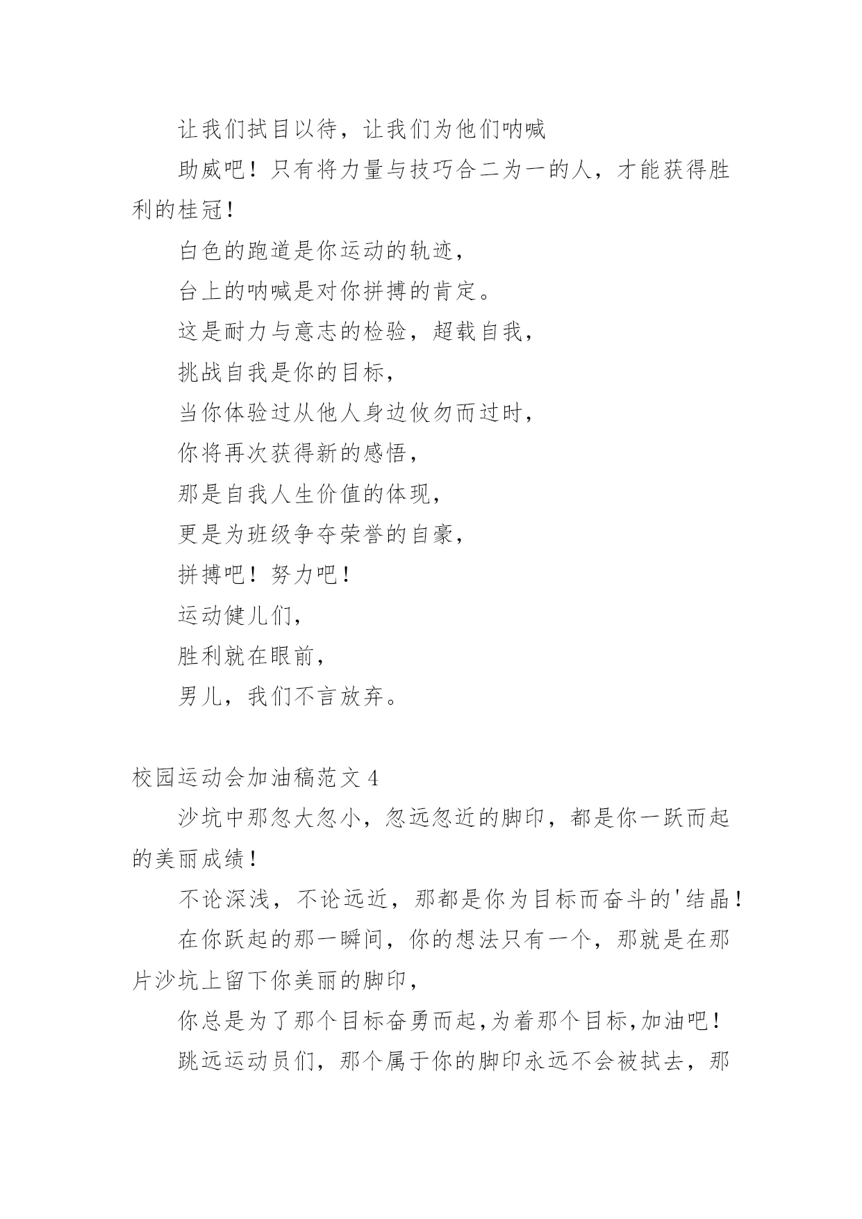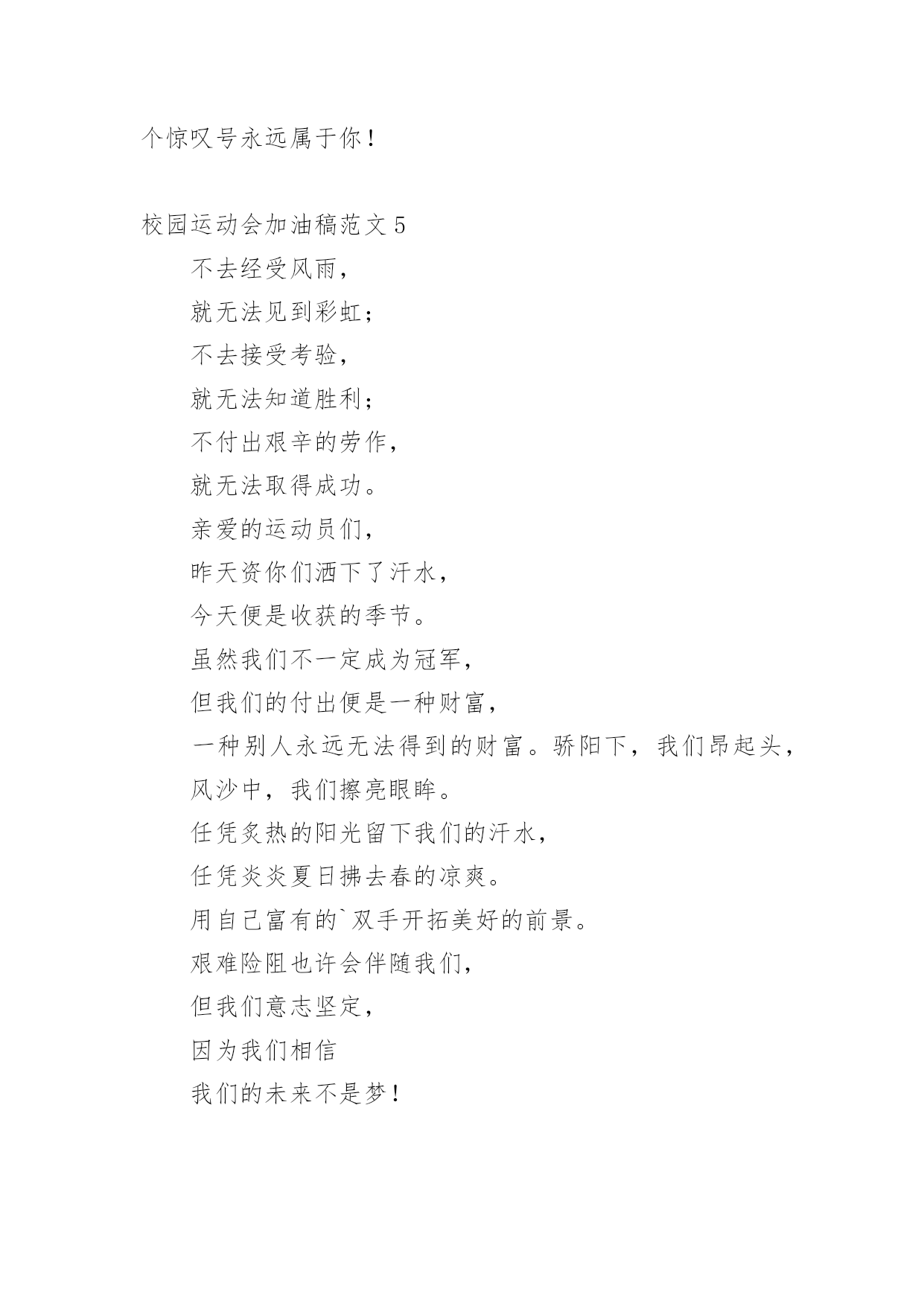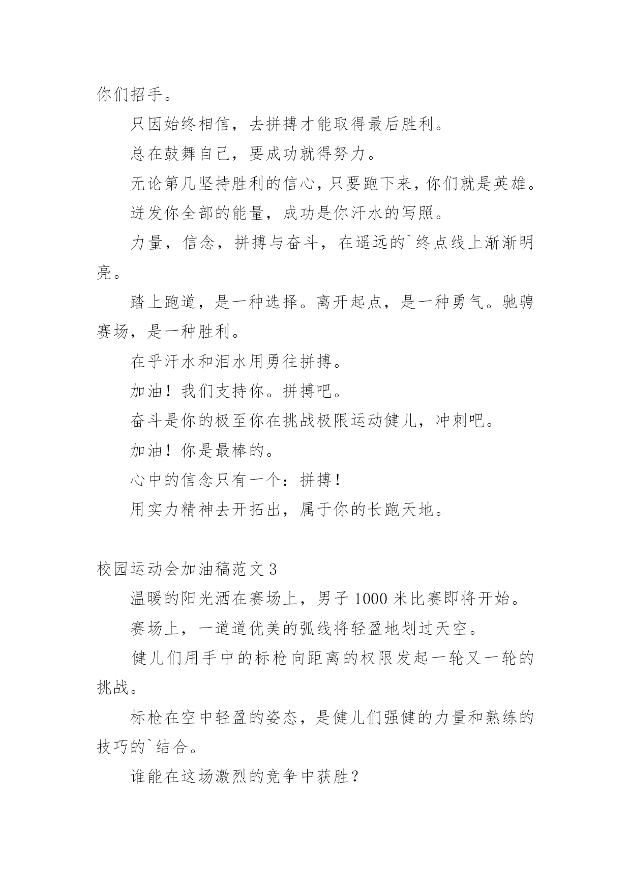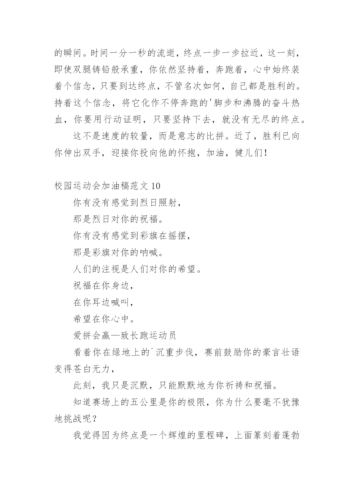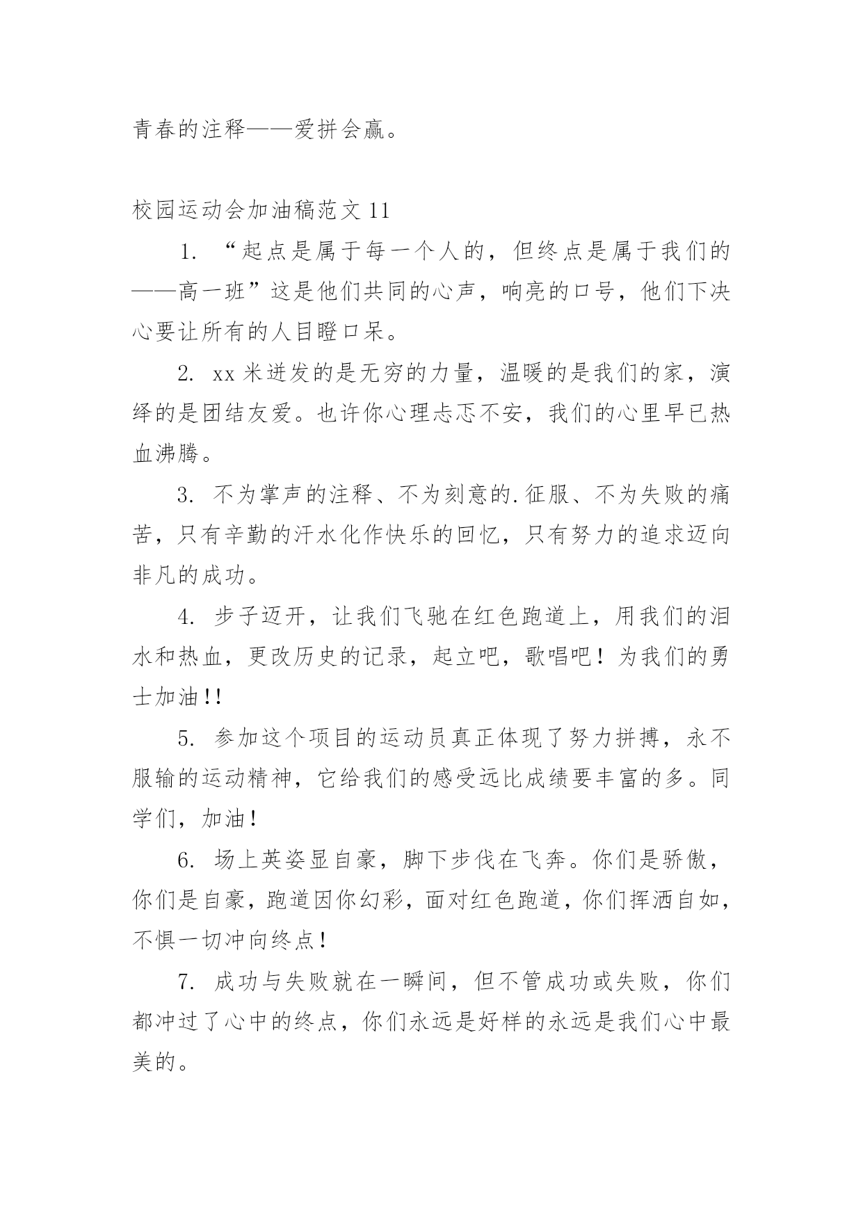 校园运动会加油稿校园运动会加油稿范文随着社会不断地进步,我们用到加油稿的地方越来越多,加油稿是鼓励激励对方的文稿。那么,怎么去写加油稿呢?以下是小编为大家收集的校园运动会加油稿范文,希望对大家有所帮助。校园运动会加油稿范文1在运动场上,你勇敢而英勇。你在运动场上挣扎。面对漫长的旅程,你没有恐惧,也没有退缩。让汗水浸湿后背,让疲劳爬满全身,你还在努力追赶,目标只有一个,只有一个信念。为了班级的荣誉,去争取吧,让我为你呐喊!校园运动会加油稿范文2这是意志力之拼搏。这是速度之挑战。胜利正在前方向你们招手。只因始终相信,去拼搏才能取得最后胜利。总在鼓舞自己,要成功就得努力。无论第几坚持胜利的信心,只要跑下来,你们就是英雄。迸发你全部的能量,成功是你汗水的写照。力量,信念,拼搏与奋斗,在遥远的`终点线上渐渐明亮。踏上跑道,是一种选择。离开起点,是一种勇气。驰骋赛场,是一种胜利。在乎汗水和泪水用勇往拼搏。加油!我们支持你。拼搏吧。奋斗是你的极至你在挑战极限运动健儿,冲刺吧。加油!你是最棒的。心中的信念只有一个:拼搏!用实力精神去开拓出,属于你的长跑天地。校园运动会加油稿范文3温暖的阳光洒在赛场上,男子1000米比赛即将开始。赛场上,一道道优美的弧线将轻盈地划过天空。健儿们用手中的标枪向距离的权限发起一轮又一轮的挑战。标枪在空中轻盈的姿态,是健儿们强健的力量和熟练的技巧的`结合。谁能在这场激烈的竞争中获胜?让我们拭目以待,让我们为他们呐喊助威吧!只有将力量与技巧合二为一的人,才能获得胜利的桂冠!白色的跑道是你运动的轨迹,台上的呐喊是对你拼搏的肯定。这是耐力与意志的检验,超载自我,挑战自我是你的目标,当你体验过从他人身边攸勿而过时,你将再次获得新的感悟,那是自我人生价值的体现,更是为班级争夺荣誉的自豪,拼搏吧!努力吧!运动健儿们,胜利就在眼前,男儿,我们不言放弃。校园运动会加油稿范文4沙坑中那忽大忽小,忽远忽近的脚印,都是你一跃而起的美丽成绩!不论深浅,不论远近,那都是你为目标而奋斗的'结晶!在你跃起的那一瞬间,你的想法只有一个,那就是在那片沙坑上留下你美丽的脚印,你总是为了那个目标奋勇而起,为着那个目标,加油吧!跳远运动员们,那个属于你的脚印永远不会被拭去,那个惊叹号永远属于你!校园运动会加油稿范文5不去经受风雨,就无法见到彩虹;不去接受考验,就无法知道胜利;不付出艰辛的劳作,就无法取得成功。亲爱的运动员们,昨天资你们洒下了汗水,今天便是收获的季节。虽然我们不一定成为冠军,但我们的付出便是一种财富,一种别人永远无法得到的财富。骄阳下,我们昂起头,风沙中,我们擦亮眼眸。任凭炙热的阳光留下我们的汗水,任凭炎炎夏日拂去春的凉爽。用自己富有的`双手开拓美好的前景。艰难险阻也许会伴随我们,但我们意志坚定,因为我们相信我们的未来不是梦!校园运动会加油稿范文6每一次努力都有收获,每一次痛苦都是幸福的开始,每一次哭泣都是力量的呼唤。我们可以尽情享受用大浪拍打海岸的乐趣。迈,所以你不必在乎小荷初露的恬静,我们有着春日的阳光明媚,所以不用去羡慕冬日乱玉碎琼,我们是雨天的一把伞,是寒冷冬日里的一盆碳火,温暖的`不只是你我,而是大家的心。运动场上的健儿,掌声属于你们,鲜花属于你们,成功也是属于你们!校园运动会加油稿范文71.在这激动的时刻,白云露出了笑脸,太阳为你们而高照。亲爱的运动员们,为了你们的目标而努力向前冲吧!只要你们相信自己能行,我想:胜利的到来就离你们不远了。冲吧,运动员们,我们会为你们呐喊,会为你们加油的,记住,前面的胜利旗永远为你们而准备的。2.在这200米跑道上,运动健儿们挥洒着他们的汗水,坚持不懈地向着目标冲刺,他们仿佛不知疲惫,他们的心中只有一个信念——终点,只有到达了终点,之前所有的努力和汗水才会显得有价值。所以,让我们一起为运动健儿们呐喊吧,让我们以他们为荣吧!3.200米,有一个人生的起点;200米,有一个人生的弯道;200米,有一段人生的冲刺;200米,有一个辉煌的胜利。200米,只刹那一瞬间,却成就一段永恒的胜利;200米,只弯过一个转折,却折出多少汗水。运动员们,冲向你那光辉的胜利吧!跨过那一瞬,转过那道弯,胜利在向你招手。4.起跑线上,你们一字排开,健美的肌肉蕴涵着爆发力量,坚定的目光充满了自信。枪响了,你们开始了并不长的征程,笔直的跑道上,有你们稳健的足迹;不远的的`终点,将留下你们冲刺时矫健的身影。拼搏吧,掌声将为你响起;奋斗吧,胜利和鲜花将属于你们。5.大地属于你,蓝天属于你,在你一跃的瞬间,同时跃出了我们的希望。草儿欣赏你,白云欢迎你,身轻如燕,飞跃蓝天,奥林匹克精神在你的身上体现。跳吧,跳出你的自信,跳出你的顶尖,跳出你的胜利山巅。6.蔚蓝的天空下,有你们矫健的身影,热闹的操场上,有你们坚定的步伐,美丽的鲜花后,有