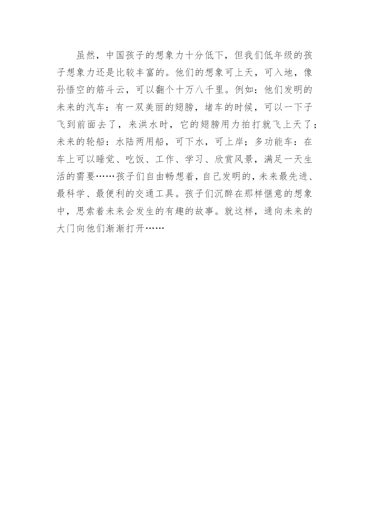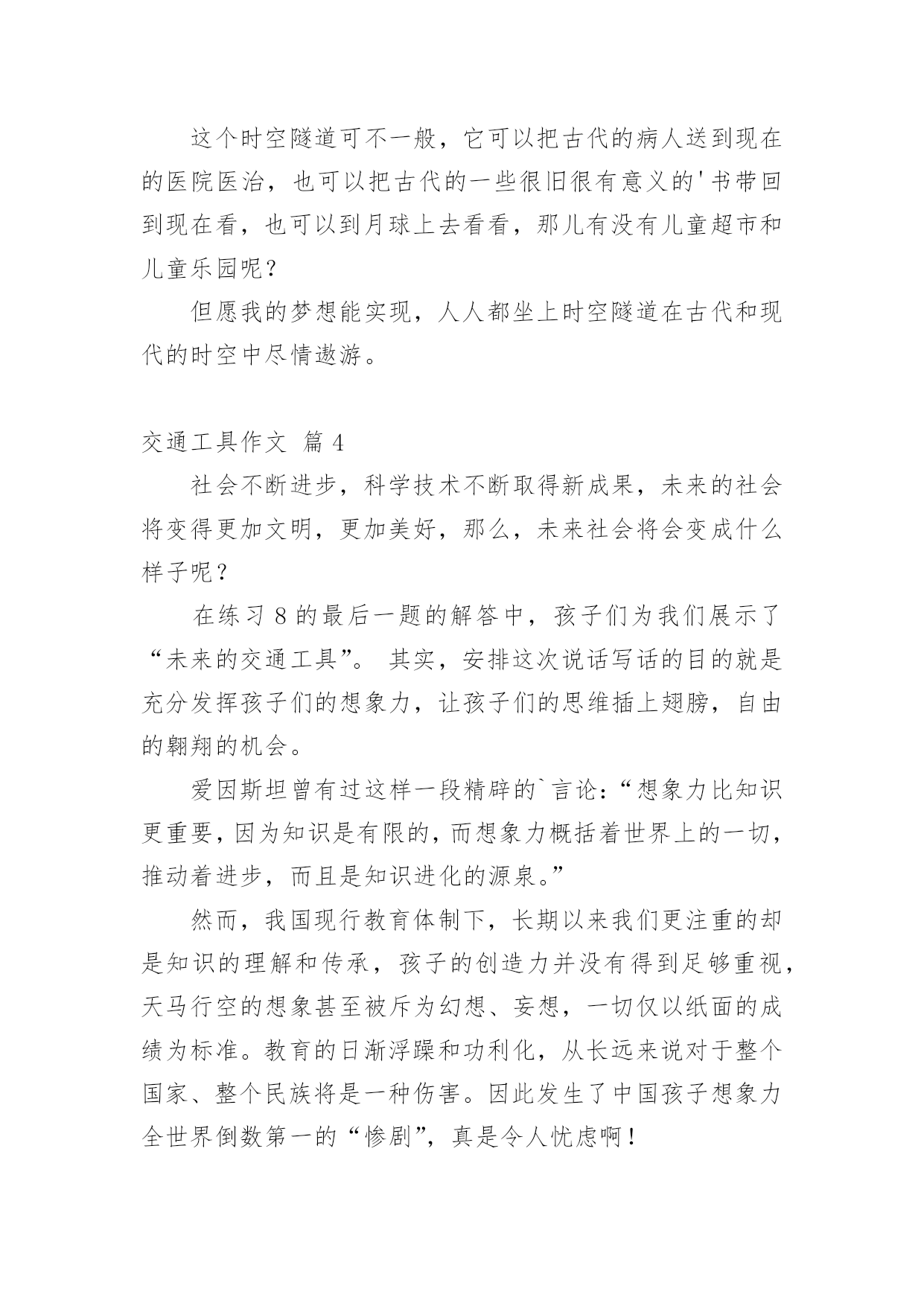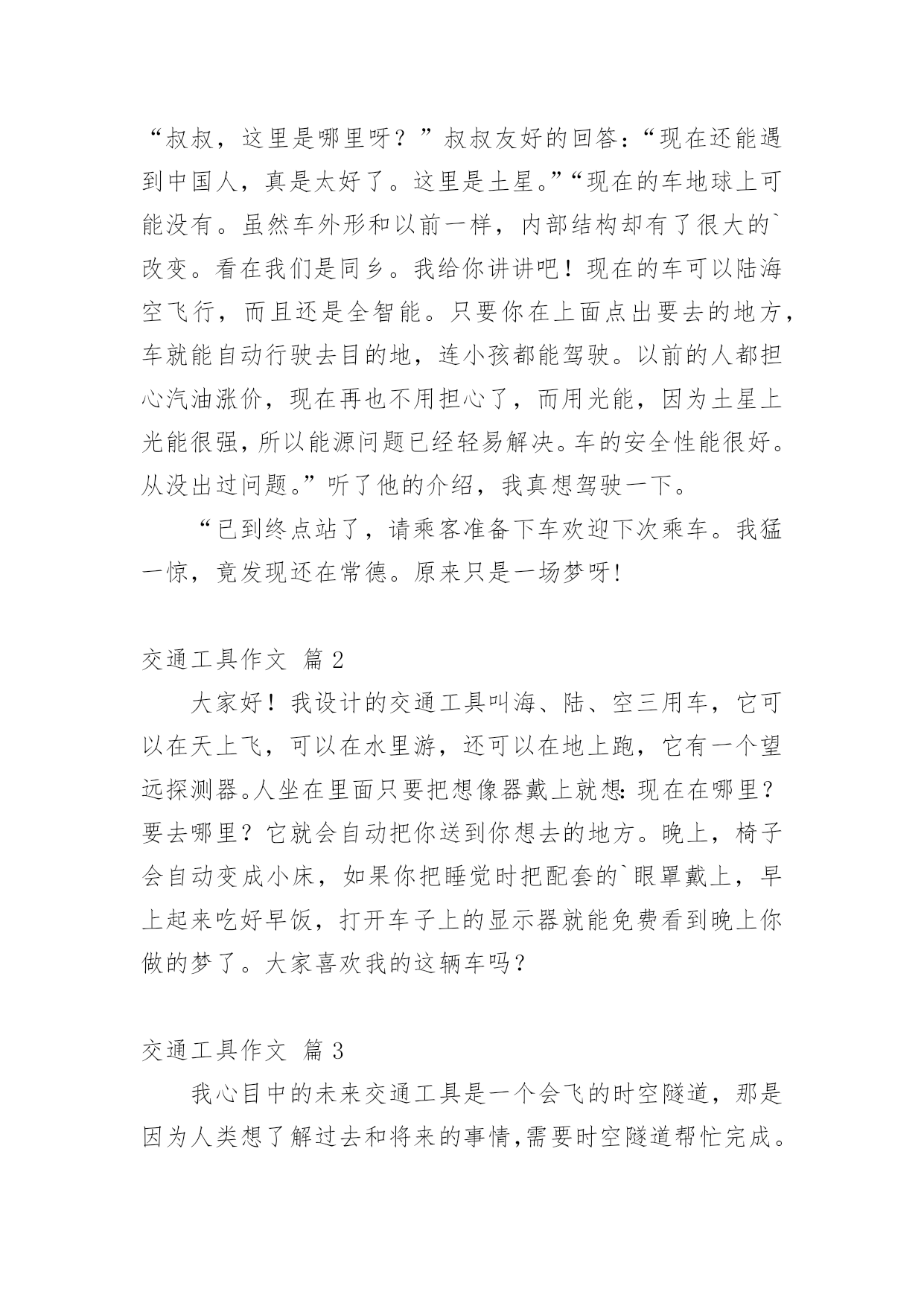 交通工具作文【实用】交通工具作文无论是身处学校还是步入社会,大家都写过作文吧,借助作文可以宣泄心中的情感,调节自己的心情。你写作文时总是无从下笔?以下是小编为大家整理的交通工具作文4篇,仅供参考,欢迎大家阅读。交通工具作文篇1早上,我正准备坐1路公交车去外婆家。突然,路上塞车很严重,我不知道怎么办,只能等路通了走。我望向前面,塞了很长的车,还不知道要多久才能通车。等着等着,不知不觉,我便进入了梦乡。醒来后,我发现自己依然在公交车上。可公交车却不是在地上行驶,而是在天空飞行。我惊讶地叫出声来,周围的人都用异样的眼光看着我。我走过去,对着一位大姐姐,用标准的常德话问道:“姐姐,这是哪里。”听完我的话,那姐姐却说了许多我听不懂的语言。我唯一听到的就是三零一二。难道我穿越了,而且还是一千年后?车到了终点站。我下了车,顿时被眼前的景象惊呆了车子有的在天上飞,有的在水里游更令我惊讶的是,有些车竟然是小朋友驾驶的。难道现在国家准许18岁以下的人开车了吗?太奇怪了。我来到一家车店。想打听、打听,找到许多我不明白的问题的答案。我进了车店。向前台的叔叔问道:“叔叔,这里是哪里呀?”叔叔友好的回答:“现在还能遇到中国人,真是太好了。这里是土星。”“现在的车地球上可能没有。虽然车外形和以前一样,内部结构却有了很大的`改变。看在我们是同乡。我给你讲讲吧!现在的车可以陆海空飞行,而且还是全智能。只要你在上面点出要去的地方,车就能自动行驶去目的地,连小孩都能驾驶。以前的人都担心汽油涨价,现在再也不用担心了,而用光能,因为土星上光能很强,所以能源问题已经轻易解决。车的安全性能很好。从没出过问题。”听了他的介绍,我真想驾驶一下。“已到终点站了,请乘客准备下车欢迎下次乘车。我猛一惊,竟发现还在常德。原来只是一场梦呀!交通工具作文篇2大家好!我设计的交通工具叫海、陆、空三用车,它可以在天上飞,可以在水里游,还可以在地上跑,它有一个望远探测器。人坐在里面只要把想像器戴上就想:现在在哪里?要去哪里?它就会自动把你送到你想去的地方。晚上,椅子会自动变成小床,如果你把睡觉时把配套的`眼罩戴上,早上起来吃好早饭,打开车子上的显示器就能免费看到晚上你做的梦了。大家喜欢我的这辆车吗?交通工具作文篇3我心目中的未来交通工具是一个会飞的时空隧道,那是因为人类想了解过去和将来的事情,需要时空隧道帮忙完成。这个时空隧道可不一般,它可以把古代的病人送到现在的医院医治,也可以把古代的一些很旧很有意义的'书带回到现在看,也可以到月球上去看看,那儿有没有儿童超市和儿童乐园呢?但愿我的梦想能实现,人人都坐上时空隧道在古代和现代的时空中尽情遨游。交通工具作文篇4社会不断进步,科学技术不断取得新成果,未来的社会将变得更加文明,更加美好,那么,未来社会将会变成什么样子呢?在练习8的最后一题的解答中,孩子们为我们展示了“未来的交通工具”。其实,安排这次说话写话的目的就是充分发挥孩子们的想象力,让孩子们的思维插上翅膀,自由的翱翔的机会。爱因斯坦曾有过这样一段精辟的`言论:“想象力比知识更重要,因为知识是有限的,而想象力概括着世界上的一切,推动着进步,而且是知识进化的源泉。”然而,我国现行教育体制下,长期以来我们更注重的却是知识的理解和传承,孩子的创造力并没有得到足够重视,天马行空的想象甚至被斥为幻想、妄想,一切仅以纸面的成绩为标准。教育的日渐浮躁和功利化,从长远来说对于整个国家、整个民族将是一种伤害。因此发生了中国孩子想象力全世界倒数第一的“惨剧”,真是令人忧虑啊!虽然,中国孩子的想象力十分低下,但我们低年级的孩子想象力还是比较丰富的。他们的想象可上天,可入地,像孙悟空的筋斗云,可以翻个十万八千里。例如:他们发明的未来的汽车:有一双美丽的翅膀,堵车的时候,可以一下子飞到前面去了,来洪水时,它的翅膀用力拍打就飞上天了;未来的轮船:水陆两用船,可下水,可上岸;多功能车:在车上可以睡觉、吃饭、工作、学习、欣赏风景,满足一天生活的需要……孩子们自由畅想着,自己发明的,未来最先进、最科学、最便利的交通工具。孩子们沉醉在那样惬意的想象中,思索着未来会发生的有趣的故事。就这样,通向未来的大门向他们渐渐打开……