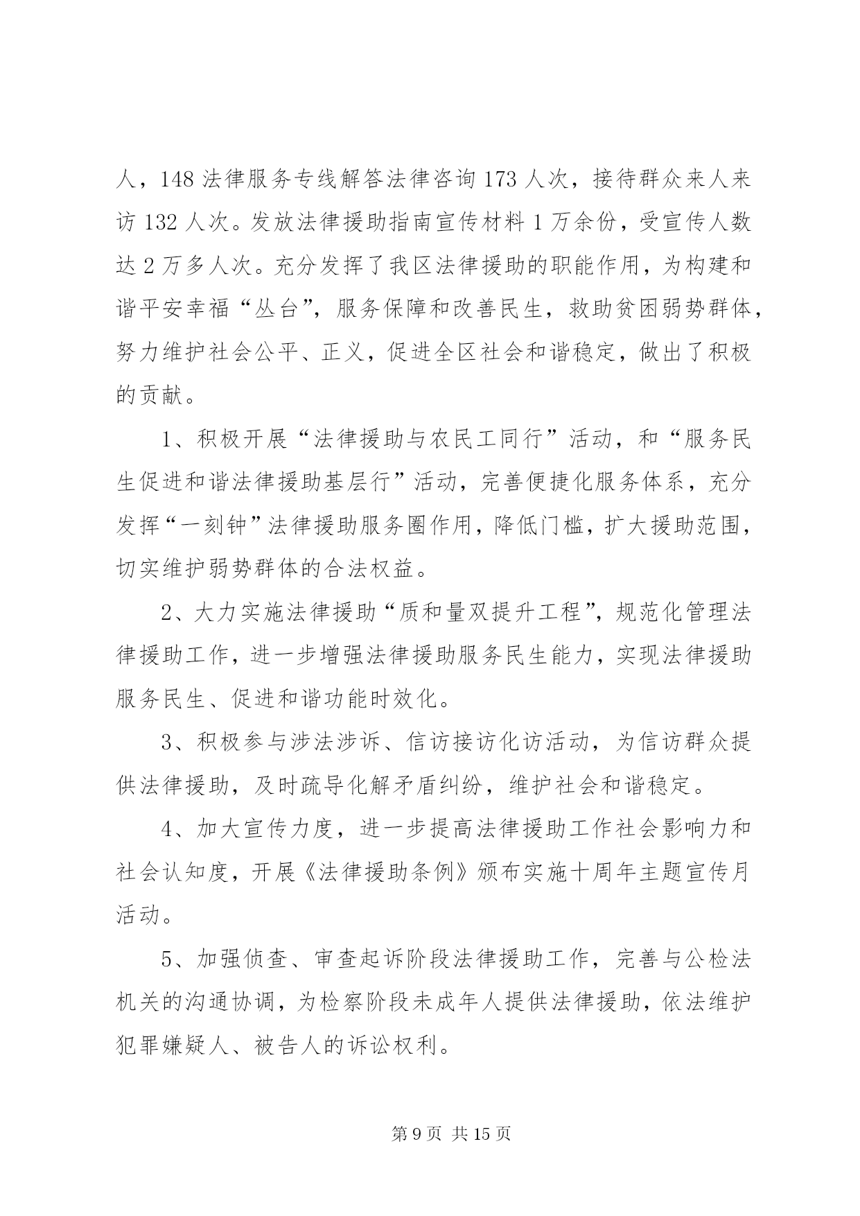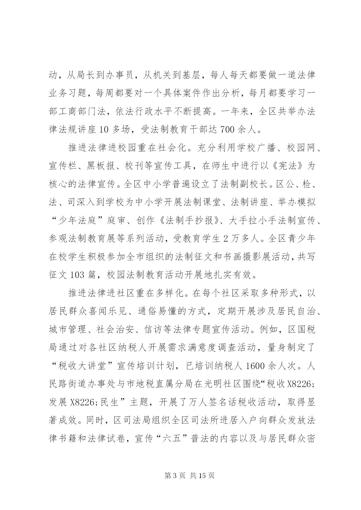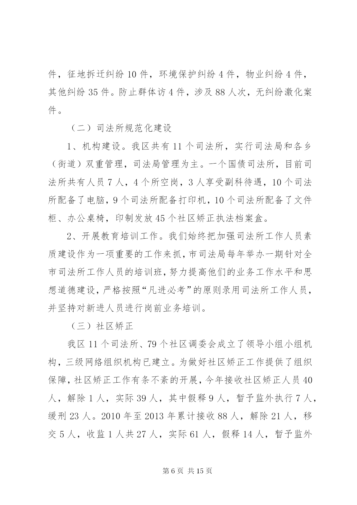 第PAGE\*Arabic\*MERGEFORMAT15页共NUMPAGES\*MERGEFORMAT15页区司法局工作总结报告一、普法依法治理工作坚持把普法依法治理工作作为提高全民法律素质、推进依法行政的重要抓手,认真贯彻国家和省、市关于普法依法治理工作各项决策部署,狠抓“六五”普法各项工作的落实,不断创新工作思路,创新工作方法,全区干部群众学法、懂法、守法、护法的法律素质和法治意识不断增强,依法行政的法治氛围不断浓厚,为全区经济社会发展和打造幸福丛台营造了良好的法治环境。(一)精心组织、周密部署,全面完成“六五”普法中期检查督导验收工作。1、层层动员,统一思想。为了切实提高全区广大干部群众对“六五”普法中期督导检查验收工作的认识,抓好工作的落实,今年上半年区政府第十五次常务会对我区“六五”普法中期检查督导验收工作进行了安排部署,各部门各单位认真落实会议精神及时安排本单位、本系统、本行业的“六五”普法中期检查督导验收自查工作。2、严格标准,保证质量。以提高总结验收工作的质量为出发点,以完善“六五”普法工作为落脚点,结合xx区工作实际,区普法办制定《乡街“六五”普法中期检查督导自查标准》、《区直部门“六五”普法中期检查督导自查标准》。并以普法办名义下发全区,使我区普法依法治理工作逐步走向规范化、制度化。3、查漏补缺,全面推进。全区各部门、各单位按照自查标准的整体部署,围绕“三树立、三提高”目标实现情况,本着缺什么补什么的原则,认真开展自查,对查出的问题及时进行改进和完善。4、顺利通过市“六五”普法中期检查督导验收。2013年7月2日,我区顺利通过市“六五”普法中期检查督导验收,市验收团对我区的“六五”普法工作开展情况给予高度评价:一是领导重视,普法经费到位,实效效果明显,总体普法工作扎实有效;二是立足实际,彰显特色,具有较好的地域代表性;三是思路开阔,注重创新,有效地丰富了基层普法依法治理的方法和手段,为全市“六五”普法工作提供了鲜活的经验和做法。(二)试点带动,创新形式,扎实开展“法律八进”活动。一年来,我区将法律进机关、进乡村、进社区、进家庭、进单位、进学校、进企业、进市场“法律八进”活动作为深入开展“六五”普法重要抓手,把法律进机关、进社区、进校园作为突破口,以建立示范点为切入点,推动了“六五”普法的阶段性工作。推进法律进机关重在规范化。我区制定了《党员干部“六五”普法期间学法活动实施意见》,全区各单位把党员干部学法用法纳入干部培训计划,形成制度,进一步明确学习目标和要求。例如,区工商局开展的“一日一题、一周一案、一月一法”学法活动,从局长到办事员,从机关到基层,每人每天都要做一道法律业务习题,每周都要对一个具体案件作出分析,每月都要学习一部工商部门法,依法行政水平不断提高。一年来,全区共举办法律法规讲座10多场,受法制教育干部达700余人。推进法律进校园重在社会化。充分利用学校广播、校园网、宣传栏、黑板报、校刊等宣传工具,在师生中进行以《宪法》为核心的法律宣传。全区中小学普遍设立了法制副校长。区公、检、法、司深入到学校为中小学开展法制课堂、法制讲座、举办模拟“少年法庭”庭审、创作《法制手抄报》、大手拉小手法制宣传、参观法制教育展等系列活动,受教育学生2万多人。全区青少年在校学生积极参加全市组织的法制征文和书画摄影展活动,共写征文103篇,校园法制教育活动开展地扎实有效。推进法律进社区重在多样化。在每个社区采取多种形式,以居民群众喜闻乐见、通俗易懂的方式,定期开展涉及居民自治、城市管理、社会治安、信访等法律专题宣传活动。例如,区国税局通过对各社区纳税人开展需求满意度调查活动,量身制定了“税收大讲堂”宣传培训计划,已培训纳税人1600余人次。人民路街道办事处与市地税直属分局在光明社区围绕“税收X8226;发展X8226;民生”主题,开展了万人签名话税收活动,取得显著成效。同时,区司法局组织全区司法所进居入户向群众发放法律书籍和法律试卷,宣传“六五”普法的内容以及与居民群众密切相关的法律法规,共发放读本2800册、试卷12000份,收到了较好的社会效果。(三)普治并举,力求实效,全力推进依法治区和法治政府建设。1、积极开展“法治八建”创建活动。将“法律八进”活动深化为“法治八建”,制定下发了《关于深化“法律八进”开展“法治八建”创建活动的实施方案》。一年来,全区创建了区国税局、区工商局依法行政示范机关;创建了四季青街道窦庄社区、联西街道永新里社区民主法治示范社区;创建了丛台小学、展览路小学依法治校示范校;创建了1000多户学法守法示范家庭;创建了邯郸医疗器械厂诚信守法示范企业;创建了xx市意蓝德农产品市场公平守信示范市场。2、强化依法行政推进法治政府建设。区政府法律顾问组根据《xx区政府法律顾问组活