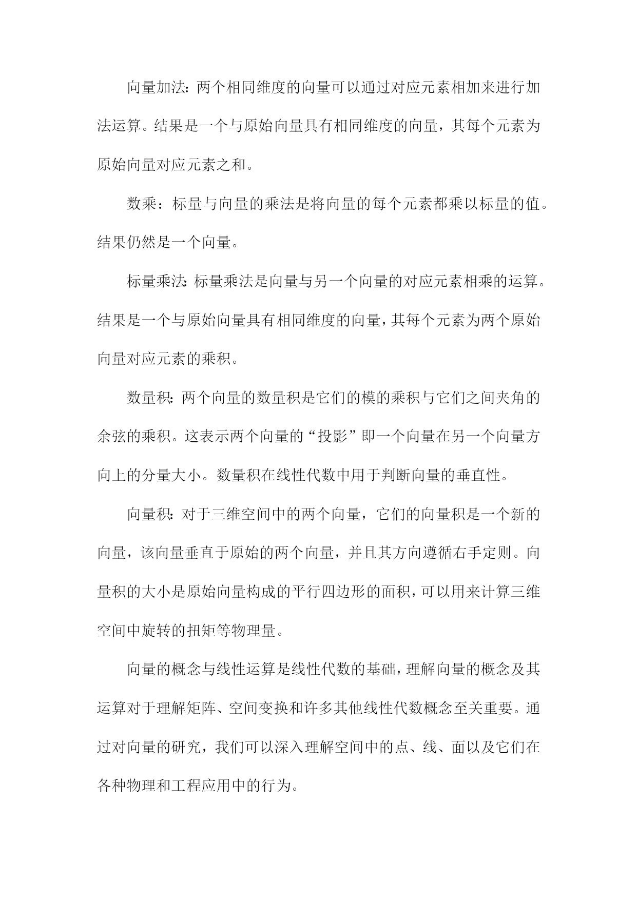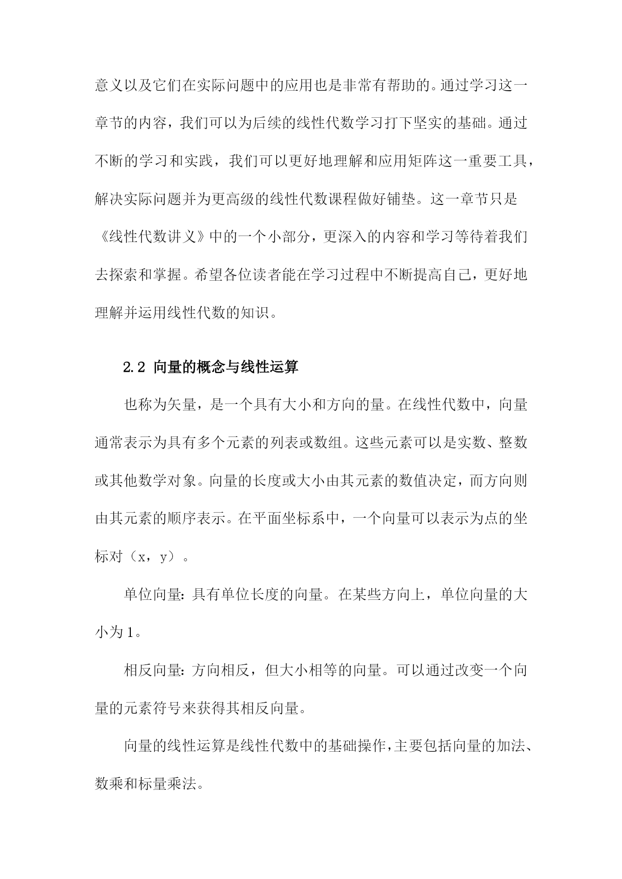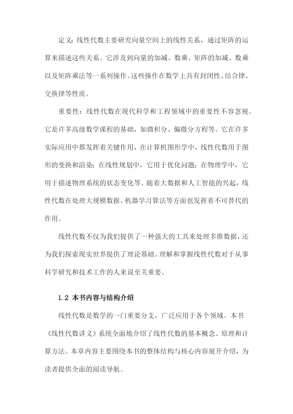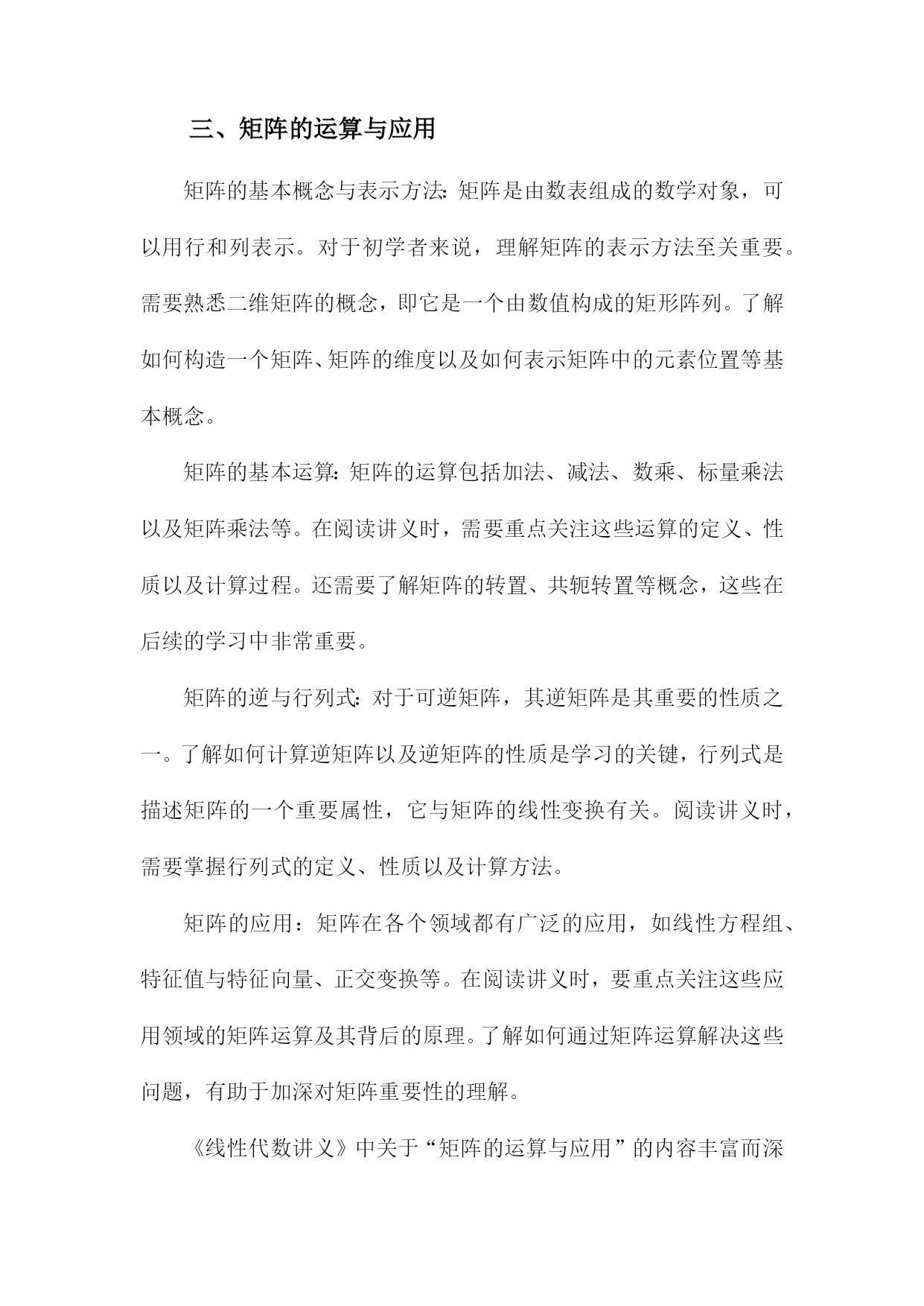 《线性代数讲义》阅读笔记一、概要《线性代数讲义》是一本关于线性代数学科的经典教材,涵盖了线性代数的基本概念和主要理论。本阅读笔记旨在概括该书的核心内容,以便读者快速了解本书的主要结构和知识点。本书首先介绍了线性代数的基本概念,包括向量、矩阵、线性方程组和线性变换等。深入探讨了向量空间、线性映射和行列式等核心概念,并通过具体实例和证明阐述了它们的性质和应用。书中还介绍了特征值和特征向量、正交性、线性代数在几何中的应用等重要内容。在阅读本书过程中,我深刻认识到线性代数作为一门数学工具的实用性。它不仅是许多科学领域的基础,而且在机器学习、数据分析等现代技术中发挥着重要作用。通过本书的学习,读者可以掌握线性代数的基本理论和计算方法,为今后的学习和工作打下坚实的基础。1.1线性代数的定义与重要性线性代数是一门研究线性空间、线性变换及其性质的重要数学分支。它是一个充满广泛应用价值的学科,渗透于各个领域之中,包括但不限于物理、工程、计算机科学和数学等。线性代数的主要研究对象是向量和矩阵,我们可以对多维数据进行有效的处理和计算。定义:线性代数主要研究向量空间上的线性关系,通过矩阵的运算来描述这些关系。它涉及到向量的加减、数乘、矩阵的加减、数乘以及矩阵乘法等一系列操作。这些操作在数学上具有封闭性、结合律、交换律等性质。重要性:线性代数在现代科学和工程领域中的重要性不容忽视。它是许多高级数学课程的基础,如微积分、偏微分方程等。它在许多实际应用中都发挥着关键作用,在计算机图形学中,线性代数用于图形的变换和渲染;在线性规划中,它用于优化问题;在物理学中,它用于描述物理系统的状态变化等。随着大数据和人工智能的兴起,线性代数在处理大规模数据、机器学习算法等方面也发挥着不可替代的作用。线性代数不仅为我们提供了一种强大的工具来处理多维数据,还为我们探索现实世界提供了理论基础。理解和掌握线性代数对于从事科学研究和技术工作的人来说至关重要。1.2本书内容与结构介绍线性代数是数学的一门重要分支,广泛应用于各个领域。本书《线性代数讲义》系统全面地介绍了线性代数的基本概念、原理和计算方法。本章内容主要围绕本书的整体结构与核心内容展开介绍,为读者提供全面的阅读导航。本书首先介绍了线性代数的基本概念,包括向量与矩阵的定义、性质及其运算规则。详细阐述了线性方程组的求解方法,包括矩阵的行列式计算、逆矩阵与高斯消元法等。本书还介绍了向量空间、线性映射、特征值与特征向量等核心内容。针对实际应用,本书还讨论了线性代数在解析几何、微分学及其他领域的应用实例。具体内容分为以下几部分:本章主要介绍了线性代数的基本概念,包括向量与矩阵的定义、表示与分类。重点阐述了向量运算与矩阵运算的基本规则,如加法、数乘、点乘与叉乘等。还介绍了矩阵的转置、特殊矩阵等基础知识。这些内容为后续深入学习线性代数打下坚实的基础。本章详细介绍了线性方程组的求解方法,包括线性方程组的分类与求解原理。重点讲解了行列式的计算以及高斯消元法求解线性方程组的方法。还介绍了矩阵的逆及其性质,为求解线性方程组提供了有力工具。本章主要介绍了向量空间的概念与性质,包括向量空间的定义、子空间以及向量空间的基与维数等。还详细阐述了线性映射的概念、性质及其与矩阵的关系。这些内容对于理解线性代数的深层次结构具有重要意义。本章重点介绍了特征值与特征向量的概念、性质及其求解方法。通过特征值与特征向量的研究,可以深入了解矩阵的性质与结构。还介绍了矩阵的对角化及其在实际应用中的价值。本章主要介绍了线性代数在解析几何、微分学及其他领域的应用实例。通过实际案例的分析,使读者更好地理解线性代数的实际应用价值。本章还提供了大量的练习题,帮助读者巩固所学知识并培养解决实际问题的能力。本书共分为五大部分,每一部分内容相对独立且相互关联。使读者更好地理解线性代数的实际应用价值。各部分内容之间逻辑清晰,便于读者逐步深入学习。二、线性代数的基本概念在数学的线性代数中,当我们谈及“线性”这一概念时,意味着变量间存在直接的线性关系或几何中一条直线或平面上的关系。这个概念构成了线性代数的基本骨架,以下是一些关于线性代数的基本概念。向量空间:线性代数研究的是向量空间,这个空间是由一组满足某些数学条件的向量组成。向量空间中向量的基本运算包括加法、数乘以及数量积等。向量空间可以是二维的(如平面上的点),也可以是三维的(如空间中的点),甚至是多维的。这些向量空间的特性是研究线性代数的基础。矩阵:矩阵是线性代数中的核心概念之一,它是一个二维数组,用于表示向量之间的线性关系。矩阵的基本运算包括加法、数乘、矩阵乘法以及求逆等。矩阵可以用来表示线性变换,这是线性代数理论中的一个重要概念。特殊的矩阵如方阵、单位矩阵和零矩阵在理论分析和应用中都起到