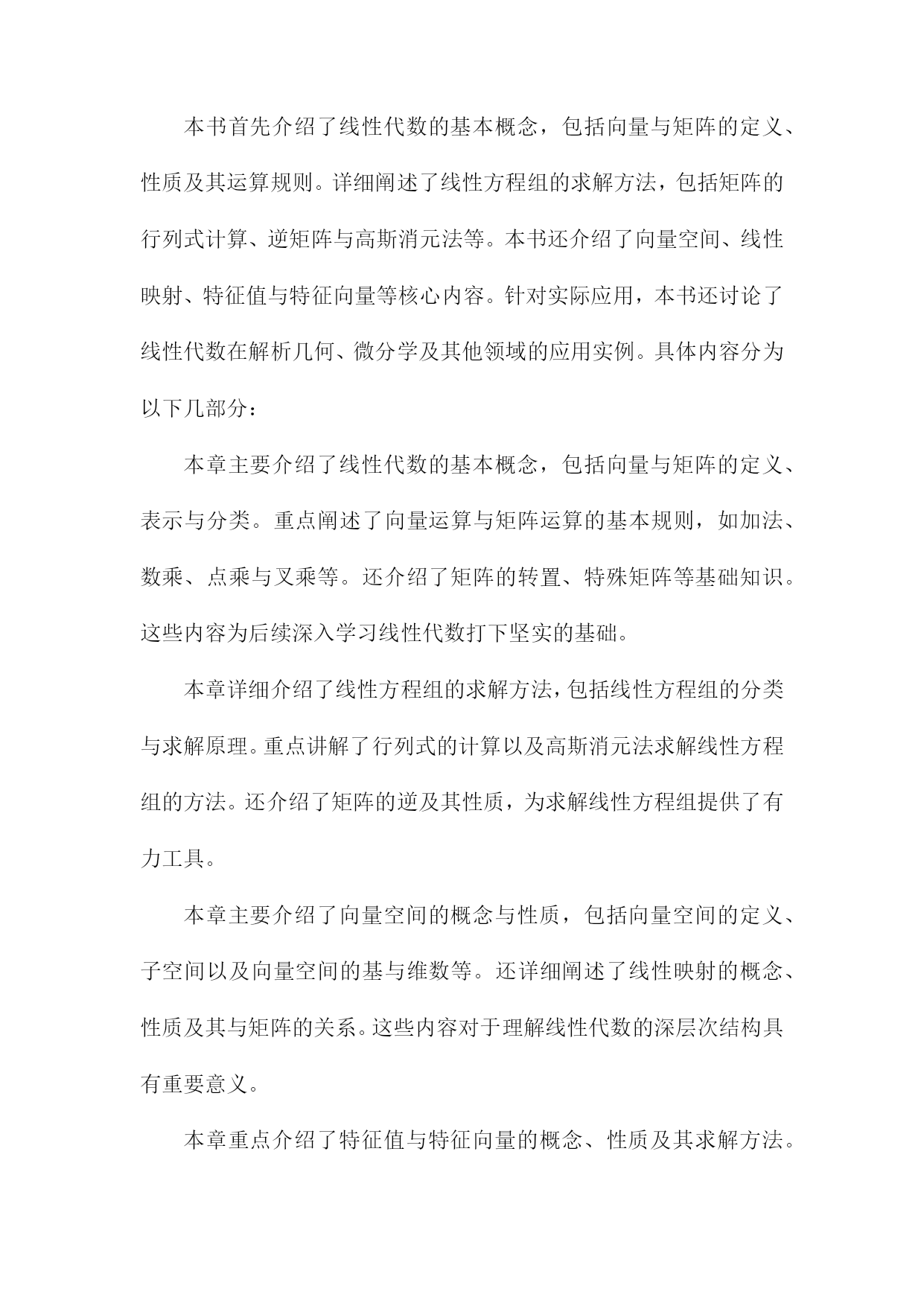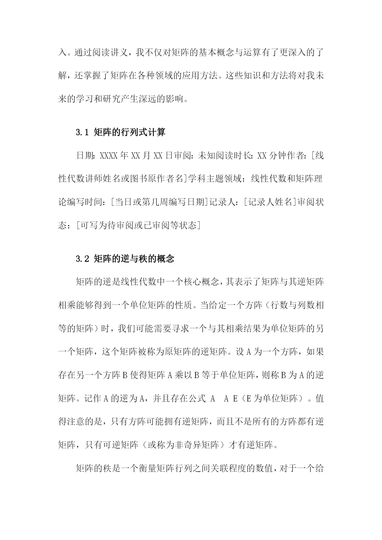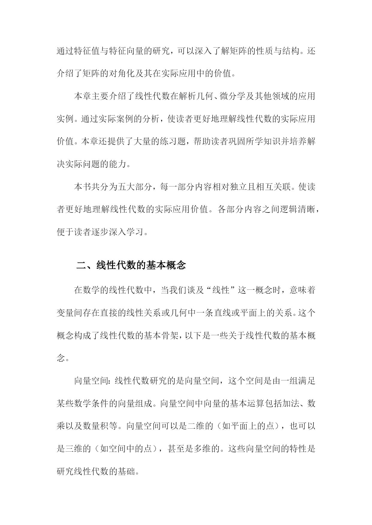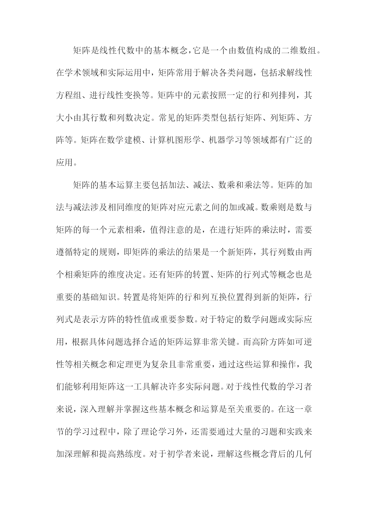《线性代数讲义》阅读笔记一、概要《线性代数讲义》是一本关于线性代数学科的经典教材,涵盖了线性代数的基本概念和主要理论。本阅读笔记旨在概括该书的核心内容,以便读者快速了解本书的主要结构和知识点。本书首先介绍了线性代数的基本概念,包括向量、矩阵、线性方程组和线性变换等。深入探讨了向量空间、线性映射和行列式等核心概念,并通过具体实例和证明阐述了它们的性质和应用。书中还介绍了特征值和特征向量、正交性、线性代数在几何中的应用等重要内容。在阅读本书过程中,我深刻认识到线性代数作为一门数学工具的实用性。它不仅是许多科学领域的基础,而且在机器学习、数据分析等现代技术中发挥着重要作用。通过本书的学习,读者可以掌握线性代数的基本理论和计算方法,为今后的学习和工作打下坚实的基础。1.1线性代数的定义与重要性线性代数是一门研究线性空间、线性变换及其性质的重要数学分支。它是一个充满广泛应用价值的学科,渗透于各个领域之中,包括但不限于物理、工程、计算机科学和数学等。线性代数的主要研究对象是向量和矩阵,我们可以对多维数据进行有效的处理和计算。定义:线性代数主要研究向量空间上的线性关系,通过矩阵的运算来描述这些关系。它涉及到向量的加减、数乘、矩阵的加减、数乘以及矩阵乘法等一系列操作。这些操作在数学上具有封闭性、结合律、交换律等性质。重要性:线性代数在现代科学和工程领域中的重要性不容忽视。它是许多高级数学课程的基础,如微积分、偏微分方程等。它在许多实际应用中都发挥着关键作用,在计算机图形学中,线性代数用于图形的变换和渲染;在线性规划中,它用于优化问题;在物理学中,它用于描述物理系统的状态变化等。随着大数据和人工智能的兴起,线性代数在处理大规模数据、机器学习算法等方面也发挥着不可替代的作用。线性代数不仅为我们提供了一种强大的工具来处理多维数据,还为我们探索现实世界提供了理论基础。理解和掌握线性代数对于从事科学研究和技术工作的人来说至关重要。1.2本书内容与结构介绍线性代数是数学的一门重要分支,广泛应用于各个领域。本书《线性代数讲义》系统全面地介绍了线性代数的基本概念、原理和计算方法。本章内容主要围绕本书的整体结构与核心内容展开介绍,为读者提供全面的阅读导航。本书首先介绍了线性代数的基本概念,包括向量与矩阵的定义、性质及其运算规则。详细阐述了线性方程组的求解方法,包括矩阵的行列式计算、逆矩阵与高斯消元法等。本书还介绍了向量空间、线性映射、特征值与特征向量等核心内容。针对实际应用,本书还讨论了线性代数在解析几何、微分学及其他领域的应用实例。具体内容分为以下几部分:本章主要介绍了线性代数的基本概念,包括向量与矩阵的定义、表示与分类。重点阐述了向量运算与矩阵运算的基本规则,如加法、数乘、点乘与叉乘等。还介绍了矩阵的转置、特殊矩阵等基础知识。这些内容为后续深入学习线性代数打下坚实的基础。本章详细介绍了线性方程组的求解方法,包括线性方程组的分类与求解原理。重点讲解了行列式的计算以及高斯消元法求解线性方程组的方法。还介绍了矩阵的逆及其性质,为求解线性方程组提供了有力工具。本章主要介绍了向量空间的概念与性质,包括向量空间的定义、子空间以及向量空间的基与维数等。还详细阐述了线性映射的概念、性质及其与矩阵的关系。这些内容对于理解线性代数的深层次结构具有重要意义。本章重点介绍了特征值与特征向量的概念、性质及其求解方法。通过特征值与特征向量的研究,可以深入了解矩阵的性质与结构。还介绍了矩阵的对角化及其在实际应用中的价值。本章主要介绍了线性代数在解析几何、微分学及其他领域的应用实例。通过实际案例的分析,使读者更好地理解线性代数的实际应用价值。本章还提供了大量的练习题,帮助读者巩固所学知识并培养解决实际问题的能力。本书共分为五大部分,每一部分内容相对独立且相互关联。使读者更好地理解线性代数的实际应用价值。各部分内容之间逻辑清晰,便于读者逐步深入学习。二、线性代数的基本概念在数学的线性代数中,当我们谈及“线性”这一概念时,意味着变量间存在直接的线性关系或几何中一条直线或平面上的关系。这个概念构成了线性代数的基本骨架,以下是一些关于线性代数的基本概念。向量空间:线性代数研究的是向量空间,这个空间是由一组满足某些数学条件的向量组成。向量空间中向量的基本运算包括加法、数乘以及数量积等。向量空间可以是二维的(如平面上的点),也可以是三维的(如空间中的点),甚至是多维的。这些向量空间的特性是研究线性代数的基础。矩阵:矩阵是线性代数中的核心概念之一,它是一个二维数组,用于表示向量之间的线性关系。矩阵的基本运算包括加法、数乘、矩阵乘法以及求逆等。矩阵可以用来表示线性变换,这是线性代数理论中的一个重要概念。特殊的矩阵如方阵、单位矩阵和零矩阵在理论分析和应用中都起到