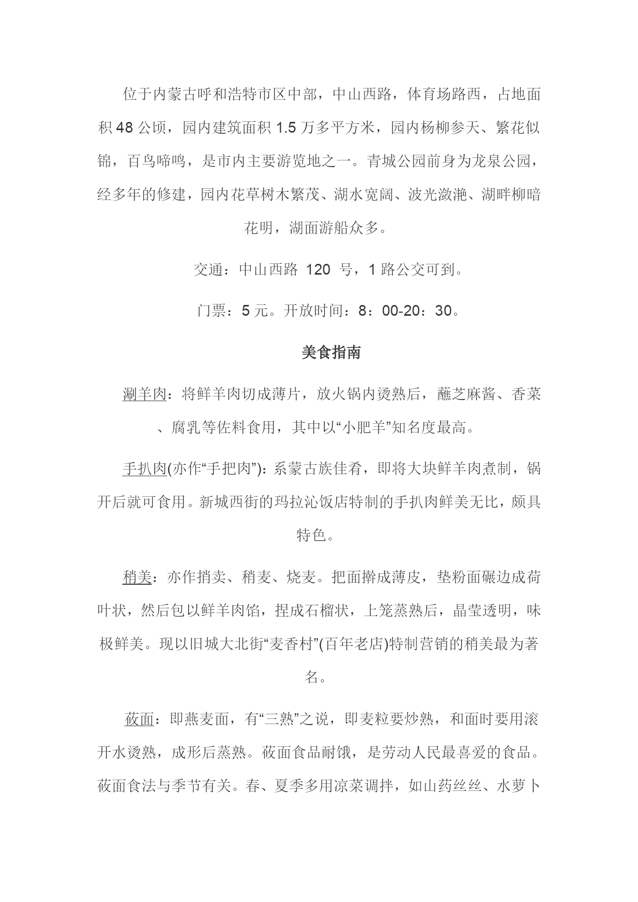 呼和浩特,蒙古语意为“青色的城”,简称“青城”,因召庙云集,又称“召城”,是祖国北疆的历史文化名城。呼和浩特是一座具有鲜明民族特点和众多名胜古迹的塞外名城。独特美妙的自然风光,丰富多彩的民族文化,历史积淀深厚的古迹名胜,绚丽多姿的蒙古歌舞,精彩纷呈的蒙古式摔跤,这里的一切都让人心旷神怡,流连忘返。呼和浩特的自然景致尤为迷人,“寒冷高原”辉腾锡勒草原、“夏日营盘”格根塔拉草原、“召河”希拉穆仁草原,绿草如茵,湖泊点缀,“天苍苍,野茫茫”的大草原是久居闹市的人放松心情的好去处。每年4至10月,是呼和浩特最佳旅游季节。要是去草原,要7月中旬到9月初之间去,这时的草原景致迷人,而且正好有一年一度的“那达慕”大会举行,届时,逛古召,登古塔,观赛马,骑马驰骋草原,其乐无比交通指南航空:白塔机场大巴:停靠站:新华广场民航售票处---呼和浩特机场。只要有落地航班,一定有大巴,大巴一般都会等所有旅客出完才发车的;每个航班起飞前90分钟从新华广场发车。票价:8元,行程:20-30分钟。乘出租30-35元。铁路:现有19条国有铁路干线、12条支线、5条地方铁路,与北京、西安、海拉尔、兰州、银川等数十个城市均有旅客列车通行。公路:呼包高速公路已建成使用,已实现了各旗县通公路,每日有数十班长途客运汽车开往附近各个城镇。呼和浩特长途汽车站在火车站旁,新城区车站西街60号,电话:(0471)6965969。市内交通:以市区为中心有近二十条公共汽车线路,通往城区各地。在火车站有1路公共汽车通往旧城,7路公共汽车通往新城。景点指南昭君墓呼和浩特市南郊大黑河南岸的绿野间矗立着一座传诵古今、驰名中外的西汉古墓――昭君墓。墓呈覆斗形,高33米,占地二十余亩,系人工夯筑的大土堆,巍峨高耸,远望如山。传说,因每年凉秋九月,塞外草衰时,附近草木枯黄,唯独昭君墓上芳草青青,故古人称之为“青冢”,且唐代就见之于李、杜诗篇。交通:从呼和浩特市火车站乘坐公交1路到南茶坊/小黑河站,再换乘10路到昭君墓;或换乘44路到昭君墓门票:65元,可以看《昭君情缘》歌舞表演,一天两场。开放时间:8:00-18:00大召寺蒙语称“依克召”,意为大庙。汉名原为弘慈寺,后改名无量寺,位于呼和浩特市旧城区。明隆庆年间(1567~1572),土默特蒙古部主阿勒坦汗受封为顺义王后,与夫人三娘子共同主持归化城(呼和浩特前身)和弘慈寺。万历八年(1580)寺成,因供奉银佛像,俗称银佛寺,蒙古文史籍中有称“阿勒坦召”的。清康熙年间(1662―1721),扩展召庙规模,大殿改覆黄琉璃瓦。佛殿内有高2.55米的银铸释迦牟尼像。释迦牟尼像前有一对金色木雕巨龙,蟠于木柱之上,作双龙戏珠状。殿前汉白玉方形石座上,有明天启七年(1627)铸造的一对空心铁狮,昂首仰视,形象别致。召庙内另有山门、过殿、东西配殿及九间楼等建筑。寺前原有玉泉井一口,泉水清冽,被誉为“九边第一泉”,并将此5字雕成匾额,悬挂在山门上。交通:呼和浩特市玉泉区大召前街。门票:15元希拉穆仁草原希拉穆仁,蒙语意为“黄色的河”,位于呼和浩特市北80公里处,是内蒙古著名的草原旅游点。从呼和浩特乘车约一个多小时就能到达希拉穆仁草原。希拉穆仁草原是典型的高原草场,每当夏秋时节绿草如茵,鲜花遍地,一望无际的景色,使人如痴如醉。交通:在火车站旁乘车到召河再转车。交通不太方便,最好自驾或跟团。门票:30元。内蒙古博物馆位于呼和浩特市中心,新华街东口。坐西朝东,主楼高大,两侧廊略低,楼顶有腾跃白马标志。建筑面积5000平方米,陈列展览面积3500平方米。馆分4部分:1、内蒙古革命文物陈列;2、内蒙古古生物和古人类陈列;3、内蒙古民族文物陈列;4、内蒙古历史文物陈列。匈奴、东胡、乌桓、鲜卑、突厥、契丹、女真、党项、蒙古等少数民族文物占有重要比重,馆内文物具有鲜明的民族特色和地方特点。交通:在呼市火车站乘坐1、5、13、21、22、24、34、303路可到;或在新华广场换乘旅游观光巴士到内蒙古博物馆。门票:10元。开放时间:夏季9:00-17:00;冬季10:00-16:00。星期二闭馆。哈素海哈素海位于呼和浩特西70公里的土默特左旗境内,哈素为蒙古译音。原名哈拉乌素,意为青水湖,由青色湖水得名。由于顺口原因,哈拉乌素简称为哈素海。哈素海面积达30平方公里,最大水深3米,湖内水质肥沃,盛产鲤鱼,草鱼,鲫鱼,虾、螃蟹等。湖内芦苇丛生、鸟飞鱼跃。岸边凉亭水榭柳绿成荫,碧水青山相映成辉,有"塞外西湖"之称。交通:可在呼市或包头长途汽车站乘往返两地的班车,包头东至哈素海2小时可到;呼和浩特至哈素海1小时可到。自驾车从呼和浩特沿高速公路或110国道西行可到哈素海。门票:30元。最佳旅游时间:7—8月份。乌素图国家森林公园