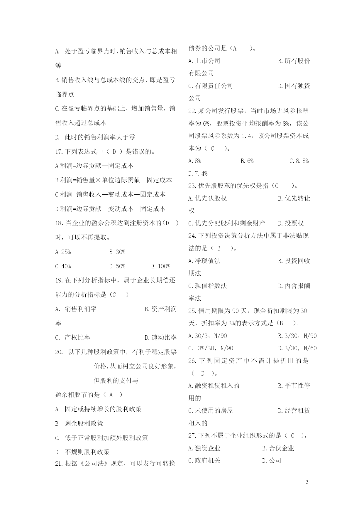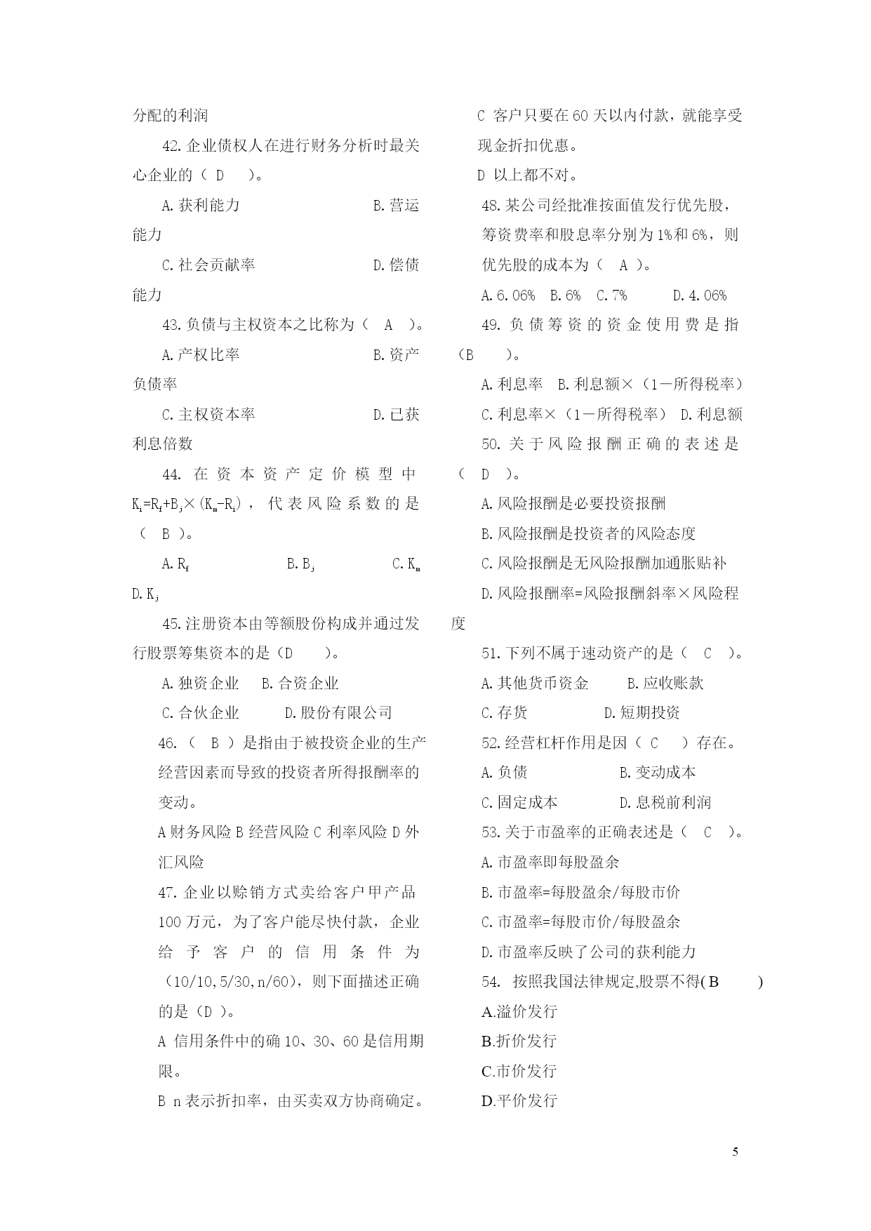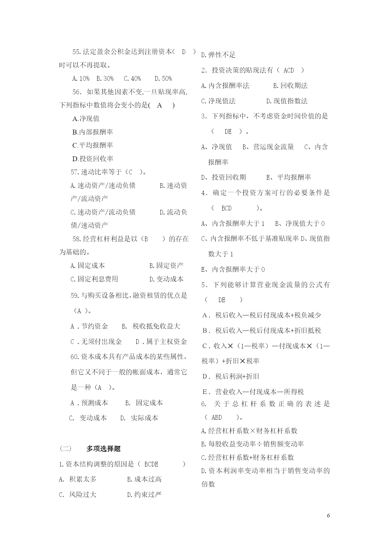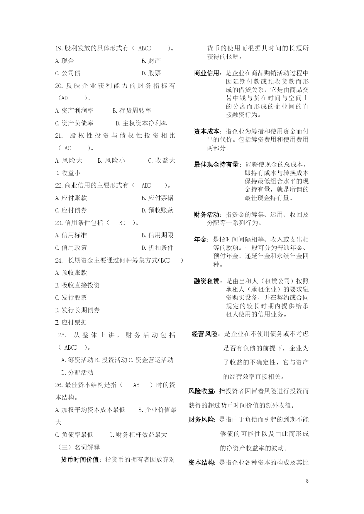 开放教育本科工商管理专业《财务管理》复习提要一、本课程命题依据本课程命题依据为王斌主编的《财务管理》(第二版)教材。中央广播电视大学出版社2006年1月第1次印刷。复习资料:教材、历届试题、财务管理导学(广东电大编).二、考试题型及分数比例1.单选题(10题,每题1.5分,共15分)2.多选题(5题,每题2分,共10分)3.名词解释(4题,每题4分,共16分)4.简答题(2题,每题10分,共20分)5.计算题(3题,共39分)三、考试形式闭卷考试,90分钟。四、答题要求:选择题:要求选择正确,多选、少选均不给分。名词解释:要求准确回答。简述题:要求答出要点,并能结合实际稍作解释。计算题:要求列出计算详细过程,并能正确的进行计算和分析。五、重点计算题(具体例题以导学的作业为准)1、第二章:资金时间价值(年金、复利)2、第三章:债券的发行价格3、第四章:个别资本成本、综合资本成本4、第六章:最佳现金余额的确定、存货经济采购批量5、第八章:保本销售量、股利分配的计算六、综合练习单项选择题1.财务活动是指资金的筹集、运用、收回及分配等一系列行为,其中,资金的运用及收回称为(B)。A.筹资活动B.投资活动C.日常资金营运活动D.分配活动2.将1000元存入银行,利率为10%,计算三年后的价值应采用(A)。A.复利终值系数B.年金终值系数C.复利现值系数D.年金现值系数3.企业按2/10,N/30的条件购入20万元货物,企业在第30天付款,其放弃折扣的成本为(A)。A.36.7%B.2%C.14.7%D.18.4%4.普通股筹资的优点的是(B)。A.成本低B.增加资本的实力C.风险大D.不会分散公司的控制权5.具有抵税效应,又能带来杠杆效应的筹资方式是(A)。A.发行债券B.发行优先股C.发行普通股D.使用内部留存6.应收账款的机会成本是指(C)。A.应收账款不能收回而发生的损失B.调查顾客信用情况的费用C.应收账款占用资金的应计利息D.催收账款发生的各项费用7.在长期投资中,对某项专利技术的投资属于(A)。A.实体投资B.金融投资C.对内投资D.对外投资8.所谓现金流量,在投资决策中是指一个项目引起的企业(C)。A.现金支出和现金收入量B.货币资金支出和货币资金收入量C.现金流出和现金流入的数量D.流动资金增加和减少量9.下面信用标准描述正确的是(B)。A.信用标准是客户获得信用的条件B.信用标准通常用坏帐损失率表示C.信用标准越高,企业的坏帐损失越低D.信用标准越低,企业的销售收入越低10.某公司拟发行面值为100元,年利率为12%,期限为2年的债券,在市场利率为10%时的发行价格为(B)元。A.100B.103C.98D.11011.下列属于不市场风险的有:(D)战争经济衰退高利率产品成本上升12.不存在杠杆作用的筹资方式是:(D)银行借款发行普通债券发行可转换债券发行普通股13.下列哪个属于债券筹资的优点:(A)成本低没有固定的利息负担可增强企业的举债能力筹资迅速14.对企业而言,折旧政策是就其固定资产的两个方面内容做出规定和安排即(C)。A、折旧范围和折旧方法B、折旧年限和折旧分类C、折旧方法和折旧年限D、折旧率和折旧年限15.企业投资10万元建一条生产线,投产后年净利1.5万元,年折旧率为10%,则投资回收期为(C)年。A、3B、5C、4D、616.如果某一企业的经营状态处于盈亏临界点,则下列说法中错误的是(D)A.处于盈亏临界点时,销售收入与总成本相等B.销售收入线与总成本线的交点,即是盈亏临界点C.在盈亏临界点的基础上,增加销售量,销售收入超过总成本D.此时的销售利润率大于零17.下列表达式中(D)是错误的。A利润=边际贡献—固定成本B利润=销售量×单位边际贡献—固定成本C利润=销售收入—变动成本—固定成本D利润=边际贡献—变动成本—固定成本18.当企业的盈余公积达到注册资本的(D)时,可以不再提取。A25%B30%C40%D50%E100%19.在下列分析指标中,属于企业长期偿还能力的分析指标是(C)A.销售利润率B.资产利润率C.产权比率D.速动比率20.以下几种股利政策中,有利于稳定股票价格,从而树立公司良好形象,但股利的支付与盈余相脱节的是(A)A固定或持续增长的股利政策B剩余股利政策C.低于正常股利加额外股利政策D不规则股利政策21.根据《公司法》规定,可以发行可转换债券的公司是(A)。A.上市公司B.所有股份有限公司C.有限责任公司D.国有独资公司22.某公司发行股票,当时市场无风险报酬率为6%