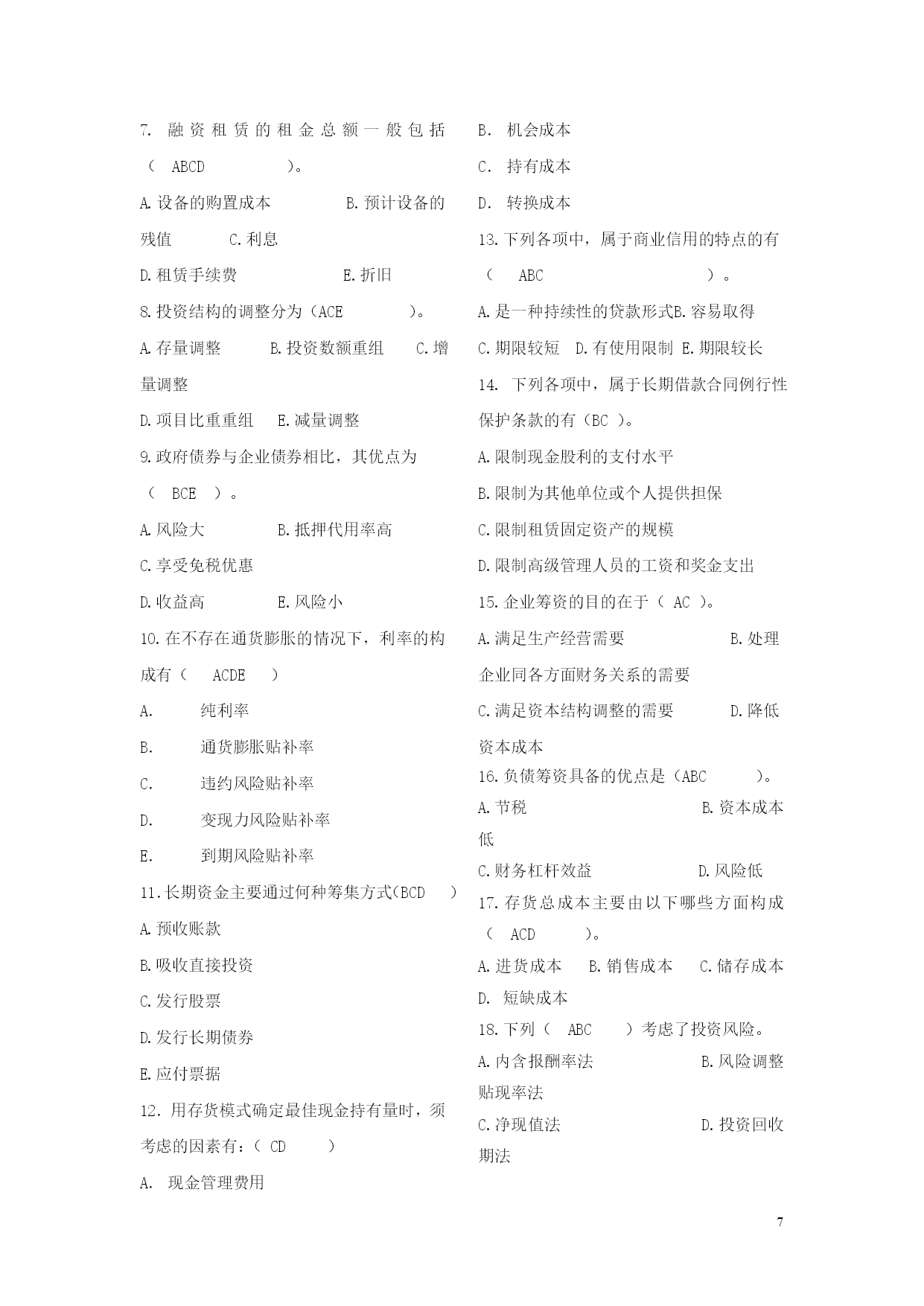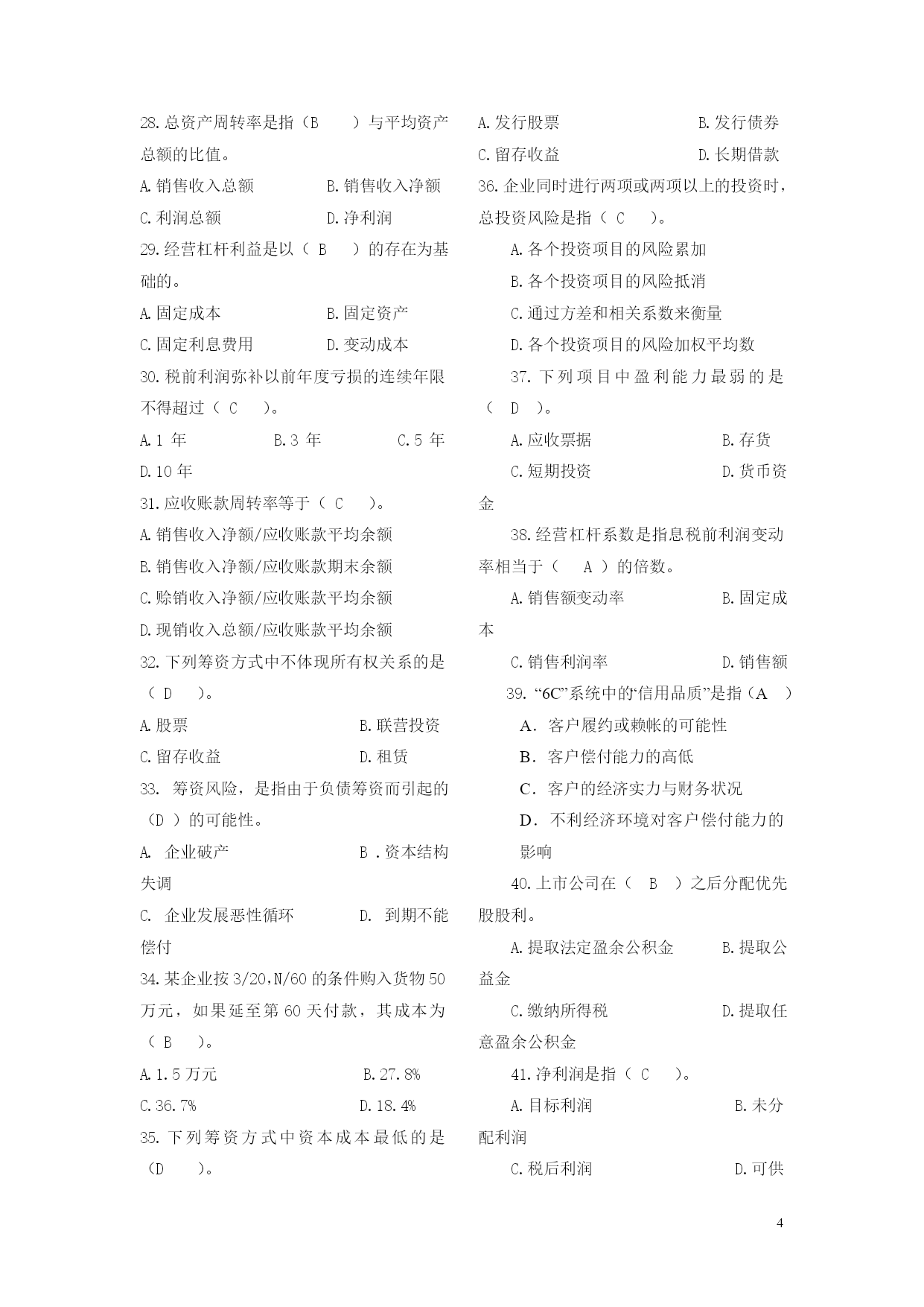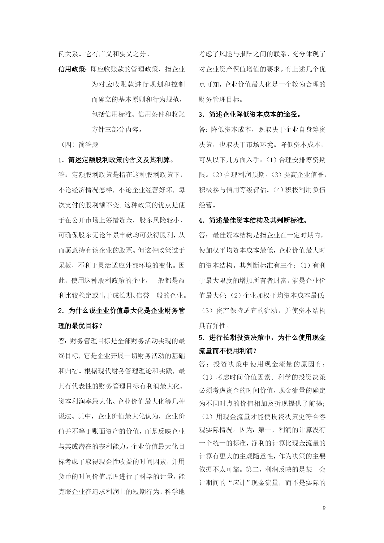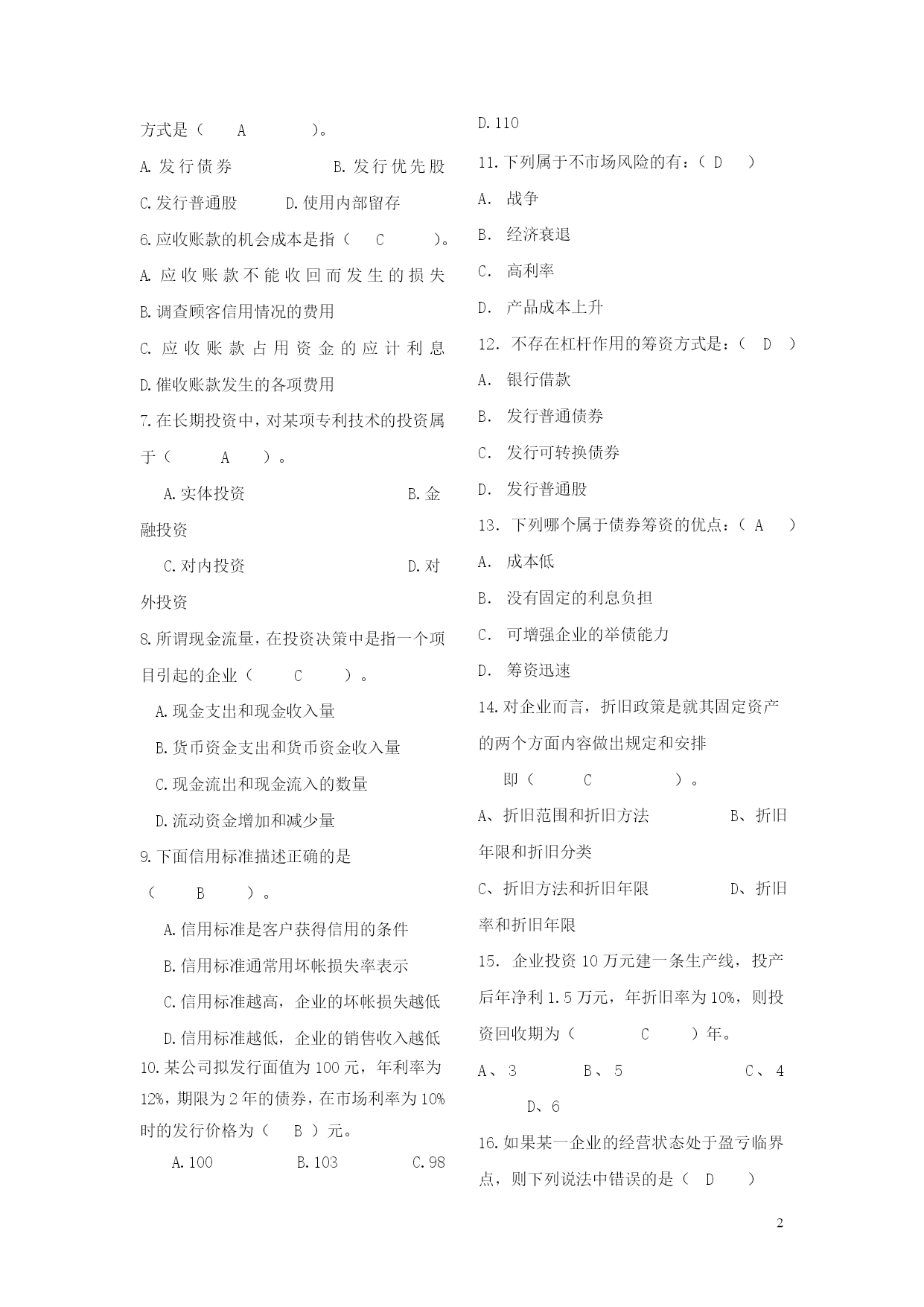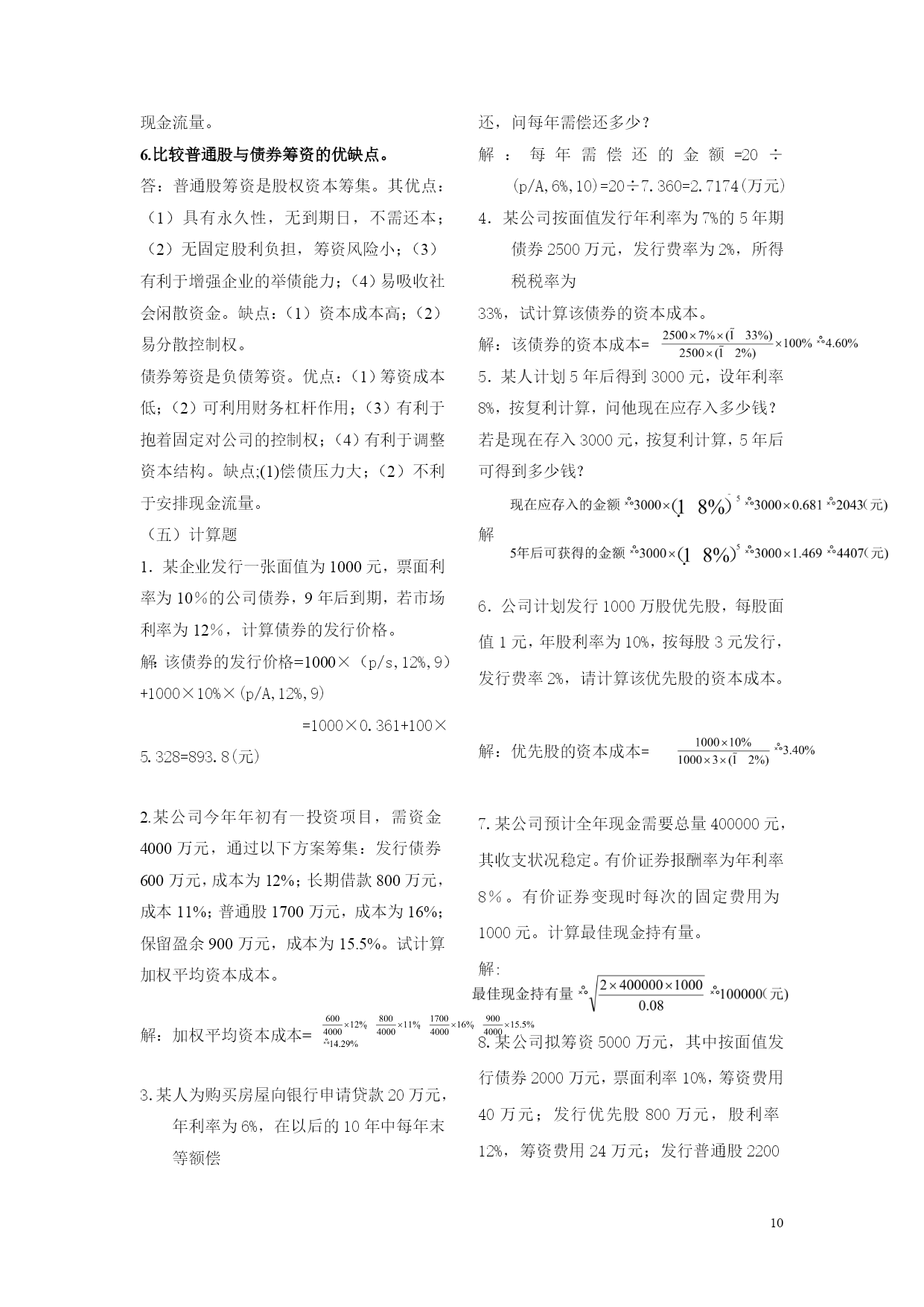 开放教育本科工商管理专业《财务管理》复习提要一、本课程命题依据本课程命题依据为王斌主编的《财务管理》(第二版)教材。中央广播电视大学出版社2006年1月第1次印刷。复习资料:教材、历届试题、财务管理导学(广东电大编).二、考试题型及分数比例1.单选题(10题,每题1.5分,共15分)2.多选题(5题,每题2分,共10分)3.名词解释(4题,每题4分,共16分)4.简答题(2题,每题10分,共20分)5.计算题(3题,共39分)三、考试形式闭卷考试,90分钟。四、答题要求:选择题:要求选择正确,多选、少选均不给分。名词解释:要求准确回答。简述题:要求答出要点,并能结合实际稍作解释。计算题:要求列出计算详细过程,并能正确的进行计算和分析。五、重点计算题(具体例题以导学的作业为准)1、第二章:资金时间价值(年金、复利)2、第三章:债券的发行价格3、第四章:个别资本成本、综合资本成本4、第六章:最佳现金余额的确定、存货经济采购批量5、第八章:保本销售量、股利分配的计算六、综合练习单项选择题1.财务活动是指资金的筹集、运用、收回及分配等一系列行为,其中,资金的运用及收回称为(B)。A.筹资活动B.投资活动C.日常资金营运活动D.分配活动2.将1000元存入银行,利率为10%,计算三年后的价值应采用(A)。A.复利终值系数B.年金终值系数C.复利现值系数D.年金现值系数3.企业按2/10,N/30的条件购入20万元货物,企业在第30天付款,其放弃折扣的成本为(A)。A.36.7%B.2%C.14.7%D.18.4%4.普通股筹资的优点的是(B)。A.成本低B.增加资本的实力C.风险大D.不会分散公司的控制权5.具有抵税效应,又能带来杠杆效应的筹资方式是(A)。A.发行债券B.发行优先股C.发行普通股D.使用内部留存6.应收账款的机会成本是指(C)。A.应收账款不能收回而发生的损失B.调查顾客信用情况的费用C.应收账款占用资金的应计利息D.催收账款发生的各项费用7.在长期投资中,对某项专利技术的投资属于(A)。A.实体投资B.金融投资C.对内投资D.对外投资8.所谓现金流量,在投资决策中是指一个项目引起的企业(C)。A.现金支出和现金收入量B.货币资金支出和货币资金收入量C.现金流出和现金流入的数量D.流动资金增加和减少量9.下面信用标准描述正确的是(B)。A.信用标准是客户获得信用的条件B.信用标准通常用坏帐损失率表示C.信用标准越高,企业的坏帐损失越低D.信用标准越低,企业的销售收入越低10.某公司拟发行面值为100元,年利率为12%,期限为2年的债券,在市场利率为10%时的发行价格为(B)元。A.100B.103C.98D.11011.下列属于不市场风险的有:(D)战争经济衰退高利率产品成本上升12.不存在杠杆作用的筹资方式是:(D)银行借款发行普通债券发行可转换债券发行普通股13.下列哪个属于债券筹资的优点:(A)成本低没有固定的利息负担可增强企业的举债能力筹资迅速14.对企业而言,折旧政策是就其固定资产的两个方面内容做出规定和安排即(C)。A、折旧范围和折旧方法B、折旧年限和折旧分类C、折旧方法和折旧年限D、折旧率和折旧年限15.企业投资10万元建一条生产线,投产后年净利1.5万元,年折旧率为10%,则投资回收期为(C)年。A、3B、5C、4D、616.如果某一企业的经营状态处于盈亏临界点,则下列说法中错误的是(D)A.处于盈亏临界点时,销售收入与总成本相等B.销售收入线与总成本线的交点,即是盈亏临界点C.在盈亏临界点的基础上,增加销售量,销售收入超过总成本D.此时的销售利润率大于零17.下列表达式中(D)是错误的。A利润=边际贡献—固定成本B利润=销售量×单位边际贡献—固定成本C利润=销售收入—变动成本—固定成本D利润=边际贡献—变动成本—固定成本18.当企业的盈余公积达到注册资本的(D)时,可以不再提取。A25%B30%C40%D50%E100%19.在下列分析指标中,属于企业长期偿还能力的分析指标是(C)A.销售利润率B.资产利润率C.产权比率D.速动比率20.以下几种股利政策中,有利于稳定股票价格,从而树立公司良好形象,但股利的支付与盈余相脱节的是(A)A固定或持续增长的股利政策B剩余股利政策C.低于正常股利加额外股利政策D不规则股利政策21.根据《公司法》规定,可以发行可转换债券的公司是(A)。A.上市公司B.所有股份有限公司C.有限责任公司D.国有独资公司22.某公司发行股票,当时市场无风险报酬率为6%
