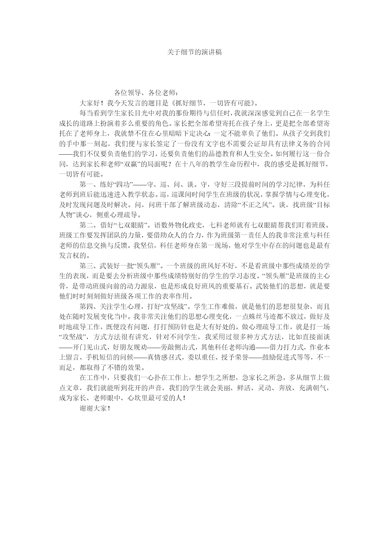 关于细节的演讲稿各位领导、各位老师:大家好!我今天发言的题目是《抓好细节,一切皆有可能》。每当看到学生家长目光中对我的那份期待与信任时,我就深深感觉到自己在一名学生成长的道路上扮演着多么重要的角色。家长把全部希望寄托在孩子身上,更是把全部希望寄托在了老师身上,我就禁不住在心里暗暗下定决心:一定不能辜负了他们。从孩子交到我们的手中那一刻起,我们便与家长签定了一份没有文字也不需要公证却具有法律义务的合同——我们不仅要负责他们的学习,还要负责他们的品德教育和人生安全。如何履行这一份合同,达到家长和老师“双赢”的局面呢?在十八年的教学生命历程中,我的感受是抓好细节,一切皆有可能。第一、练好“四功”——守、巡、问、谈。守,守好三段提前时间的学习纪律,为科任老师到班后能迅速进入教学状态。巡,巡课间时间学生在班级的状况,掌握学情与心理变化,及时发现问题及时解决。问,问班干部了解班级动态,清除“不正之风”。谈,找班级“目标人物”谈心,侧重心理疏导。第二、借好“七双眼睛”。语数外物化政史,七科老师就有七双眼睛帮我们盯着班级。班级工作要发挥团队的力量,要借助众人的合力,作为班级第一责任人的我非常注重与科任老师的信息交换与反馈。我坚信,科任老师身在第一现场,他对学生中存在的问题也是最有发言权的。第三、武装好一批“领头雁”。一个班级的班风好不好,不是看班级中那些成绩差的学生的表现,而是要去分析班级中那些成绩特别好的学生的学习态度。“领头雁”是班级的主心骨,是带动班级向前的动力源泉,也是形成良好班风的重要基石。武装他们的思想,就是要他们时时刻刻做好班级各项工作的表率作用。第四、关注学生心理,打好“攻坚战”。学生工作难做,就是他们的思想很复杂,而且处在随时发展变化当中。我非常关注他们的思想心理变化,一点蛛丝马迹都不放过,做好及时地疏导工作,既便没有问题,打打预防针也是大有好处的。做心理疏导工作,就是打一场“攻坚战”,方式方法很有讲究,针对不同学生,我采用过很多种方式方法,比如直接面谈——开门见山式,好朋友规劝——旁敲侧击式,其他科任老师沟通——借力打力式,作业本上留言、手机短信的问候——真情感召式,委以重任、授予荣誉——鼓励促进式等等,不一而足,都取得了不错的效果。在工作中,只要我们一心扑在工作上,想学生之所想,急家长之所急,多从细节上做点文章,我们就能听到花开的声音,我们的学生就会美丽、鲜活、灵动、奔放、充满朝气,成为家长、老师眼中、心坎里最可爱的人!谢谢大家!