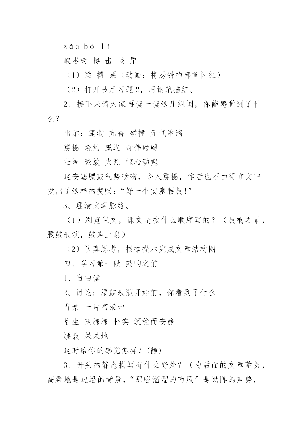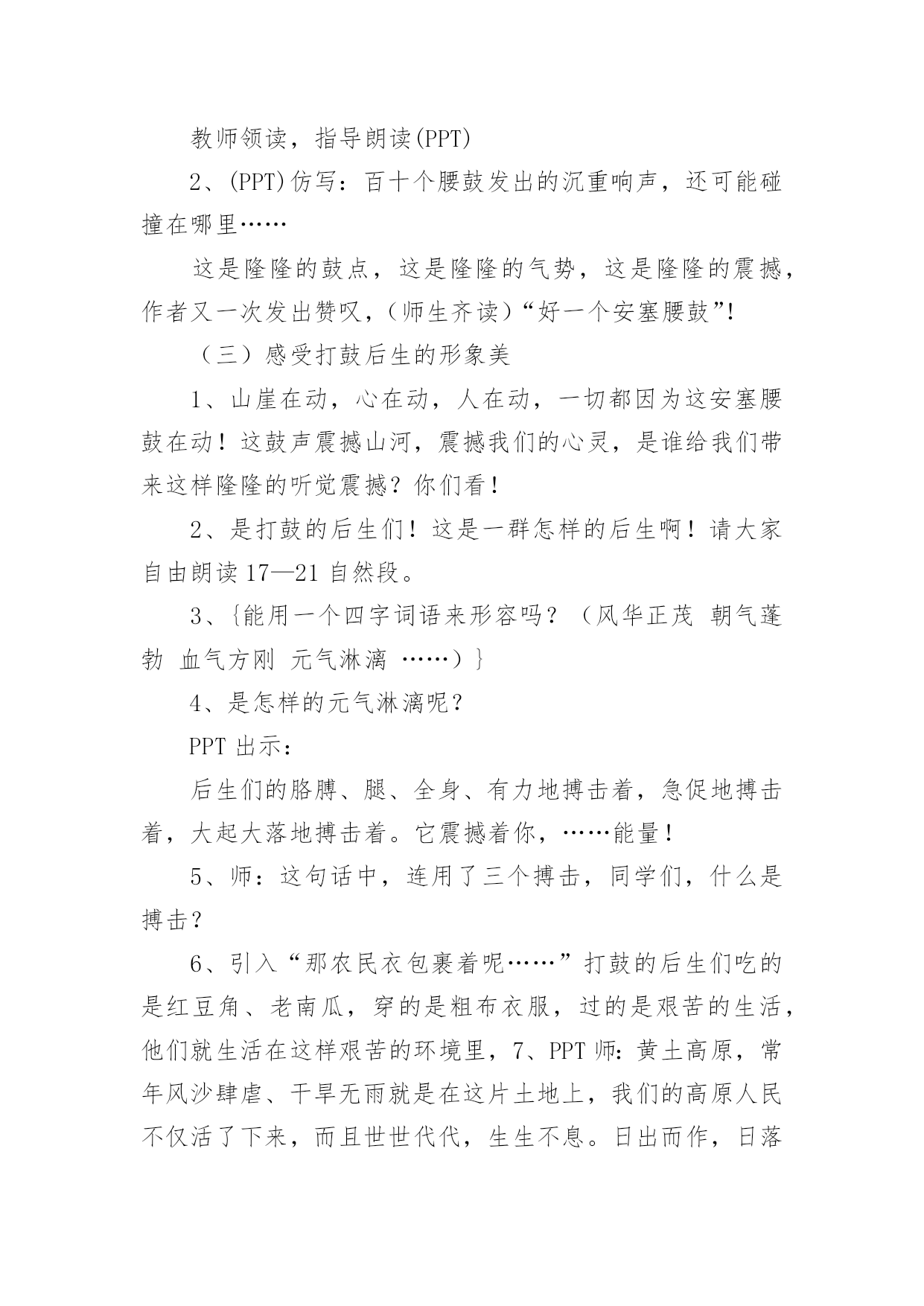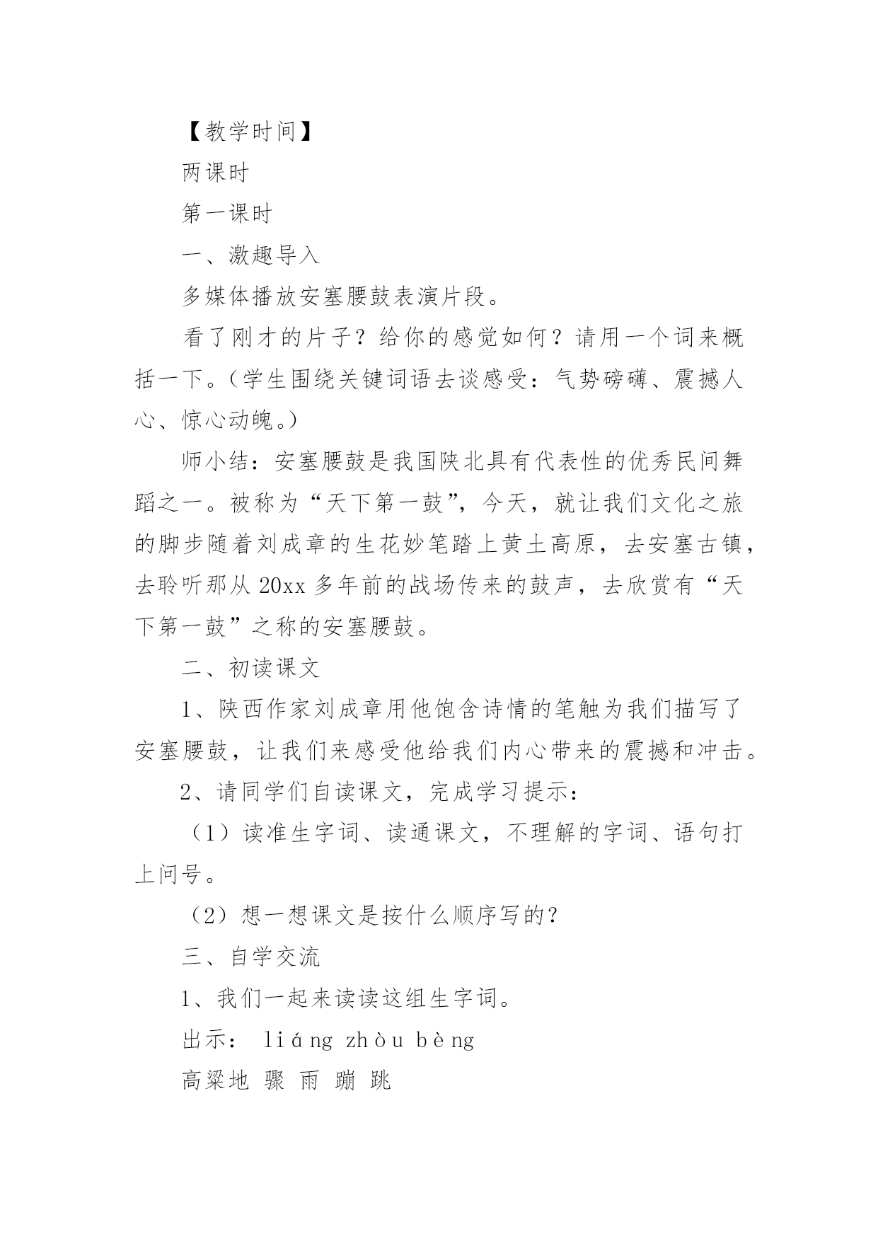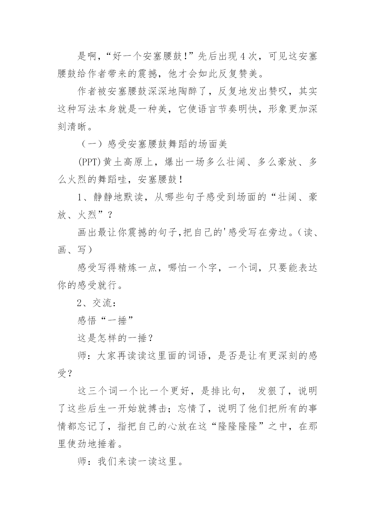 《安塞腰鼓》教学设计【精华】《安塞腰鼓》教学设计11篇作为一位无私奉献的人民教师,就难以避免地要准备教学设计,教学设计是教育技术的组成部分,它的功能在于运用系统方法设计教学过程,使之成为一种具有操作性的程序。那要怎么写好教学设计呢?以下是小编帮大家整理的《安塞腰鼓》教学设计,欢迎大家借鉴与参考,希望对大家有所帮助。《安塞腰鼓》教学设计篇1【教学目标】1、正确、流利、有感情地朗读课文,背诵第12至16自然段。2、理解文章内容,感受安塞腰鼓的壮阔、豪放、火烈的气势及高原后生粗犷、豪迈、开放的性格。3、理解比喻、排比、反复等修辞手法在文中的作用。4、理解文中一些句子的深刻含义。【教学重难点】1、感受安塞腰鼓的壮阔、豪放、火烈的气势及高原后生粗犷、豪迈、开放的性格。2、理解比喻、排比、反复等修辞手法在文中的作用。3、。理解文中一些句子的深刻含义。【教学时间】两课时第一课时一、激趣导入多媒体播放安塞腰鼓表演片段。看了刚才的片子?给你的感觉如何?请用一个词来概括一下。(学生围绕关键词语去谈感受:气势磅礴、震撼人心、惊心动魄。)师小结:安塞腰鼓是我国陕北具有代表性的优秀民间舞蹈之一。被称为“天下第一鼓”,今天,就让我们文化之旅的脚步随着刘成章的生花妙笔踏上黄土高原,去安塞古镇,去聆听那从20xx多年前的战场传来的鼓声,去欣赏有“天下第一鼓”之称的安塞腰鼓。二、初读课文1、陕西作家刘成章用他饱含诗情的笔触为我们描写了安塞腰鼓,让我们来感受他给我们内心带来的震撼和冲击。2、请同学们自读课文,完成学习提示:(1)读准生字词、读通课文,不理解的字词、语句打上问号。(2)想一想课文是按什么顺序写的?三、自学交流1、我们一起来读读这组生字词。出示:liángzhòubèng高粱地骤雨蹦跳zǎobólì酸枣树搏击战栗(1)粱搏栗(动画:将易错的部首闪红)(2)打开书后习题2,用钢笔描红。2、接下来请大家再读一读这几组词,你能感觉到了什么?出示:蓬勃亢奋碰撞元气淋漓震撼烧灼威逼奇伟磅礴壮阔豪放火烈惊心动魄这安塞腰鼓气势磅礴,令人震撼,作者也不由得在文中发出了这样的赞叹:“好一个安塞腰鼓!”3、理清文章脉络。(1)浏览课文,课文是按什么顺序写的?(鼓响之前,腰鼓表演,鼓声止息)(2)认真思考,根据提示完成文章结构图四、学习第一段鼓响之前1、自由读2、讨论:腰鼓表演开始前,你看到了什么背景一片高粱地后生茂腾腾朴实沉稳而安静腰鼓呆呆地这时给你的感觉怎样?(静)3、开头的静态描写有什么好处?(为后面的文章蓄势,高粱地是边沿的背景,“那咝溜溜的南风”是助阵的声势,那“沉稳而安静”的表情显示着表演者的成竹在胸,这些都为后面热闹激烈的表演做好了铺垫)4、齐读第一段表演时,安塞腰鼓的到底有多精彩,下一节课一起学习。第二课时一、复习旧知,导入新课。1、同学们,伴着陕西民歌,我们再一次走进黄土高原,去观赏、倾听、感受和品悟安塞腰鼓。通过上一课的学习,我们知道课文是从哪几个方面描写安塞腰鼓的?(静、动、静)课文中怎么描述着壮阔、豪放的安塞腰鼓的?浏览课文6-16自然段作者从哪几个方面写的?(板书:场面、鼓声、后生、舞姿)二、品读课文,感受安塞腰鼓的艺术美。1、“好一个安塞腰鼓!好一个……安塞腰鼓!”这样的话在课文里出现几次?对,这样的话在课文中出现了4次。(第一次出现在第8节,……)出示:好一个安塞腰鼓!(第8节)好一个安塞腰鼓!(第11节)好一个安塞腰鼓!(第14节)好一个痛快了山河,蓬勃了想象力的安塞腰鼓!(第16节)2、同学们你能结合上下文,说说为什么要反复出现这些句子?是啊,“好一个安塞腰鼓!”先后出现4次,可见这安塞腰鼓给作者带来的震撼,他才会如此反复赞美。作者被安塞腰鼓深深地陶醉了,反复地发出赞叹,其实这种写法本身就是一种美,它使语言节奏明快,形象更加深刻清晰。(一)感受安塞腰鼓舞蹈的场面美(PPT)黄土高原上,爆出一场多么壮阔、多么豪放、多么火烈的舞蹈哇,安塞腰鼓!1、静静地默读,从哪些句子感受到场面的“壮阔、豪放、火烈”?画出最让你震撼的句子,把自己的'感受写在旁边。(读、画、写)感受写得精炼一点,哪怕一个字,一个词,只要能表达你的感受就行。2、交流:感悟“一捶”这是怎样的一捶?师:大家再读读这里面的词语,是否是让有更深刻的感受?这三个词一个比一个更好,是排比句,发狠了,说明了这些后生一开始就搏击;忘情了,说明了他们把所有的事情都忘记了,指把自己的心放在这“隆隆隆隆”之中,在那里使劲地捶着。师:我们来读一读这里。师:这一节中还有让你心动的地方吗?感悟“排比”,生:“【读】骤雨一样,是急促的……斗虎一样,是强劲的风姿。”从这里可以看出后生们的每一个细胞都活动,都在跳跃着,跟着那种节拍在活动。师:那是用怎样的句式来描写这种感觉的呢?师:这种排山倒海之势的排比句来