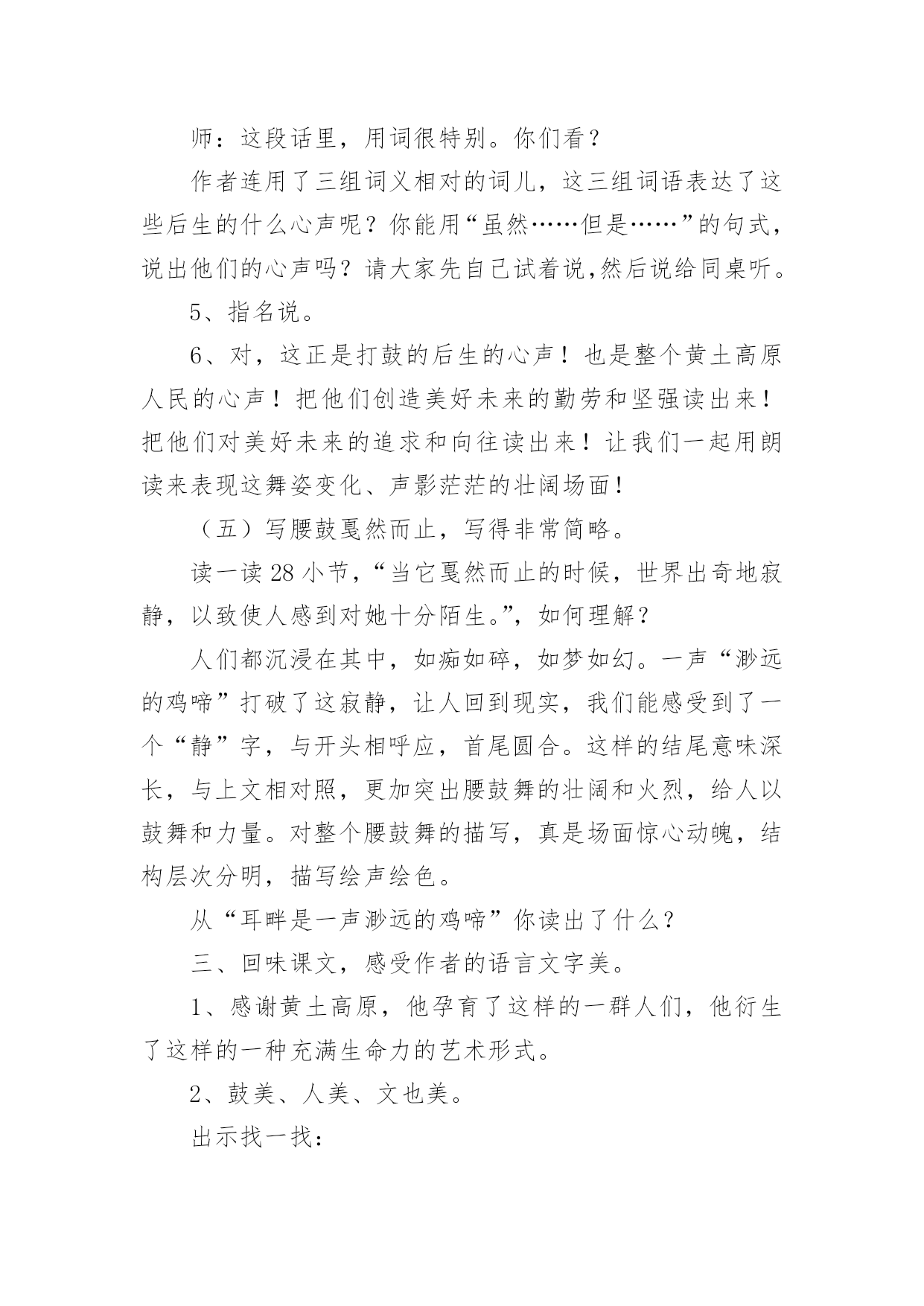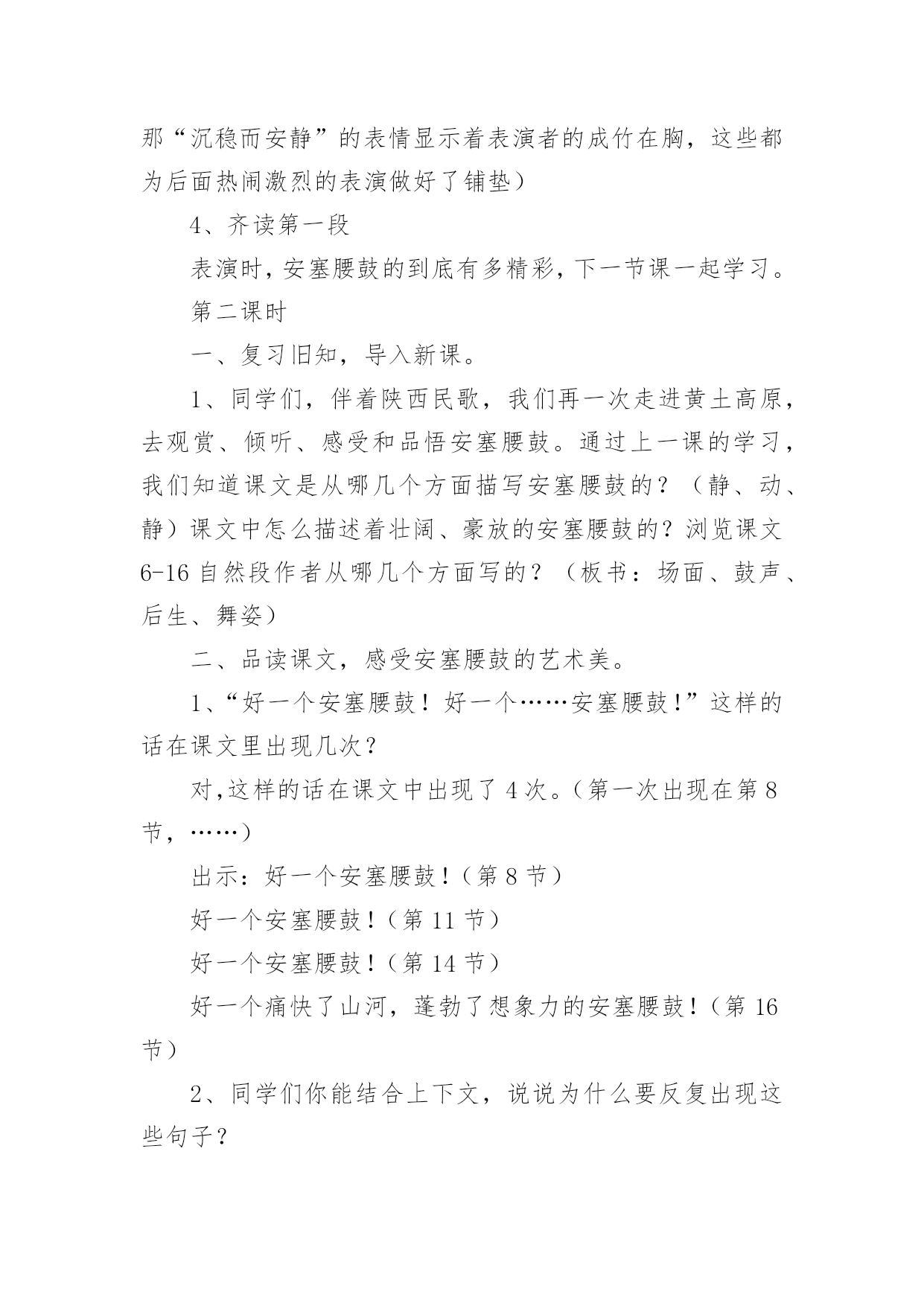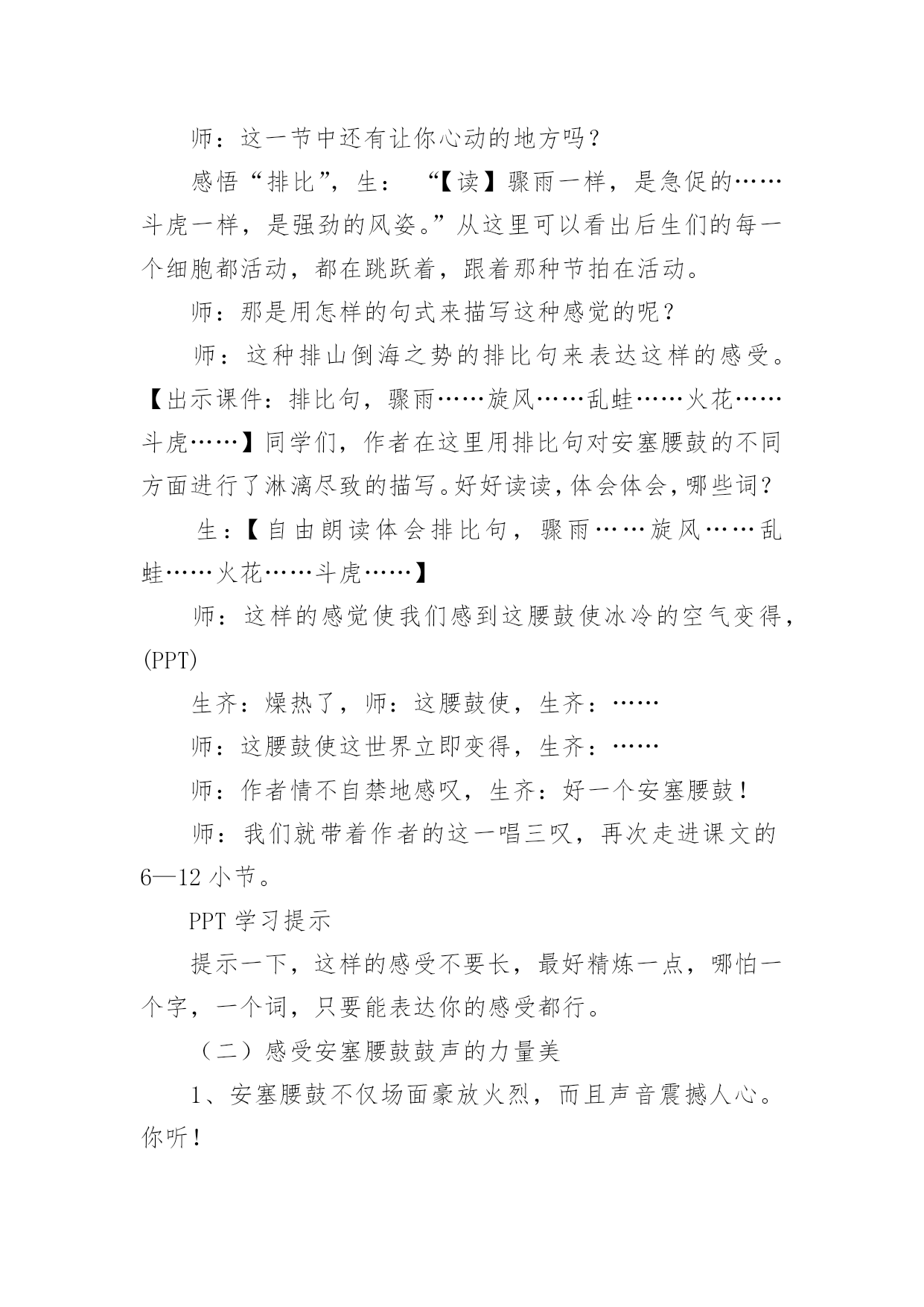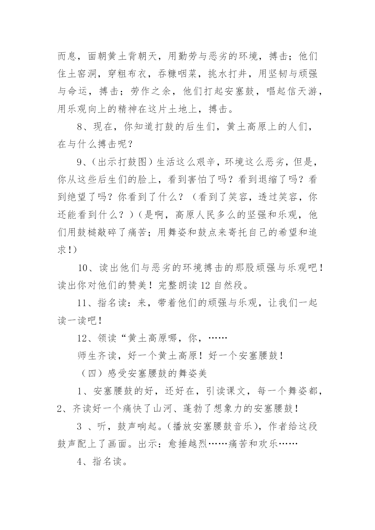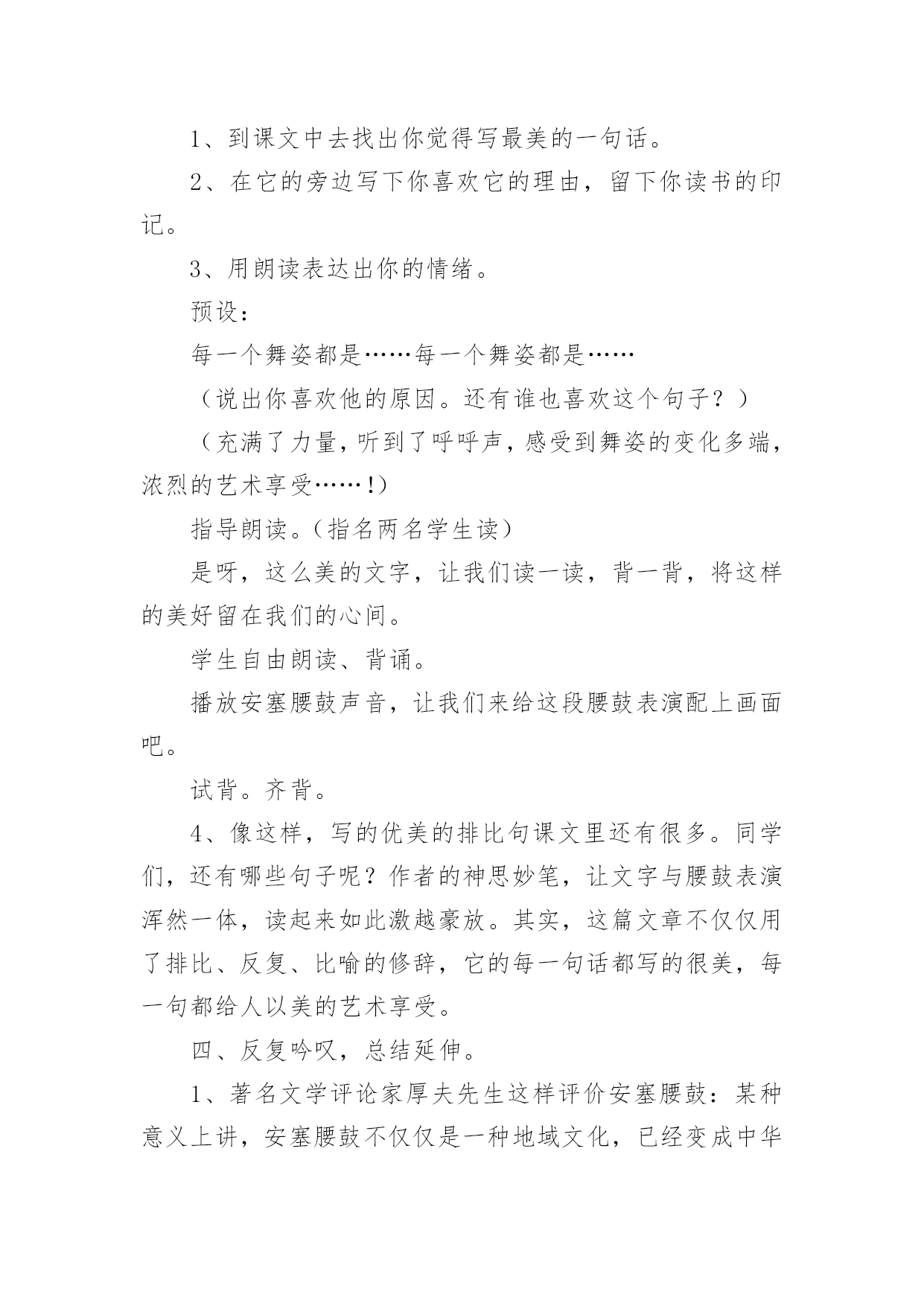 《安塞腰鼓》教学设计【精华】《安塞腰鼓》教学设计11篇作为一位无私奉献的人民教师,就难以避免地要准备教学设计,教学设计是教育技术的组成部分,它的功能在于运用系统方法设计教学过程,使之成为一种具有操作性的程序。那要怎么写好教学设计呢?以下是小编帮大家整理的《安塞腰鼓》教学设计,欢迎大家借鉴与参考,希望对大家有所帮助。《安塞腰鼓》教学设计篇1【教学目标】1、正确、流利、有感情地朗读课文,背诵第12至16自然段。2、理解文章内容,感受安塞腰鼓的壮阔、豪放、火烈的气势及高原后生粗犷、豪迈、开放的性格。3、理解比喻、排比、反复等修辞手法在文中的作用。4、理解文中一些句子的深刻含义。【教学重难点】1、感受安塞腰鼓的壮阔、豪放、火烈的气势及高原后生粗犷、豪迈、开放的性格。2、理解比喻、排比、反复等修辞手法在文中的作用。3、。理解文中一些句子的深刻含义。【教学时间】两课时第一课时一、激趣导入多媒体播放安塞腰鼓表演片段。看了刚才的片子?给你的感觉如何?请用一个词来概括一下。(学生围绕关键词语去谈感受:气势磅礴、震撼人心、惊心动魄。)师小结:安塞腰鼓是我国陕北具有代表性的优秀民间舞蹈之一。被称为“天下第一鼓”,今天,就让我们文化之旅的脚步随着刘成章的生花妙笔踏上黄土高原,去安塞古镇,去聆听那从20xx多年前的战场传来的鼓声,去欣赏有“天下第一鼓”之称的安塞腰鼓。二、初读课文1、陕西作家刘成章用他饱含诗情的笔触为我们描写了安塞腰鼓,让我们来感受他给我们内心带来的震撼和冲击。2、请同学们自读课文,完成学习提示:(1)读准生字词、读通课文,不理解的字词、语句打上问号。(2)想一想课文是按什么顺序写的?三、自学交流1、我们一起来读读这组生字词。出示:liángzhòubèng高粱地骤雨蹦跳zǎobólì酸枣树搏击战栗(1)粱搏栗(动画:将易错的部首闪红)(2)打开书后习题2,用钢笔描红。2、接下来请大家再读一读这几组词,你能感觉到了什么?出示:蓬勃亢奋碰撞元气淋漓震撼烧灼威逼奇伟磅礴壮阔豪放火烈惊心动魄这安塞腰鼓气势磅礴,令人震撼,作者也不由得在文中发出了这样的赞叹:“好一个安塞腰鼓!”3、理清文章脉络。(1)浏览课文,课文是按什么顺序写的?(鼓响之前,腰鼓表演,鼓声止息)(2)认真思考,根据提示完成文章结构图四、学习第一段鼓响之前1、自由读2、讨论:腰鼓表演开始前,你看到了什么背景一片高粱地后生茂腾腾朴实沉稳而安静腰鼓呆呆地这时给你的感觉怎样?(静)3、开头的静态描写有什么好处?(为后面的文章蓄势,高粱地是边沿的背景,“那咝溜溜的南风”是助阵的声势,那“沉稳而安静”的表情显示着表演者的成竹在胸,这些都为后面热闹激烈的表演做好了铺垫)4、齐读第一段表演时,安塞腰鼓的到底有多精彩,下一节课一起学习。第二课时一、复习旧知,导入新课。1、同学们,伴着陕西民歌,我们再一次走进黄土高原,去观赏、倾听、感受和品悟安塞腰鼓。通过上一课的学习,我们知道课文是从哪几个方面描写安塞腰鼓的?(静、动、静)课文中怎么描述着壮阔、豪放的安塞腰鼓的?浏览课文6-16自然段作者从哪几个方面写的?(板书:场面、鼓声、后生、舞姿)二、品读课文,感受安塞腰鼓的艺术美。1、“好一个安塞腰鼓!好一个……安塞腰鼓!”这样的话在课文里出现几次?对,这样的话在课文中出现了4次。(第一次出现在第8节,……)出示:好一个安塞腰鼓!(第8节)好一个安塞腰鼓!(第11节)好一个安塞腰鼓!(第14节)好一个痛快了山河,蓬勃了想象力的安塞腰鼓!(第16节)2、同学们你能结合上下文,说说为什么要反复出现这些句子?是啊,“好一个安塞腰鼓!”先后出现4次,可见这安塞腰鼓给作者带来的震撼,他才会如此反复赞美。作者被安塞腰鼓深深地陶醉了,反复地发出赞叹,其实这种写法本身就是一种美,它使语言节奏明快,形象更加深刻清晰。(一)感受安塞腰鼓舞蹈的场面美(PPT)黄土高原上,爆出一场多么壮阔、多么豪放、多么火烈的舞蹈哇,安塞腰鼓!1、静静地默读,从哪些句子感受到场面的“壮阔、豪放、火烈”?画出最让你震撼的句子,把自己的'感受写在旁边。(读、画、写)感受写得精炼一点,哪怕一个字,一个词,只要能表达你的感受就行。2、交流:感悟“一捶”这是怎样的一捶?师:大家再读读这里面的词语,是否是让有更深刻的感受?这三个词一个比一个更好,是排比句,发狠了,说明了这些后生一开始就搏击;忘情了,说明了他们把所有的事情都忘记了,指把自己的心放在这“隆隆隆隆”之中,在那里使劲地捶着。师:我们来读一读这里。师:这一节中还有让你心动的地方吗?感悟“排比”,生:“【读】骤雨一样,是急促的……斗虎一样,是强劲的风姿。”从这里可以看出后生们的每一个细胞都活动,都在跳跃着,跟着那种节拍在活动。师:那是用怎样的句式来描写这种感觉的呢?师:这种排山倒海之势的排比句来