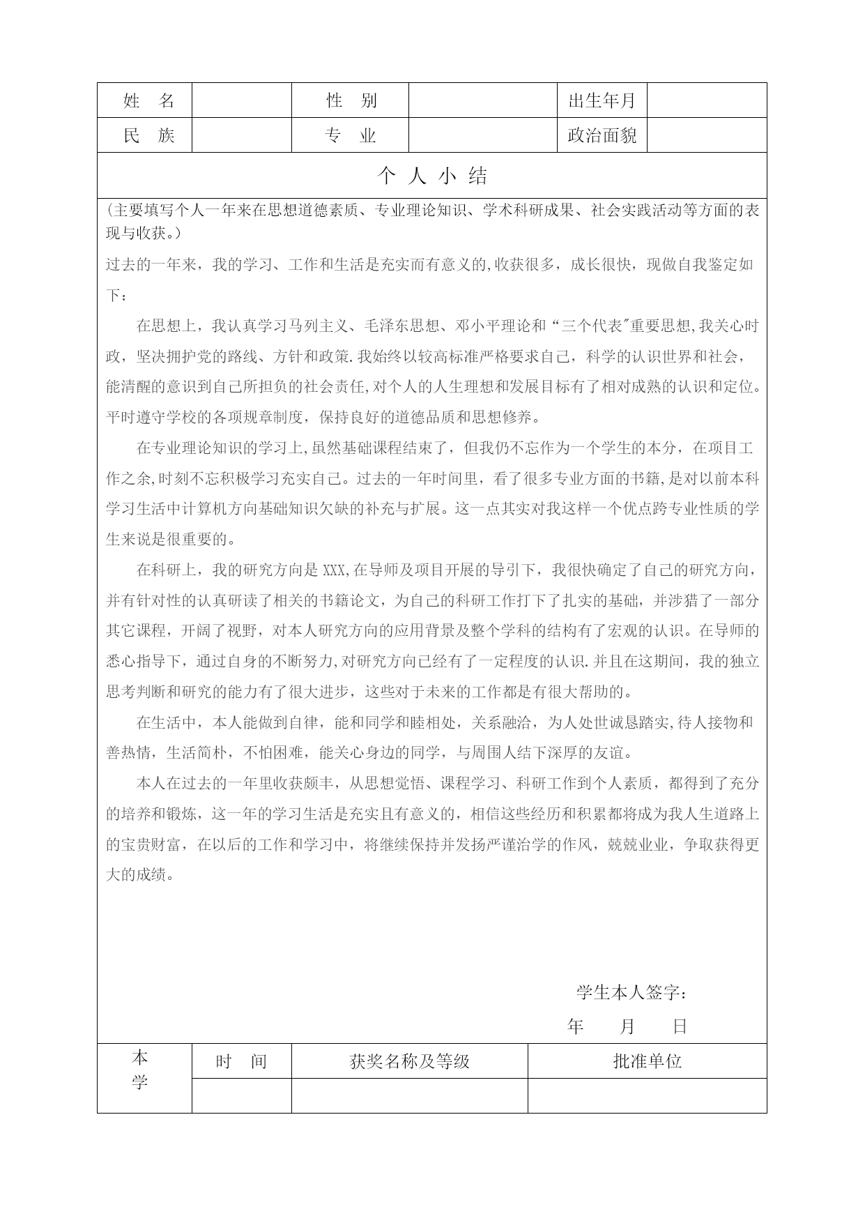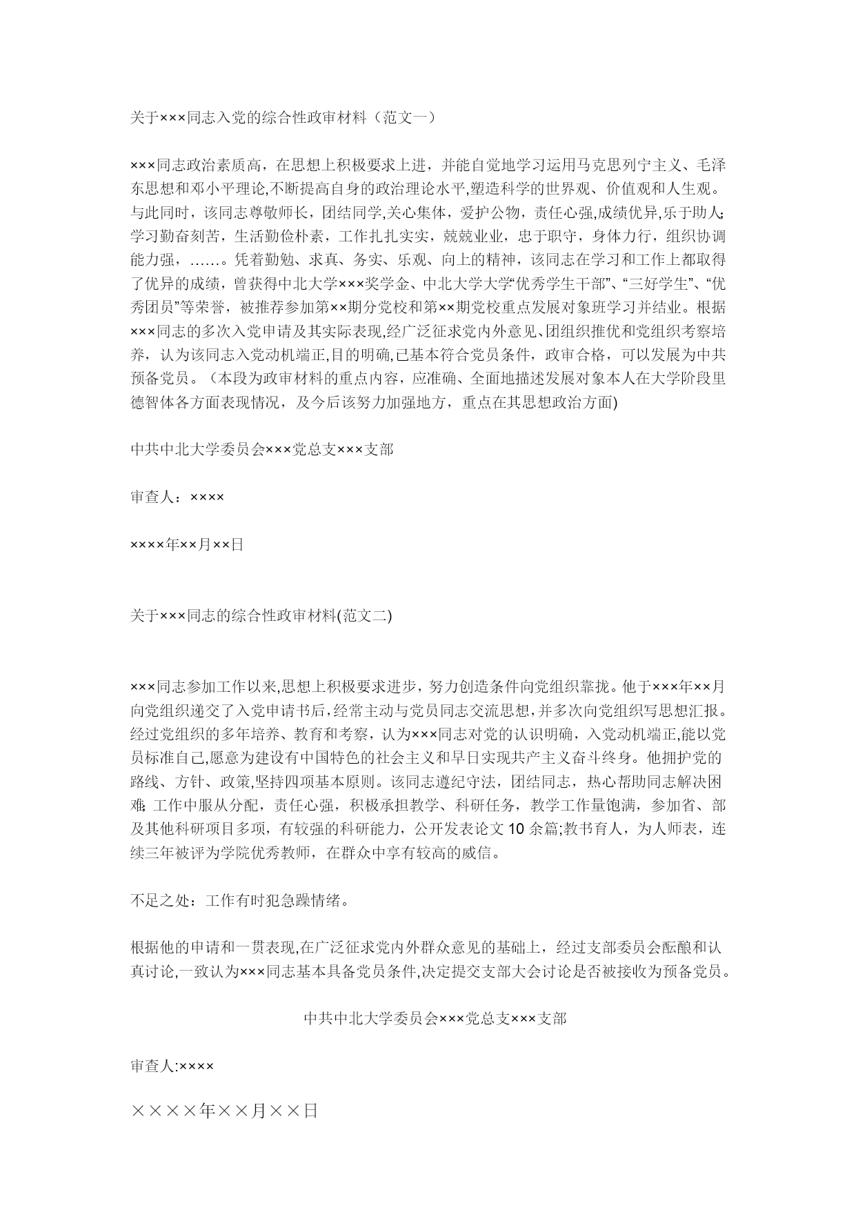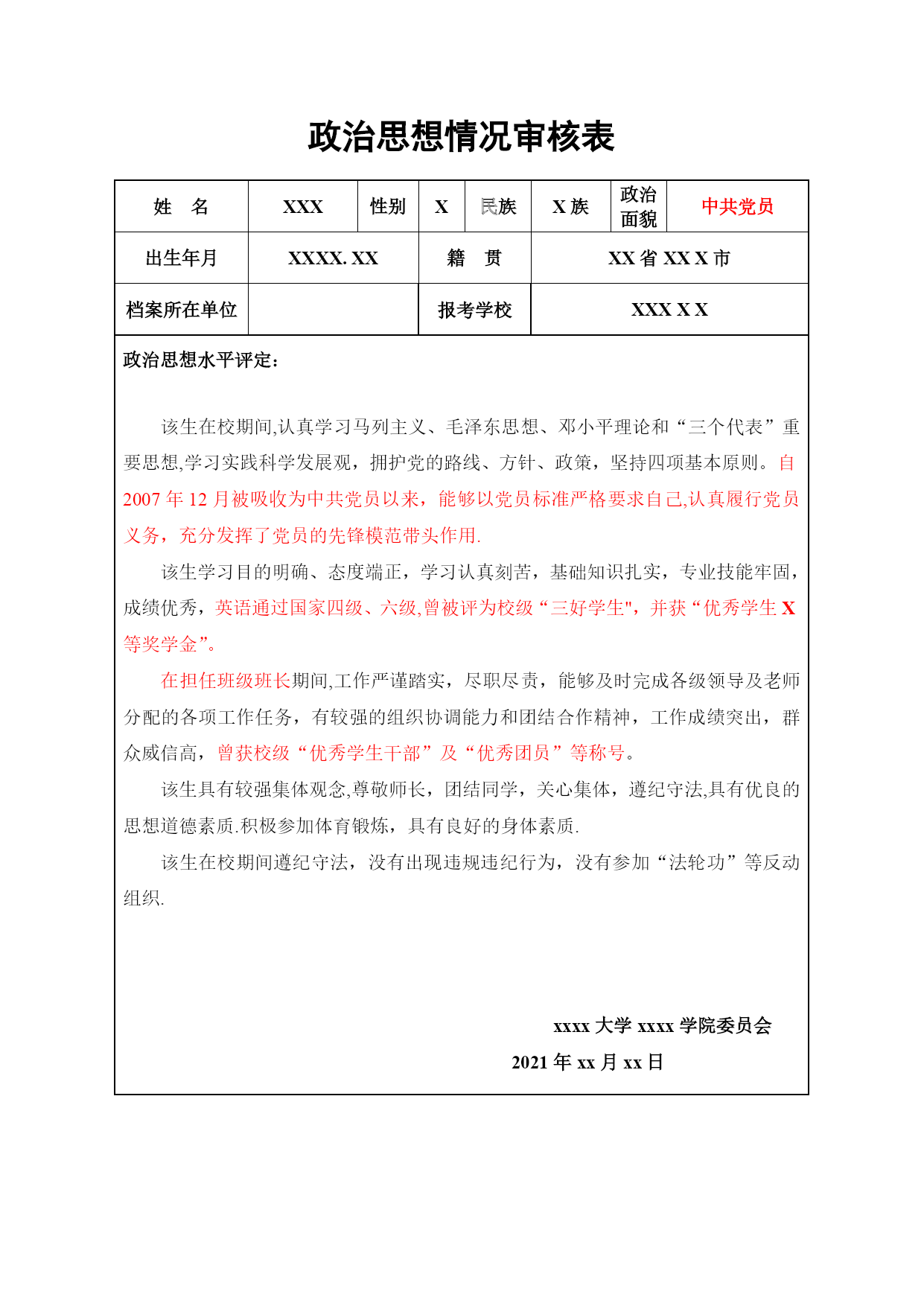 研究生复试政审表模板范文02020实用文档(实用文档,可以直接使用,可编辑优秀版资料,欢迎下载)政治思想情况审核表姓名XXX性别X民族X族政治面貌中共党员出生年月XXXX.XX籍贯XX省XXX市档案所在单位报考学校XXXXX政治思想水平评定:该生在校期间,认真学习马列主义、毛泽东思想、邓小平理论和“三个代表”重要思想,学习实践科学发展观,拥护党的路线、方针、政策,坚持四项基本原则。自2007年12月被吸收为中共党员以来,能够以党员标准严格要求自己,认真履行党员义务,充分发挥了党员的先锋模范带头作用.该生学习目的明确、态度端正,学习认真刻苦,基础知识扎实,专业技能牢固,成绩优秀,英语通过国家四级、六级,曾被评为校级“三好学生",并获“优秀学生X等奖学金”。在担任班级班长期间,工作严谨踏实,尽职尽责,能够及时完成各级领导及老师分配的各项工作任务,有较强的组织协调能力和团结合作精神,工作成绩突出,群众威信高,曾获校级“优秀学生干部”及“优秀团员”等称号。该生具有较强集体观念,尊敬师长,团结同学,关心集体,遵纪守法,具有优良的思想道德素质.积极参加体育锻炼,具有良好的身体素质.该生在校期间遵纪守法,没有出现违规违纪行为,没有参加“法轮功”等反动组织.xxxx大学xxxx学院委员会2021年xx月xx日关于×××同志入党的综合性政审材料(范文一)×××同志政治素质高,在思想上积极要求上进,并能自觉地学习运用马克思列宁主义、毛泽东思想和邓小平理论,不断提高自身的政治理论水平,塑造科学的世界观、价值观和人生观。与此同时,该同志尊敬师长,团结同学,关心集体,爱护公物,责任心强,成绩优异,乐于助人;学习勤奋刻苦,生活勤俭朴素,工作扎扎实实,兢兢业业,忠于职守,身体力行,组织协调能力强,……。凭着勤勉、求真、务实、乐观、向上的精神,该同志在学习和工作上都取得了优异的成绩,曾获得中北大学×××奖学金、中北大学大学“优秀学生干部”、“三好学生”、“优秀团员”等荣誉,被推荐参加第××期分党校和第××期党校重点发展对象班学习并结业。根据×××同志的多次入党申请及其实际表现,经广泛征求党内外意见、团组织推优和党组织考察培养,认为该同志入党动机端正,目的明确,已基本符合党员条件,政审合格,可以发展为中共预备党员。(本段为政审材料的重点内容,应准确、全面地描述发展对象本人在大学阶段里德智体各方面表现情况,及今后该努力加强地方,重点在其思想政治方面)中共中北大学委员会×××党总支×××支部审查人:××××××××年××月××日关于×××同志的综合性政审材料(范文二)×××同志参加工作以来,思想上积极要求进步,努力创造条件向党组织靠拢。他于×××年××月向党组织递交了入党申请书后,经常主动与党员同志交流思想,并多次向党组织写思想汇报。经过党组织的多年培养、教育和考察,认为×××同志对党的认识明确,入党动机端正,能以党员标准自己,愿意为建设有中国特色的社会主义和早日实现共产主义奋斗终身。他拥护党的路线、方针、政策,坚持四项基本原则。该同志遵纪守法,团结同志,热心帮助同志解决困难;工作中服从分配,责任心强,积极承担教学、科研任务,教学工作量饱满,参加省、部及其他科研项目多项,有较强的科研能力,公开发表论文10余篇;教书育人,为人师表,连续三年被评为学院优秀教师,在群众中享有较高的威信。不足之处:工作有时犯急躁情绪。根据他的申请和一贯表现,在广泛征求党内外群众意见的基础上,经过支部委员会酝酿和认真讨论,一致认为×××同志基本具备党员条件,决定提交支部大会讨论是否被接收为预备党员。中共中北大学委员会×××党总支×××支部审查人:××××××××年××月××日XXXXXX大学研究生学年鉴定表(——学年)姓名:学号:指导老师:所在学院:二○年月日填写姓名性别出生年月民族专业政治面貌个人小结(主要填写个人一年来在思想道德素质、专业理论知识、学术科研成果、社会实践活动等方面的表现与收获。)过去的一年来,我的学习、工作和生活是充实而有意义的,收获很多,成长很快,现做自我鉴定如下:在思想上,我认真学习马列主义、毛泽东思想、邓小平理论和“三个代表"重要思想,我关心时政,坚决拥护党的路线、方针和政策.我始终以较高标准严格要求自己,科学的认识世界和社会,能清醒的意识到自己所担负的社会责任,对个人的人生理想和发展目标有了相对成熟的认识和定位。平时遵守学校的各项规章制度,保持良好的道德品质和思想修养。在专业理论知识的学习上,虽然基础课程结束了,但我仍不忘作为一个学生的本分,在项目工作之余,时刻不忘积极学习充实自己。过去的一年时间里,看了很多专业方面的书籍