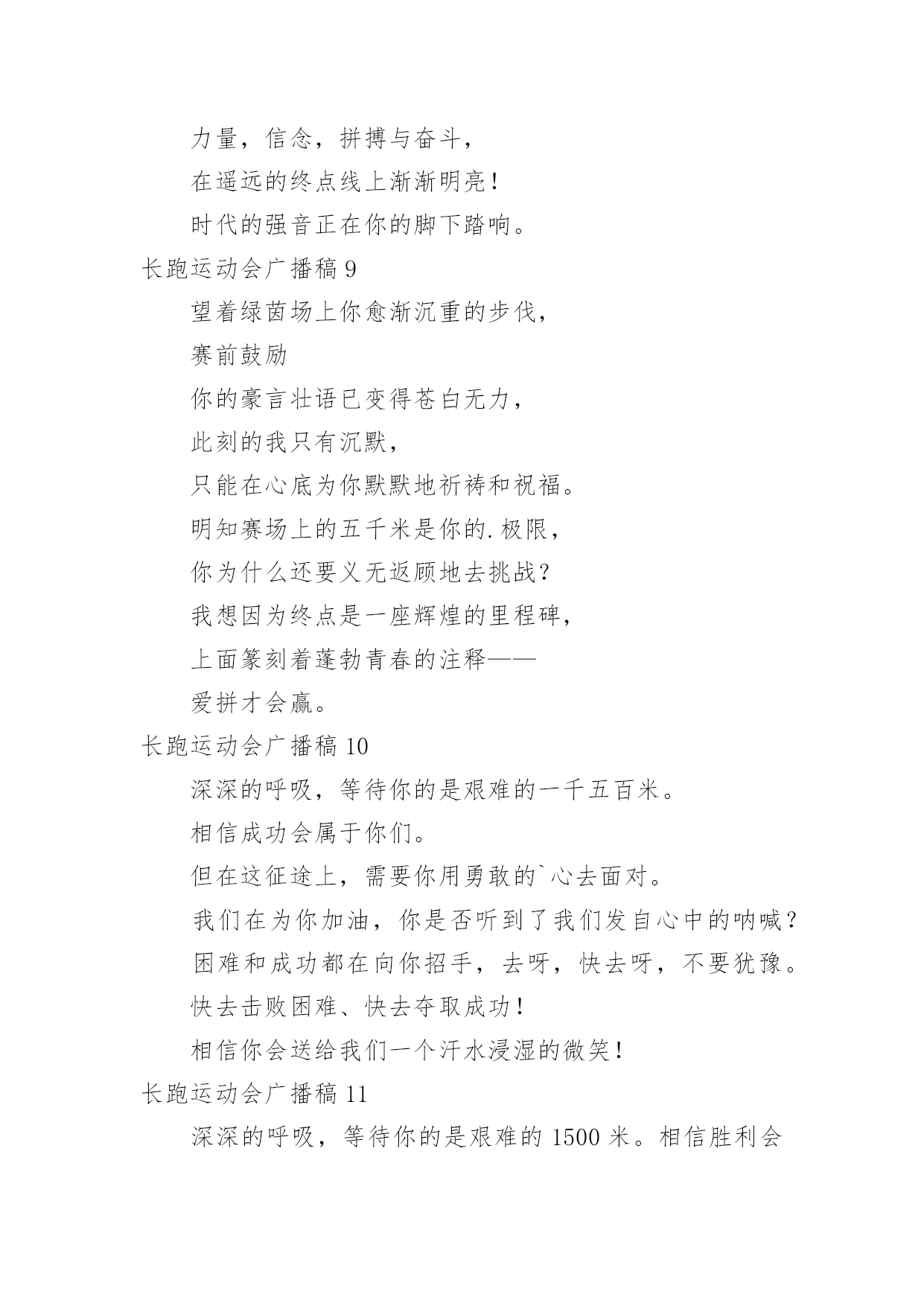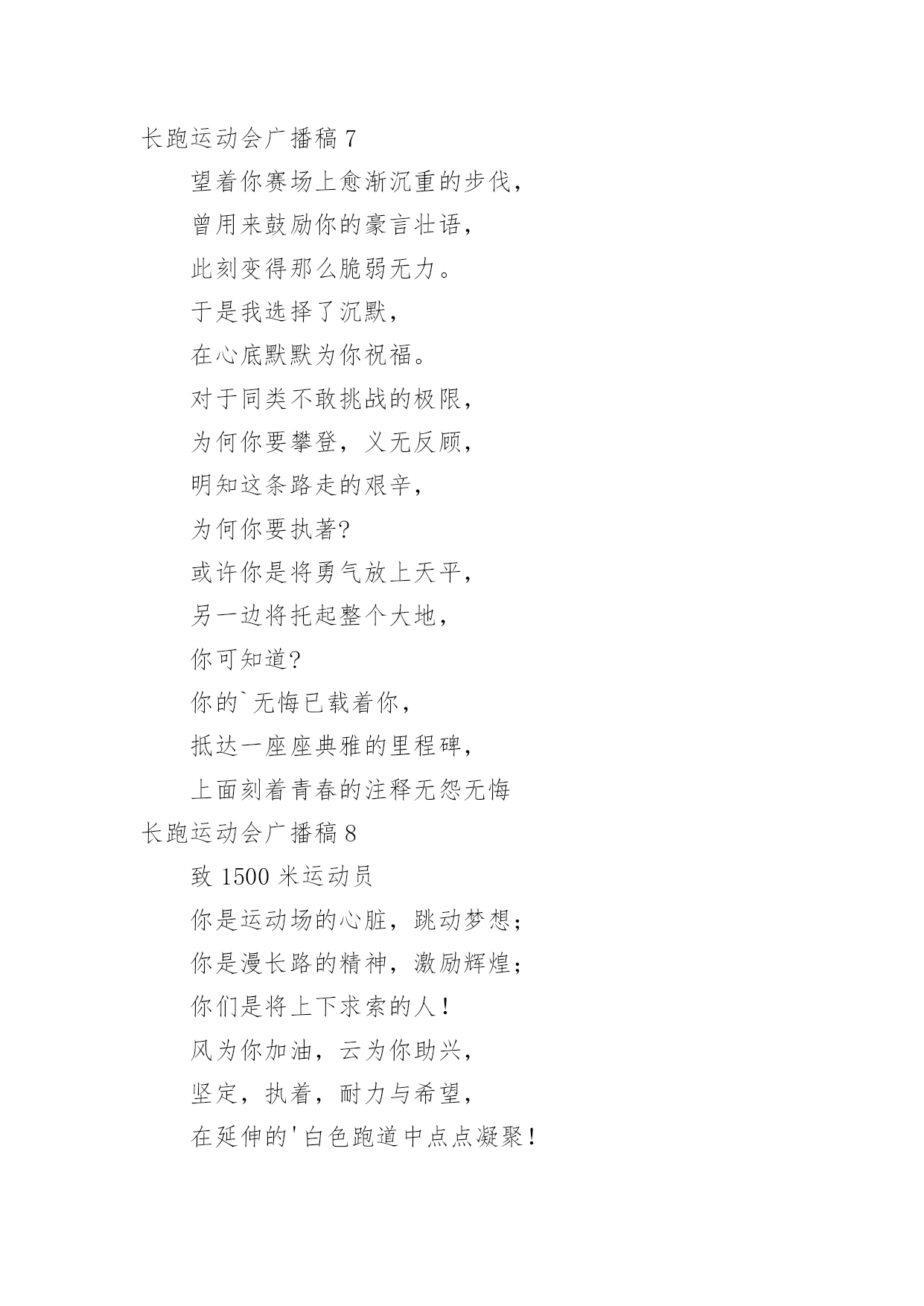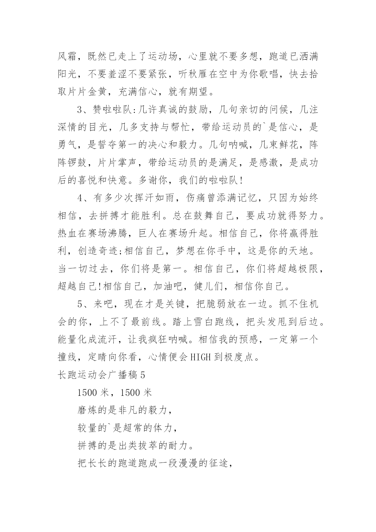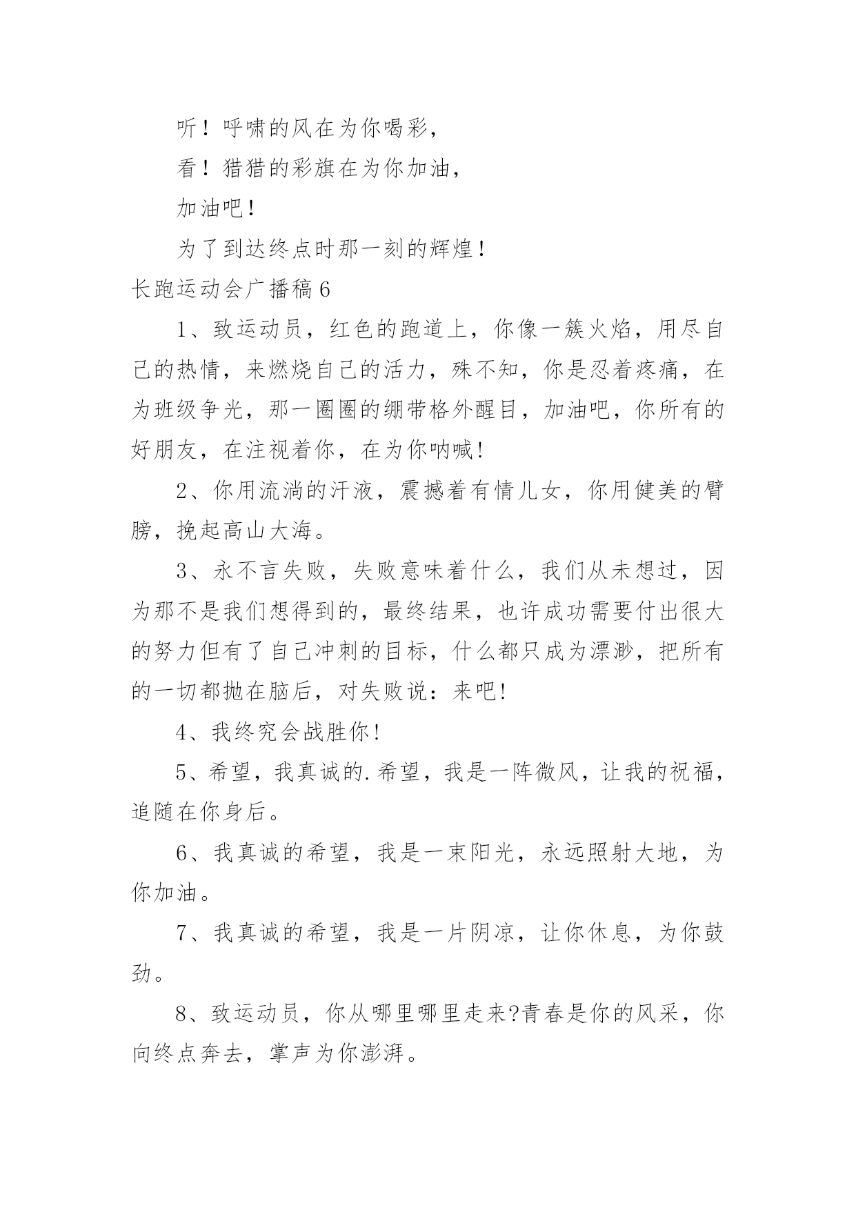 长跑运动会广播稿长跑运动会广播稿在学校广播站锻炼的学生都知道,大家广播前一般都会预先做好广播稿,一流的广播稿会带来更好的节目效果,那么广播稿应该怎么写才合适呢?下面是小编为大家收集的长跑运动会广播稿,仅供参考,欢迎大家阅读。长跑运动会广播稿1常远撰写一起出发,趁着明媚的春光,随处绽放的花蕾,点燃我青春的梦想!一起出发,伴着雄伟的乐章,华夏沸腾的热血,注入我宽广的胸膛!一起出发,带上师友的热望,响在耳边的掌声,增添我奋进的力量!一起出发,挺起自信的脊梁,充满坎坷的征程,磨砺我意志的坚强!一起出发,开创人生的辉煌,额头晶莹的汗水,浇灌硕果的芬芳!一起出发,迎接明天的太阳,夸父追日的豪情催生我腾飞的翅膀!一起出发,不做迷途的羔羊,找准明确的目标,开启世纪的远航!一起出发,不怕征途的漫长,锲而不舍的毅力,荣登神圣的殿堂!一起出发,战胜内心的彷徨,踏上坚实的大道,直奔胜利的方向!一起出发,追逐事业的癫狂。超越自我的勇气,演奏命运的交响!一起出发,告别熟悉的家乡,日新月异的'世界,激发斗志的昂扬!一起出发,释放集体的能量。团结战斗的友谊,冲破重重的风浪!一起出发,驰骋激烈的赛场,你追我赶的脚步,谱写壮美的诗行!一起出发,终点就在前方,苦尽甘来的时刻,摘取金色的奖章!长跑运动会广播稿2面对艰苦的征程,你们毫不畏惧,听,我们在为你呐喊,你们诠释着奥运的精神,你们是我们心中的骄傲,深深的呼吸,等待你的是艰难的1500米。相信胜利会属于你们,但在这征途上,需要你勇敢的.心去面对。我们在为你加油,你是否听到了我们发自内心的呐喊,困难和胜利都在向你招手,去呀,不要犹豫,快去击败困难,快去夺取胜利,相信你会送给我们一个汗水浸湿的微笑。长跑运动会广播稿31、这是速度与毅力的接力,这是期望与祈盼的接力,时间在那里凝固,几分几秒也变得如此漫长。千百双眼睛注视着你那矫健的身影,近了,近了,你可曾听到那山呼海啸般的加油声近了,近了,前方就是终点,加油啊,运动员,成功和失败就在转瞬之间。2、老师说,语文老师说,你们很美,是一种回归大自然的天然美;数学老师说,你们很美,那轻盈一跃是对称的美;政治老师说,你们很美,是负出与收获的辩证美;老师说,在古典的文化美后你们有欧式的拼搏美。3、奔向前方,枪声响起,燃起的是你的激情,放飞的是你的理想,你的挥汗付出,在矫健的步伐以后逐一闪亮,纵使艰难,但,奔向前方,唯有它给你掌声。4、唯有它让你傲气昂扬!5、跑啊跑,跑啊,无休止的被追赶,尽头遥远,有点惶恐,却无理由。6、和着彼此粗重的喘息,渐渐失去了意识,翅膀,像鸡毛掸子,拥有羽毛却无力飞翔,劳累,不能停止的'、跑啊跑。7、赞五千米运动员,迎接你的,是五千米跑道,等待你的,是漫漫征途,勇敢的冲吧,勇士们,不要畏惧对手的强大,你的对手只有自己,勇敢的冲吧,五千米算不得什么,付出的汗水就要得到回报,胜利的泪水就要顺颊而下,秋风会为你喝彩。长跑运动会广播稿41、江城子:运动场上争英雄,那相逢却匆匆。携手同行,风雨亦融融。未闻若辛余几许,为群众,赴峥嵘。赛场菊月气氛浓,展才能显芳荣,回首征程,友谊伴其中,欲寄奋斗钱挥汗,掩不住愉悦中。2、自信就是期望:是种子就该有绿色的期望,是种子就该有金色的梦想,不要躺在封闭的暖房,怕什么秋日薄薄的风霜,既然已走上了运动场,心里就不要多想,跑道已洒满阳光,不要羞涩不要紧张,听秋雁在空中为你歌唱,快去拾取片片金黄,充满信心,就有期望。3、赞啦啦队:几许真诚的鼓励,几句亲切的问候,几注深情的目光,几多支持与帮忙,带给运动员的`是信心,是勇气,是誓夺第一的决心和毅力。几句呐喊,几束鲜花,阵阵锣鼓,片片掌声,带给运动员的是满足,是感激,是成功后的喜悦和快意。多谢你,我们的啦啦队!4、有多少次挥汗如雨,伤痛曾添满记忆,只因为始终相信,去拼搏才能胜利。总在鼓舞自己,要成功就得努力。热血在赛场沸腾,巨人在赛场升起。相信自己,你将赢得胜利,创造奇迹;相信自己,梦想在你手中,这是你的天地。当一切过去,你们将是第一。相信自己,你们将超越极限,超越自己!相信自己,加油吧,健儿们,相信你自己。5、来吧,现在才是关键,把脆弱放在一边。抓不住机会的你,上不了最前线。踏上雪白跑线,把头发甩到后边。能量化成流汗,让我疯狂呐喊。相信我的预感,一定第一个撞线,定睛向你看,心情便会HIGH到极度点。长跑运动会广播稿51500米,1500米磨炼的是非凡的毅力,较量的`是超常的体力,拼搏的是出类拔萃的耐力。把长长的跑道跑成一段漫漫的征途,听!呼啸的风在为你喝彩,看!猎猎的彩旗在为你加油,加油吧!为了到达终点时那一刻的辉煌!长跑运动会广播稿61、致运动员,红色的跑道上,你像一簇火焰,用尽自己的热情,来燃烧自己的活力,殊不知,你是忍着疼痛,在为班级争光,那一圈圈的绷带格外醒目,加油吧,你所有的好
